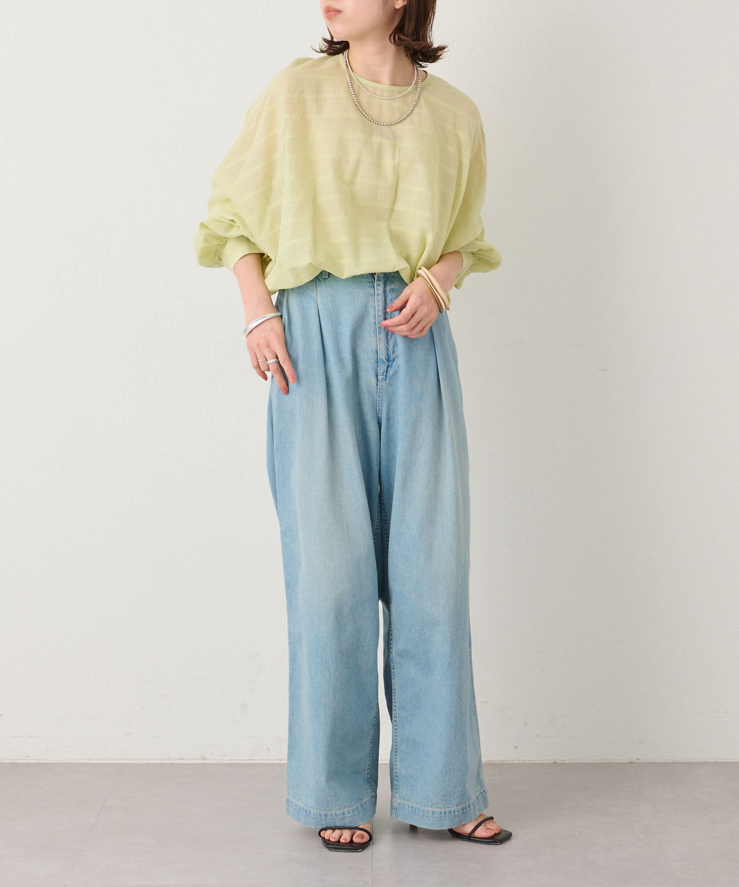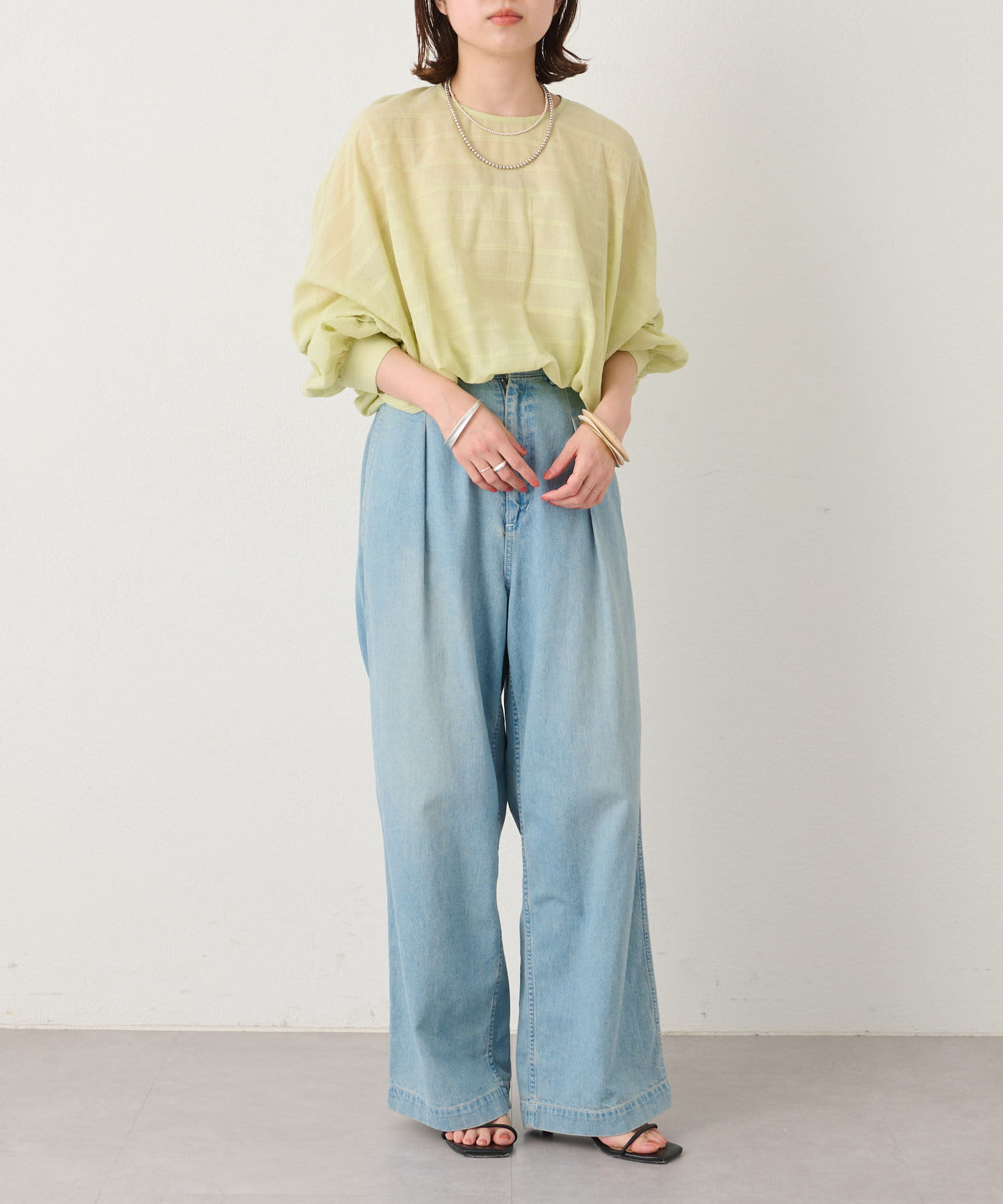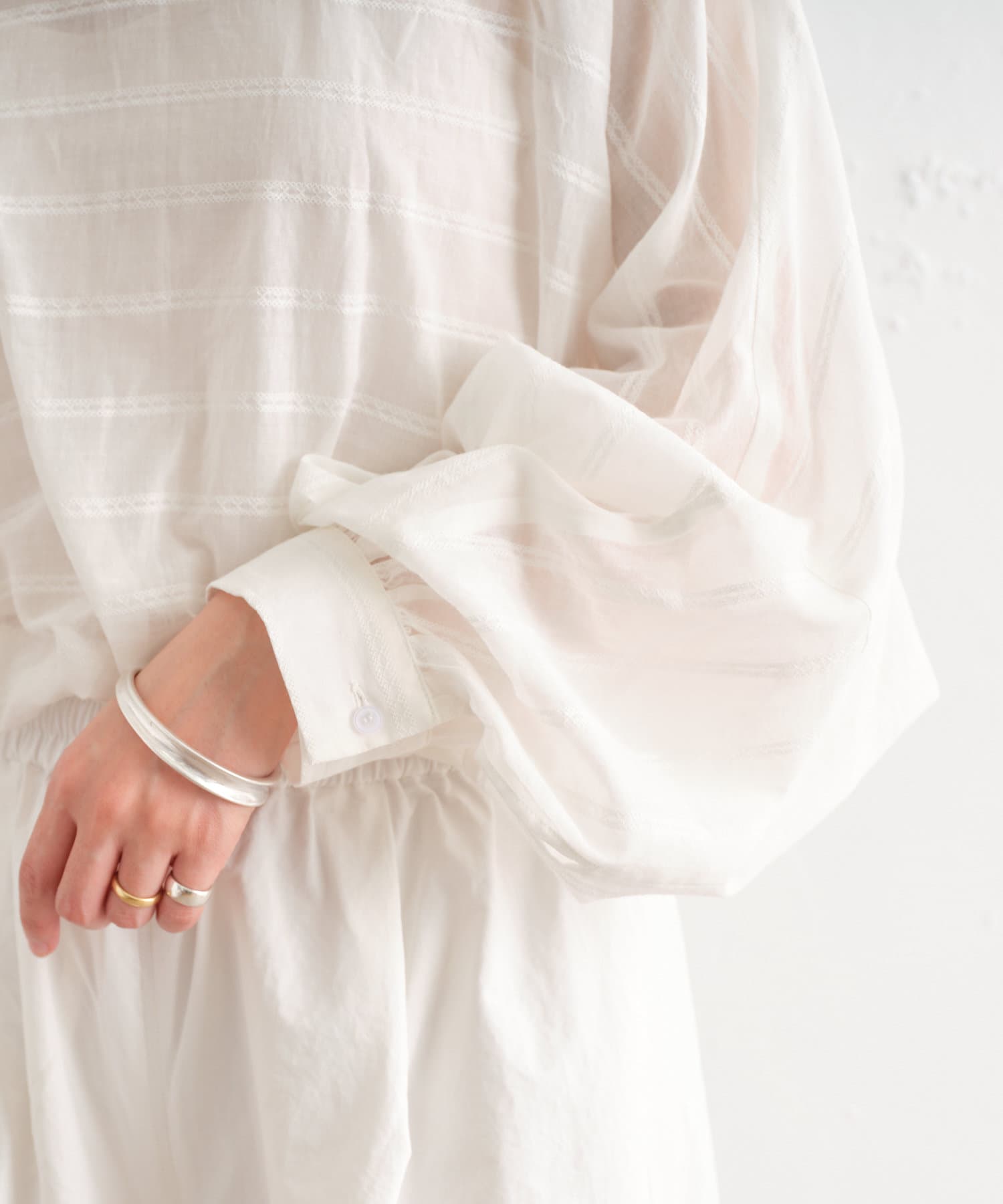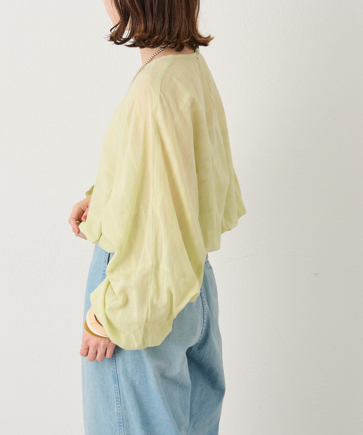 ・身幅はゆったりとしたサイズ感ながらシアー素材なので重くならず、裾にゴムが通っているのでボリューム感と丈を調整して着ていただけます。