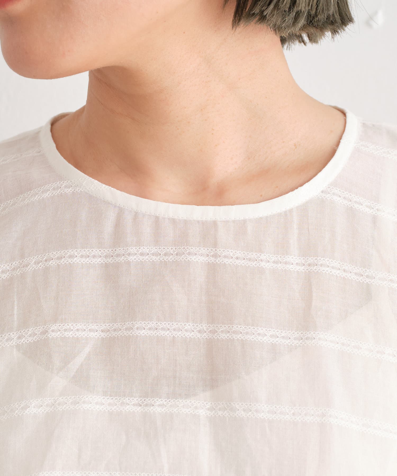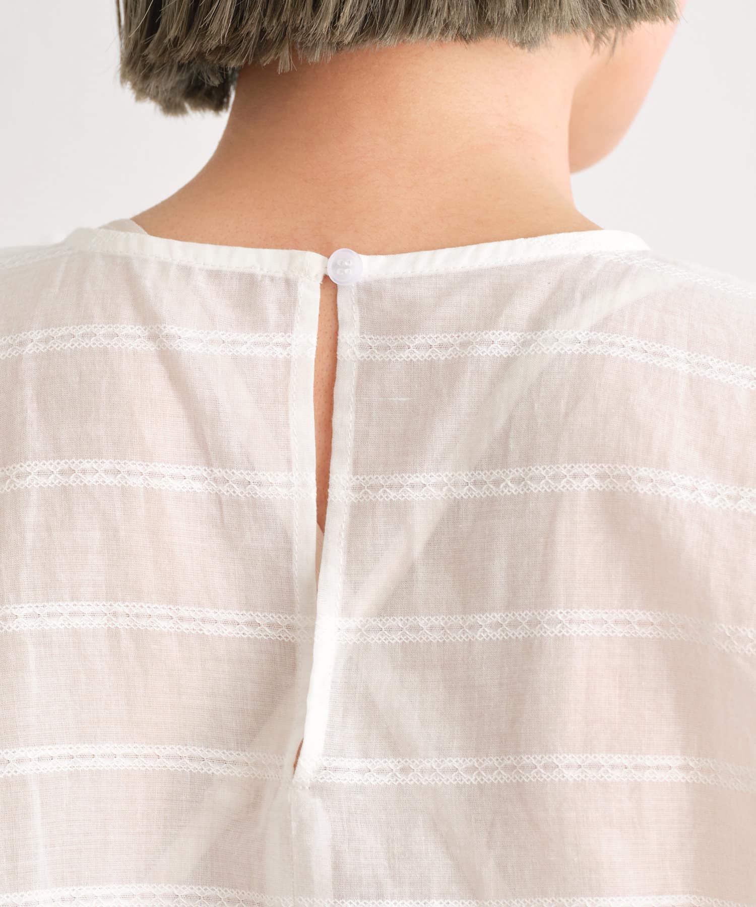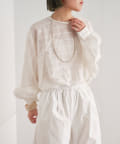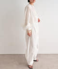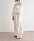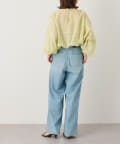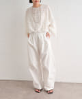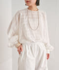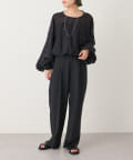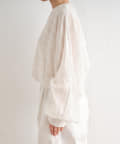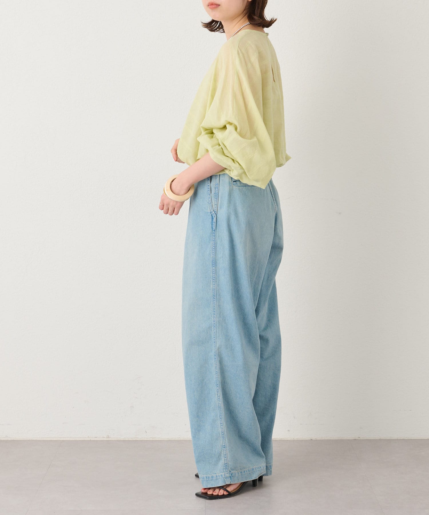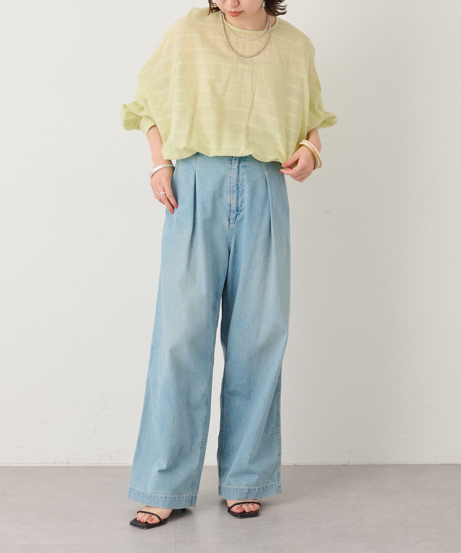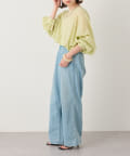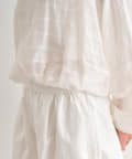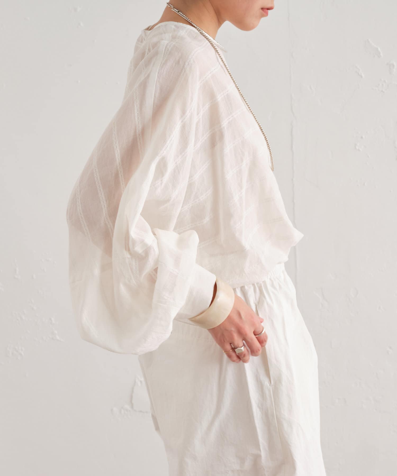 ・身幅はゆったりとしたサイズ感ながらシアー素材なので重くならず、裾にゴムが通っているのでボリューム感と丈を調整して着ていただけます。