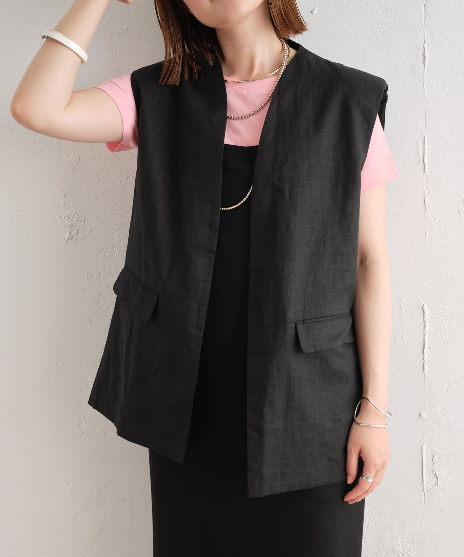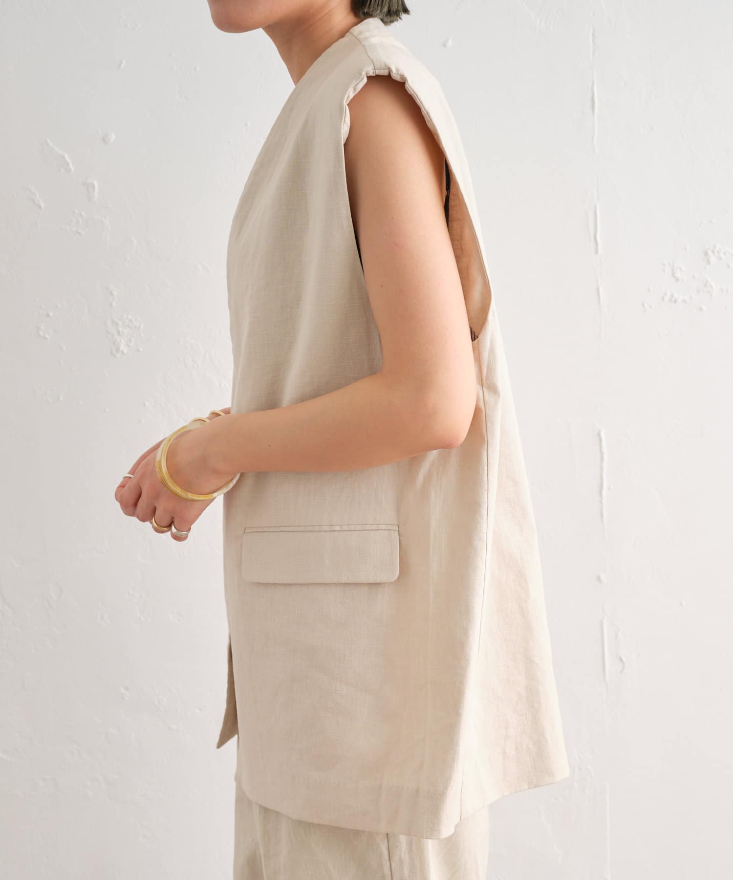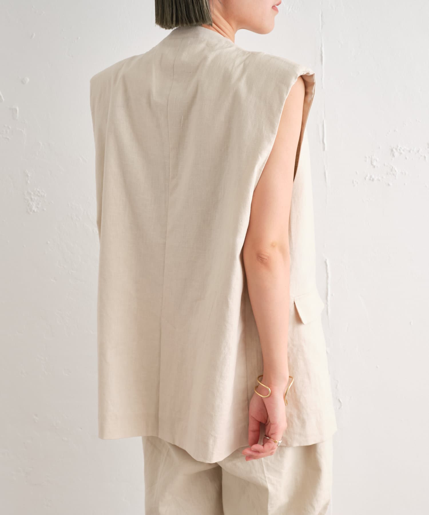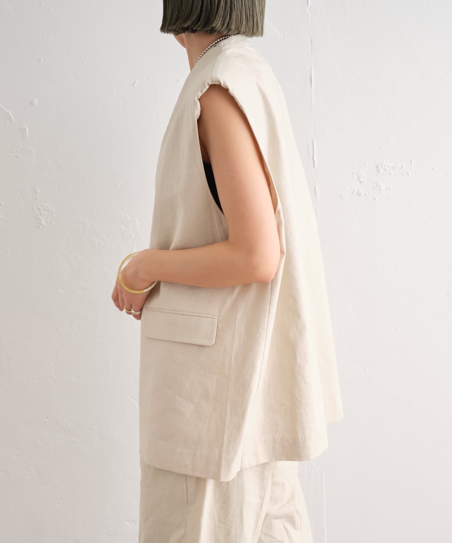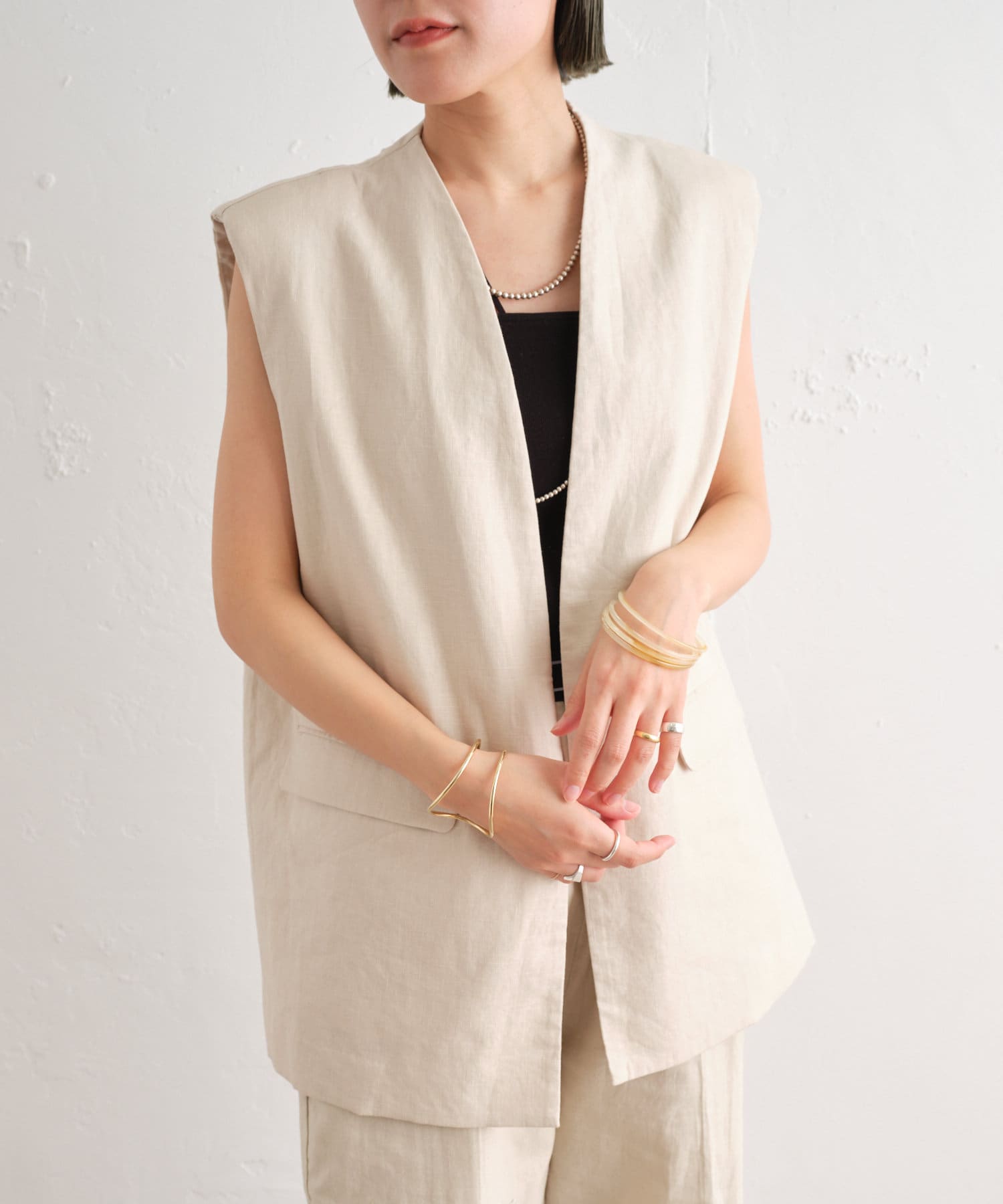 着心地の良いリネン素材のノーカラーベスト