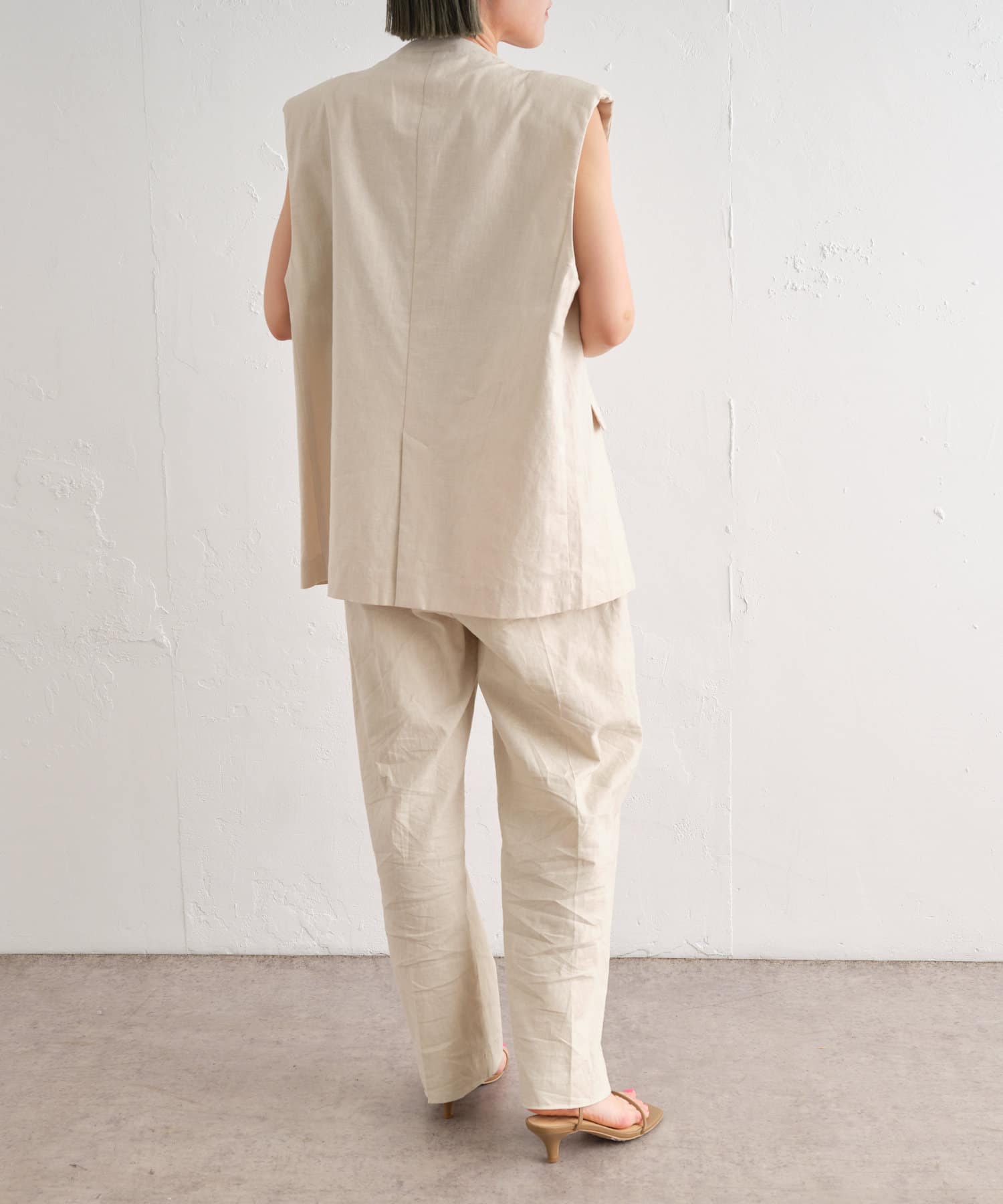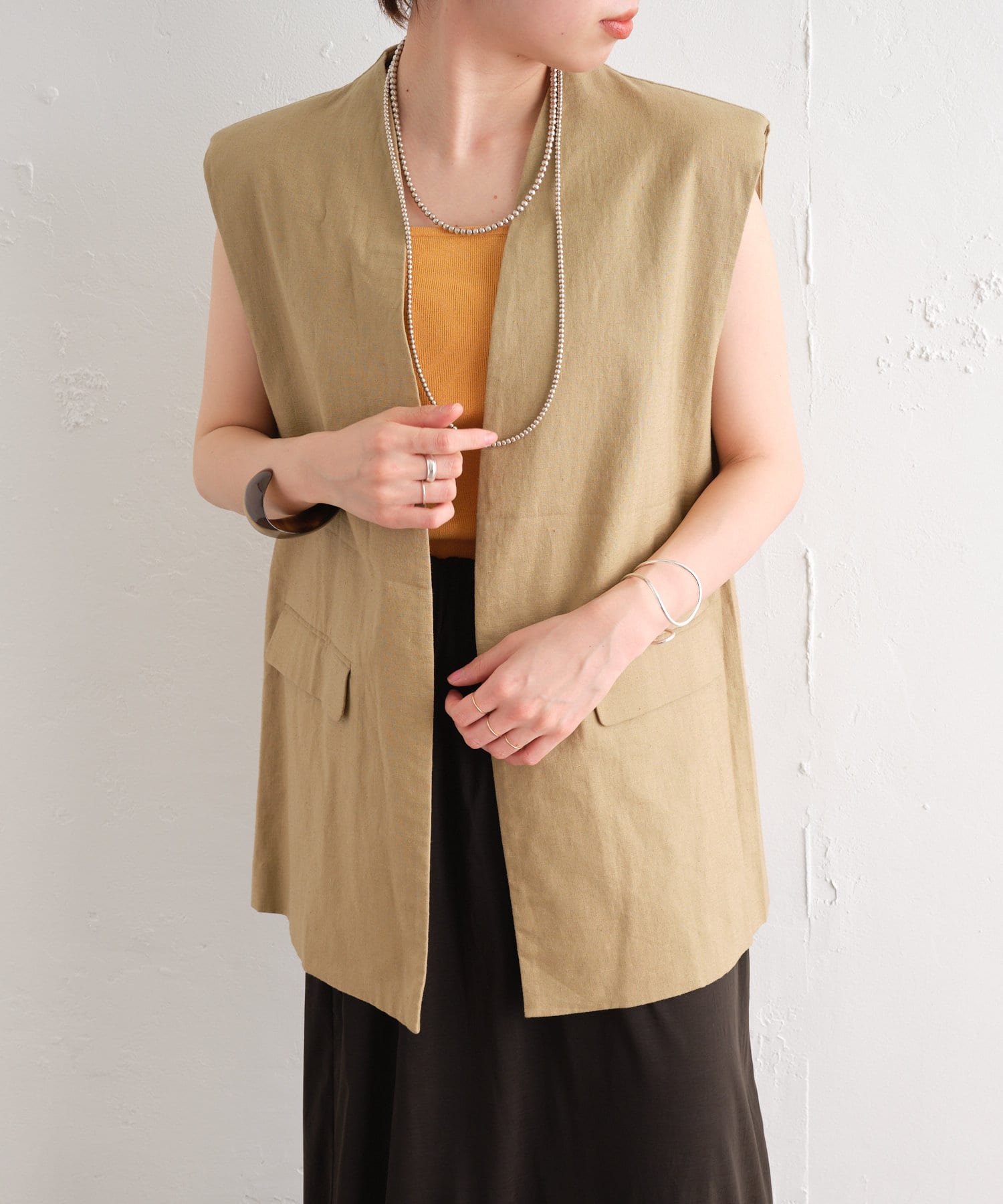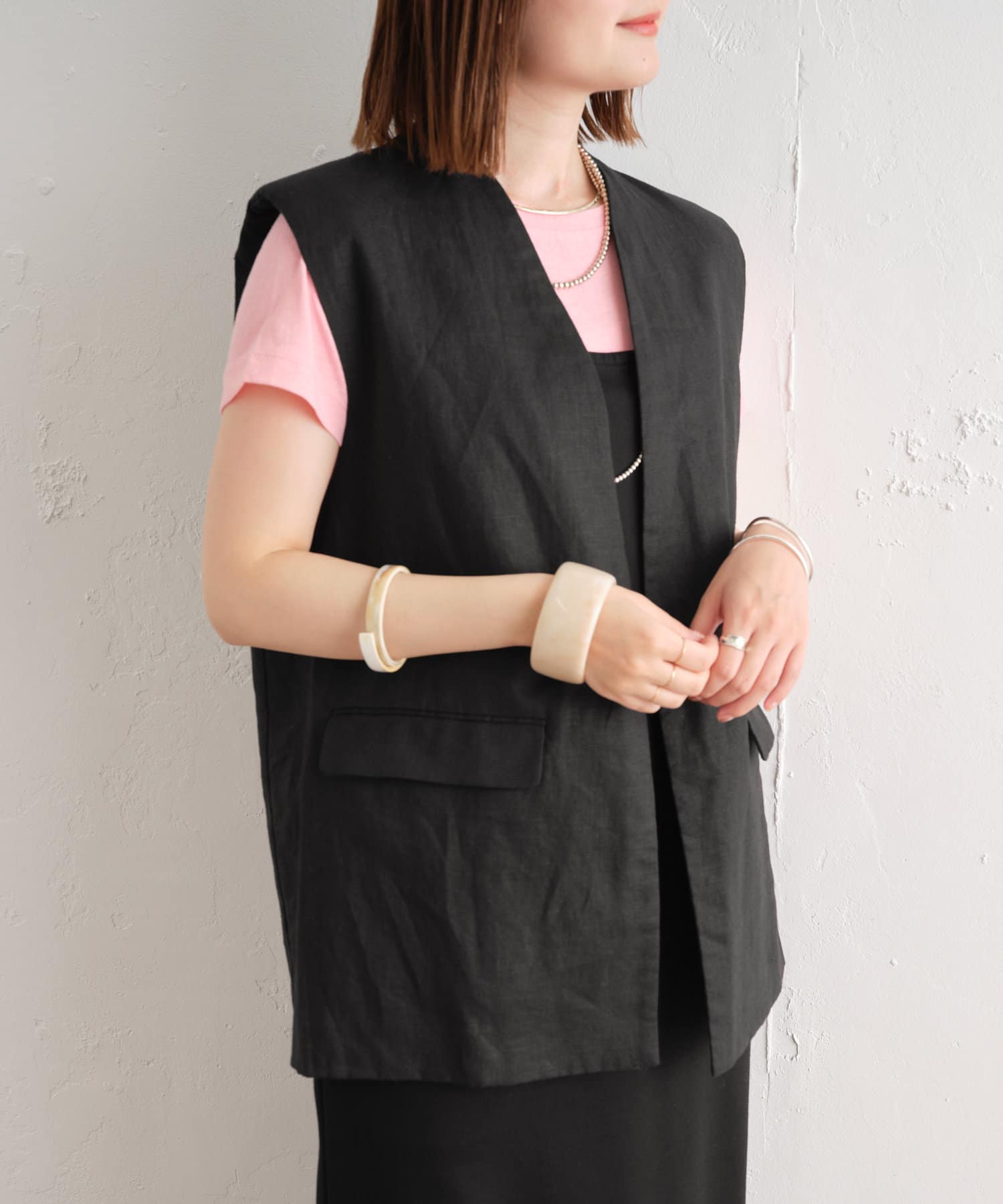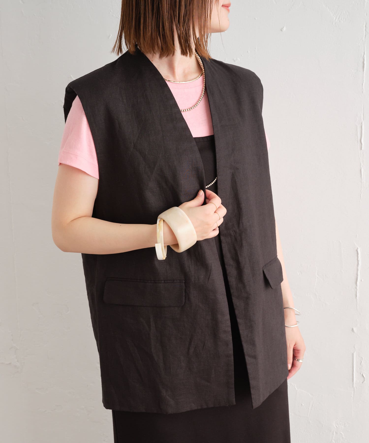 着心地の良いリネン素材のノーカラーベスト