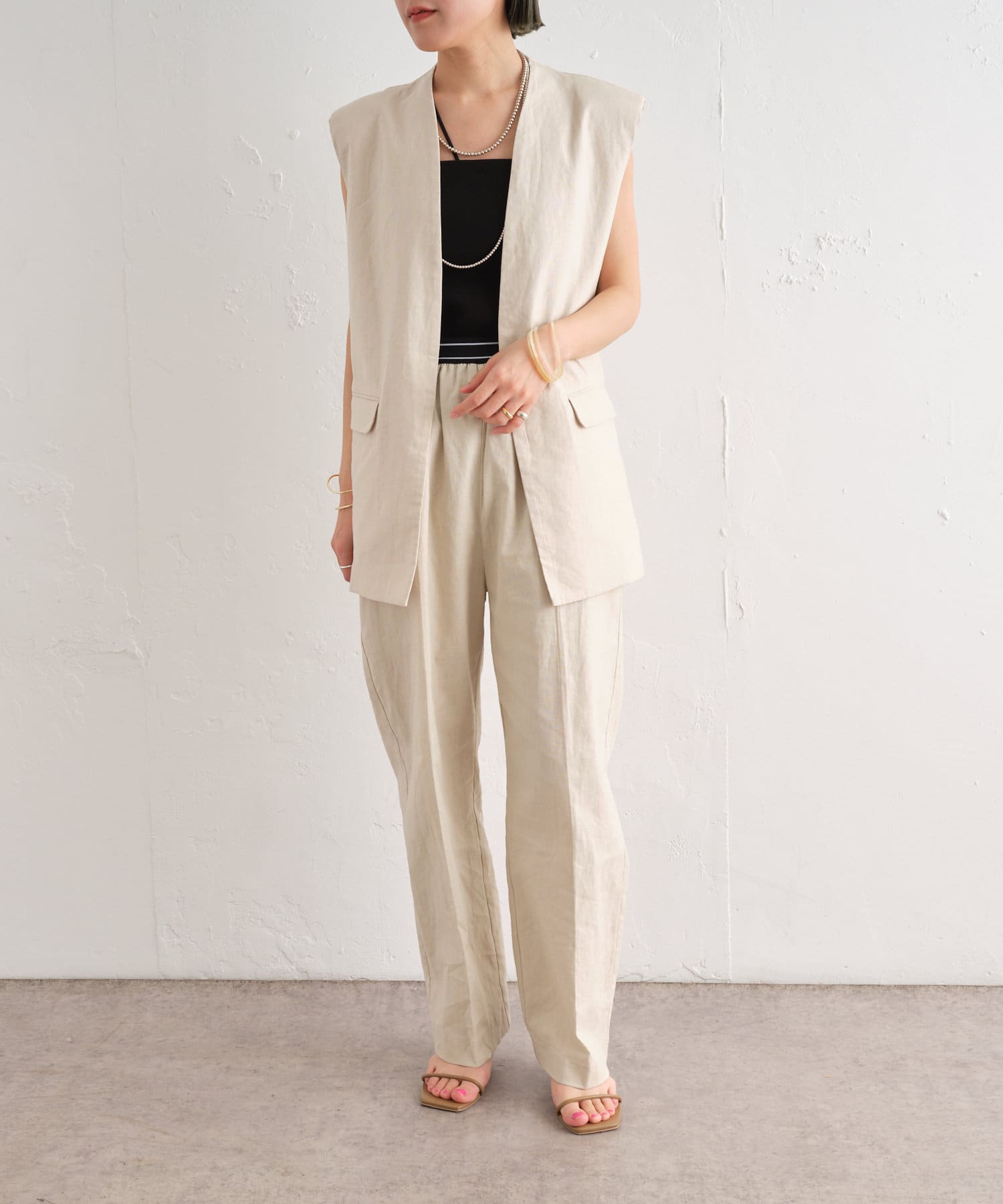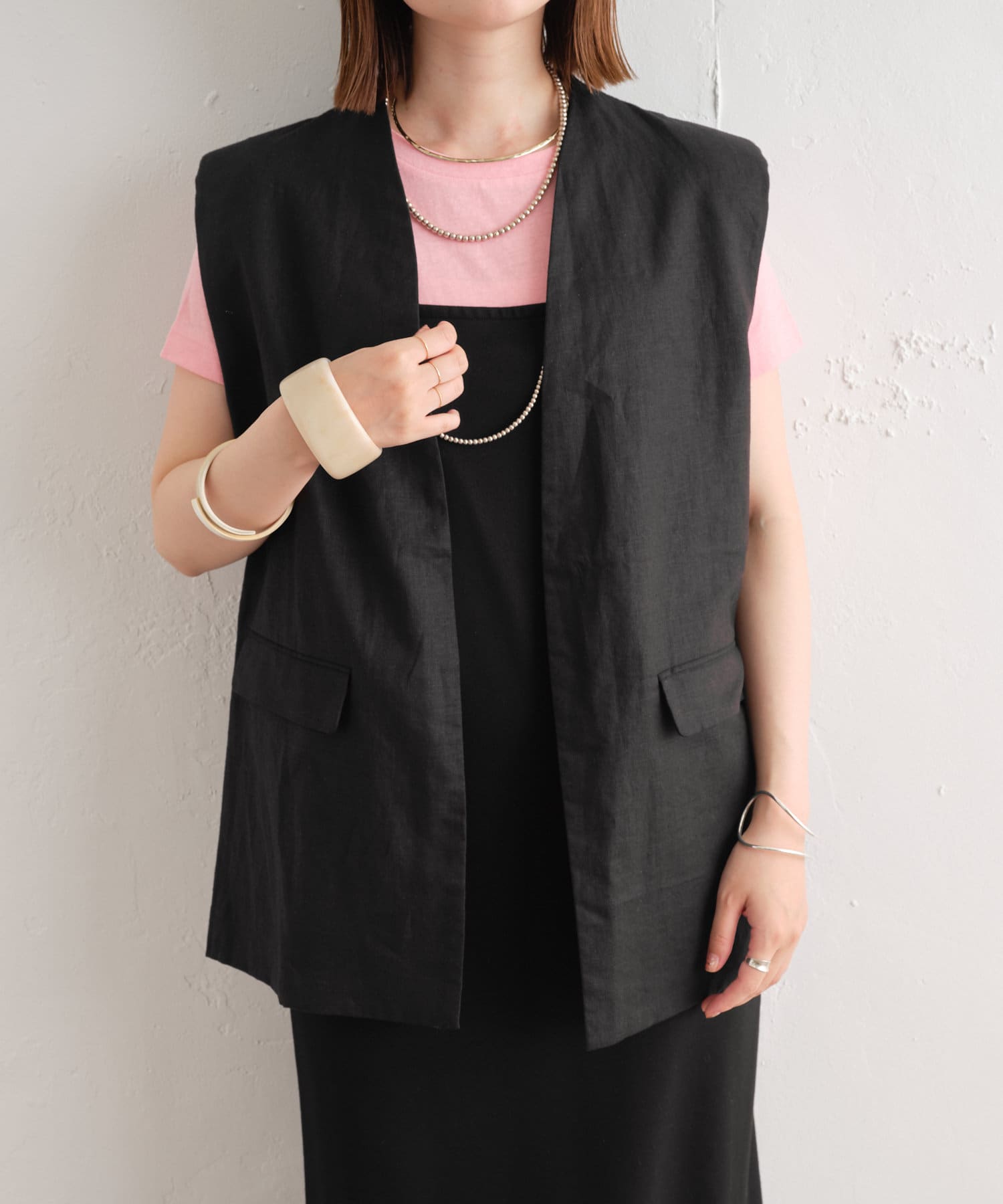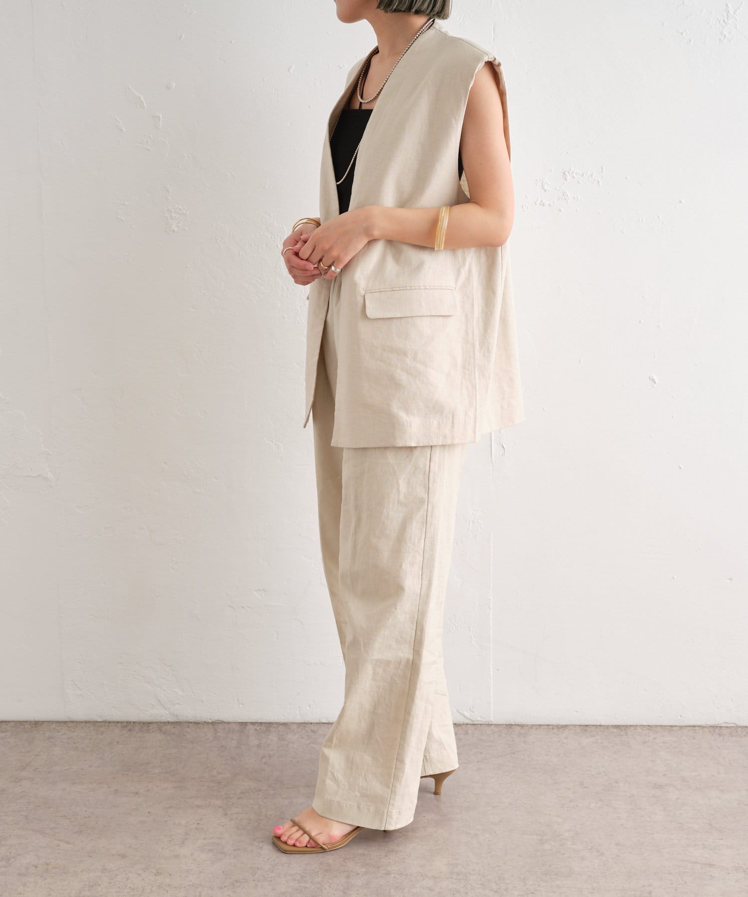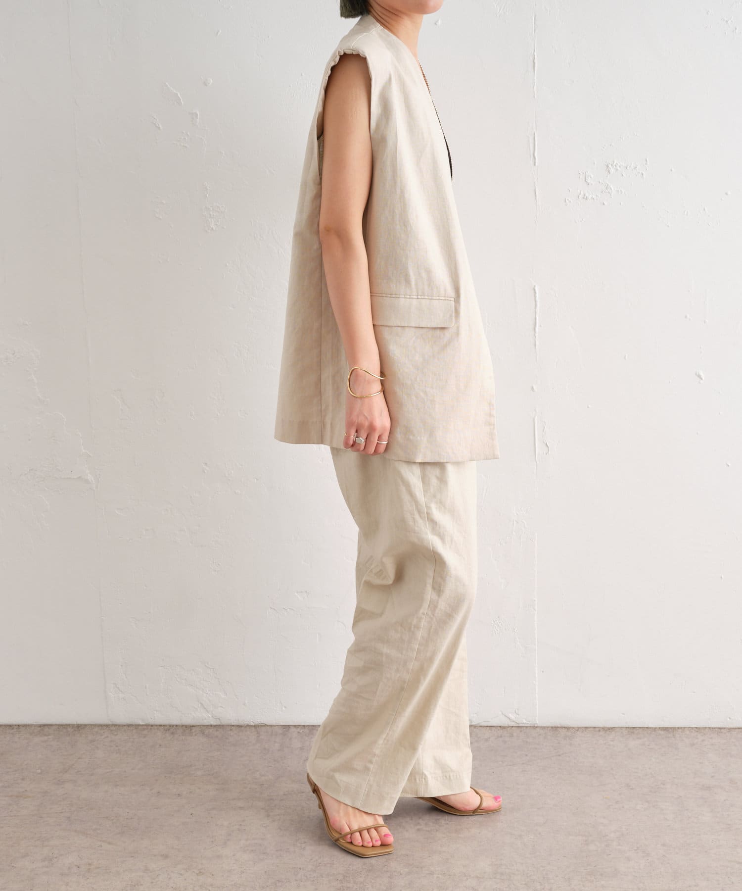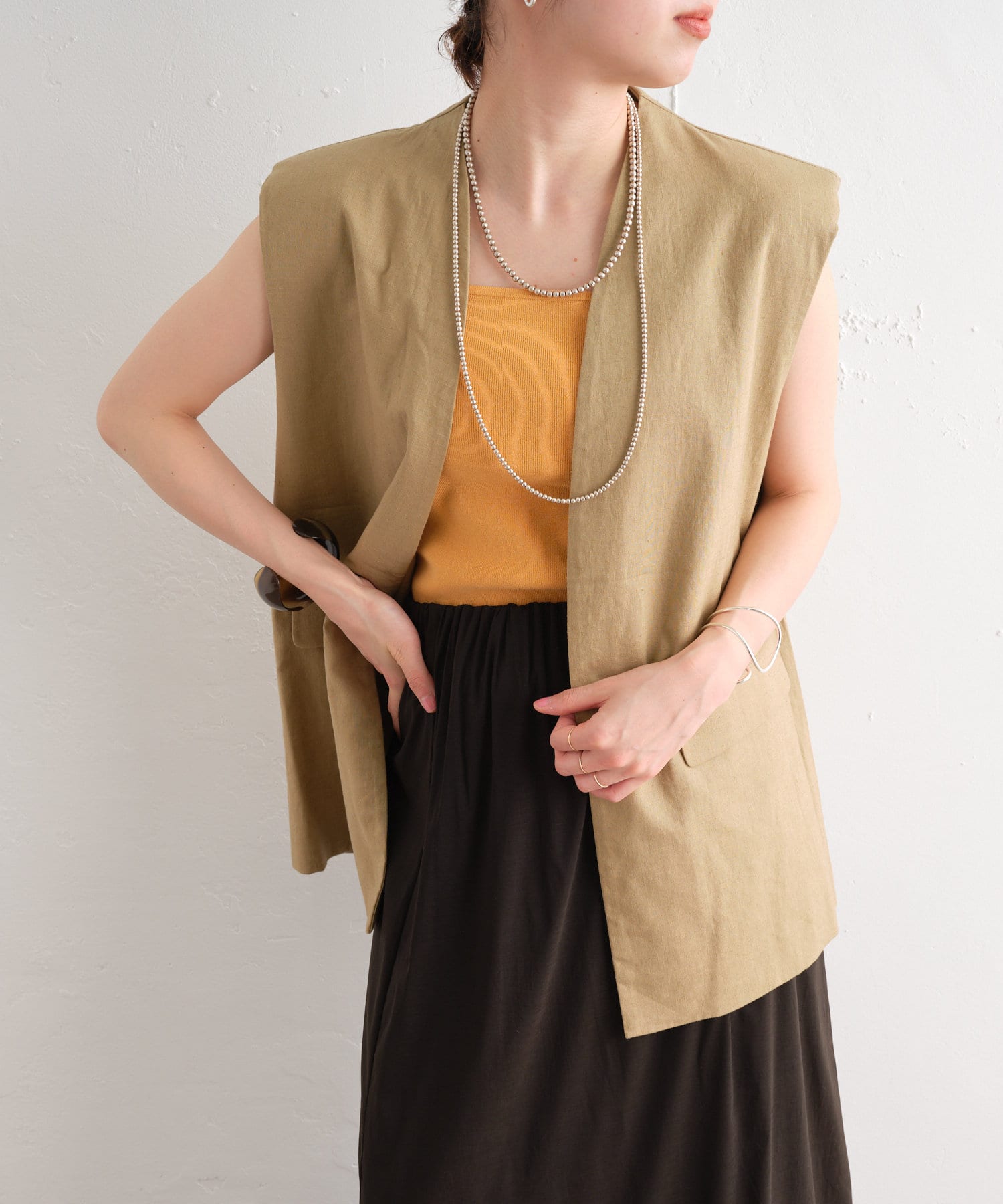 着心地の良いリネン素材のノーカラーベスト