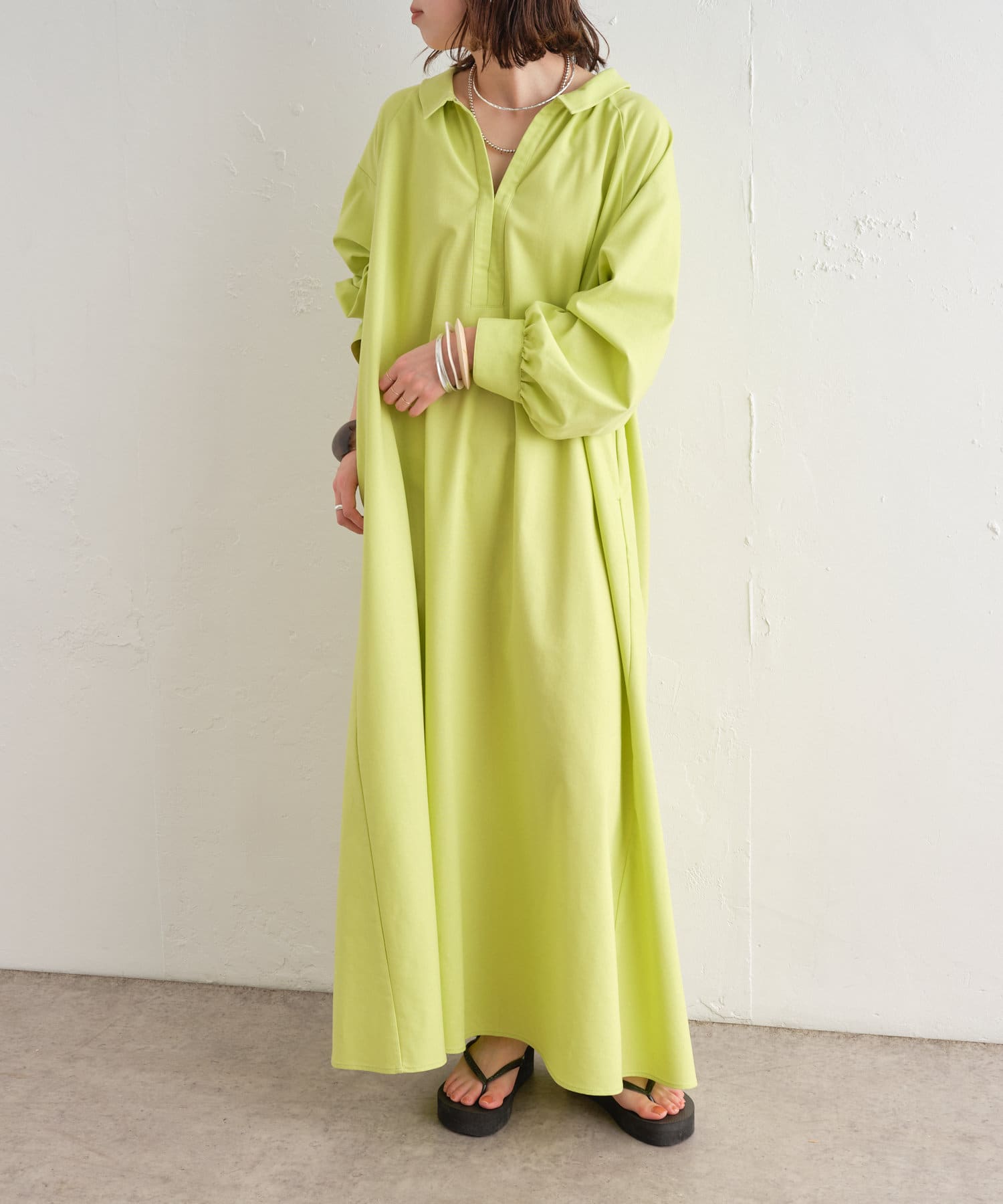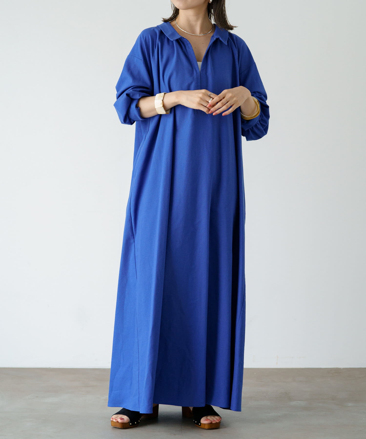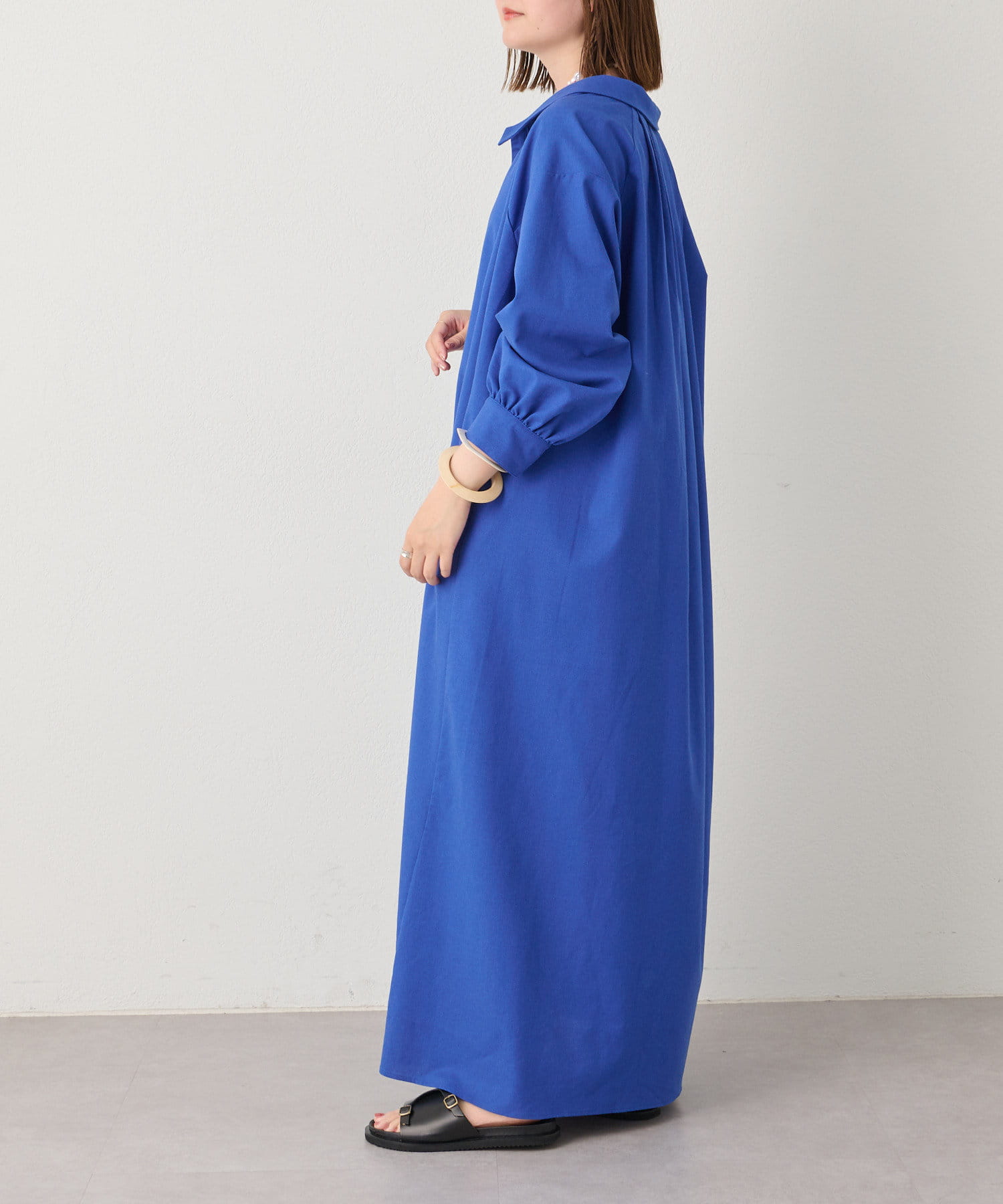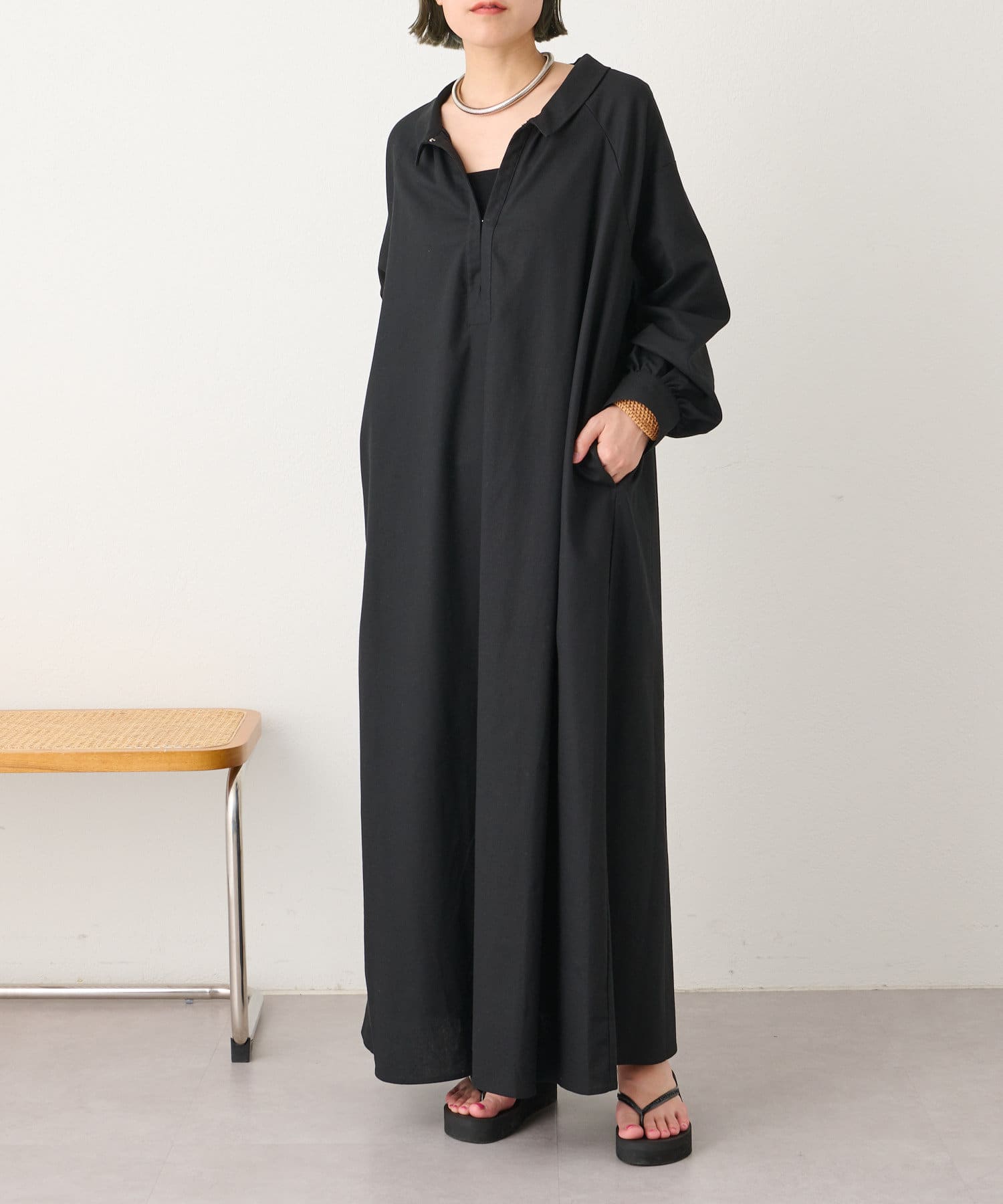 ・春夏らしいリネン素材を使用したナチュラルな風合いと、締め付けのないゆったりとしたシルエットがリラックス感のあるマキシ丈のワンピースです。