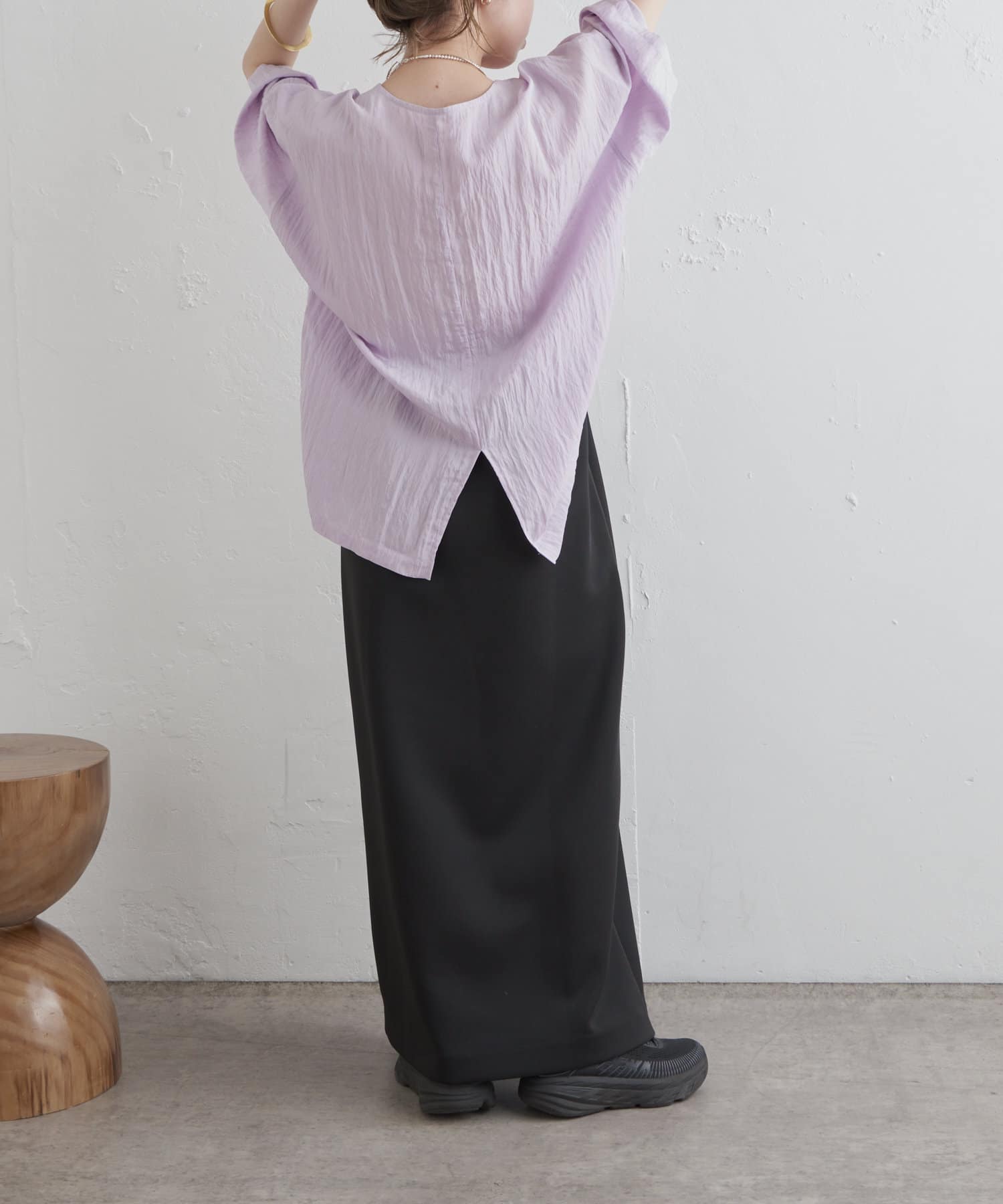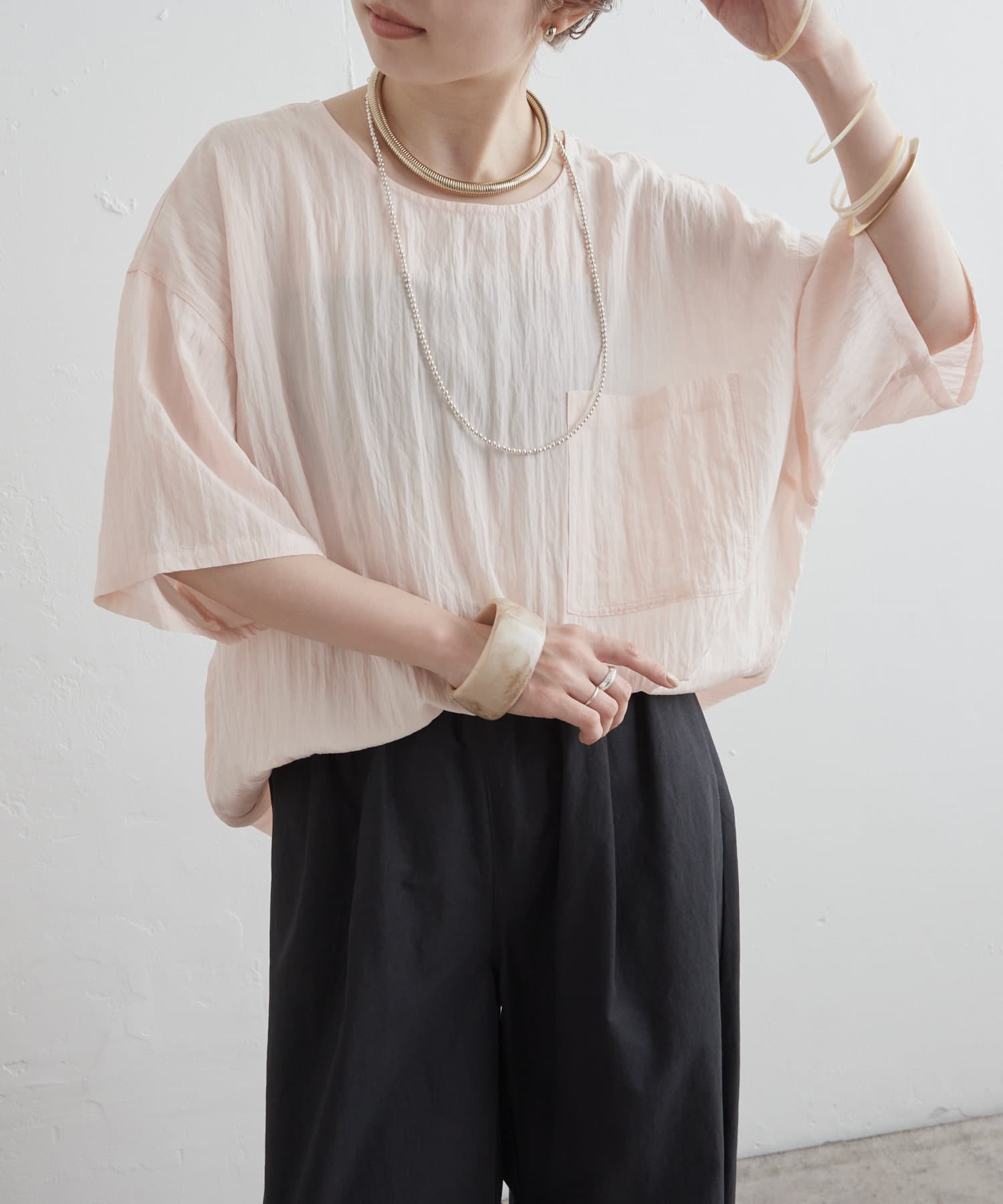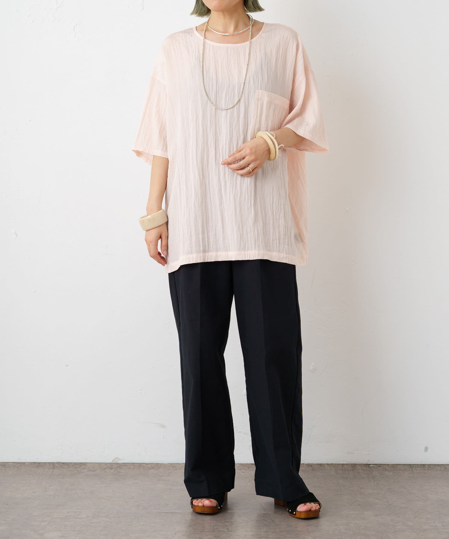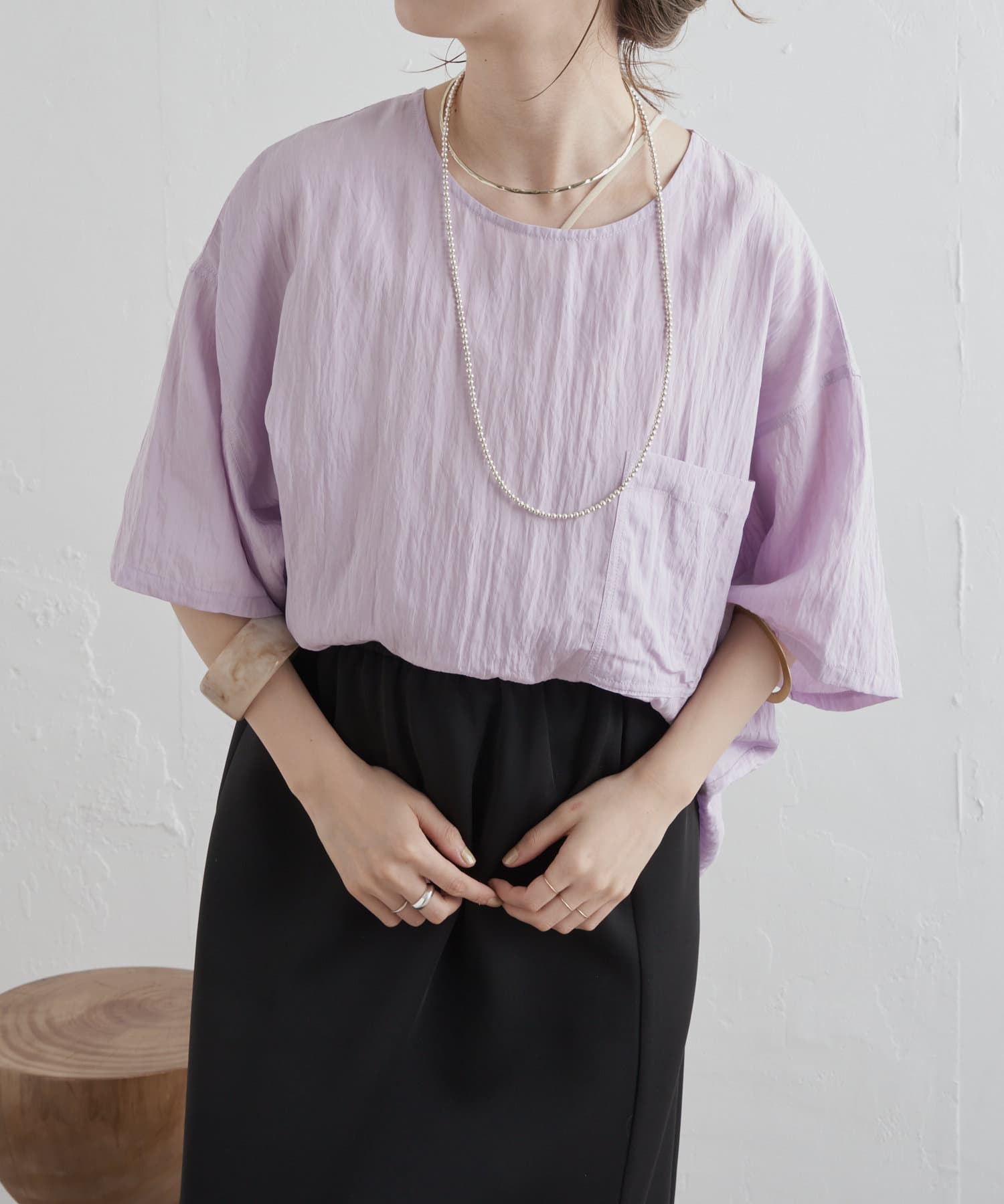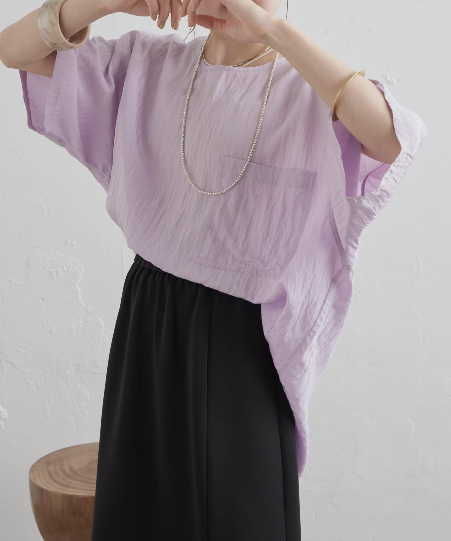・Tシャツのようなカジュアルなデザインですが、ややつやのある素材がきれい見えするブラウス
