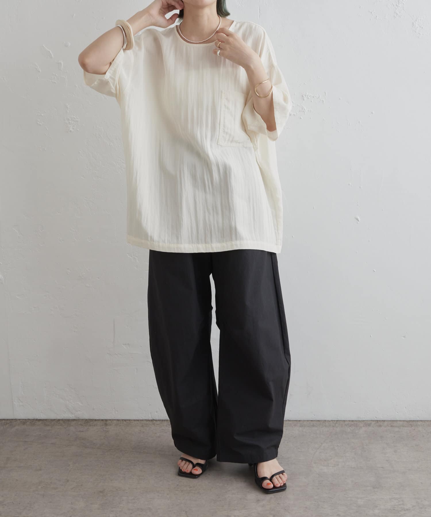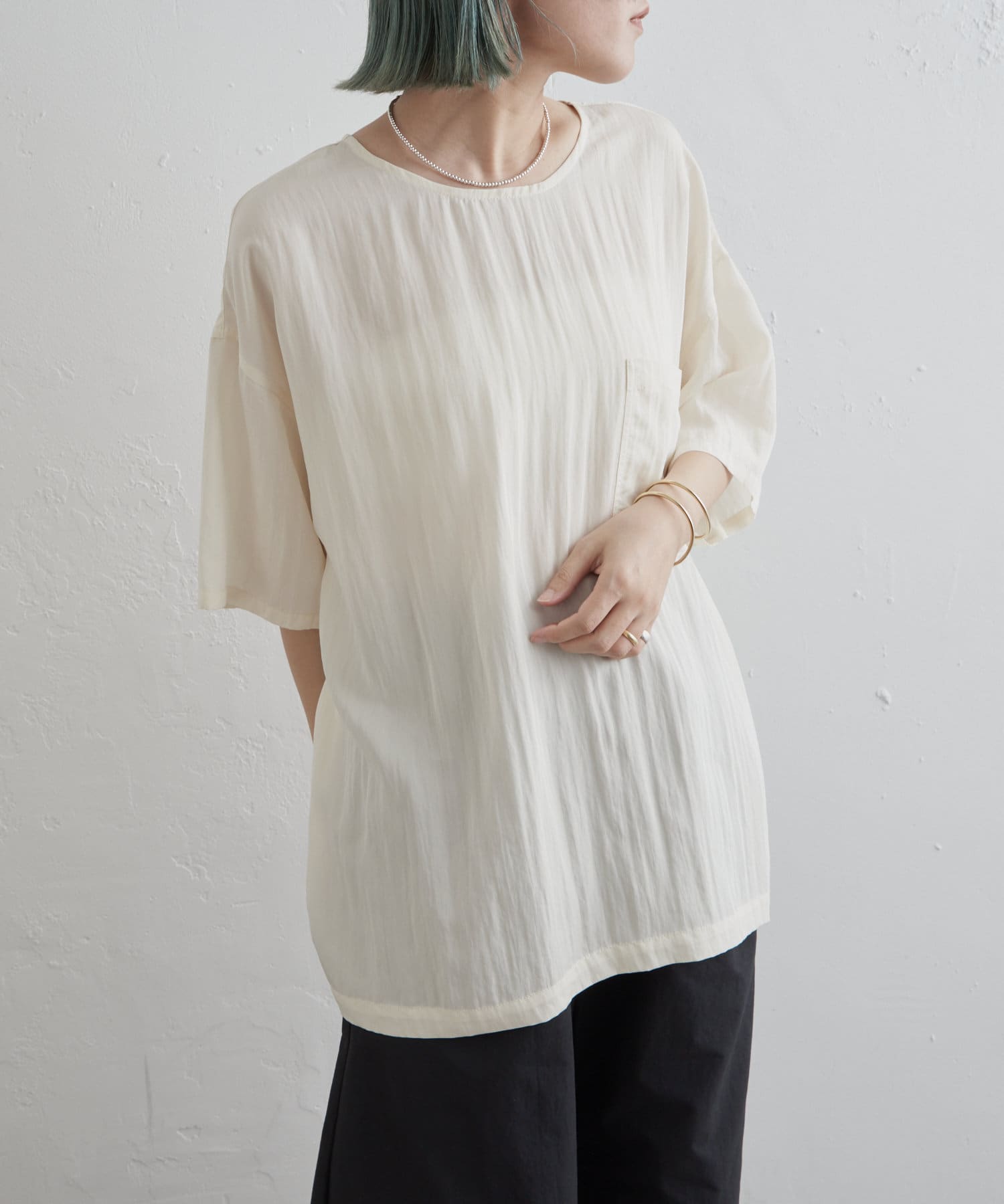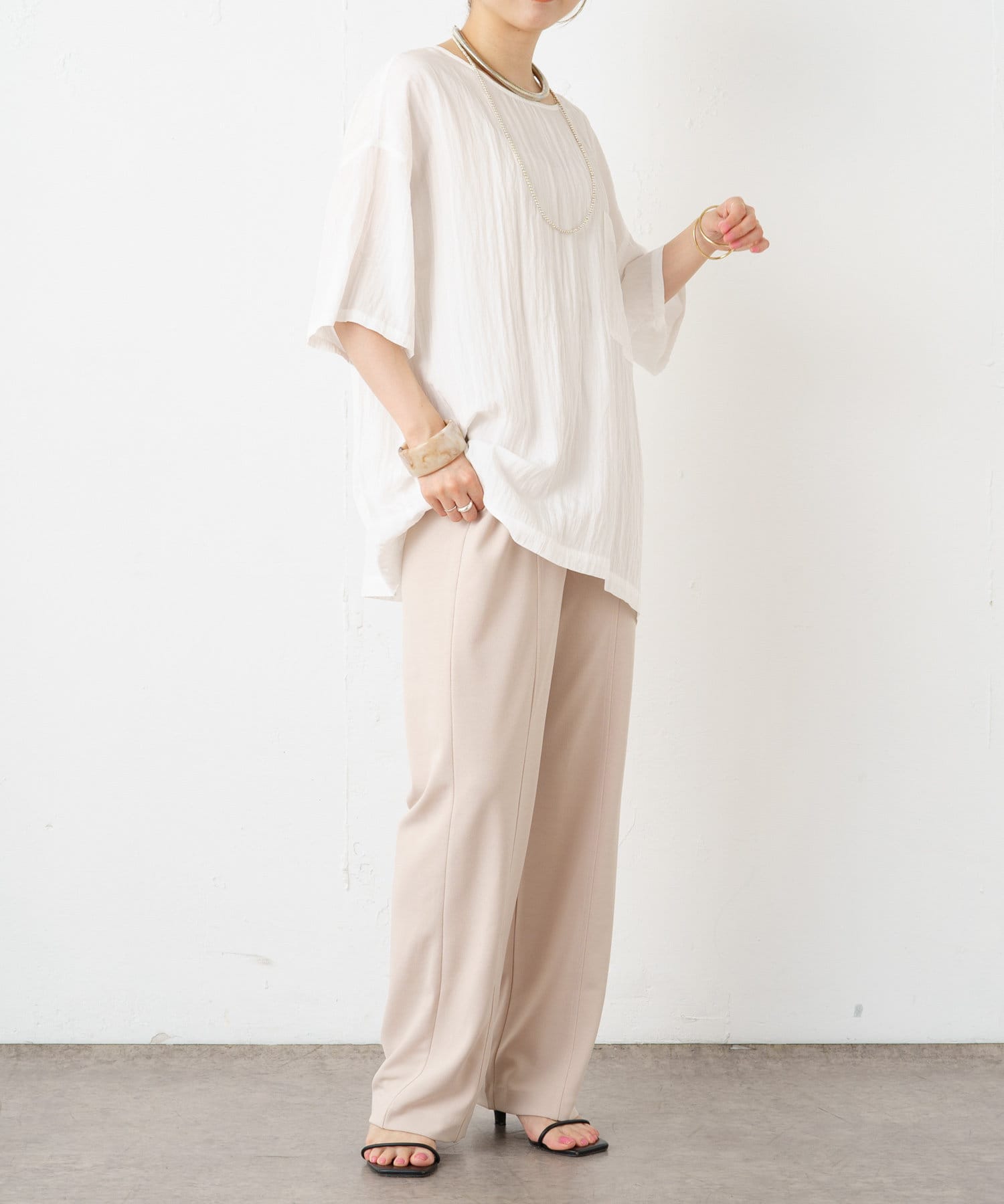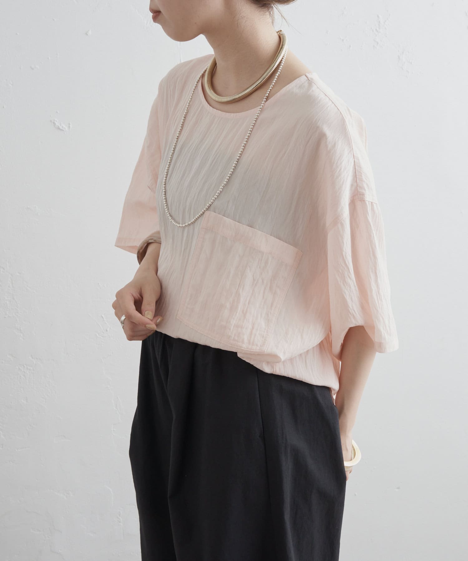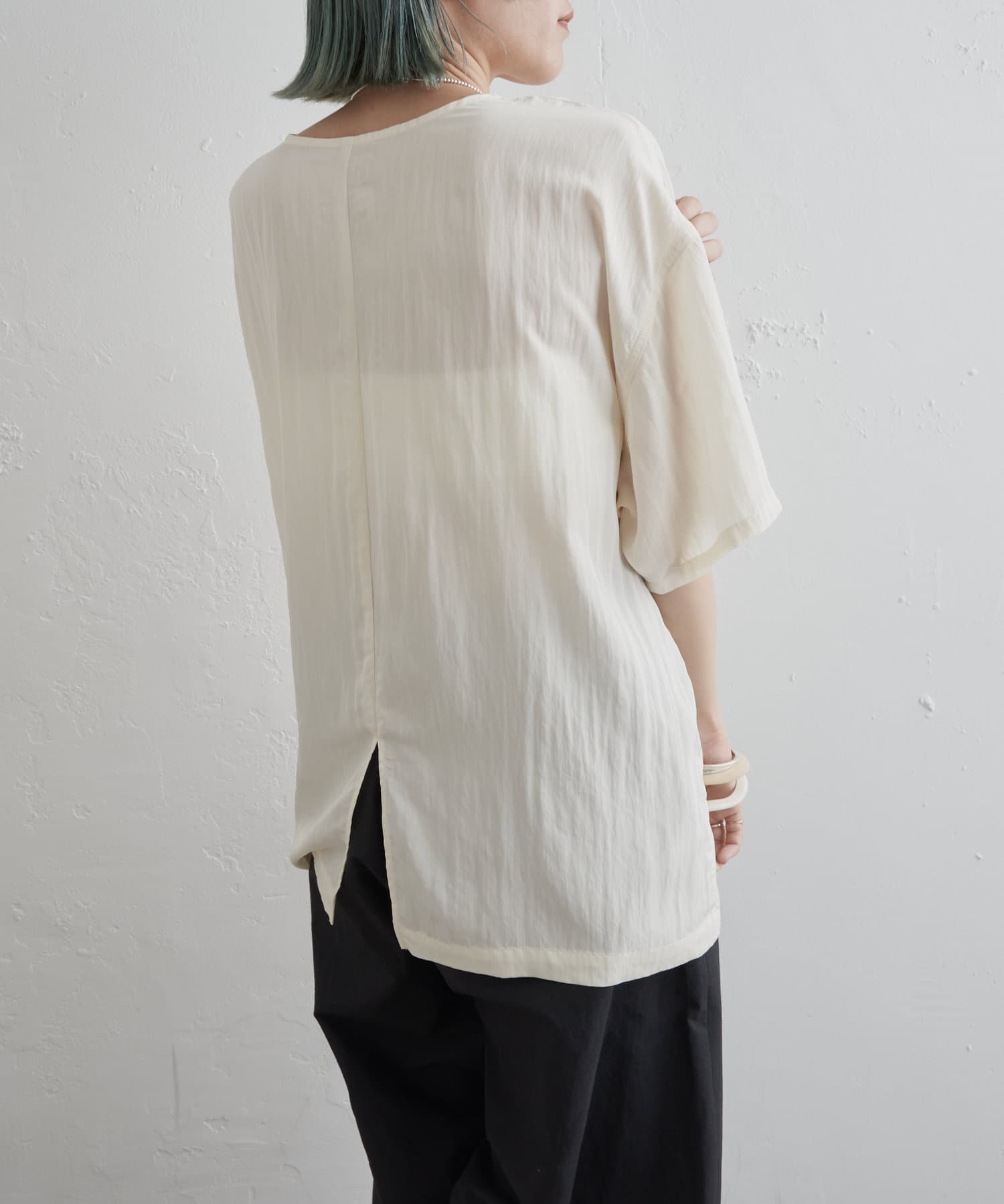 ・Tシャツのようなカジュアルなデザインですが、ややつやのある素材がきれい見えするブラウス