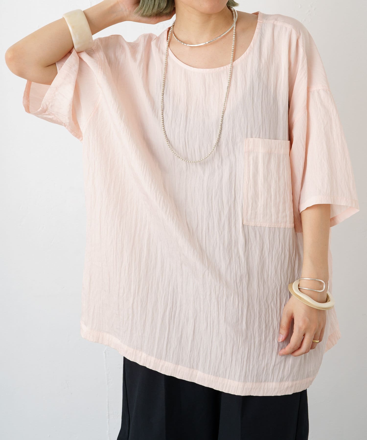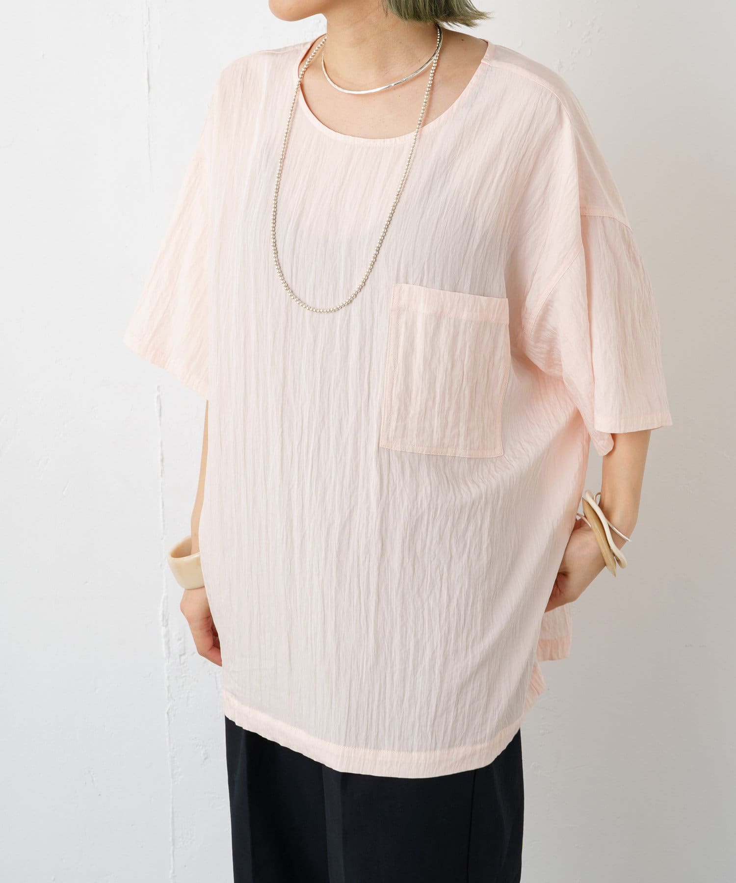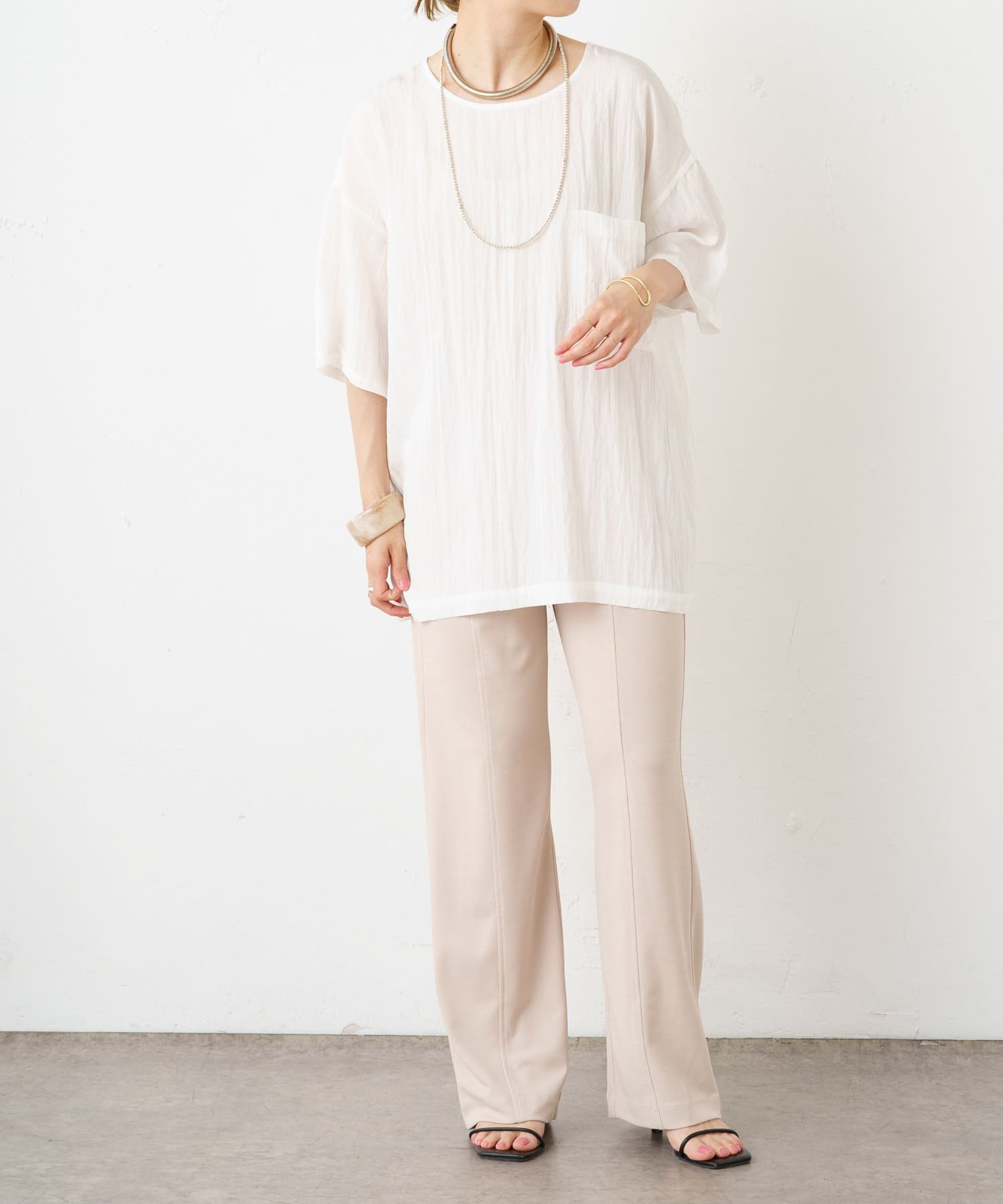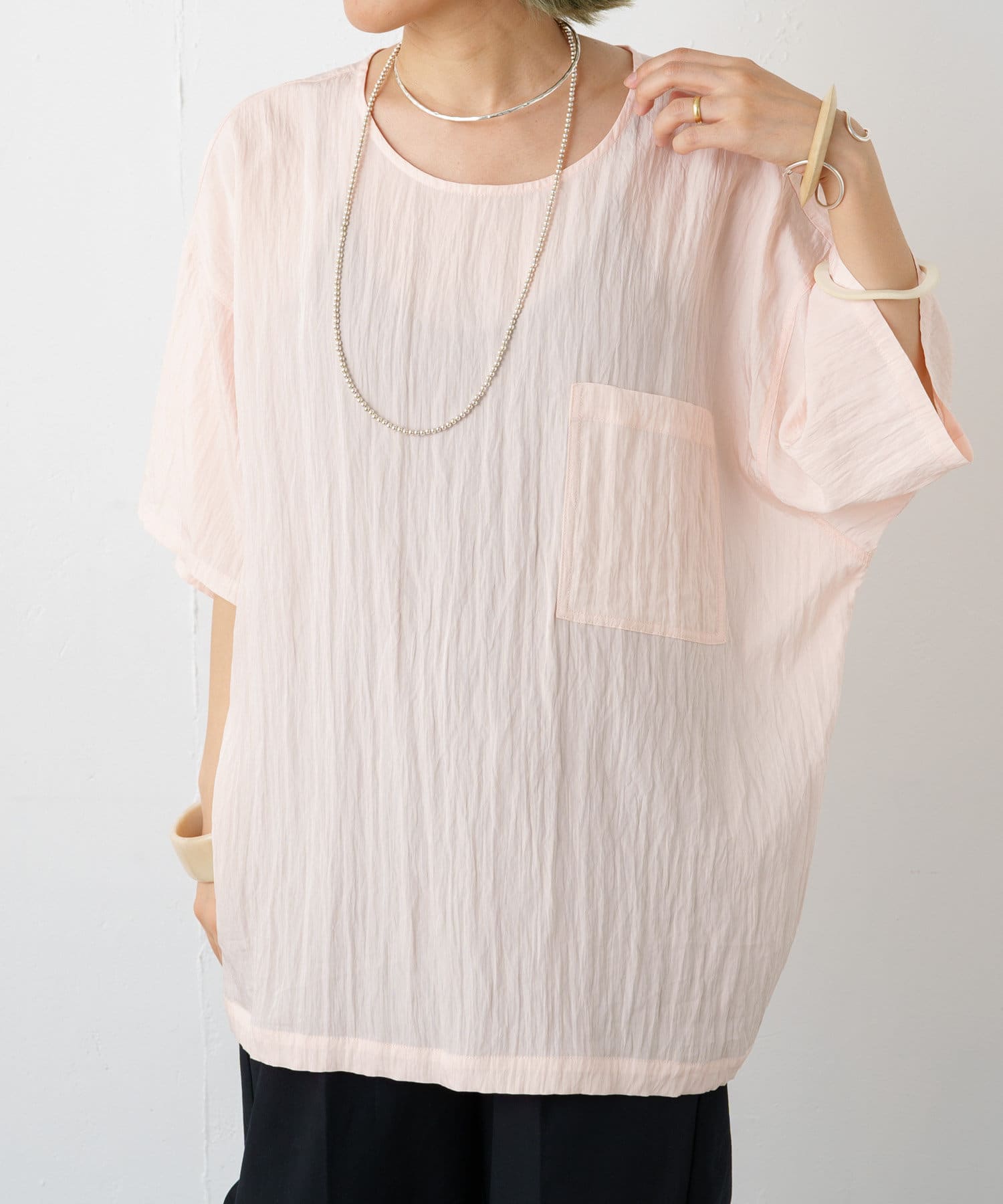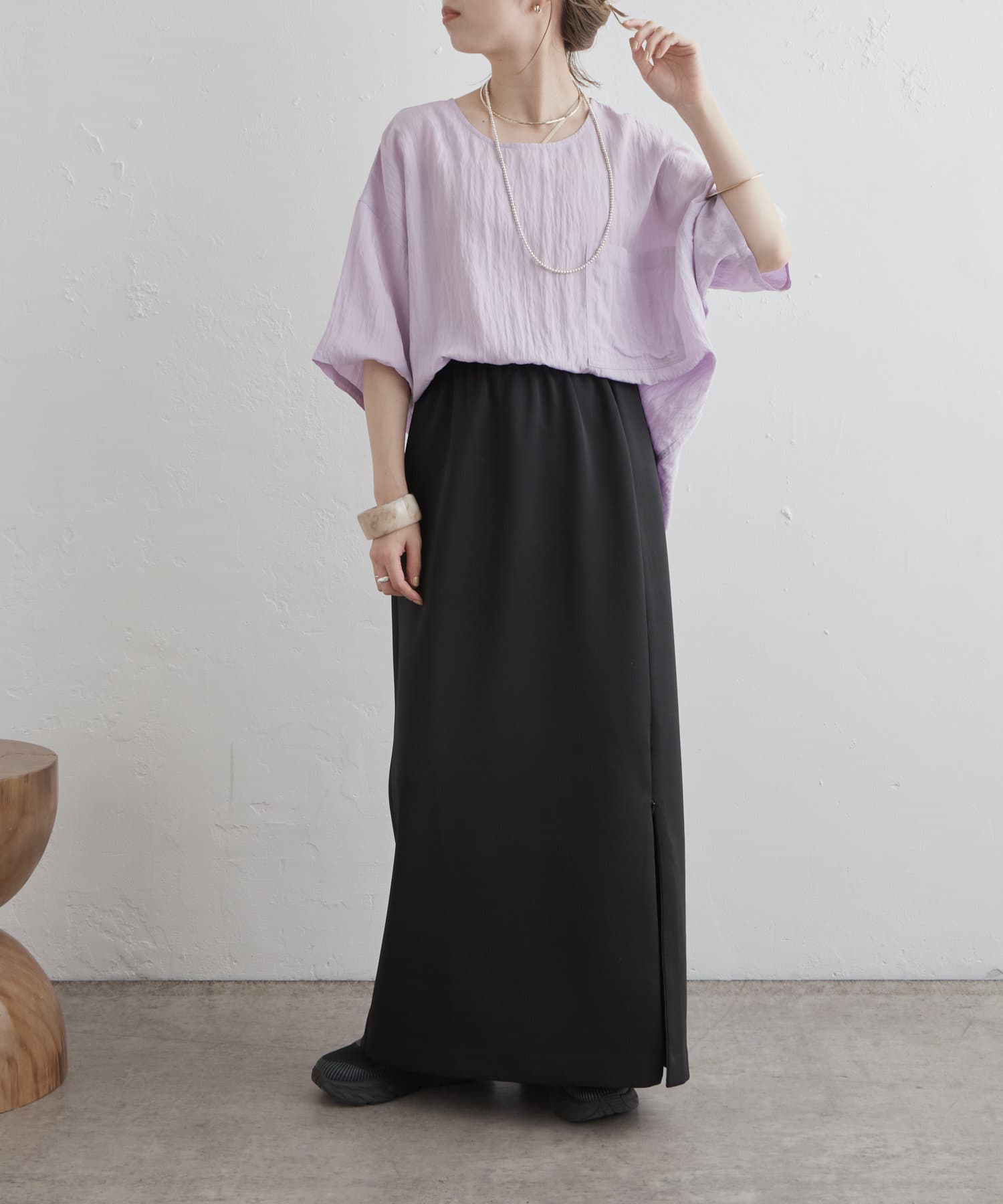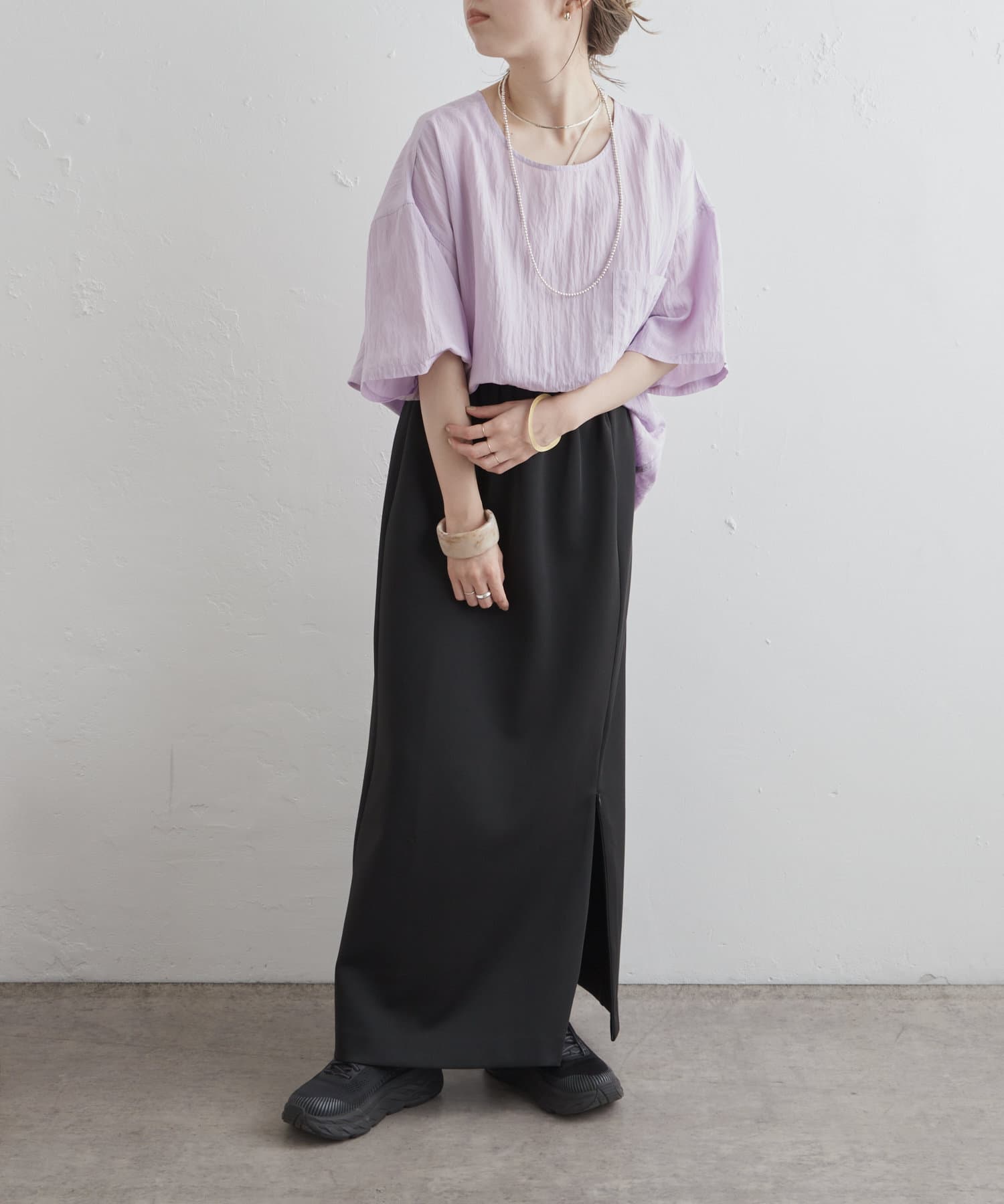 ・Tシャツのようなカジュアルなデザインですが、ややつやのある素材がきれい見えするブラウス