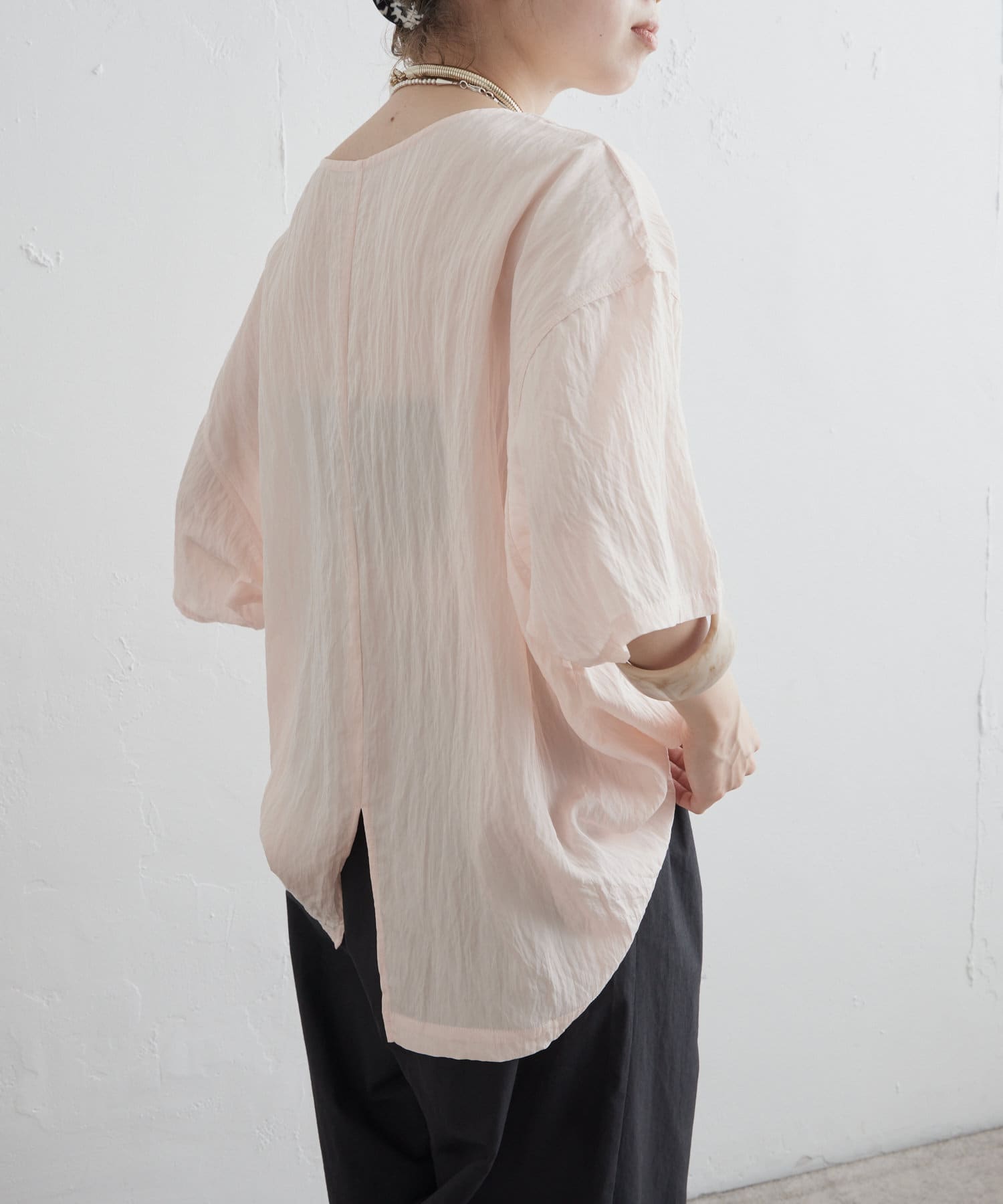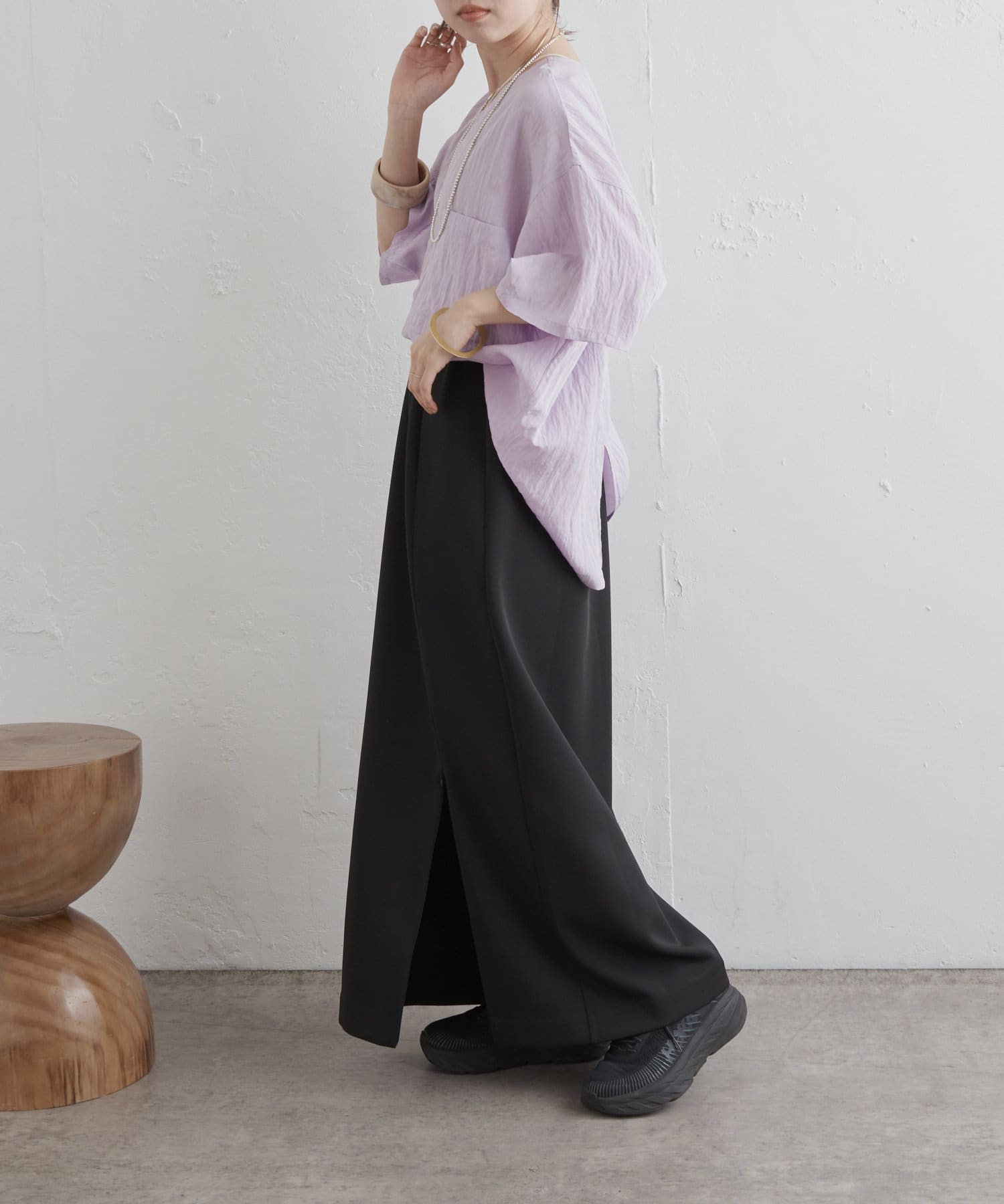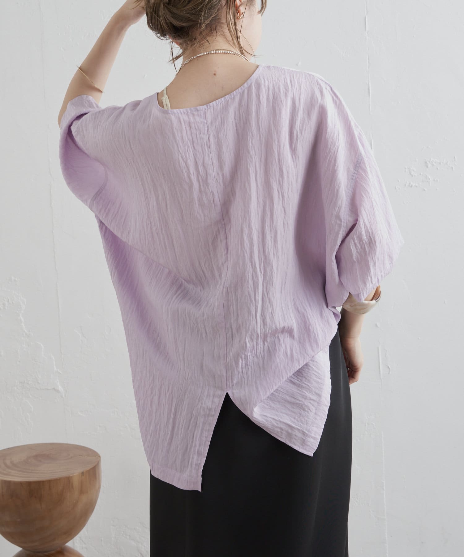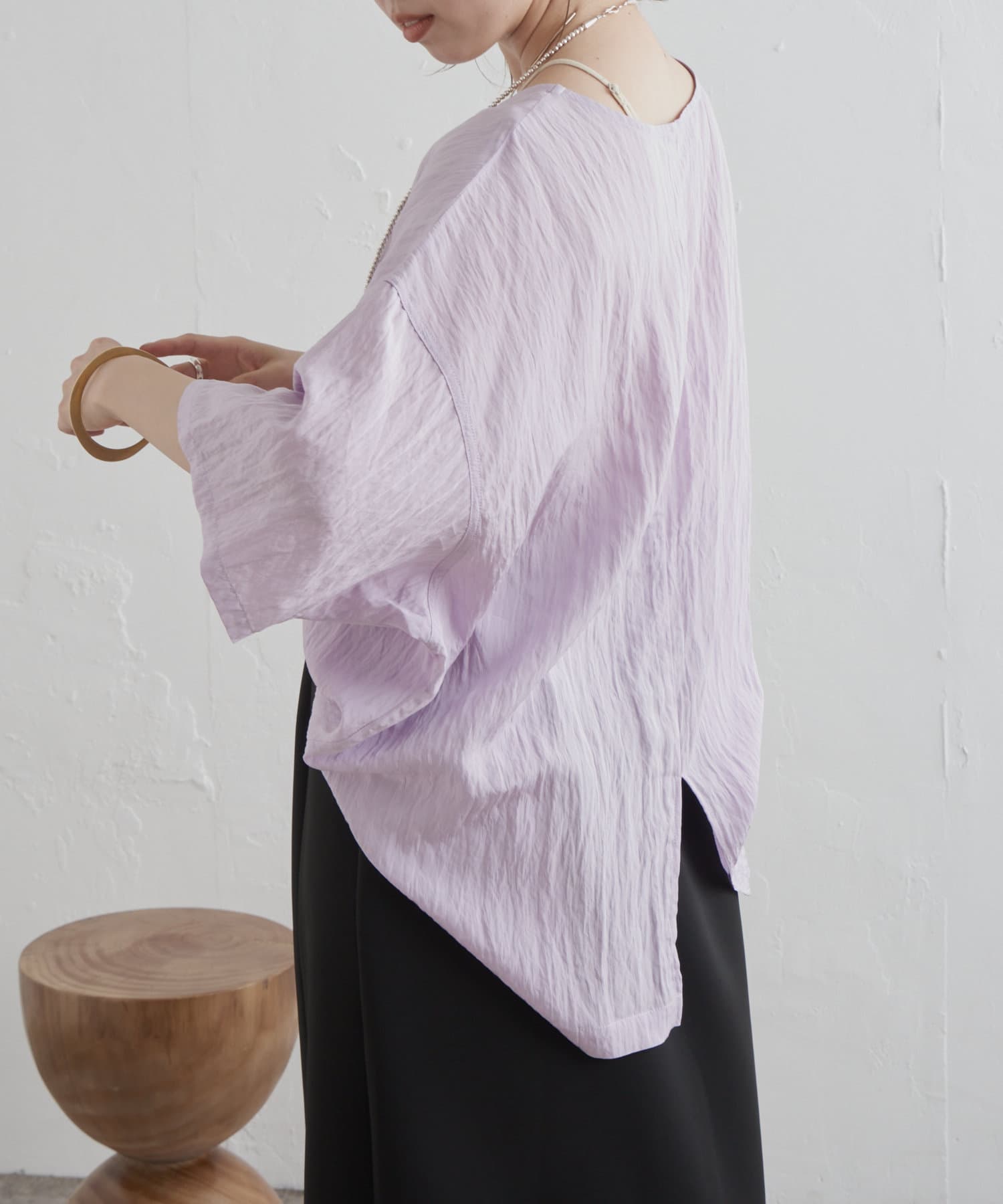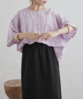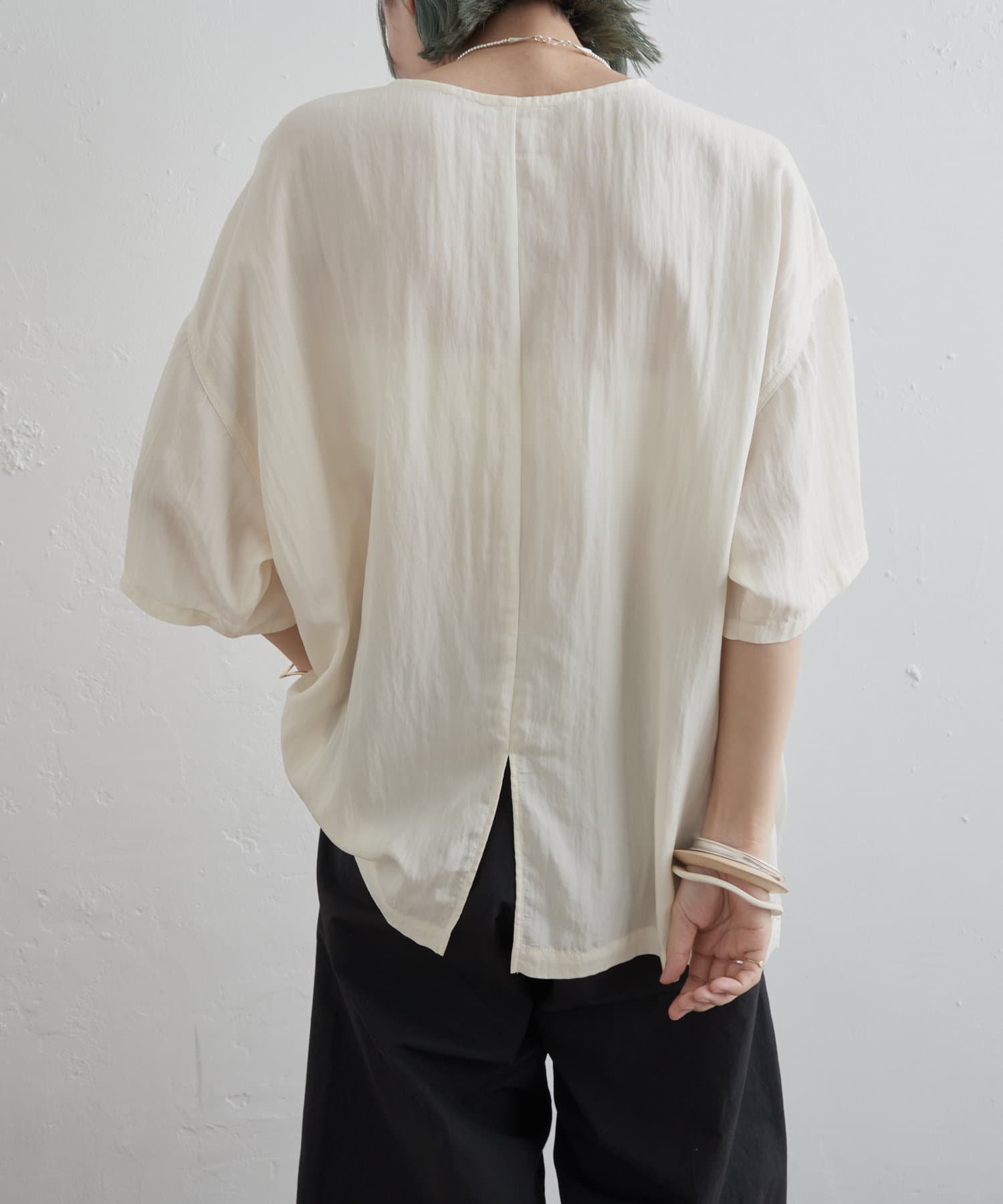 ・Tシャツのようなカジュアルなデザインですが、ややつやのある素材がきれい見えするブラウス