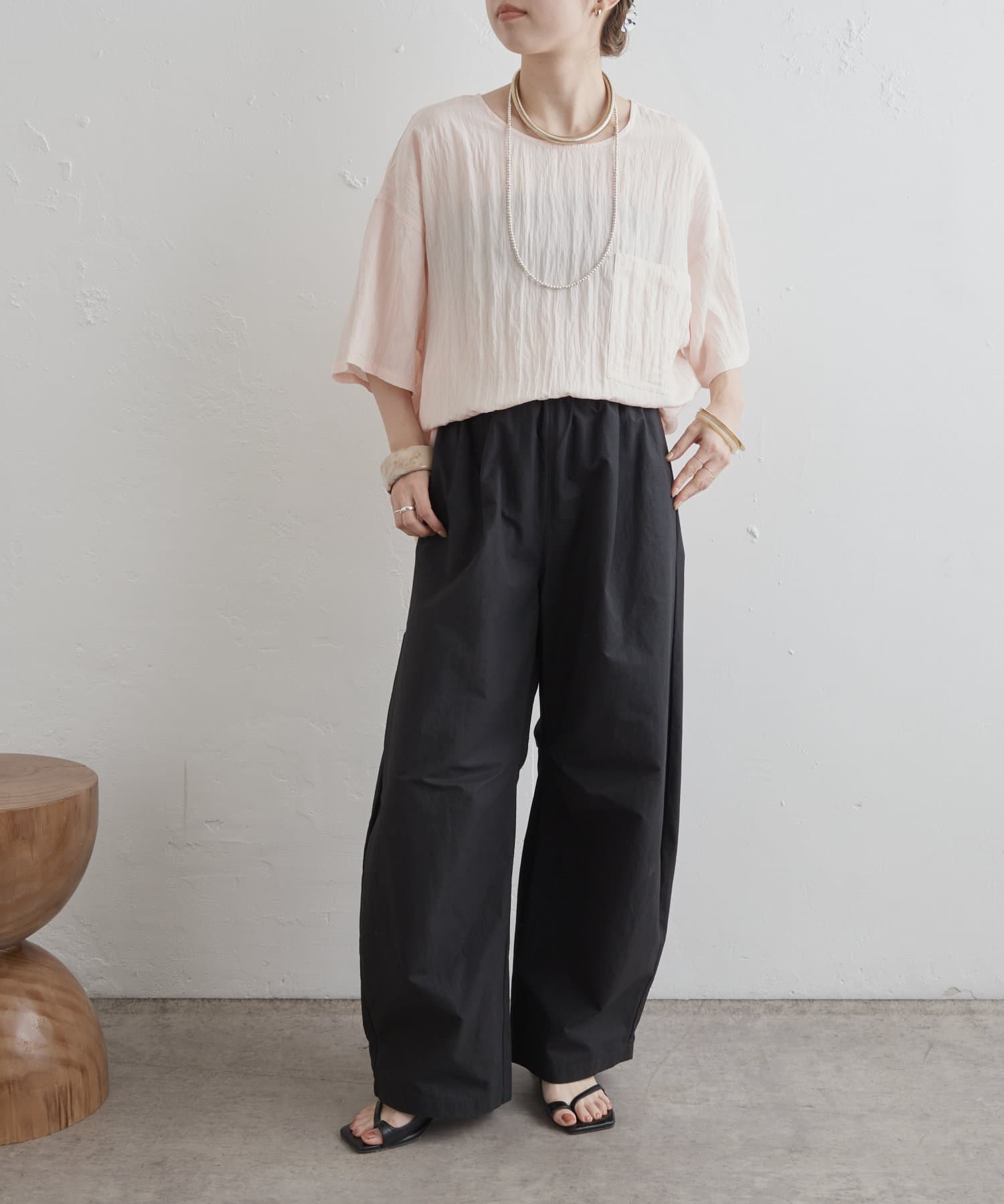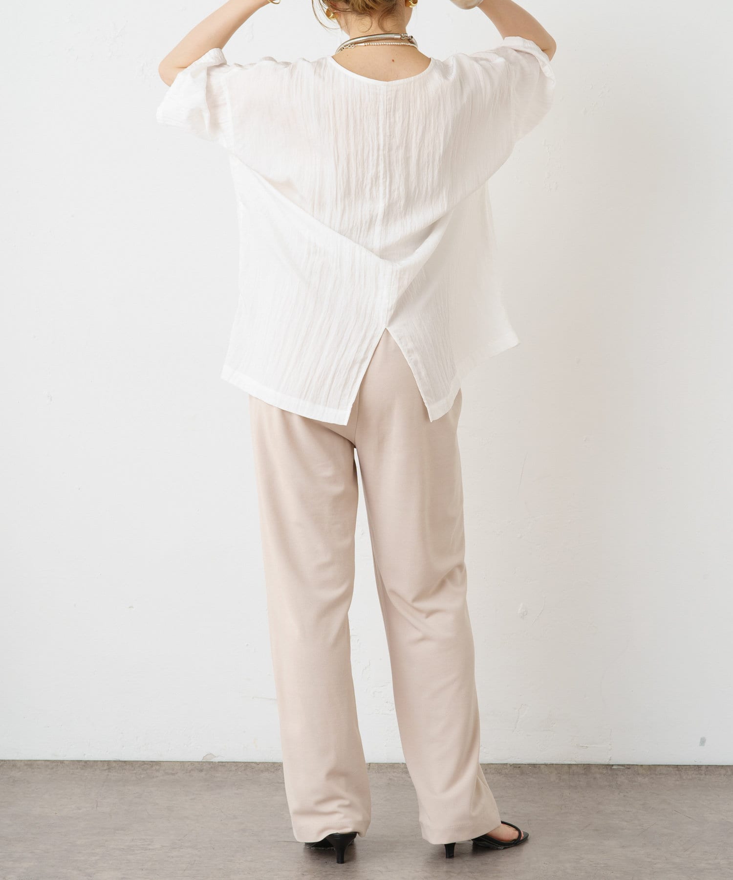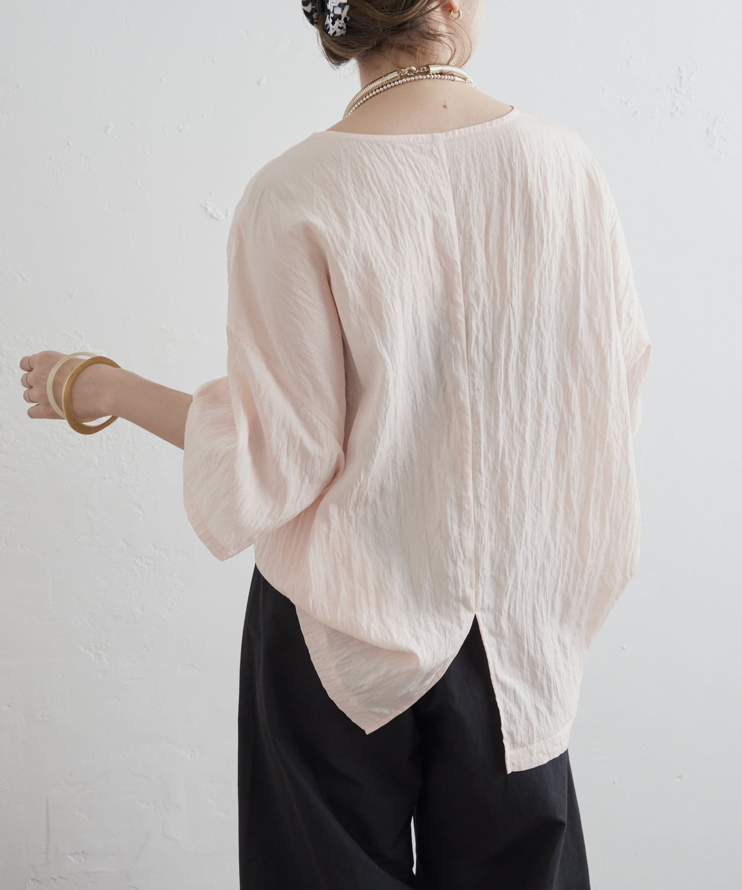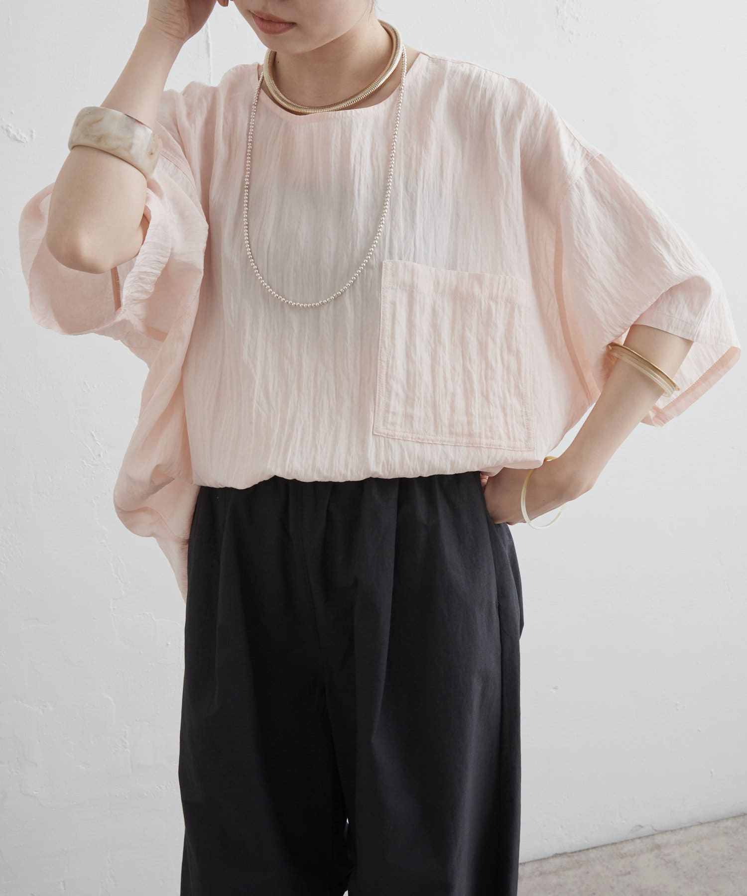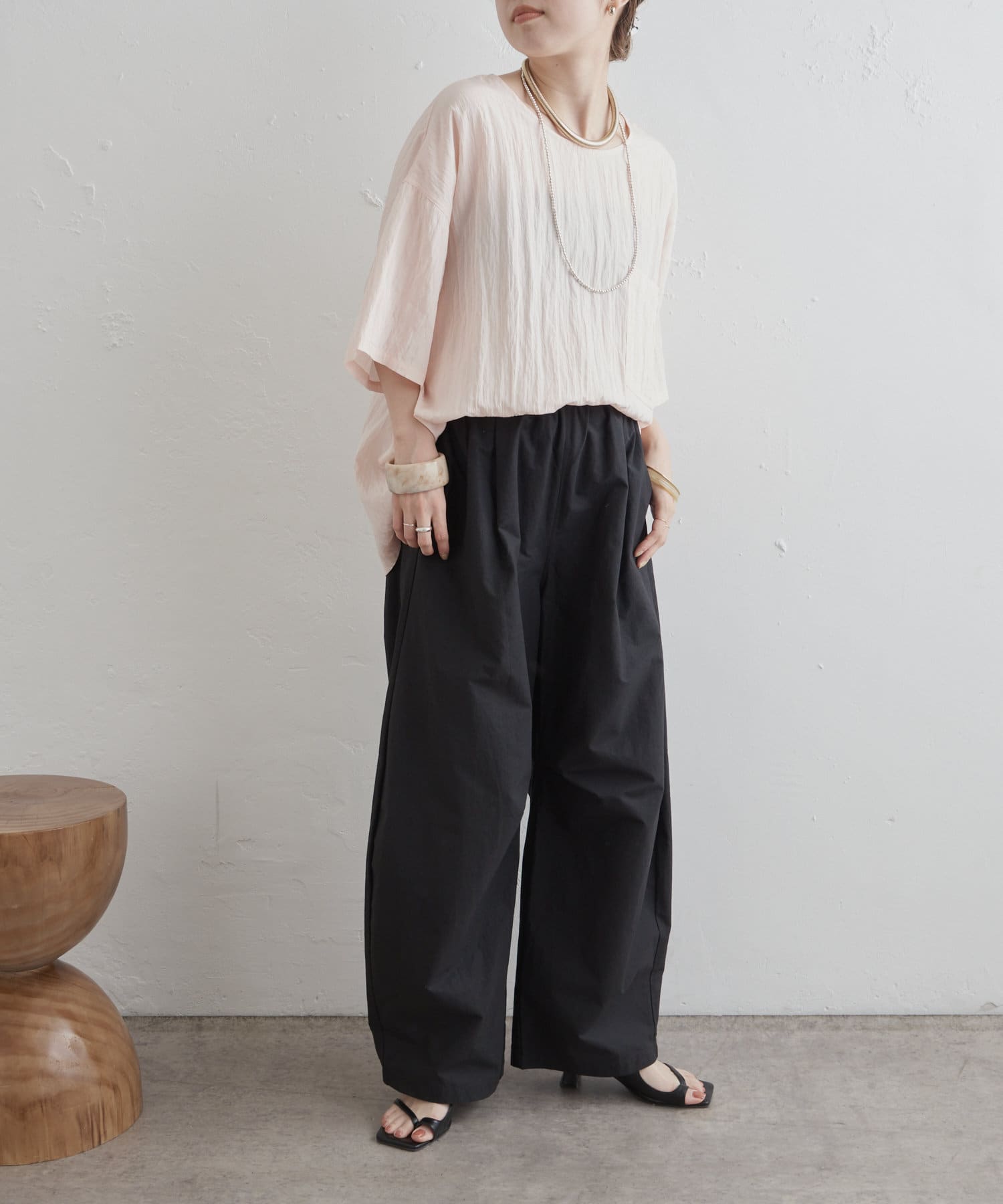 ・Tシャツのようなカジュアルなデザインですが、ややつやのある素材がきれい見えするブラウス