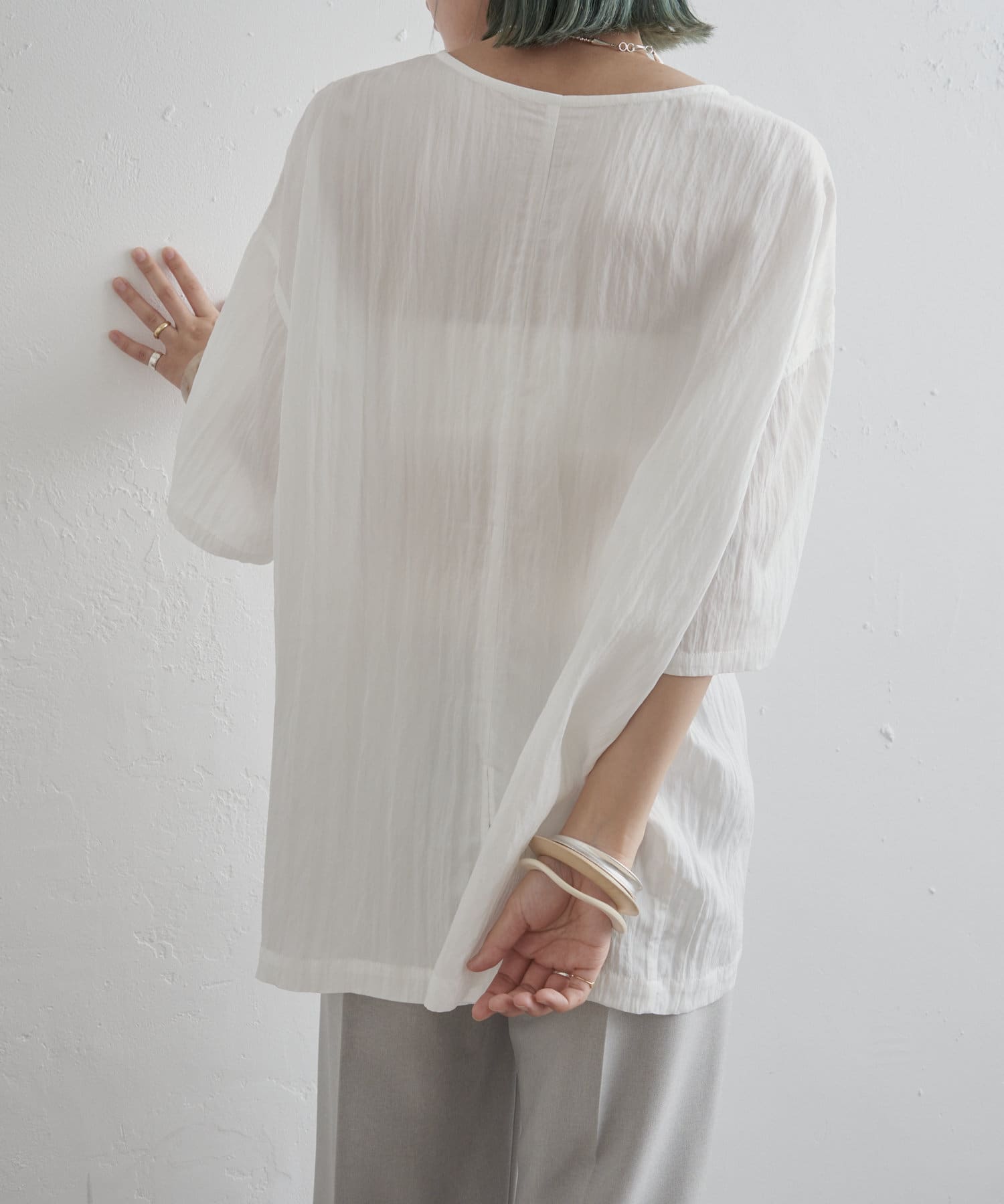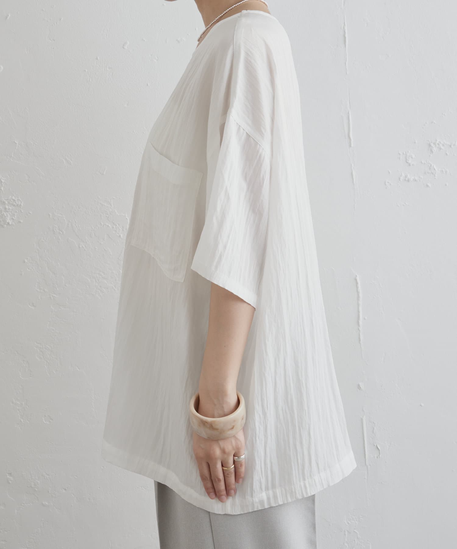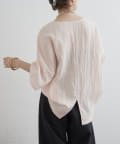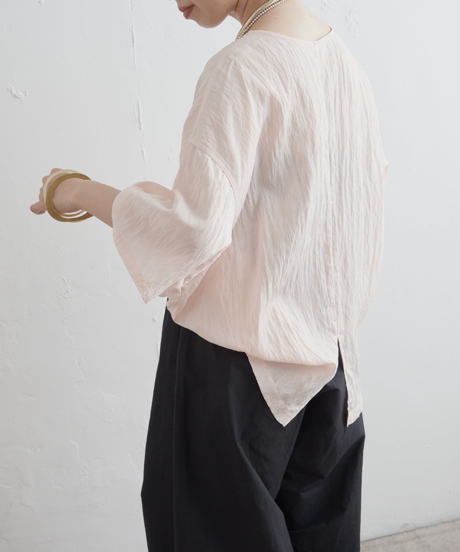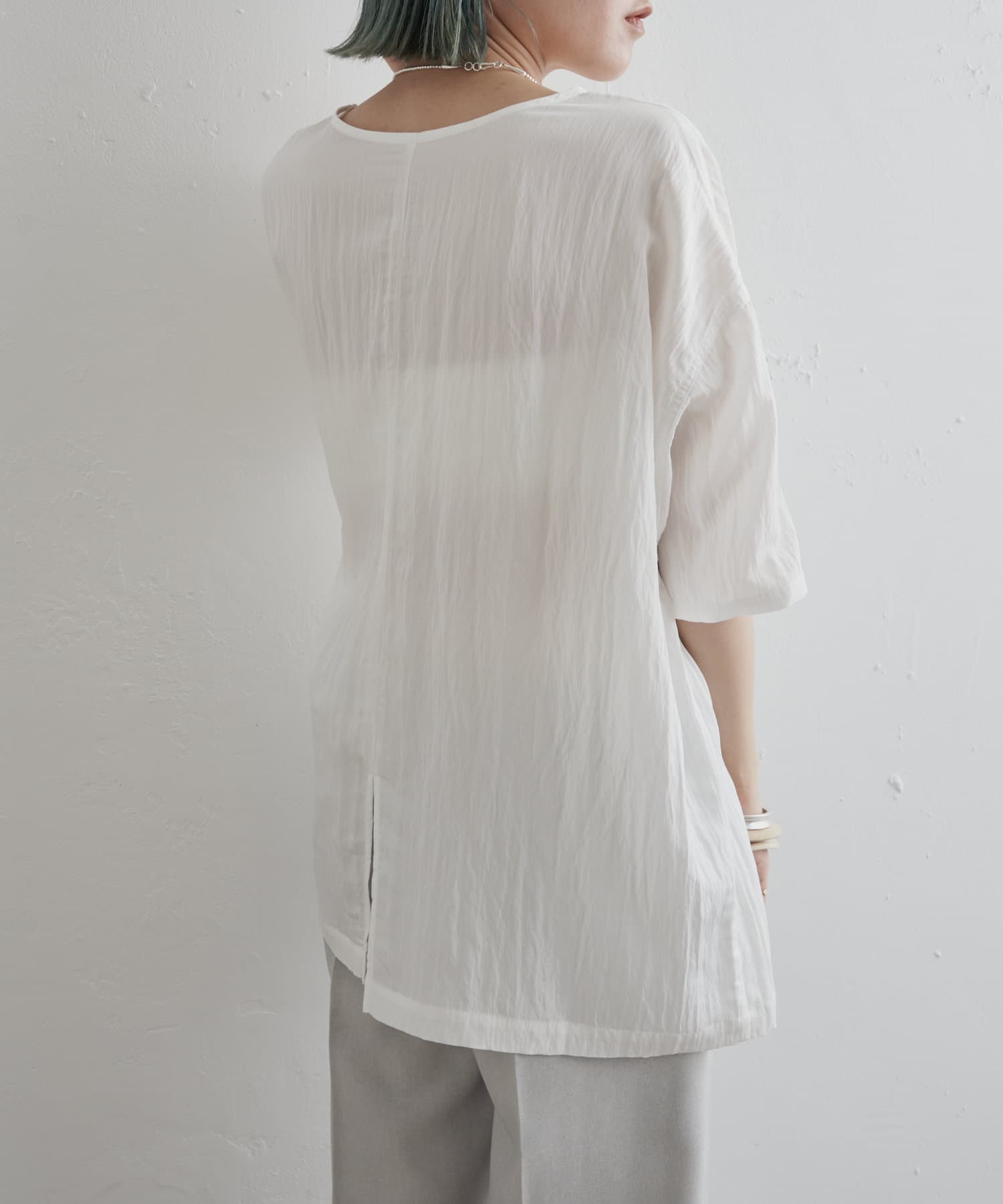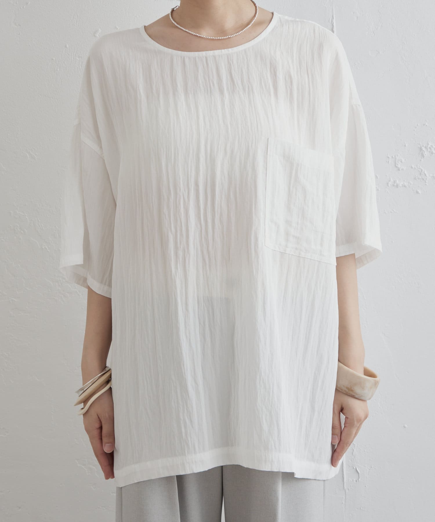 ・Tシャツのようなカジュアルなデザインですが、ややつやのある素材がきれい見えするブラウス