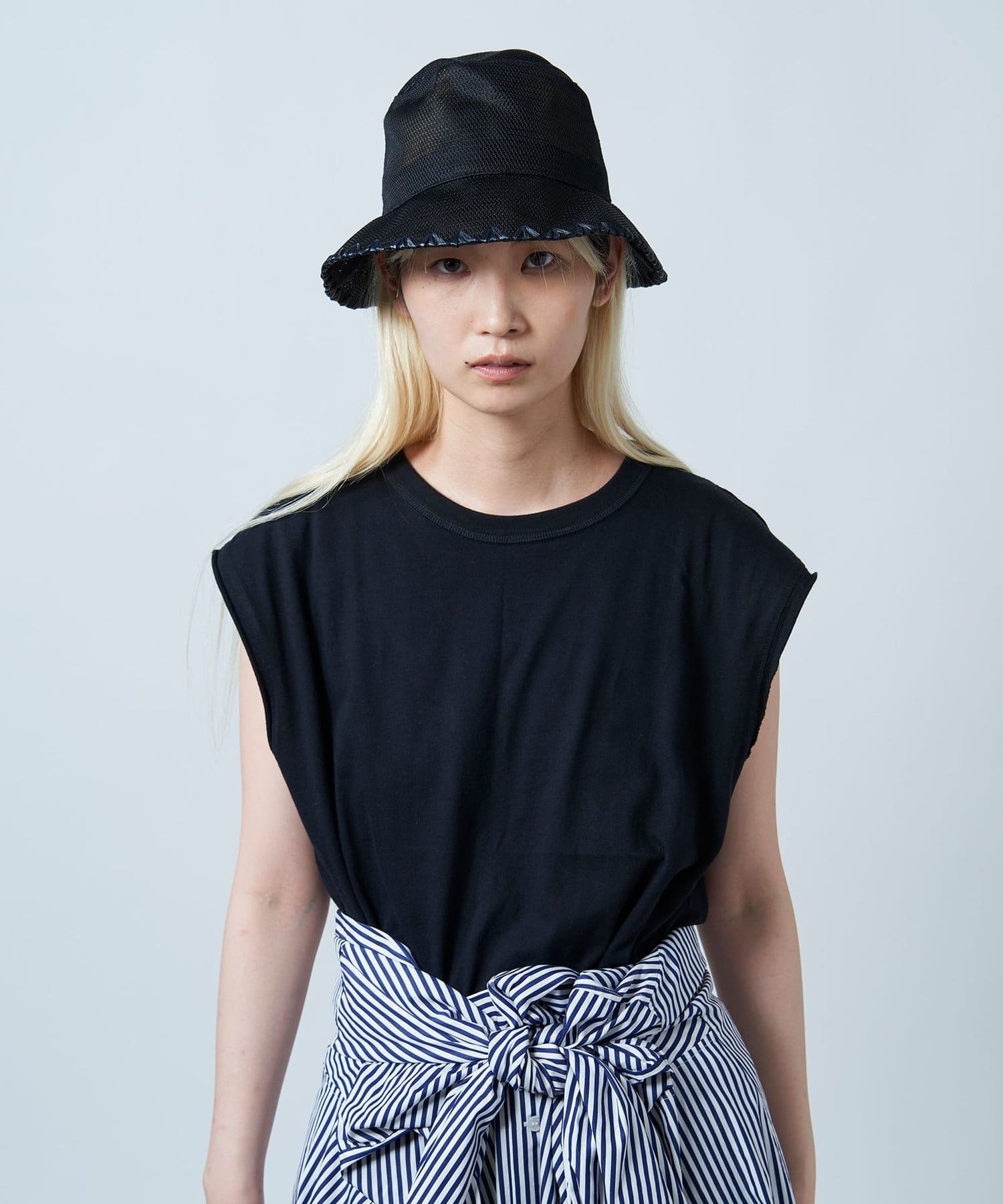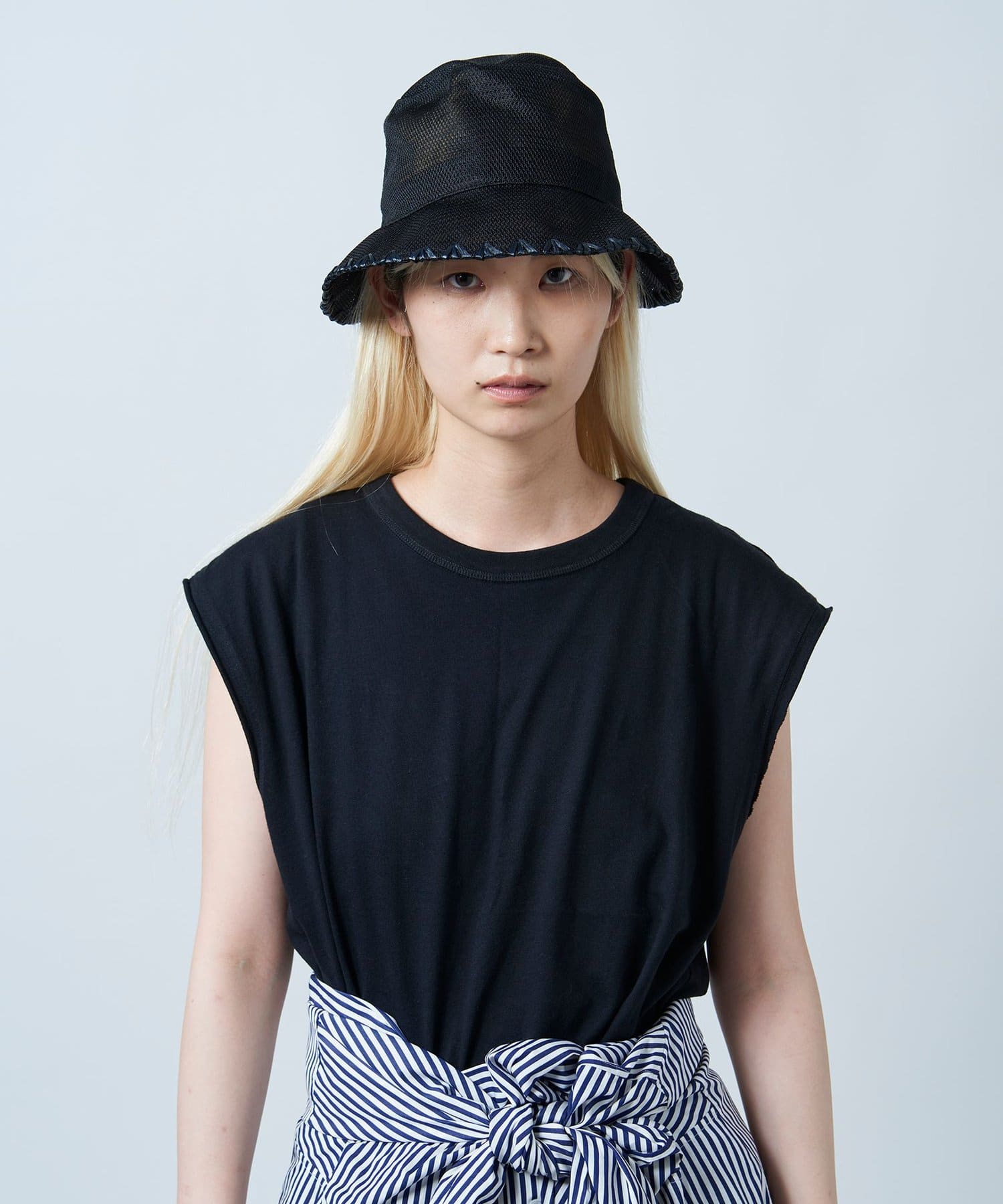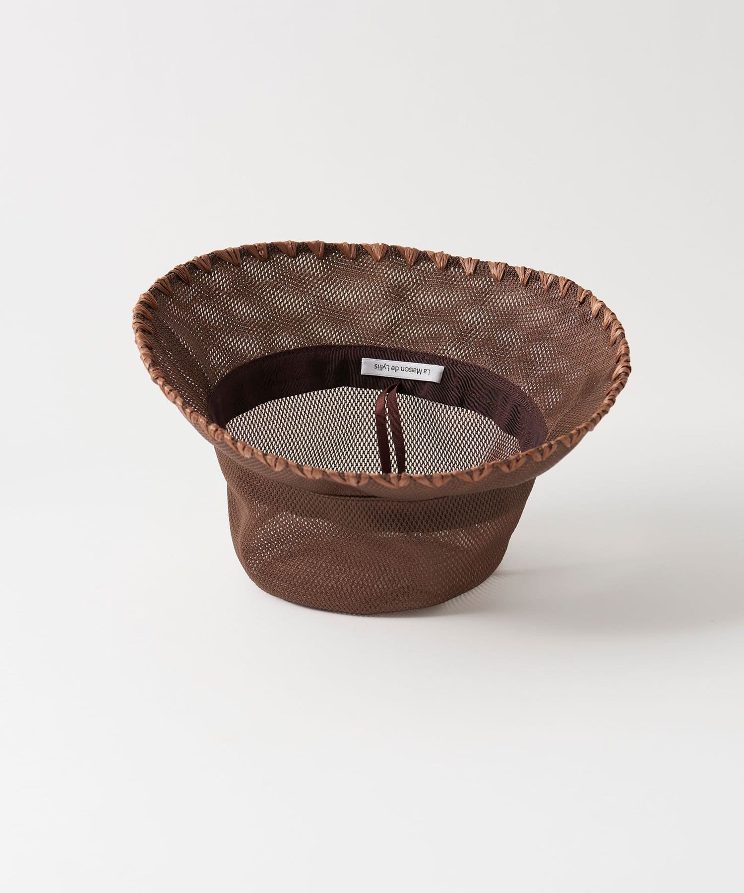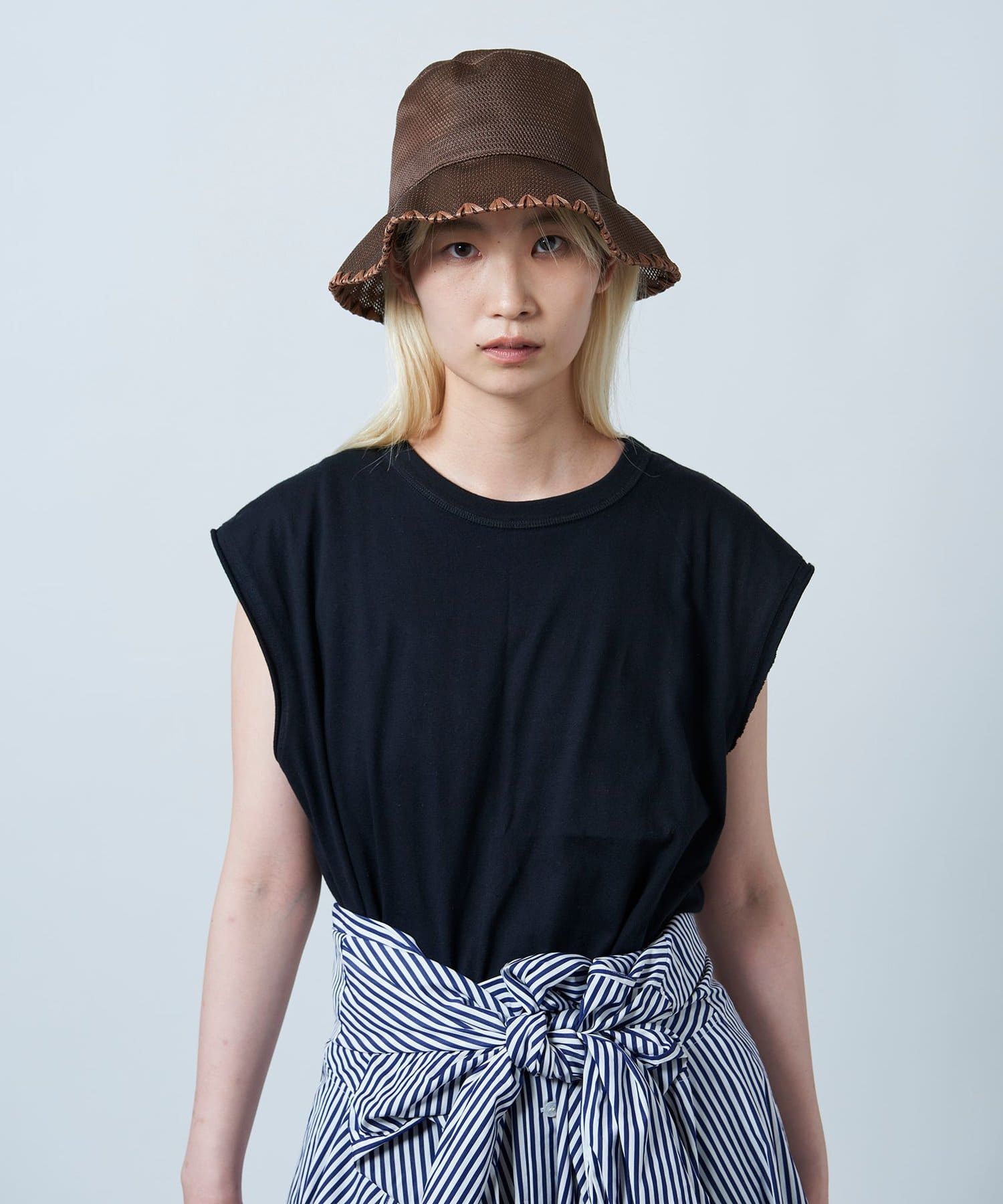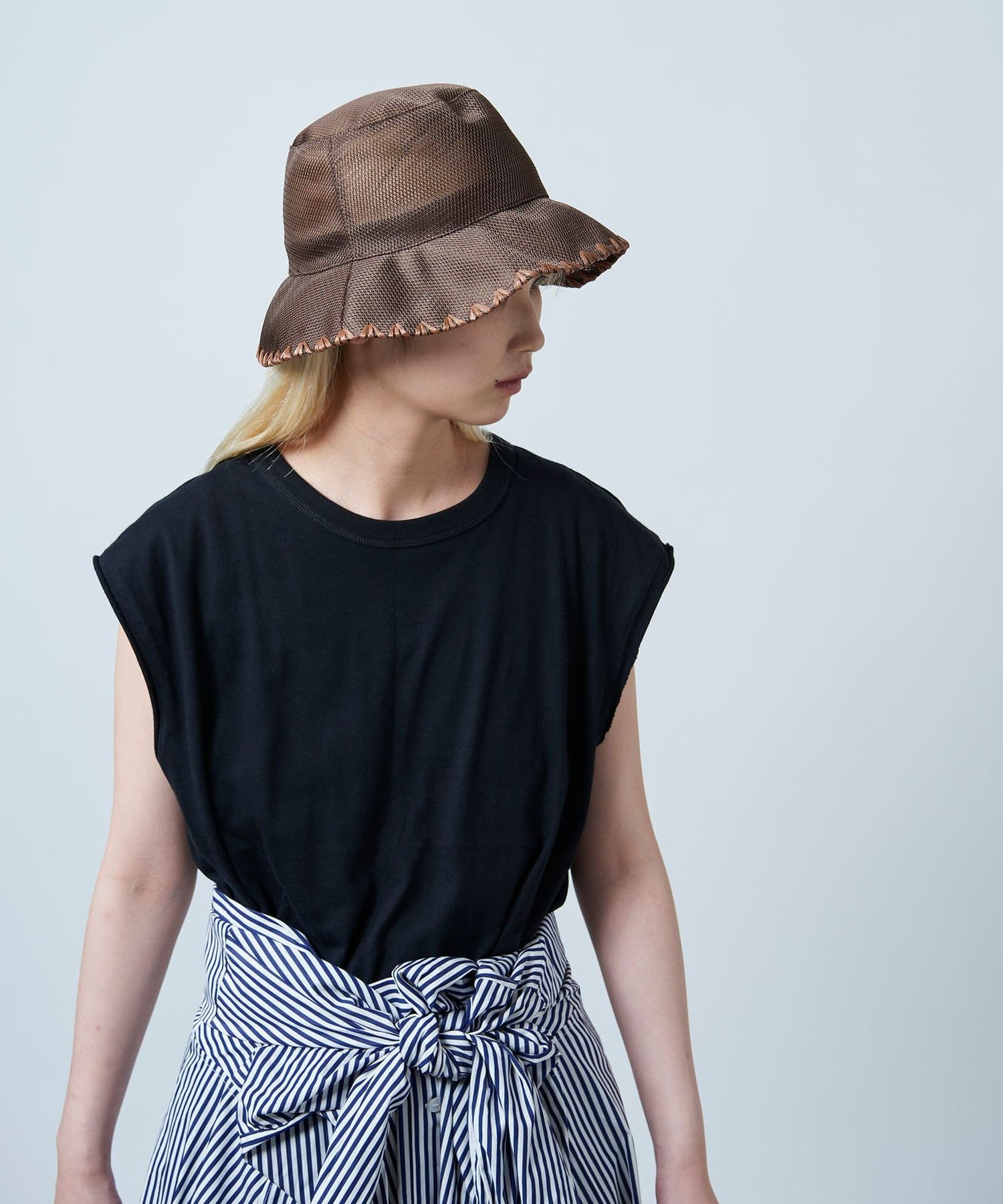 ブリム端にハンドステッチのポイントを入れることでメッシュのスポーティさを抑え、夏を楽しむサマードレスのようなリラクシーなスタイルにも取り入れられるように。
