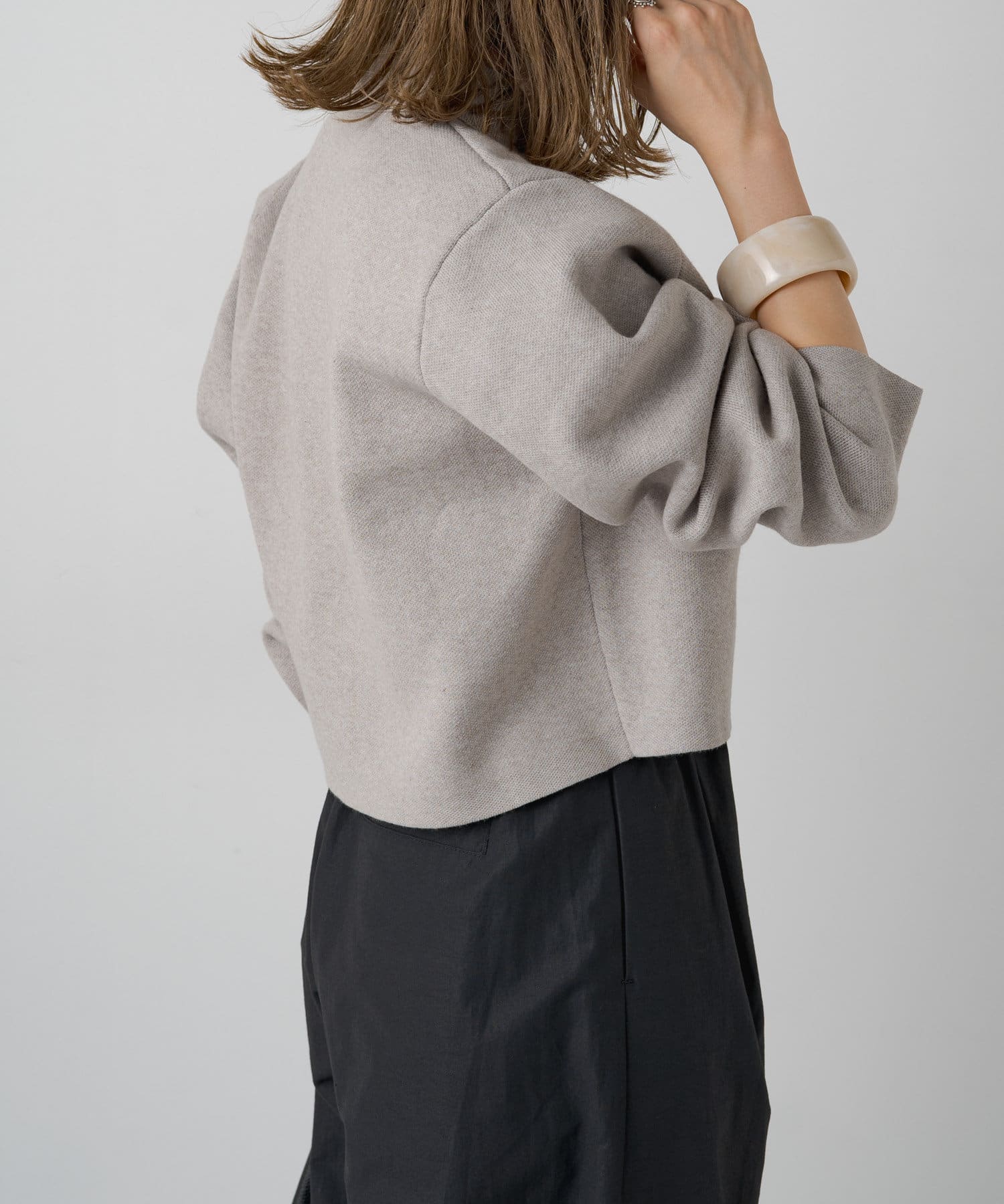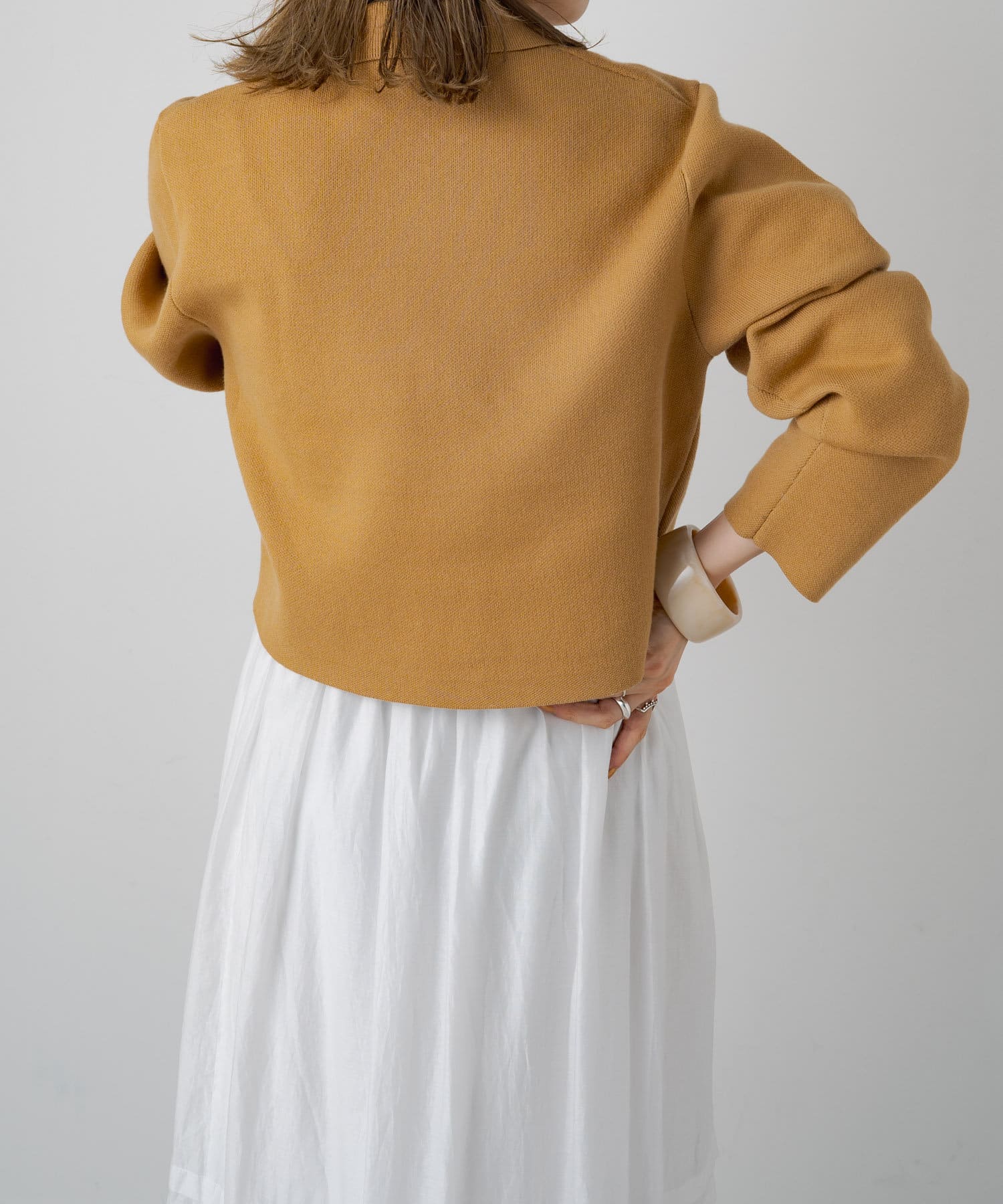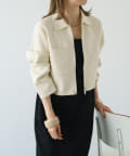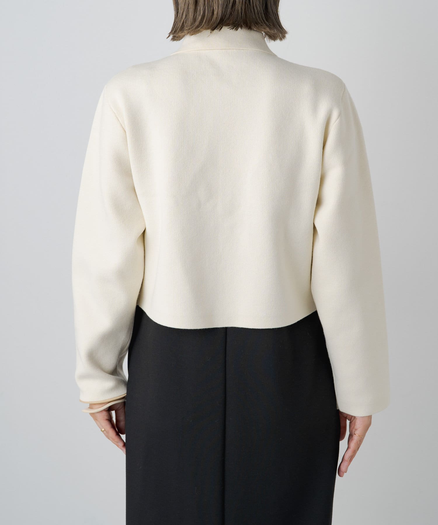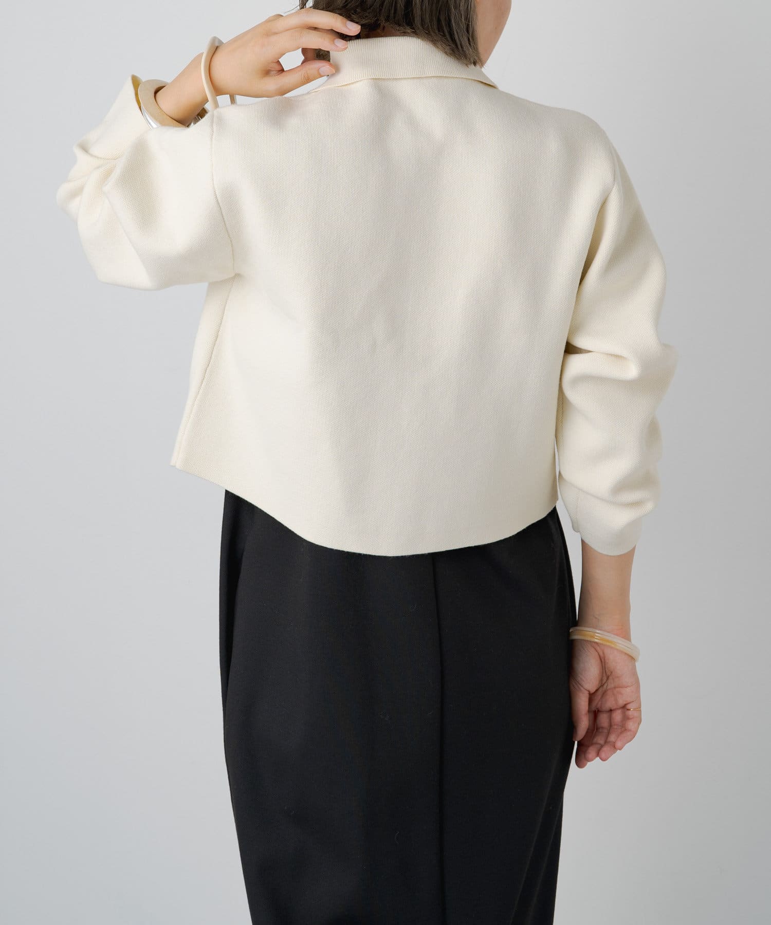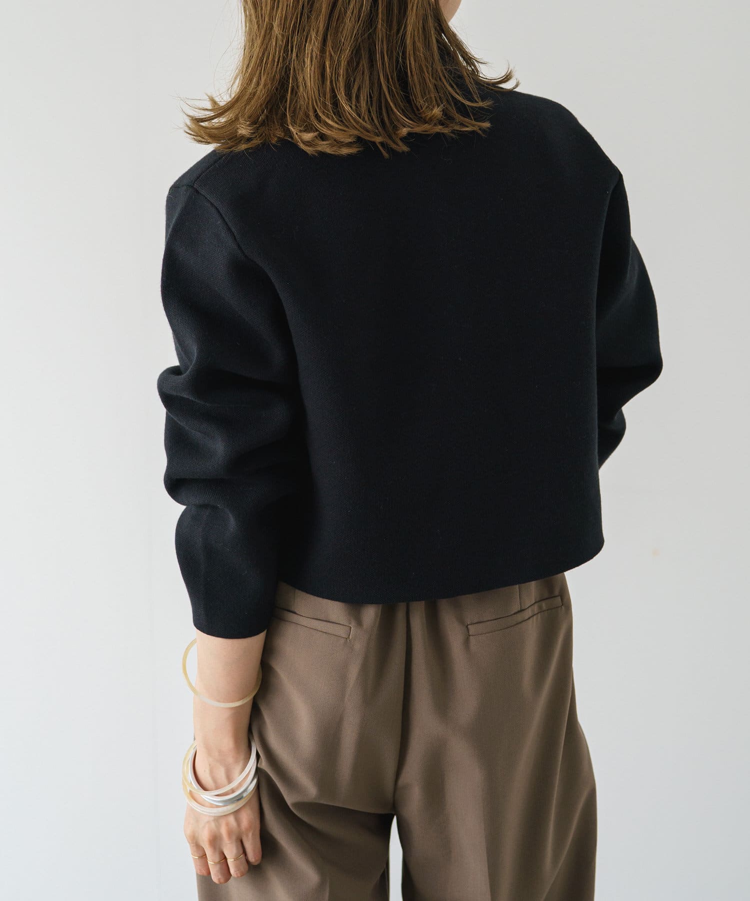 ・程よいショート丈なのでハイウエストのボトムスやボリュームのあるスカートを合わせていただくと、さらにスタイルアップ効果も叶えてくれる一枚です。