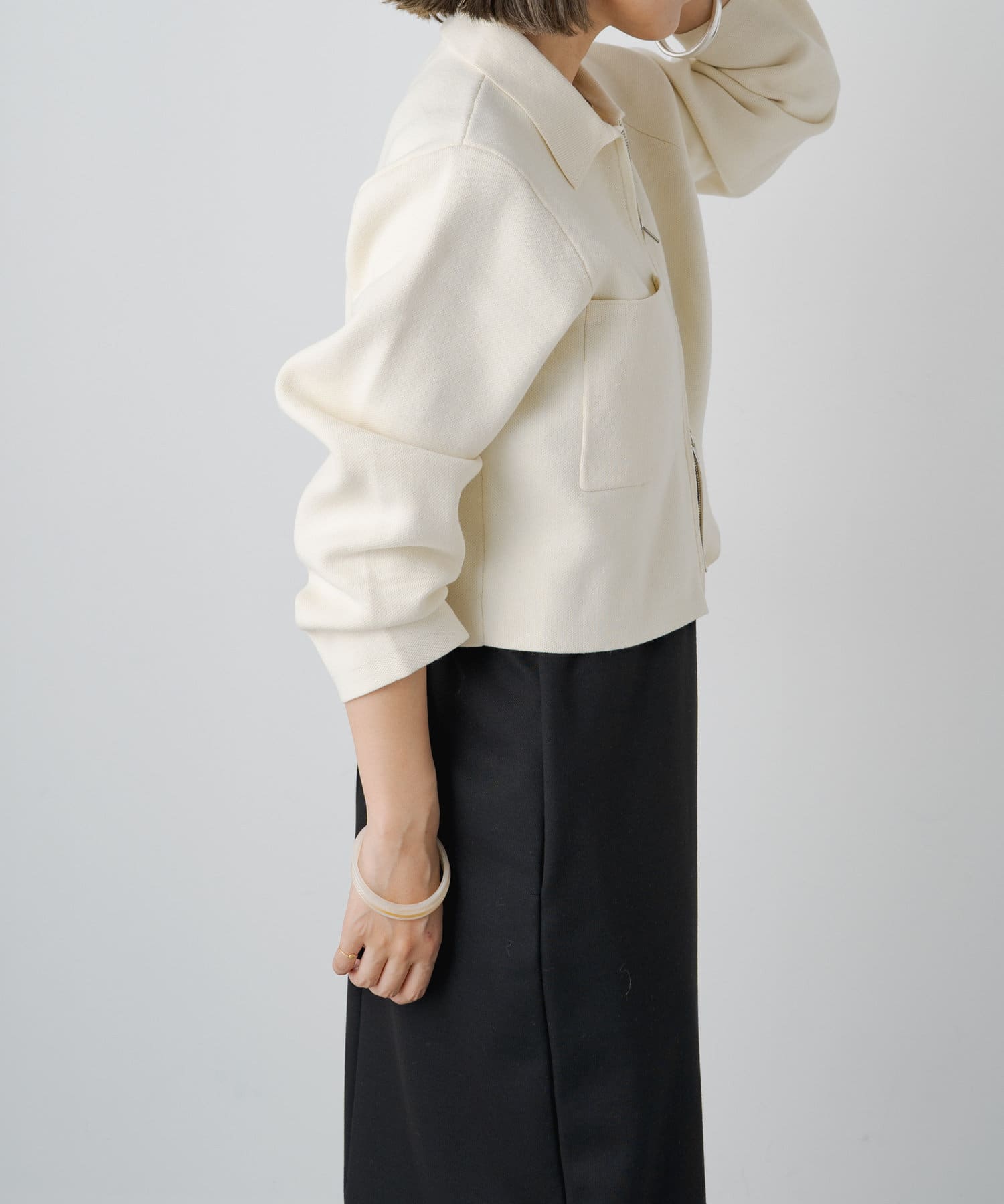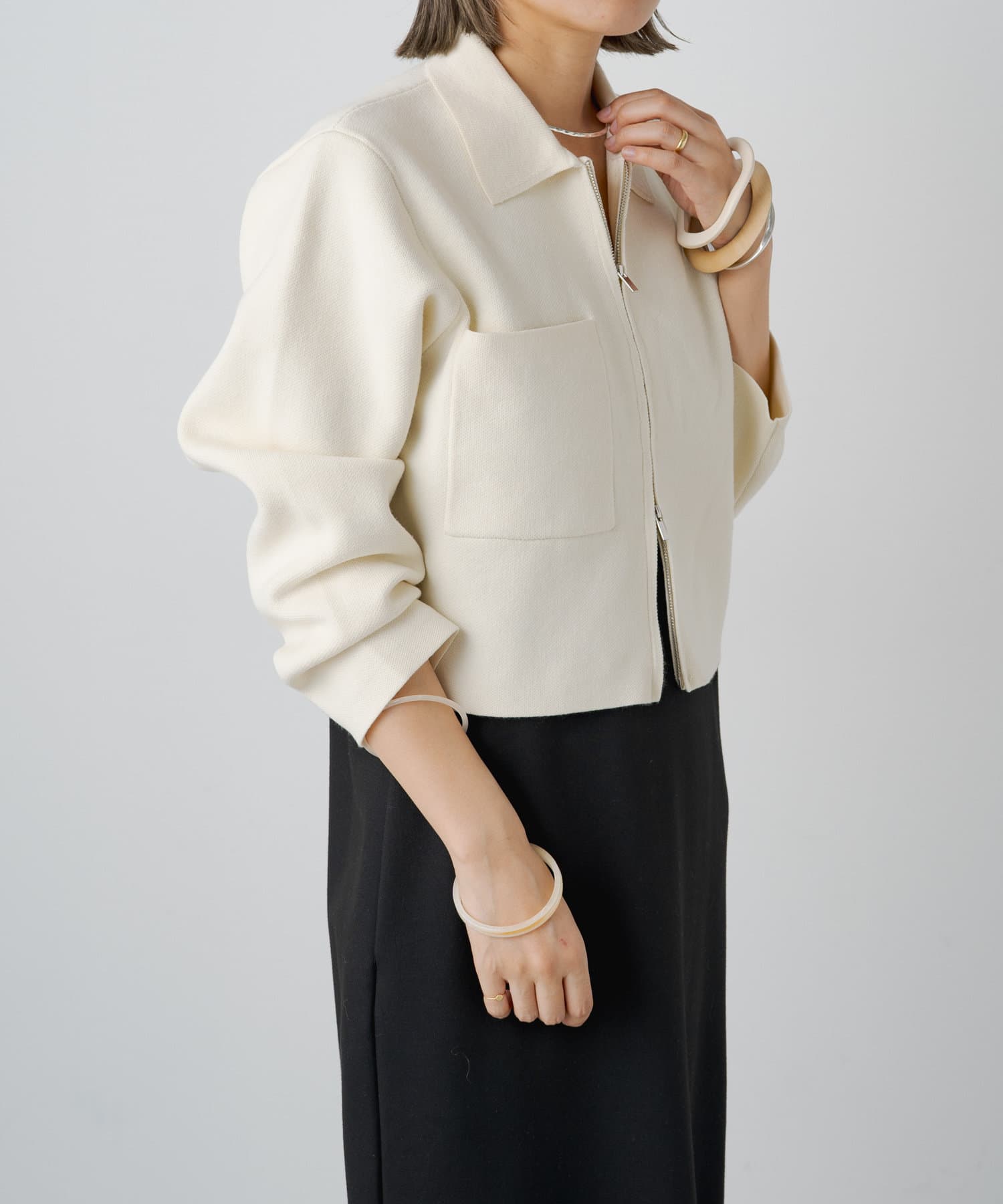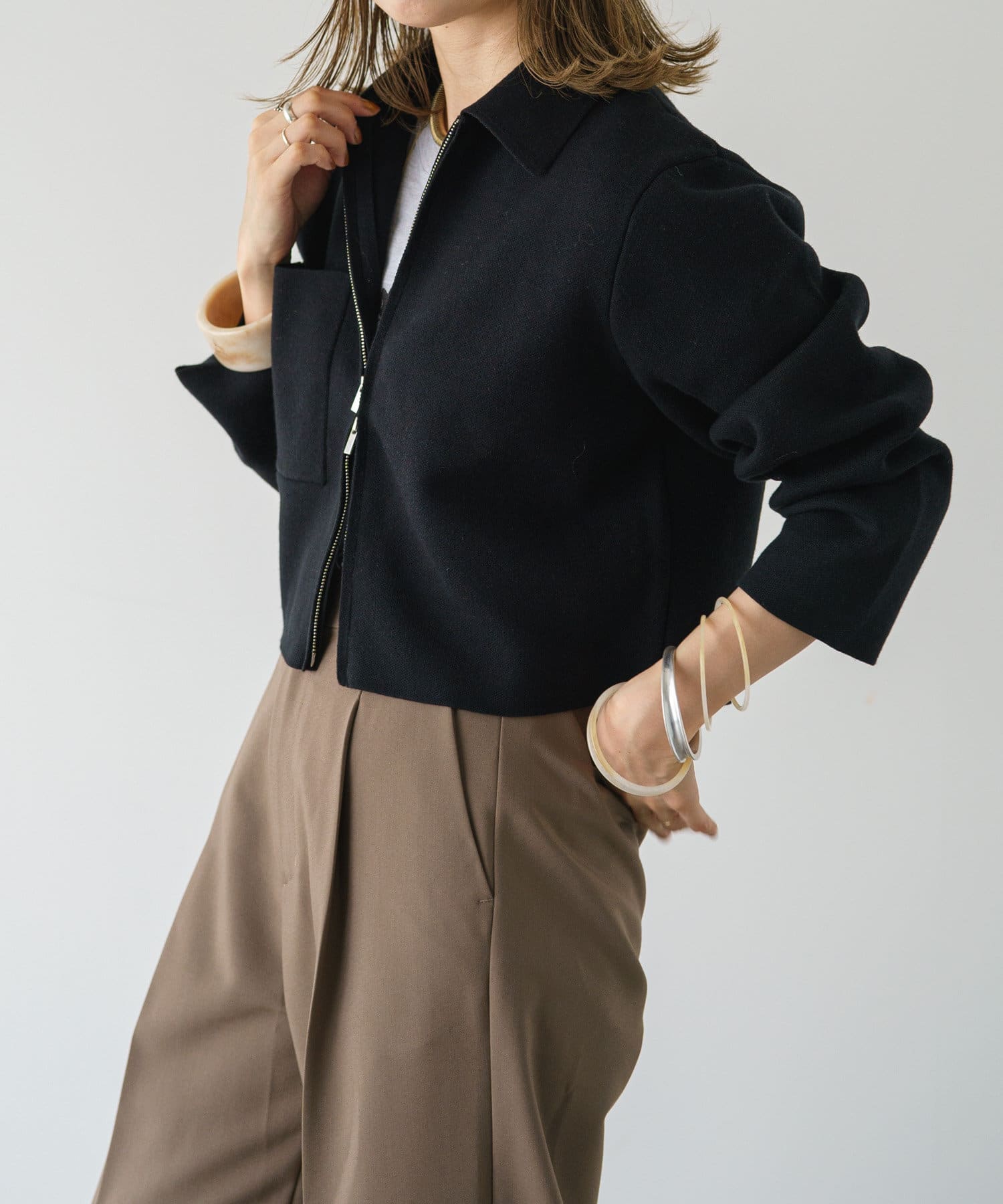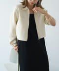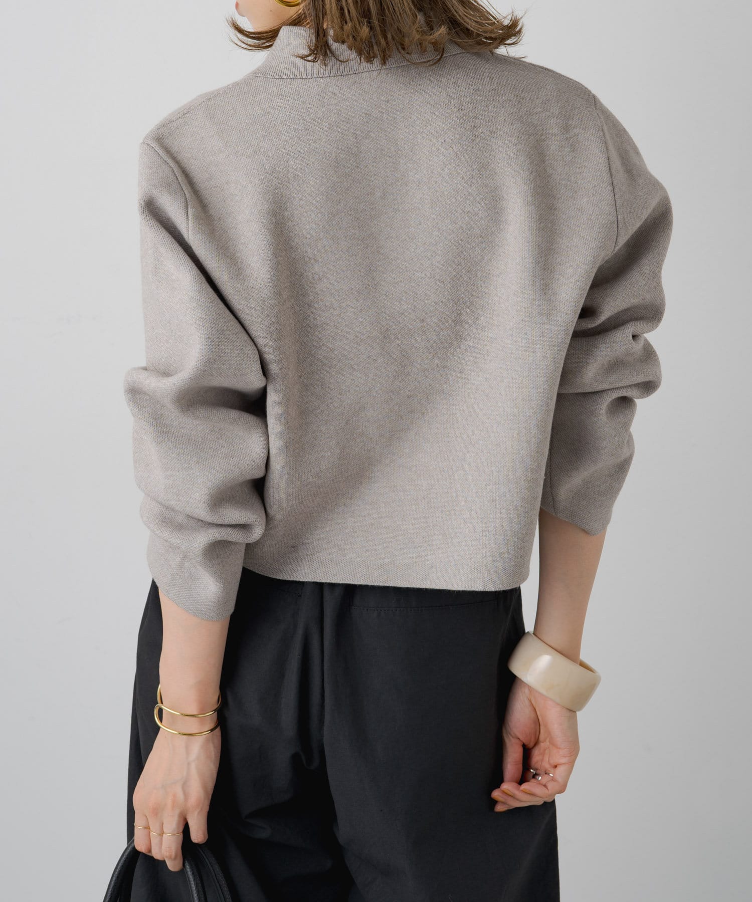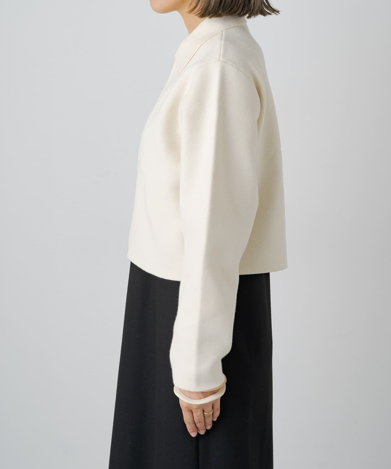 ・程よいショート丈なのでハイウエストのボトムスやボリュームのあるスカートを合わせていただくと、さらにスタイルアップ効果も叶えてくれる一枚です。