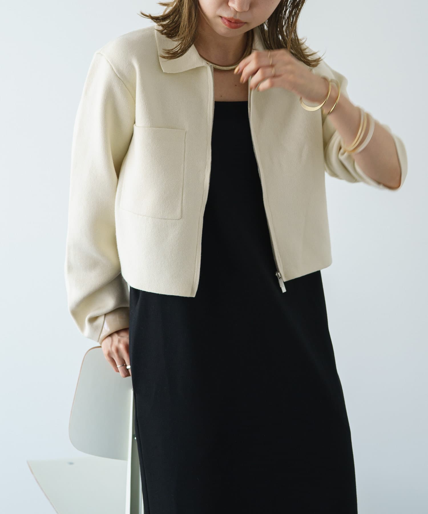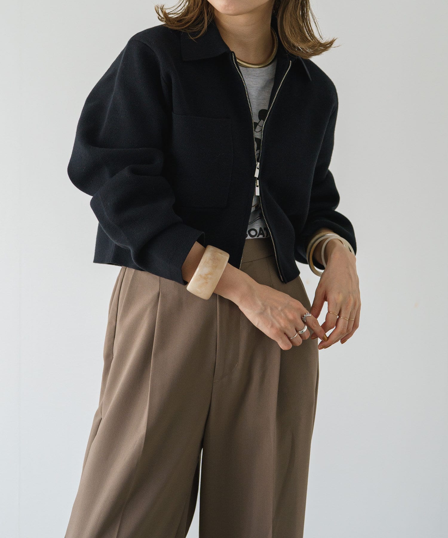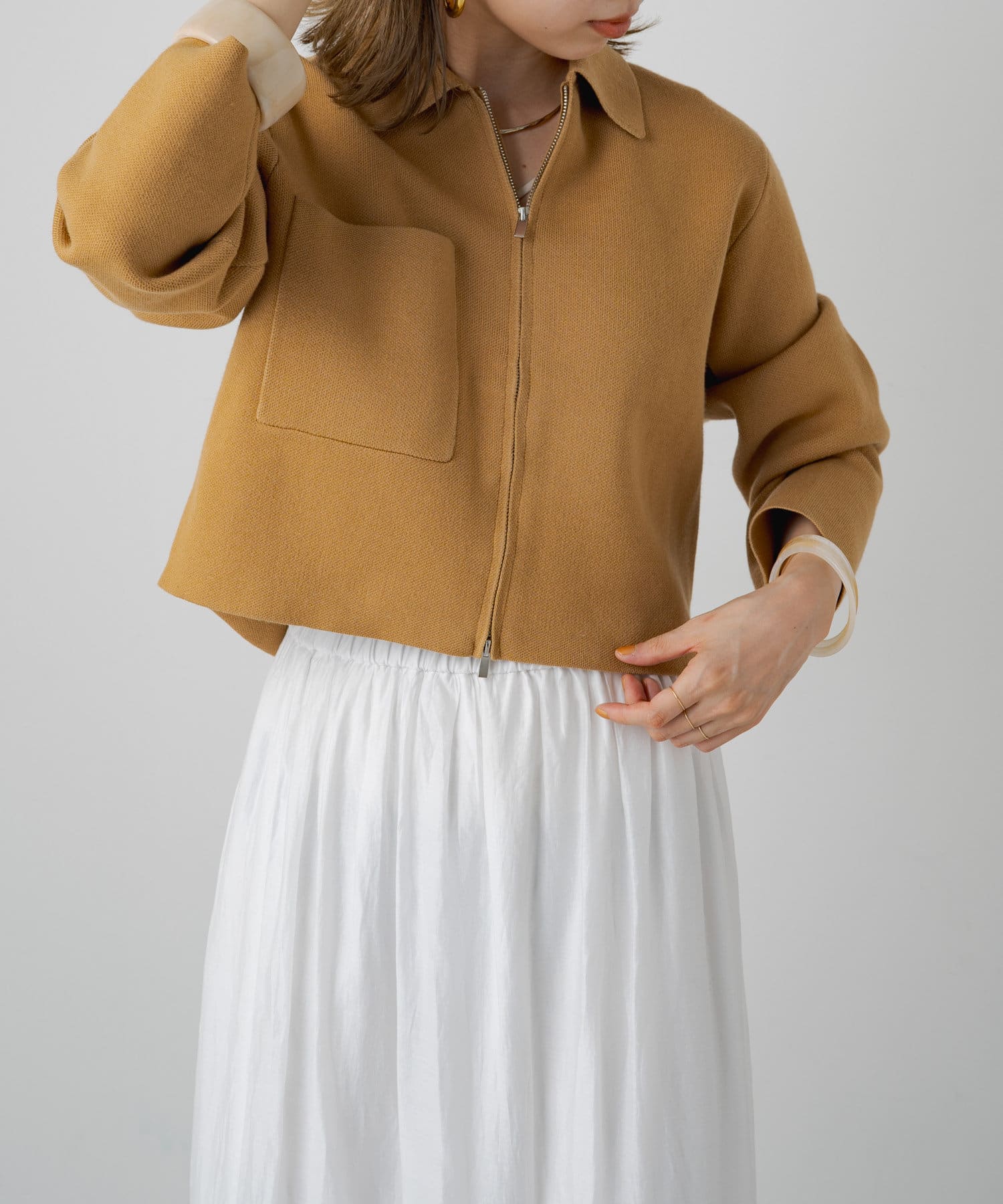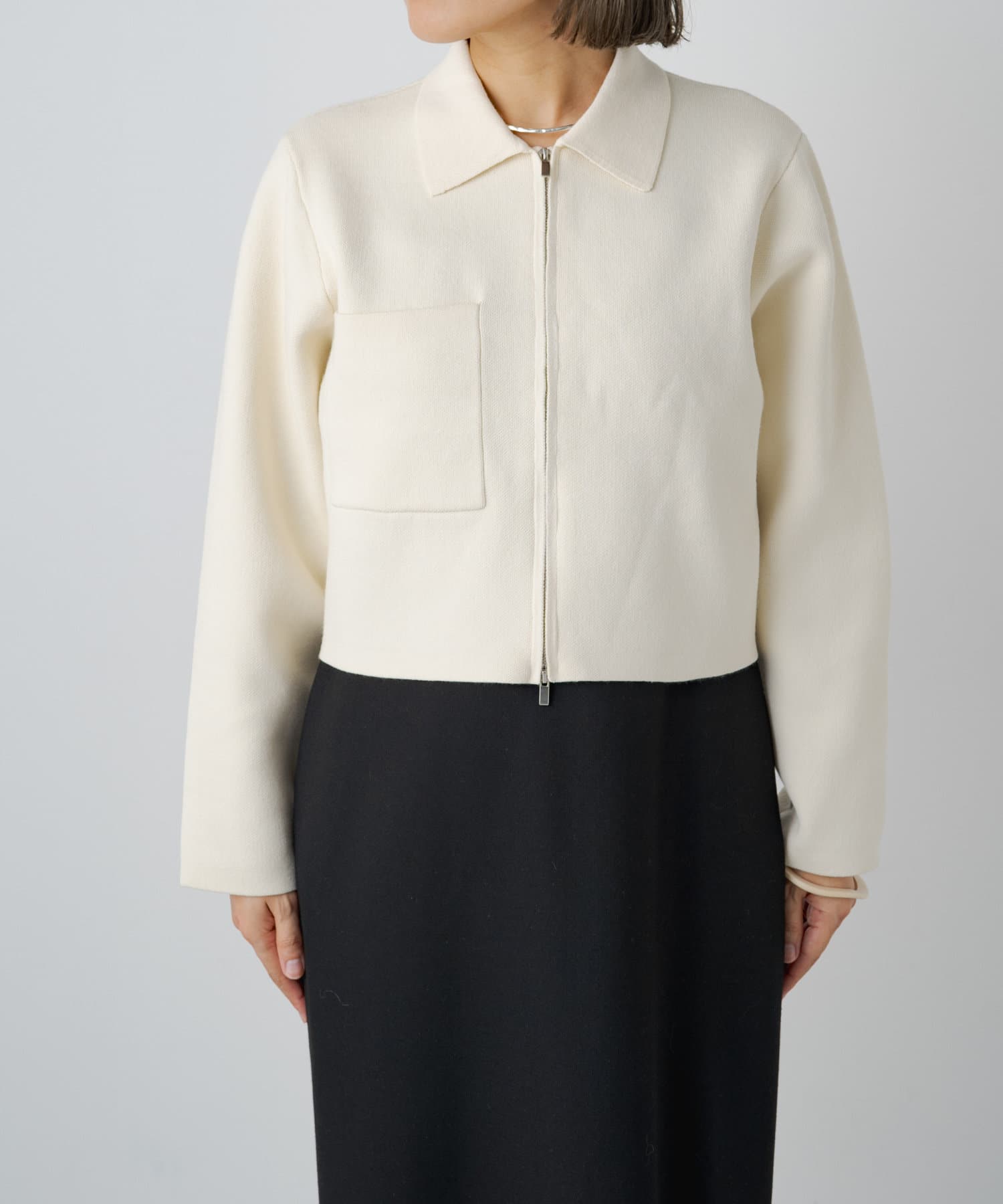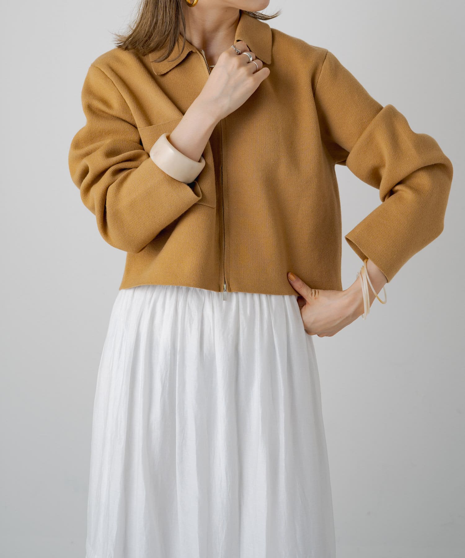 ・程よいショート丈なのでハイウエストのボトムスやボリュームのあるスカートを合わせていただくと、さらにスタイルアップ効果も叶えてくれる一枚です。