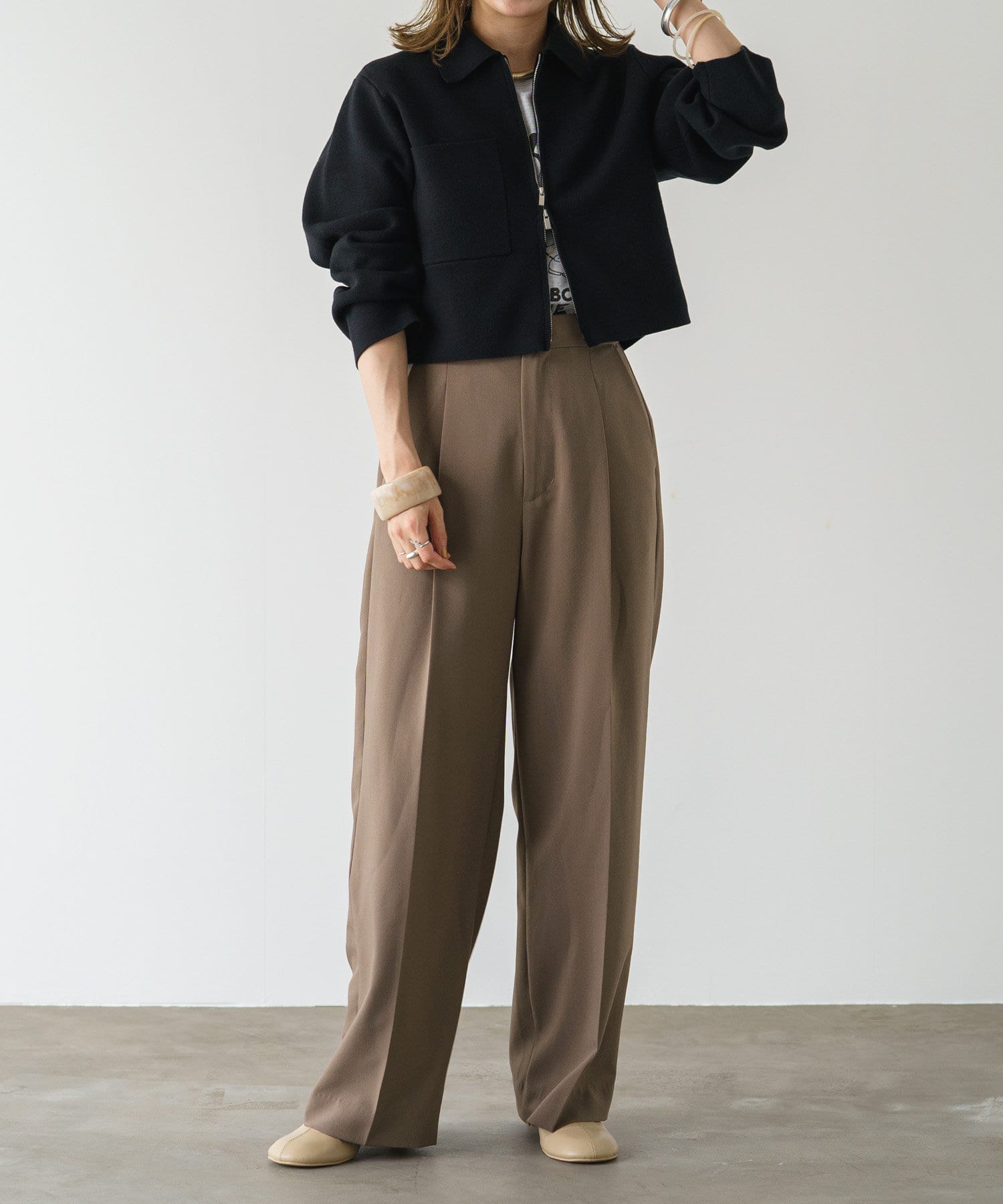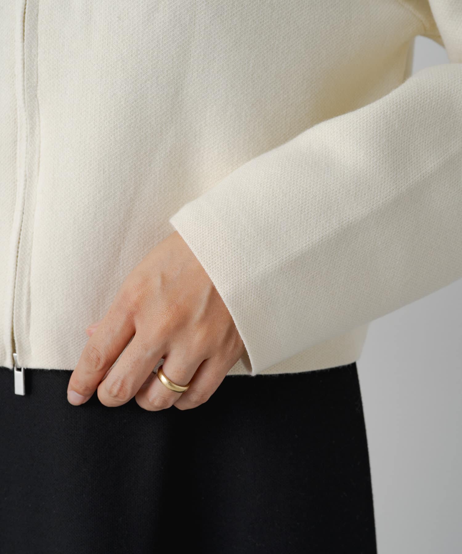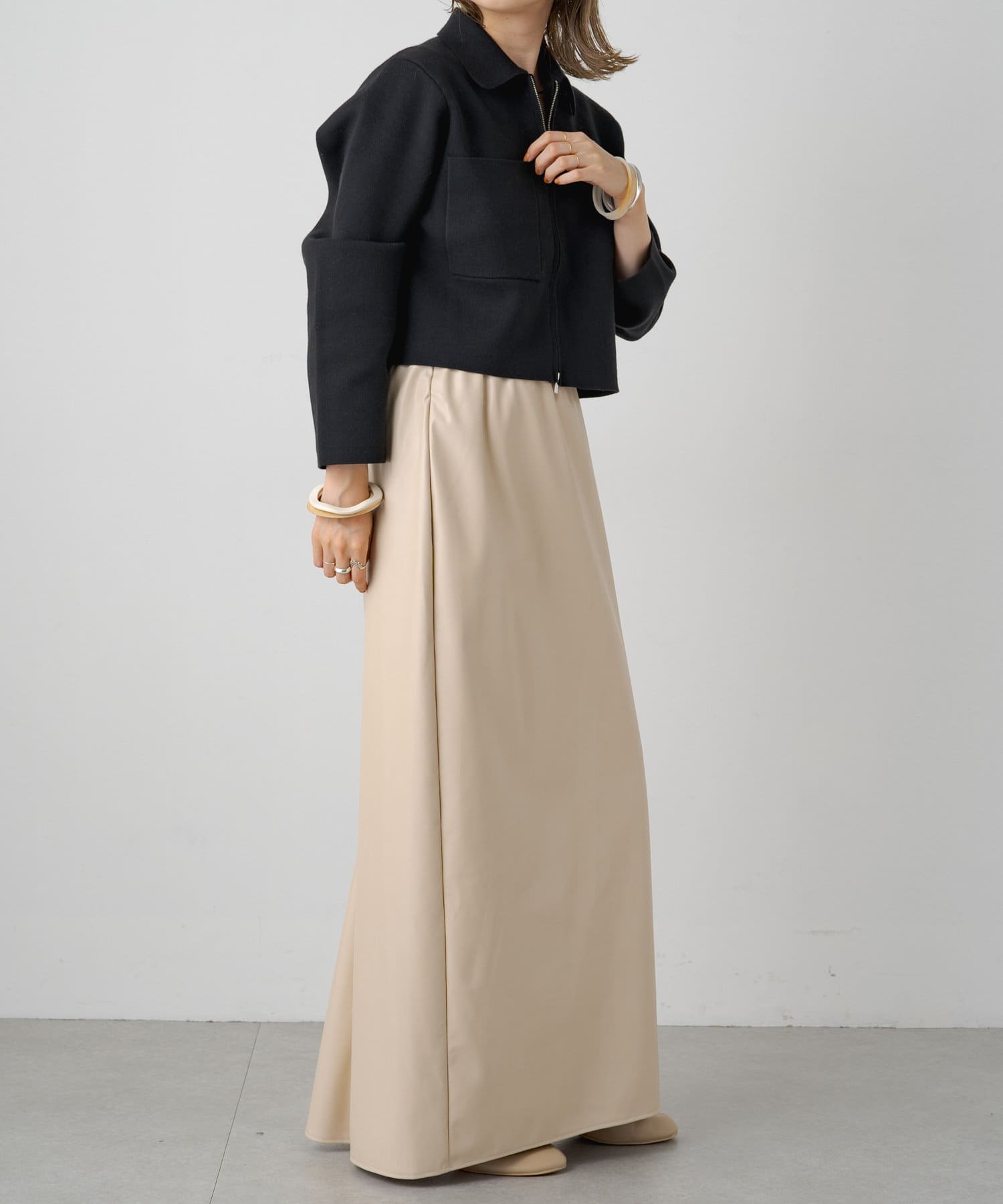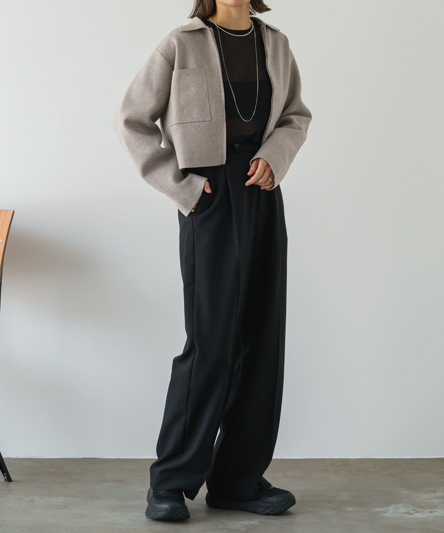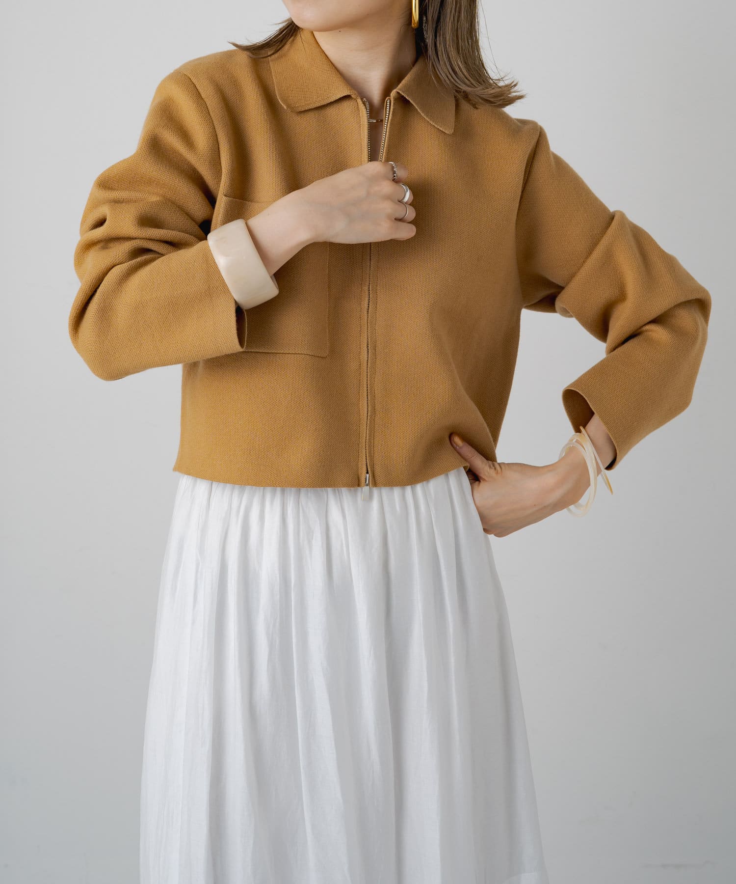 ・程よいショート丈なのでハイウエストのボトムスやボリュームのあるスカートを合わせていただくと、さらにスタイルアップ効果も叶えてくれる一枚です。