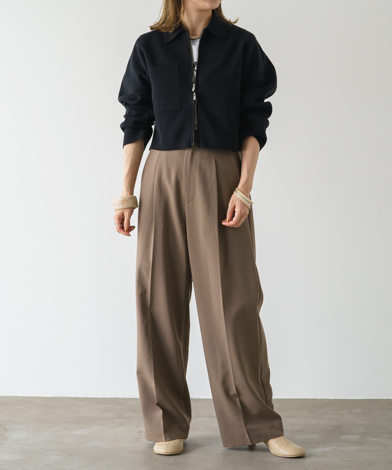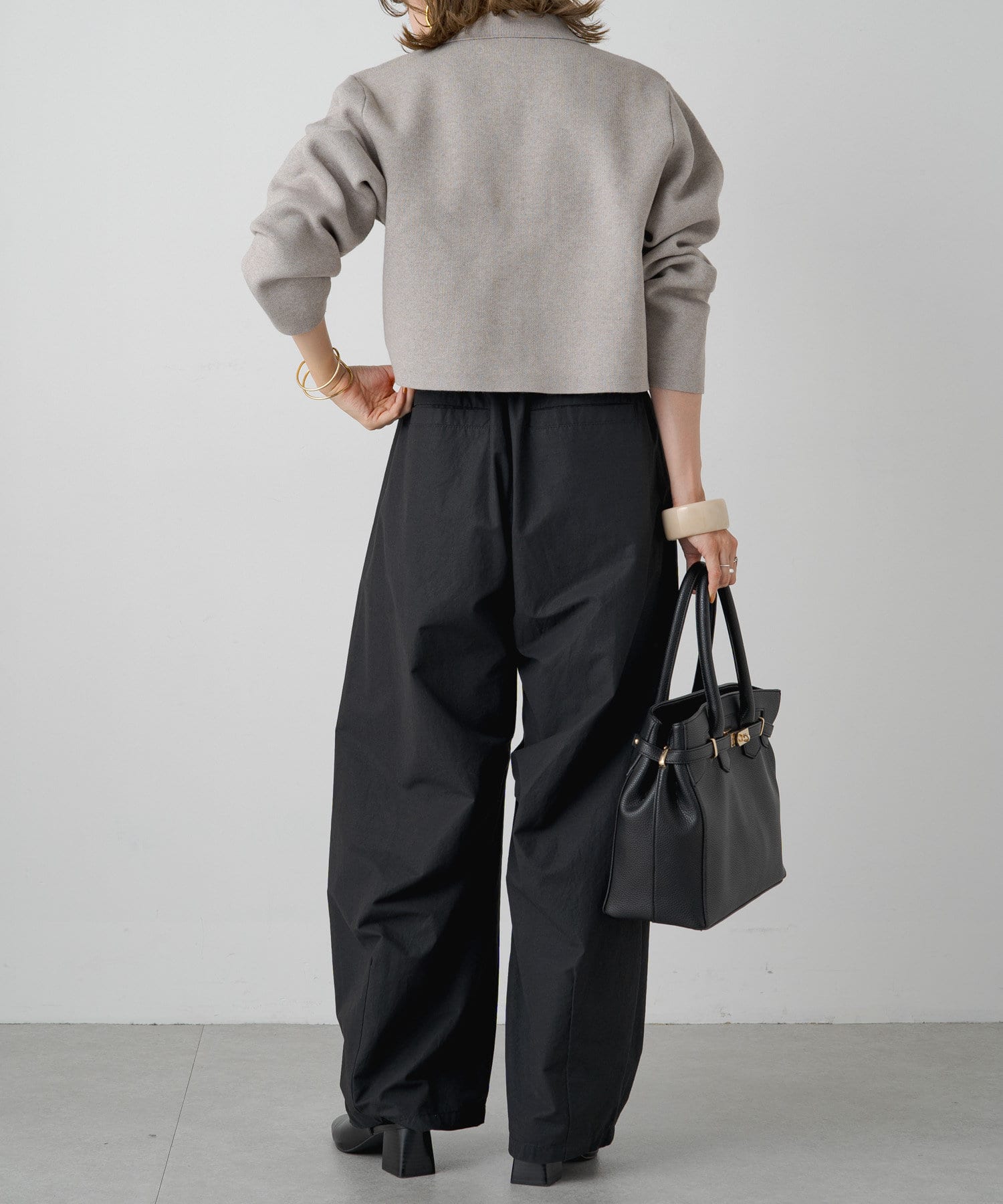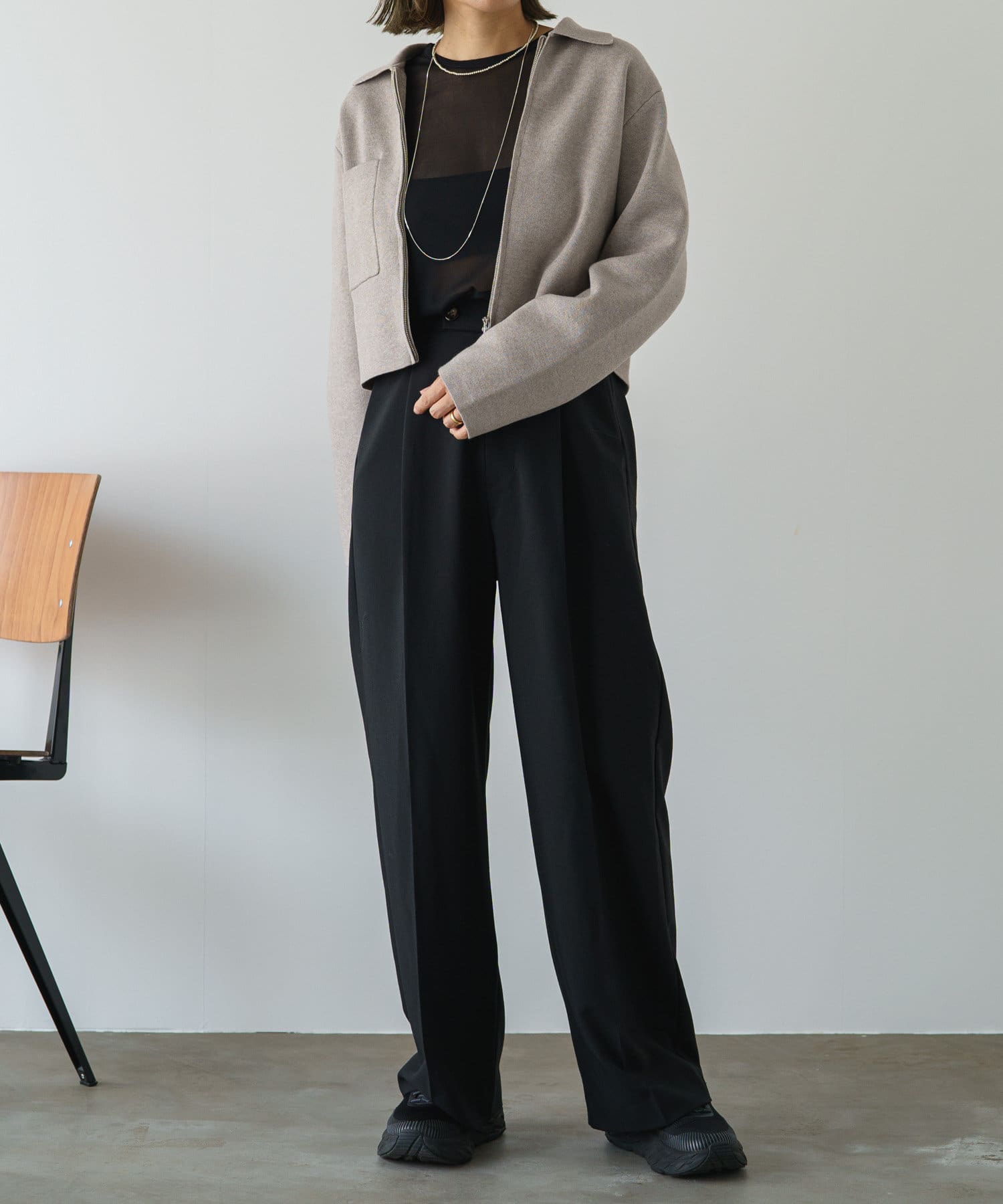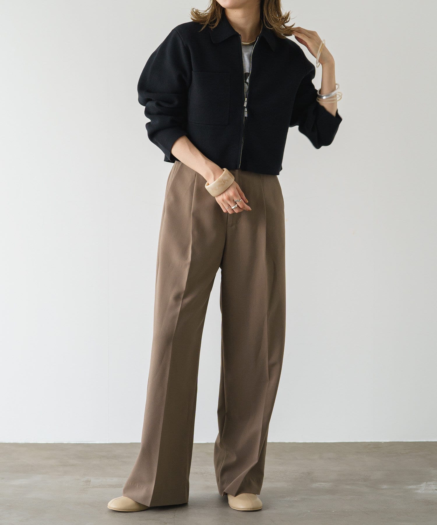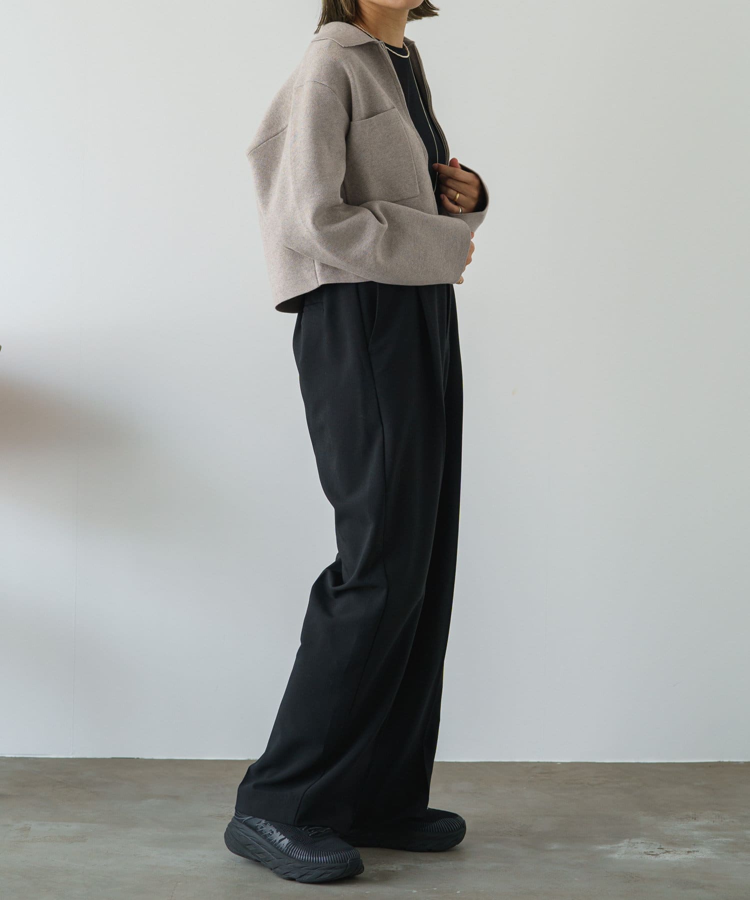 ・程よいショート丈なのでハイウエストのボトムスやボリュームのあるスカートを合わせていただくと、さらにスタイルアップ効果も叶えてくれる一枚です。
