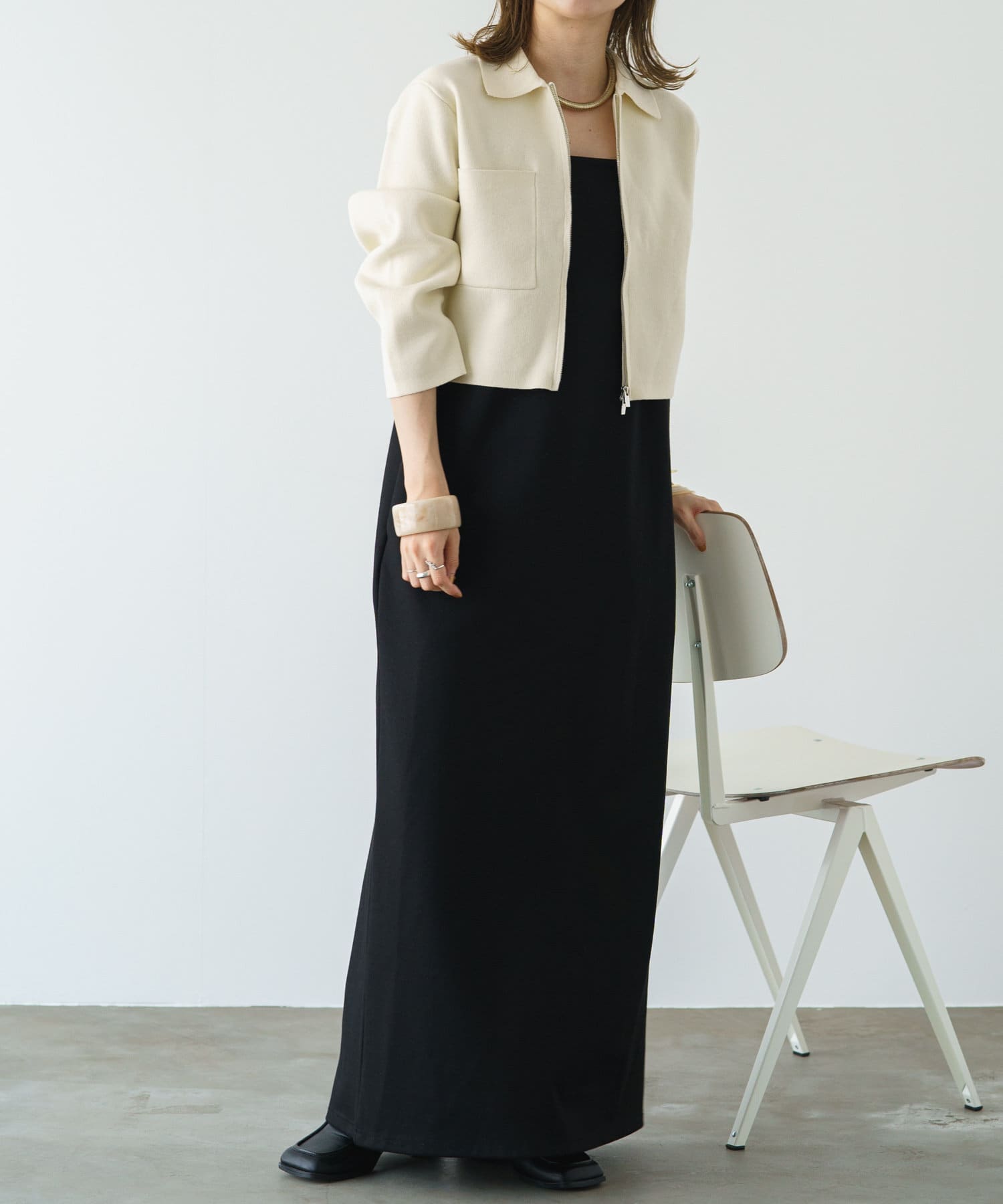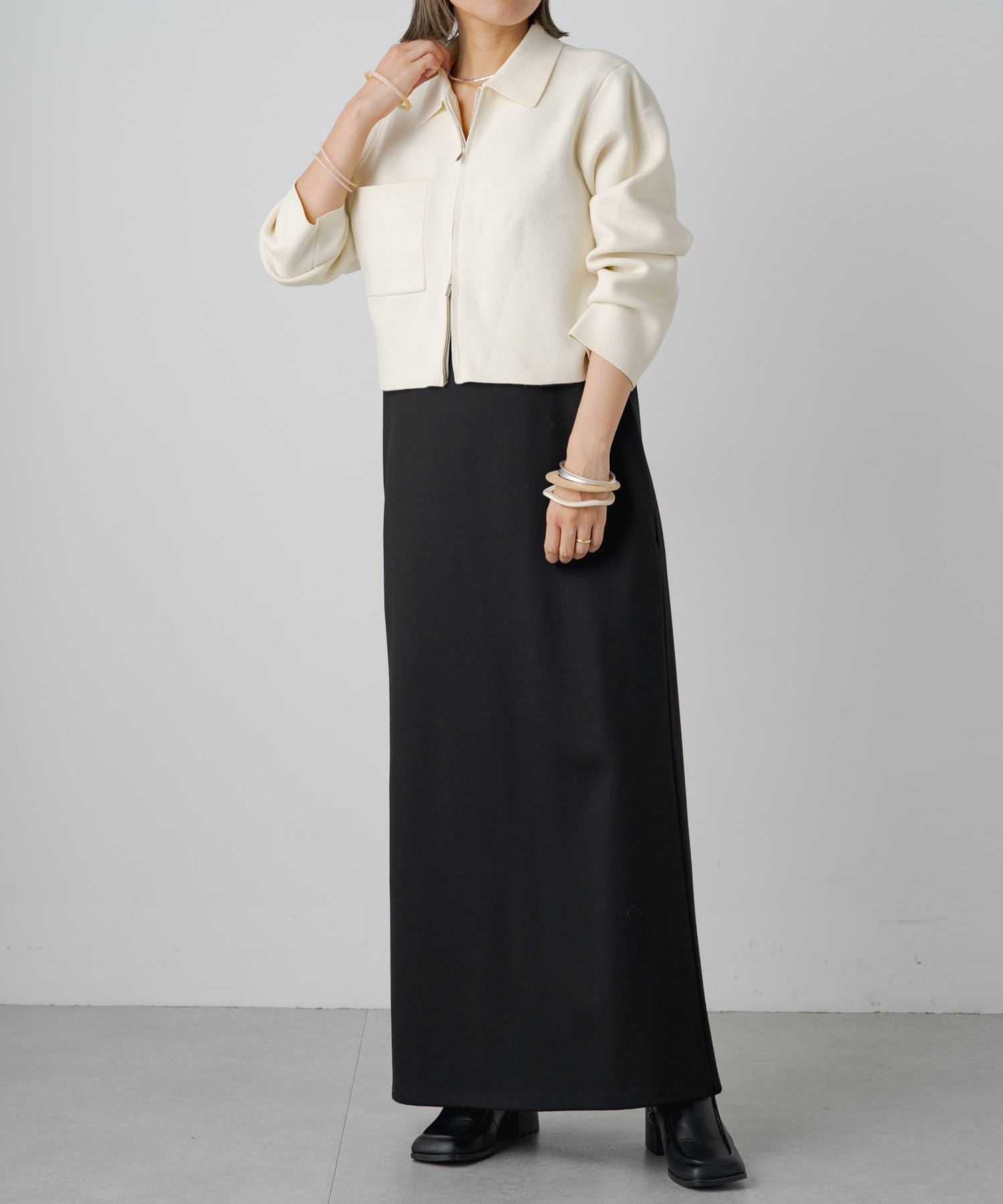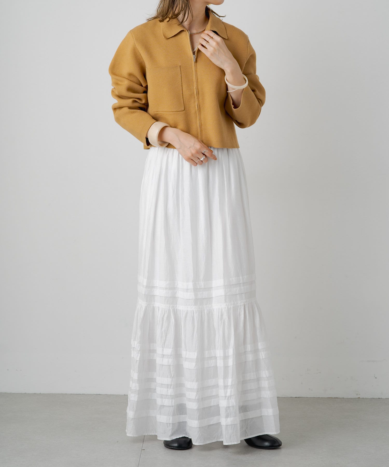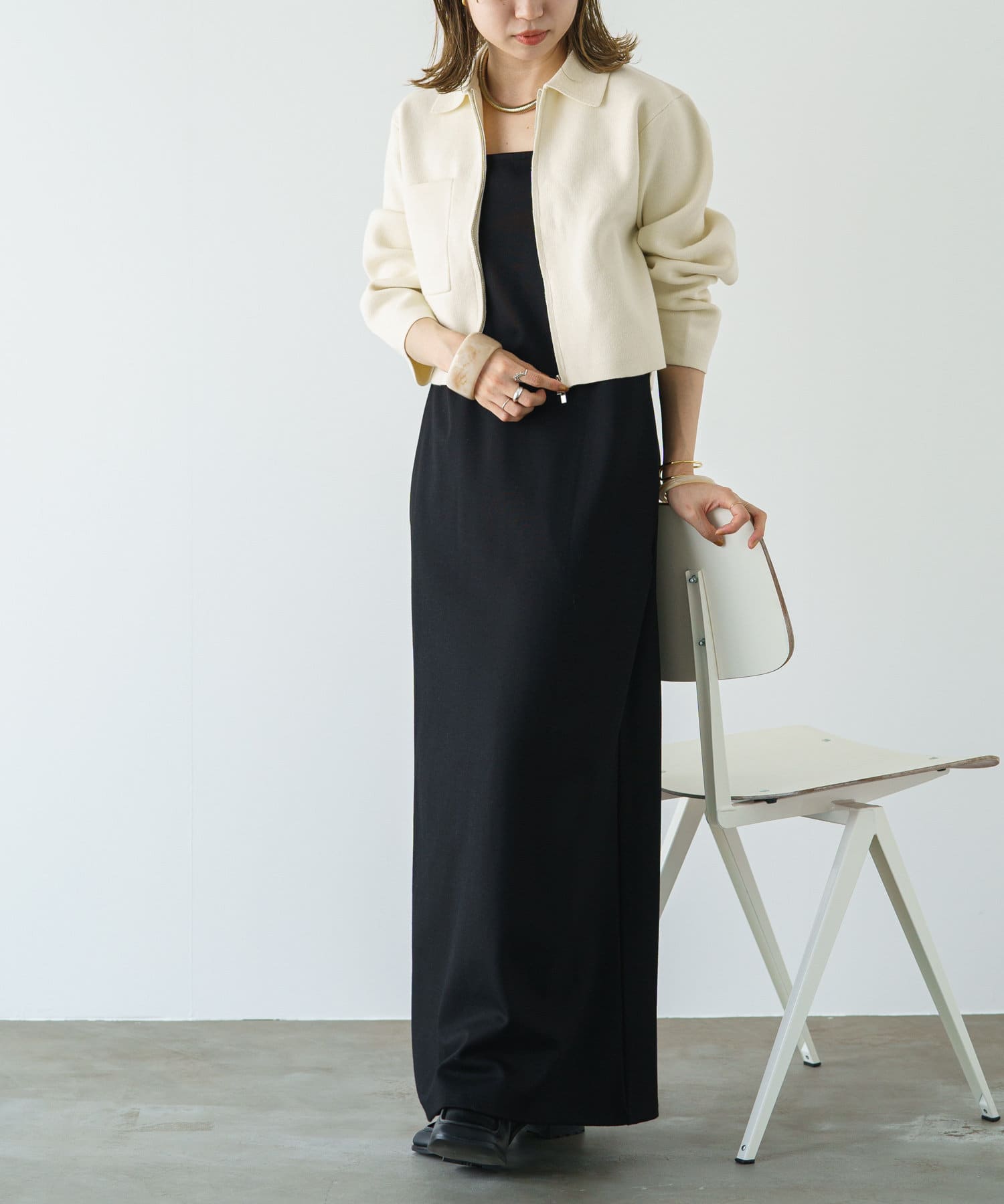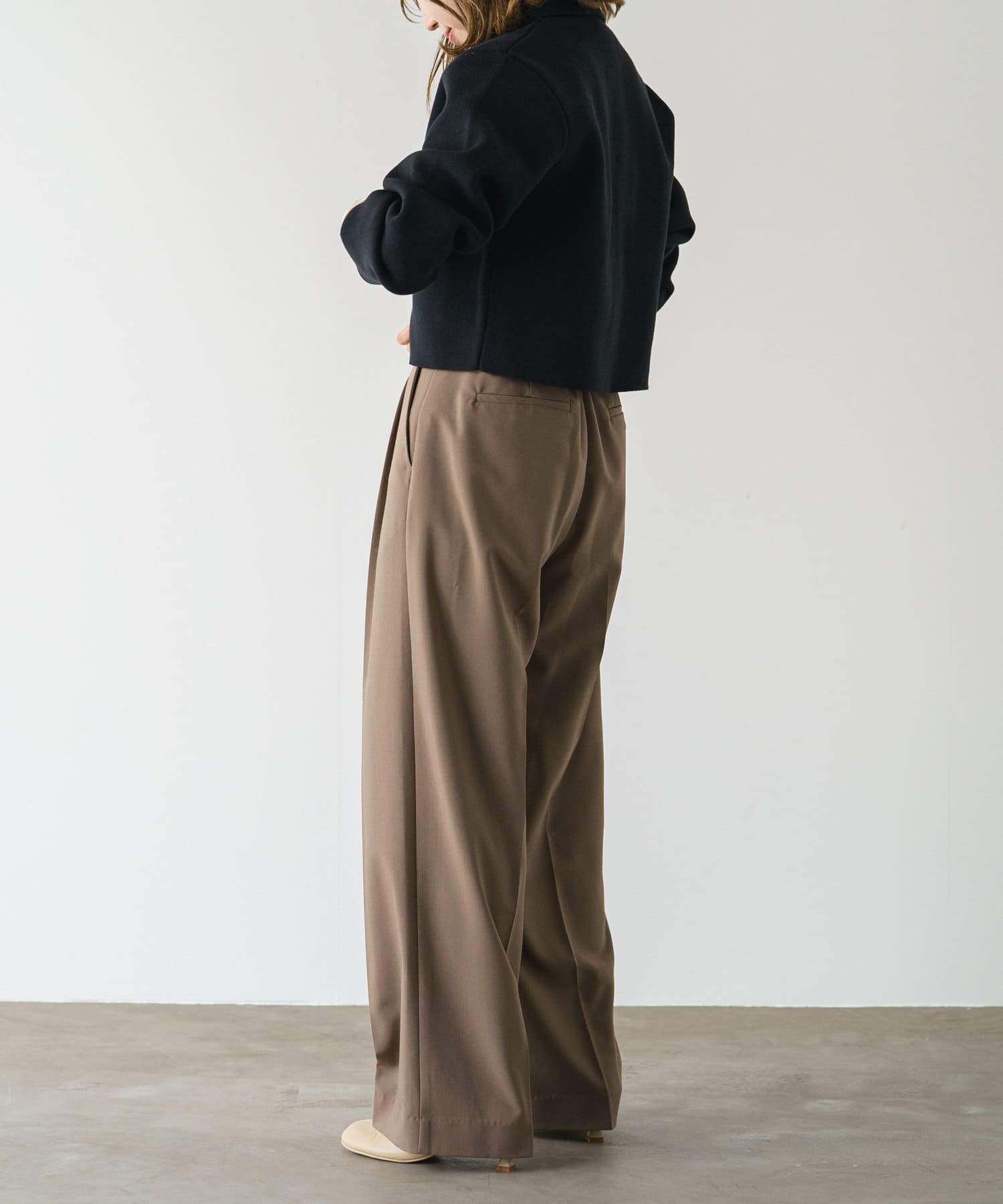 ・程よいショート丈なのでハイウエストのボトムスやボリュームのあるスカートを合わせていただくと、さらにスタイルアップ効果も叶えてくれる一枚です。