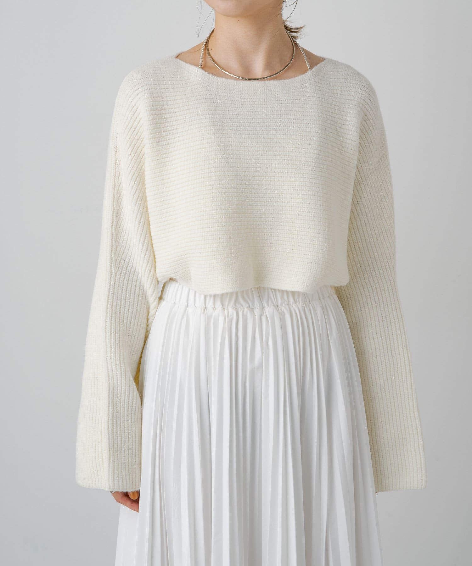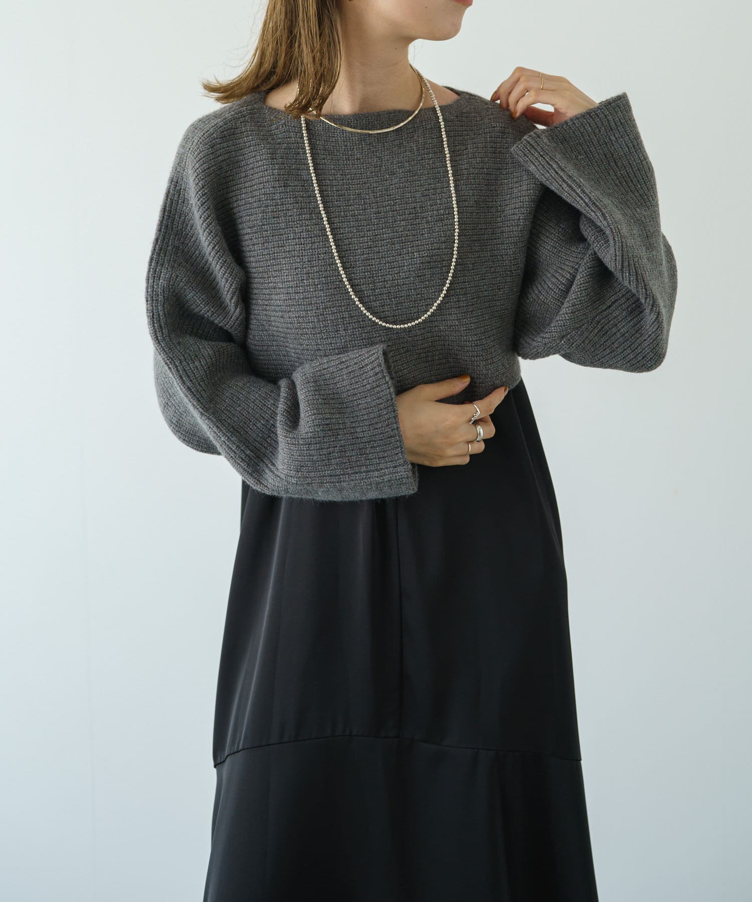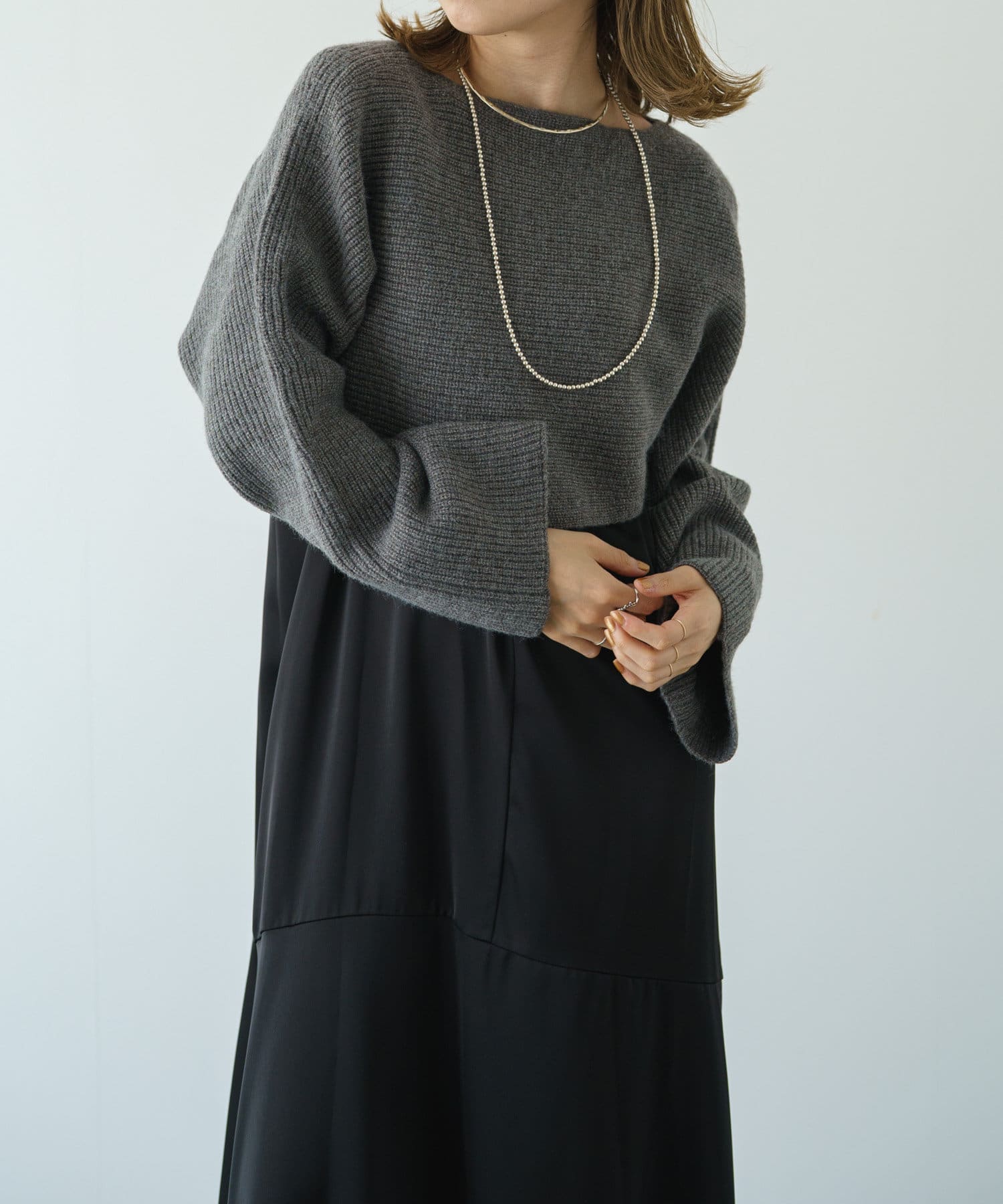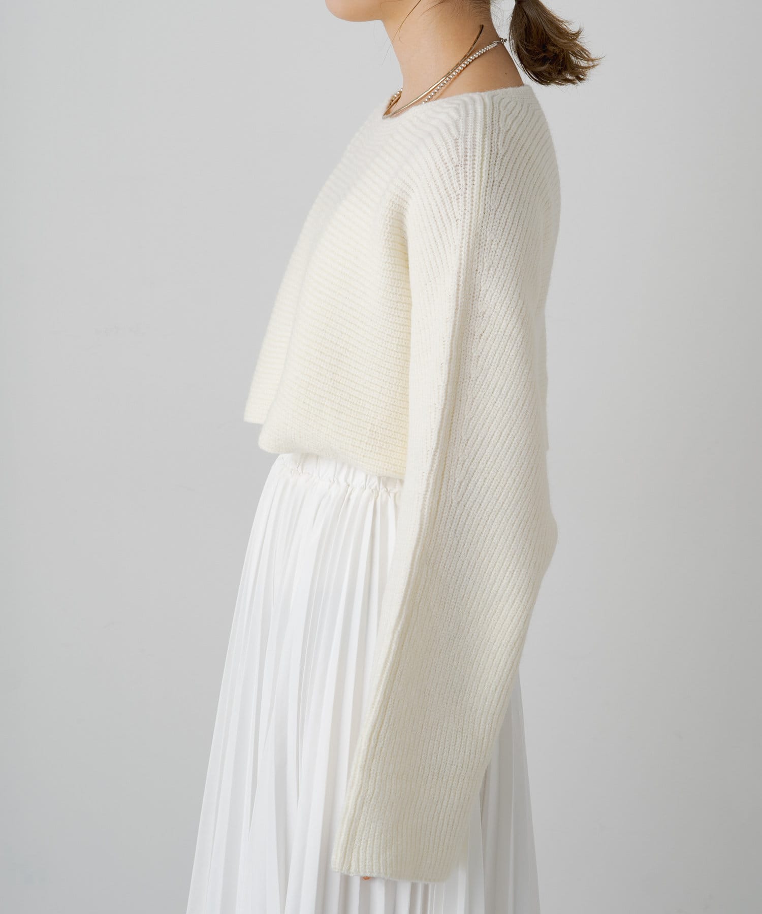 ・シンプルながらショート丈が今年らしい、旬のレイヤードスタイルが楽しめるショートニット。