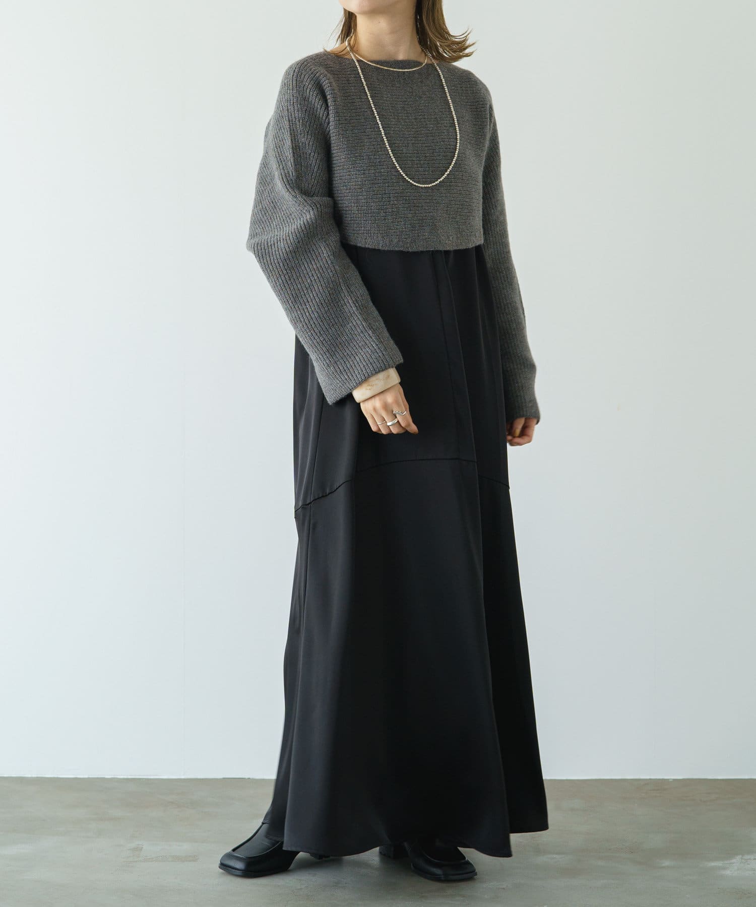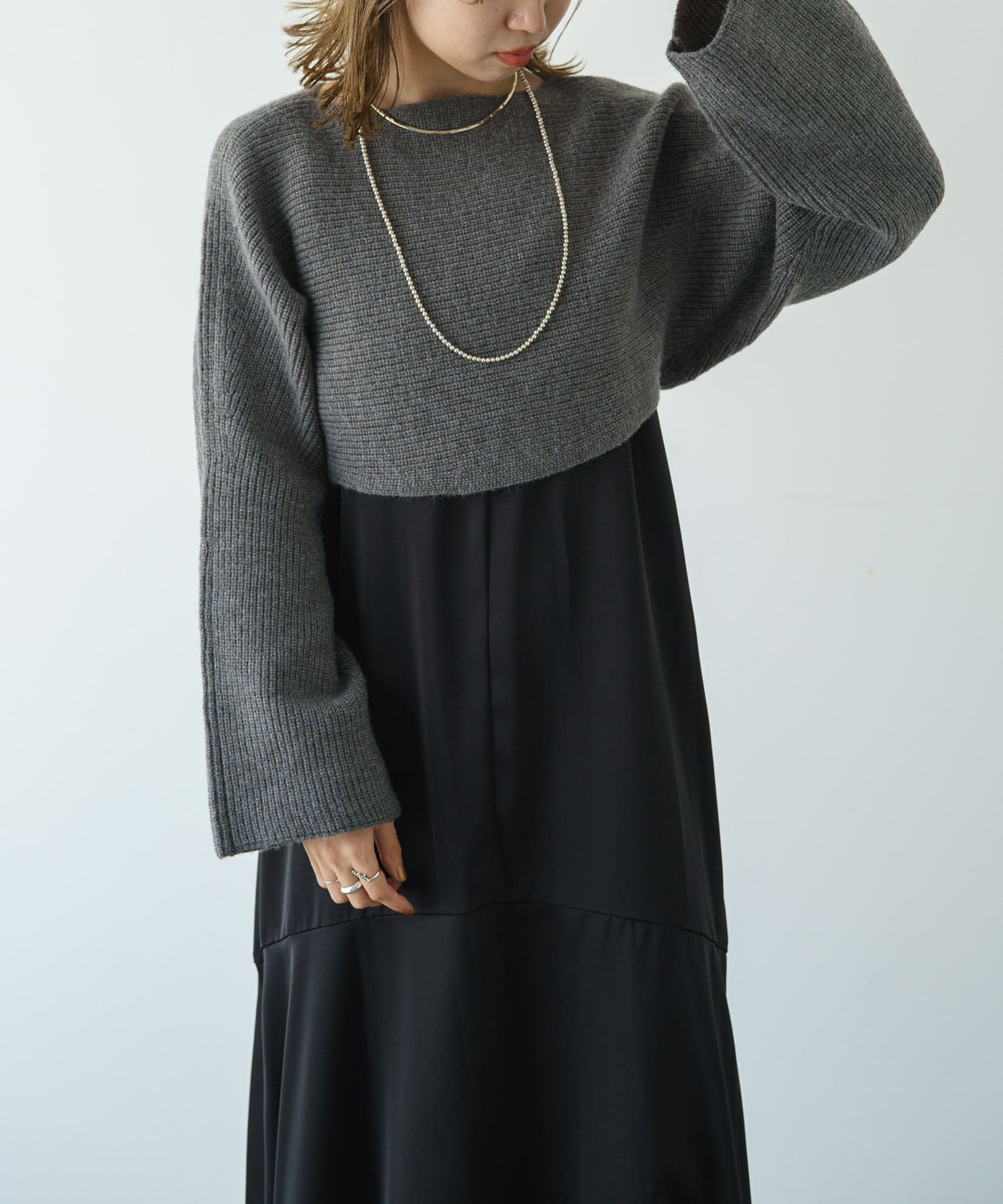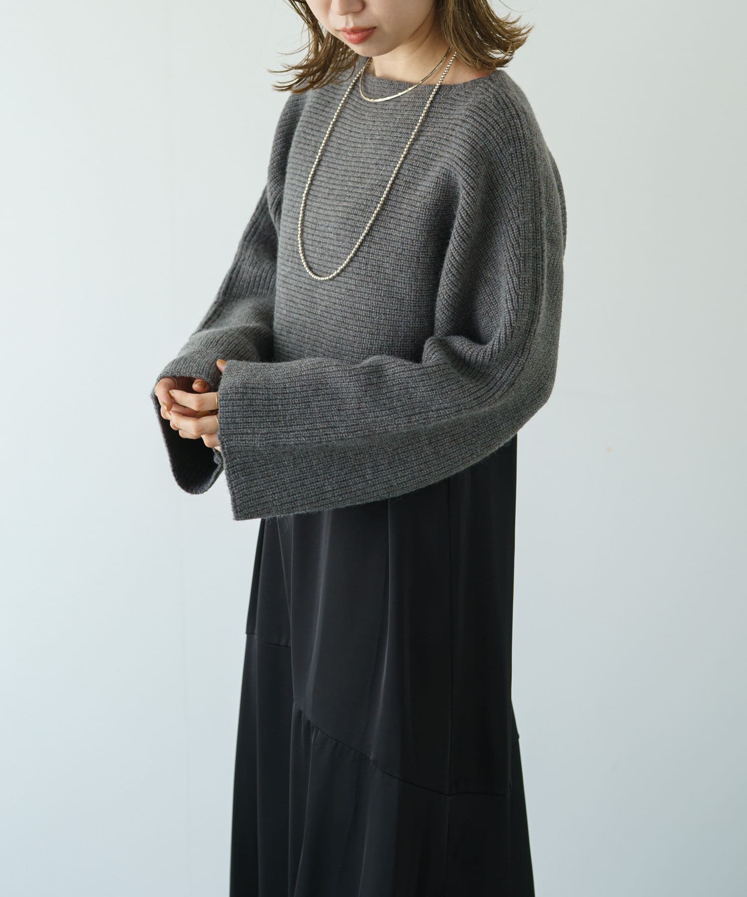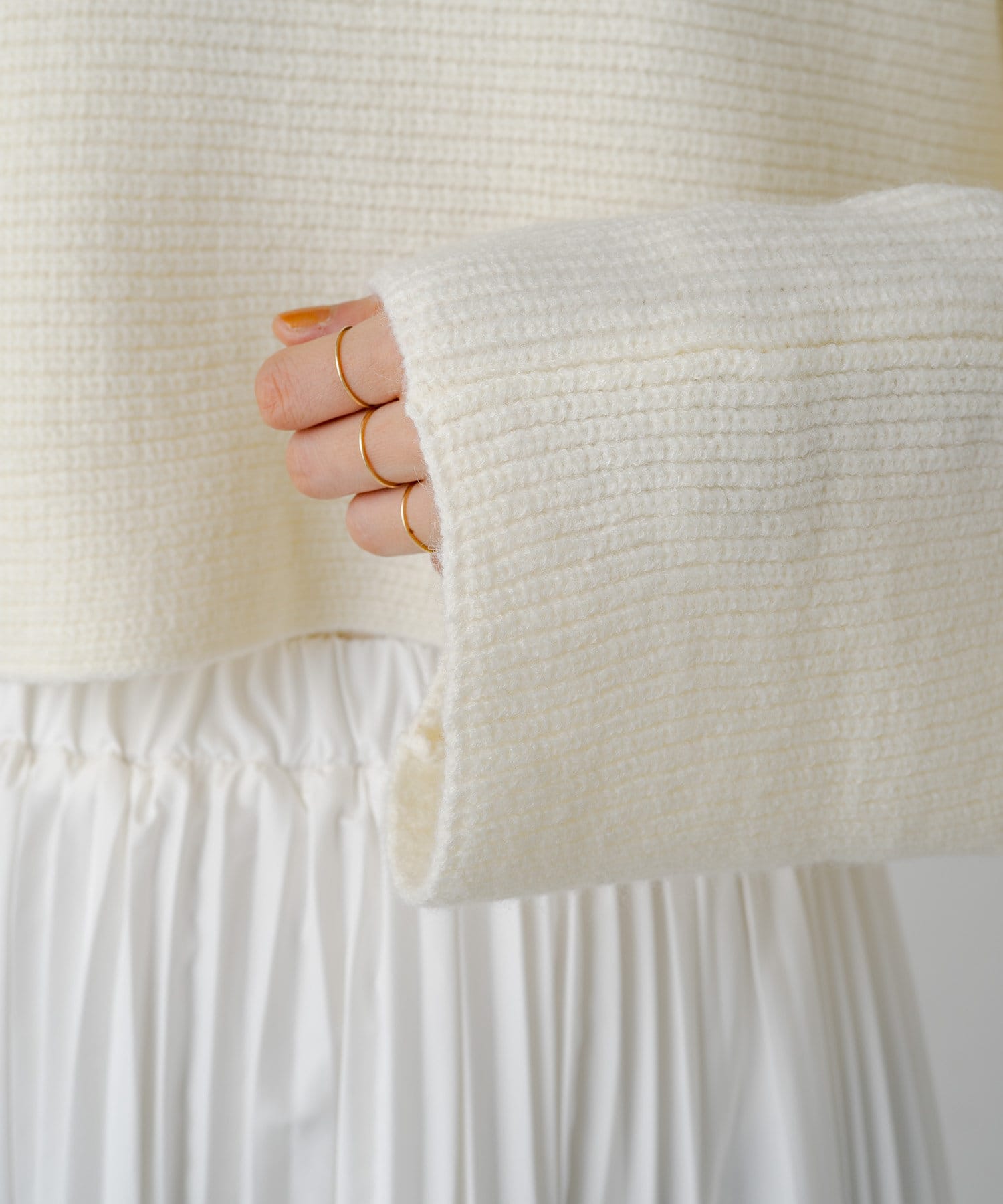 ・シンプルながらショート丈が今年らしい、旬のレイヤードスタイルが楽しめるショートニット。