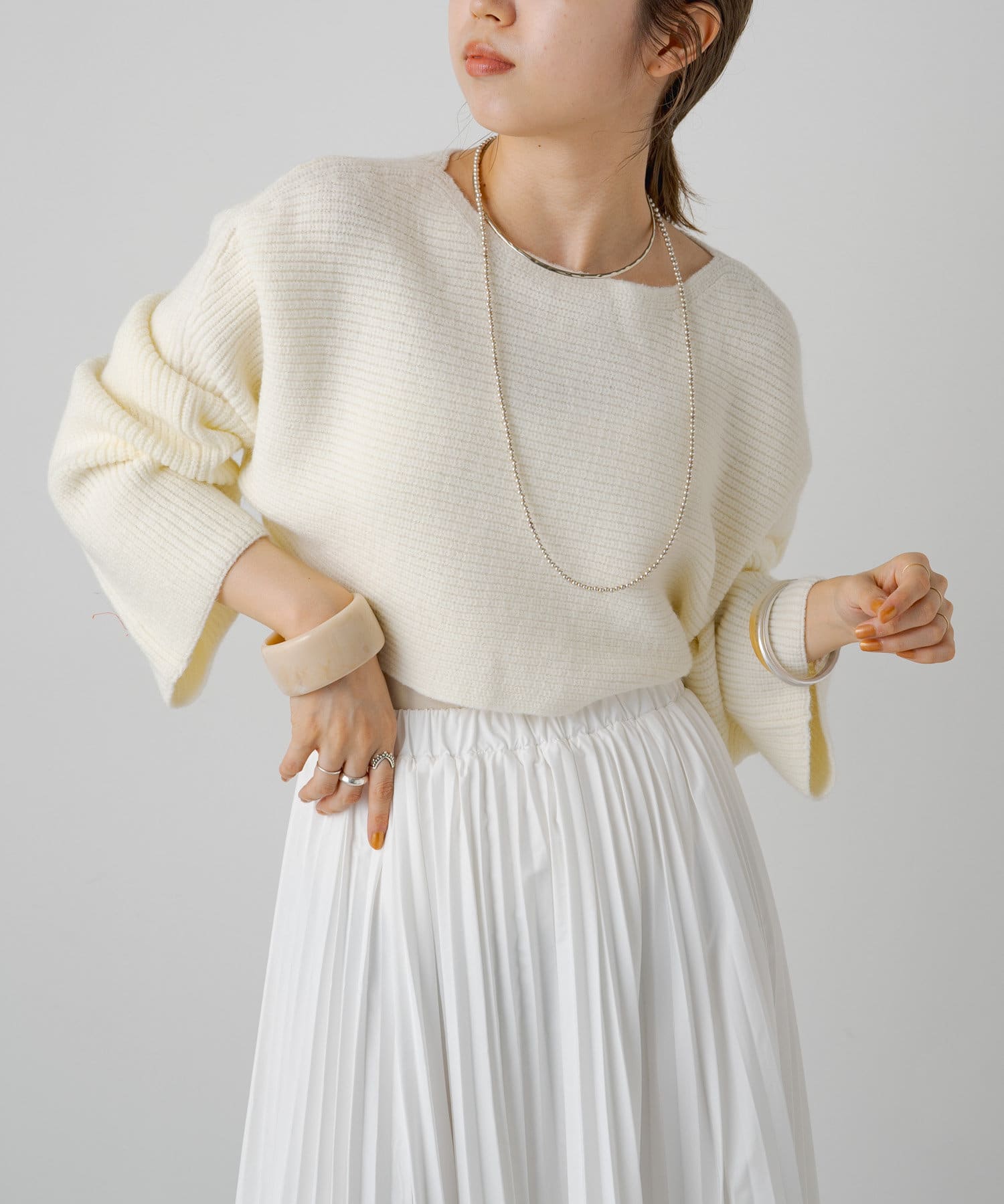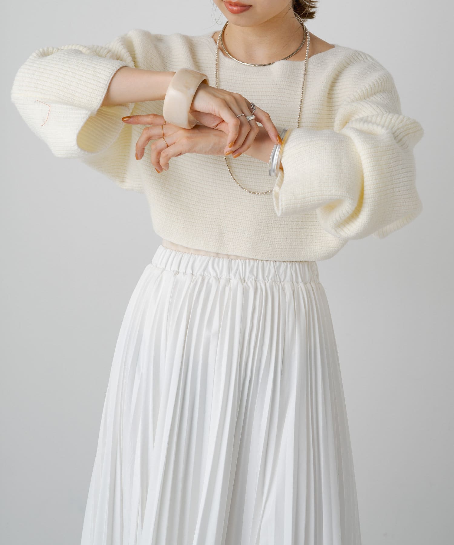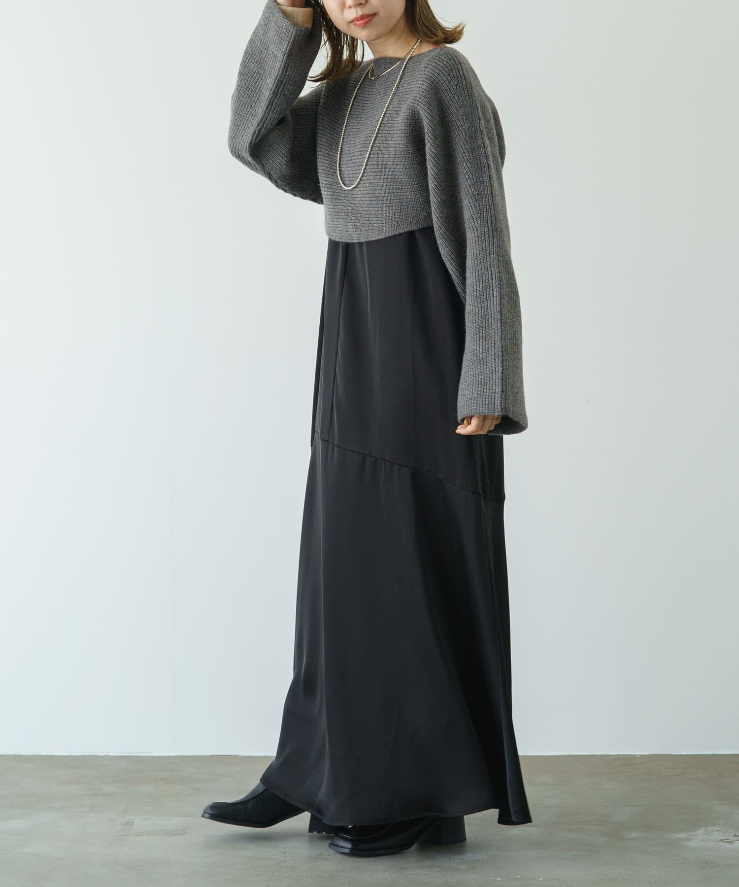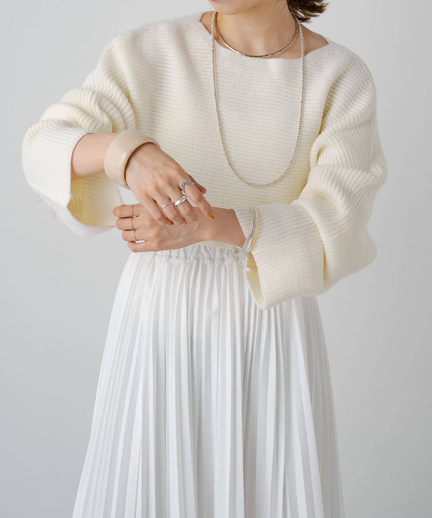 ・シンプルながらショート丈が今年らしい、旬のレイヤードスタイルが楽しめるショートニット。