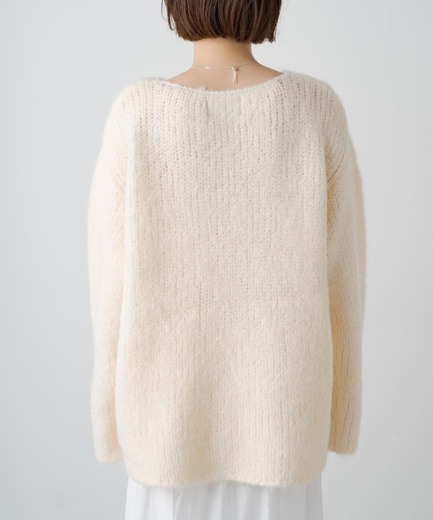 ・程よいボリュームと、表情が映えるヘアリーな風合いがニュアンス感ある雰囲気のニットです。