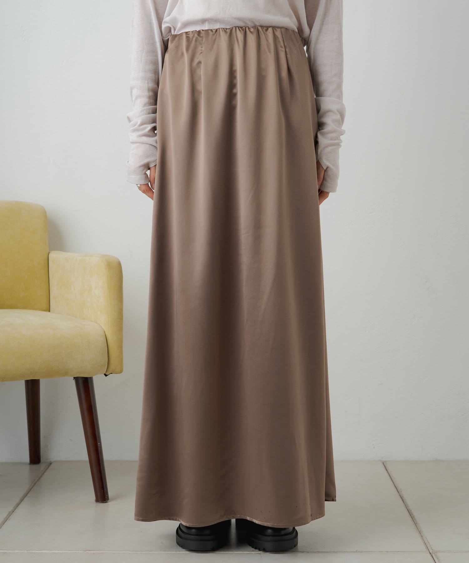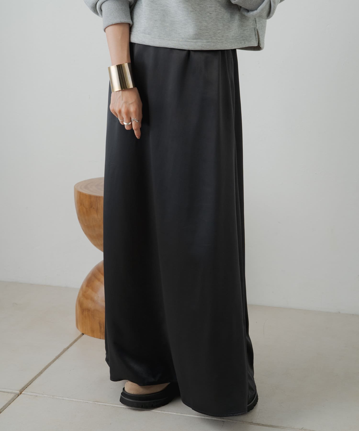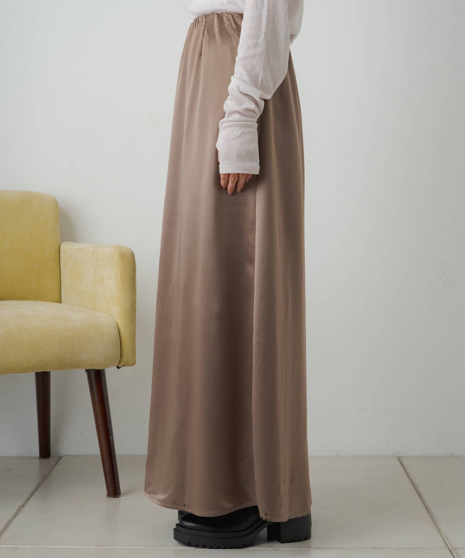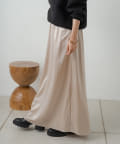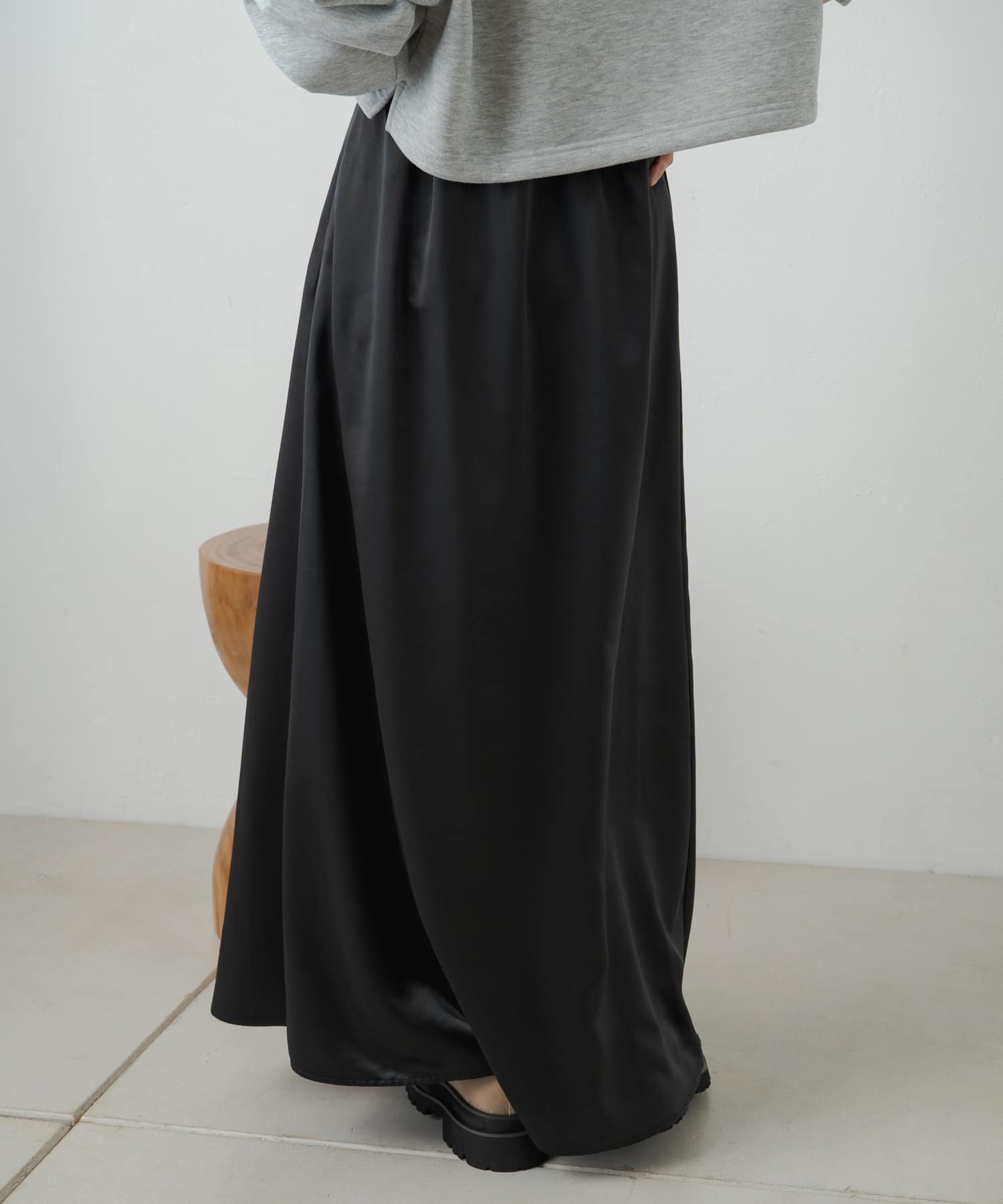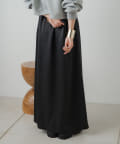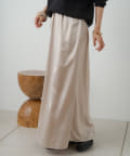 ・光沢感が華やかなサテンスカート、揺れ動くたびに優美で女性らしいシルエットを演出してくれます。