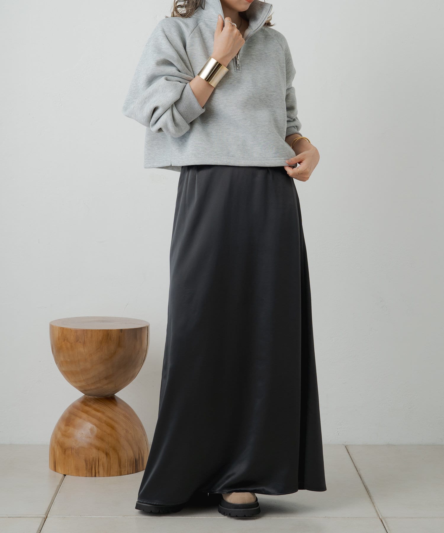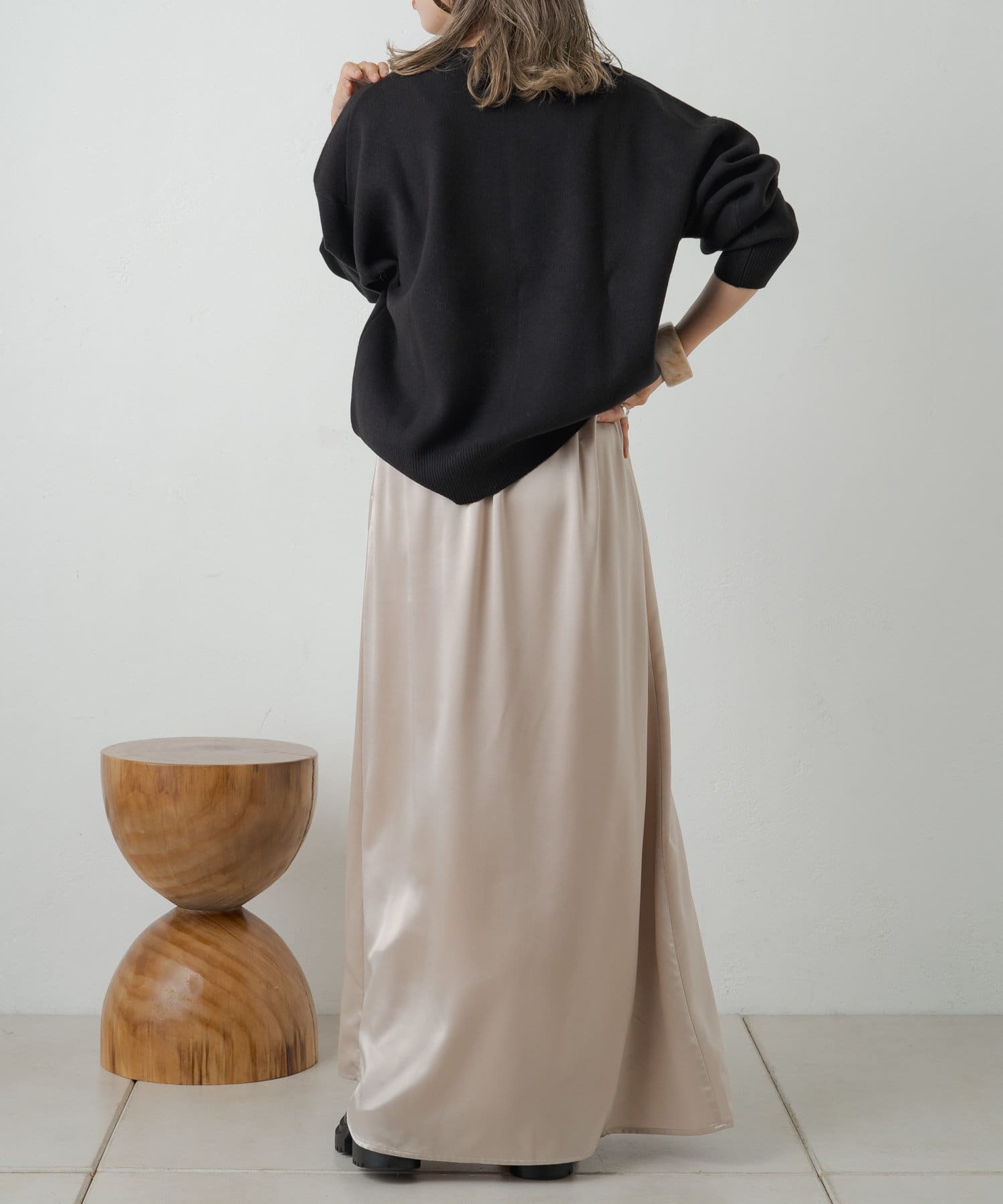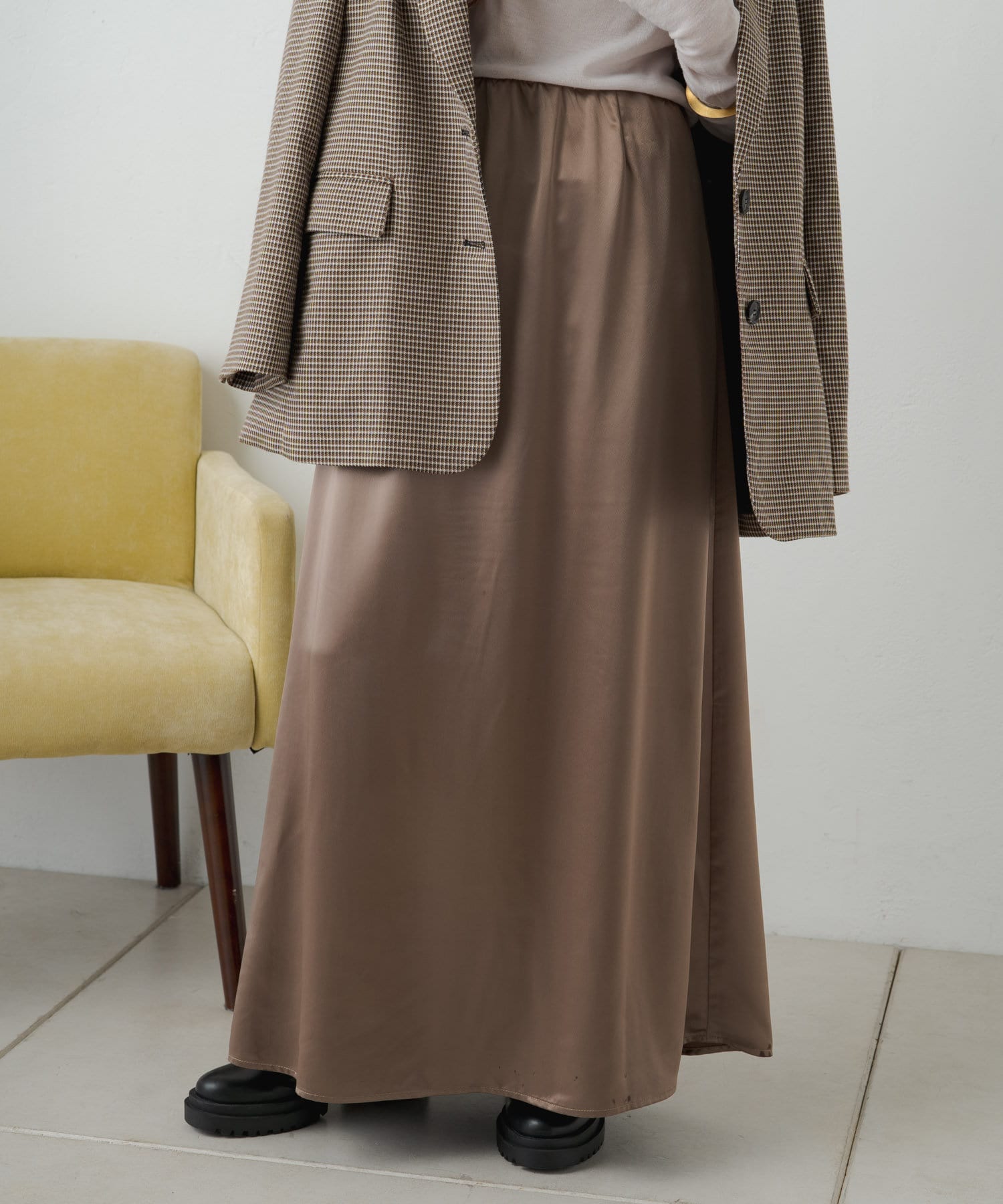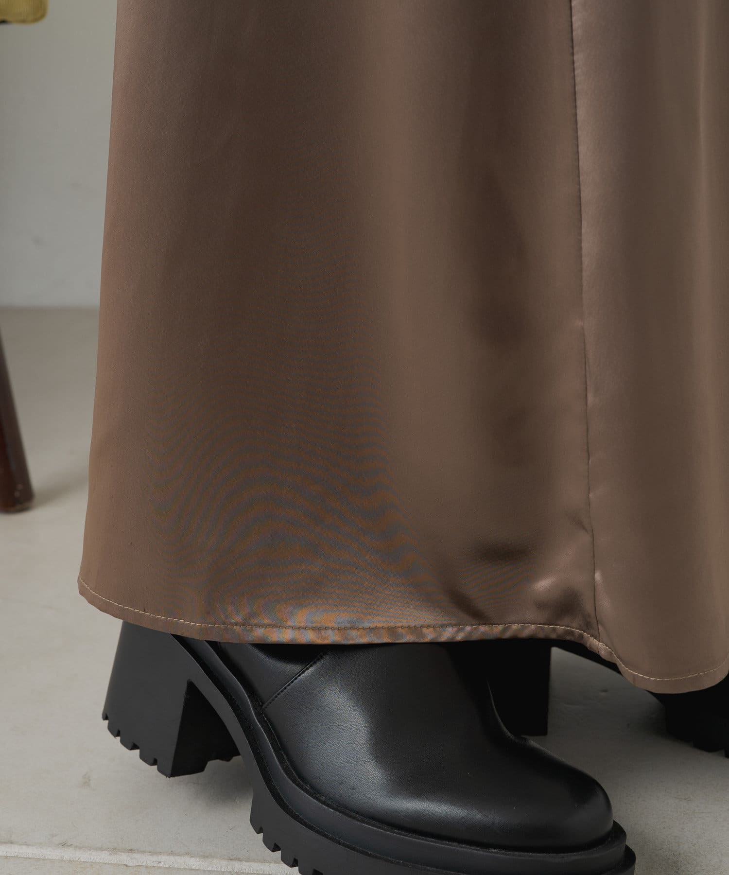 ・光沢感が華やかなサテンスカート、揺れ動くたびに優美で女性らしいシルエットを演出してくれます。