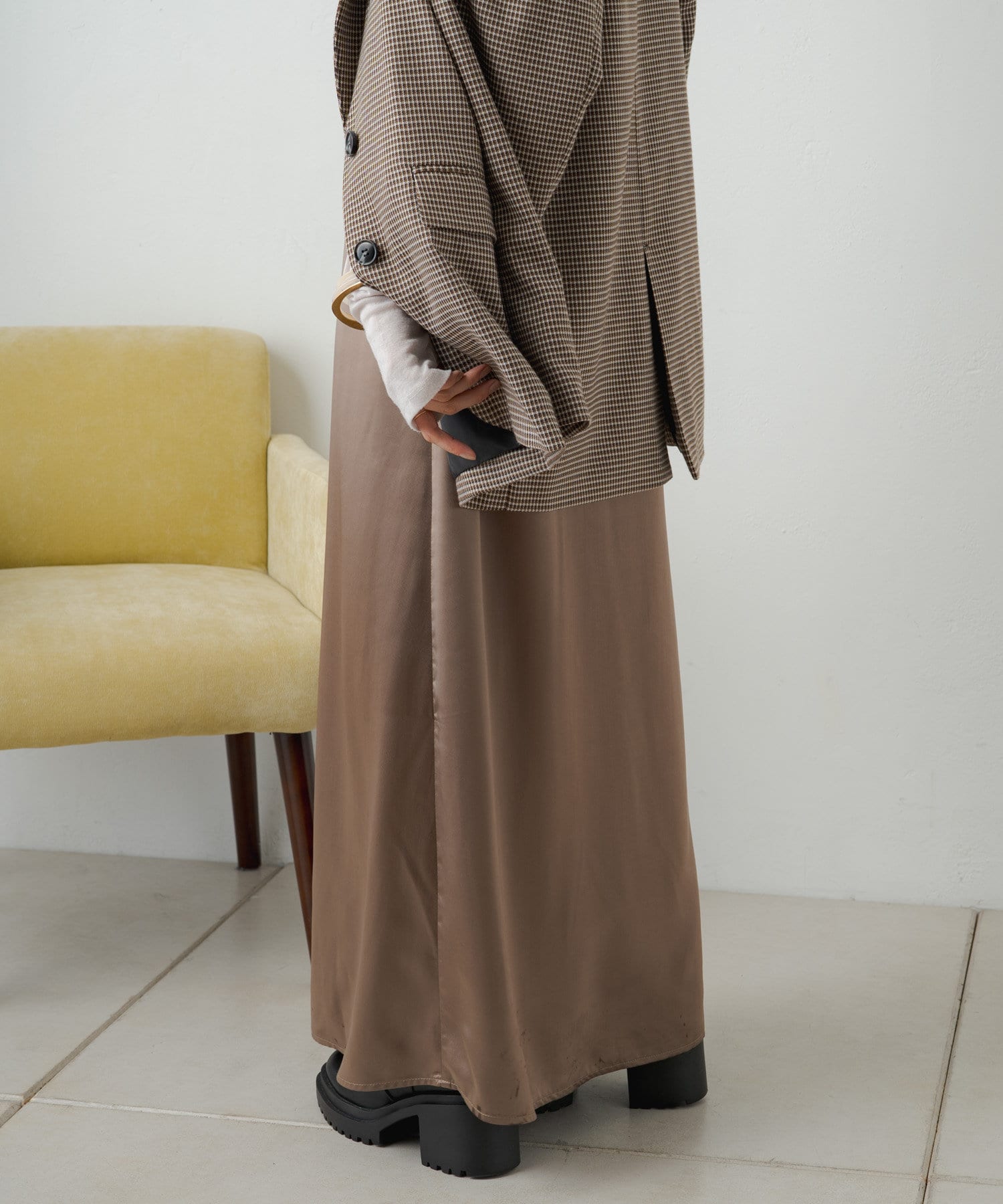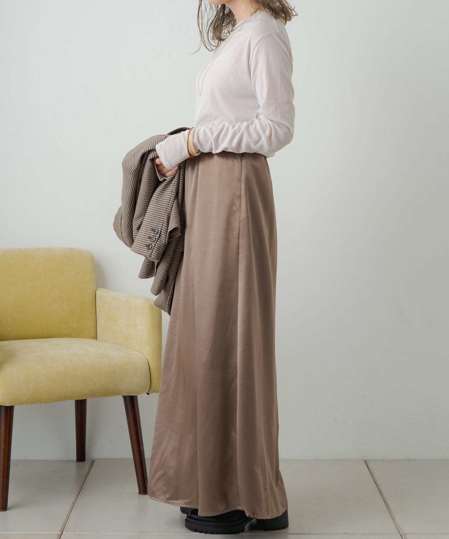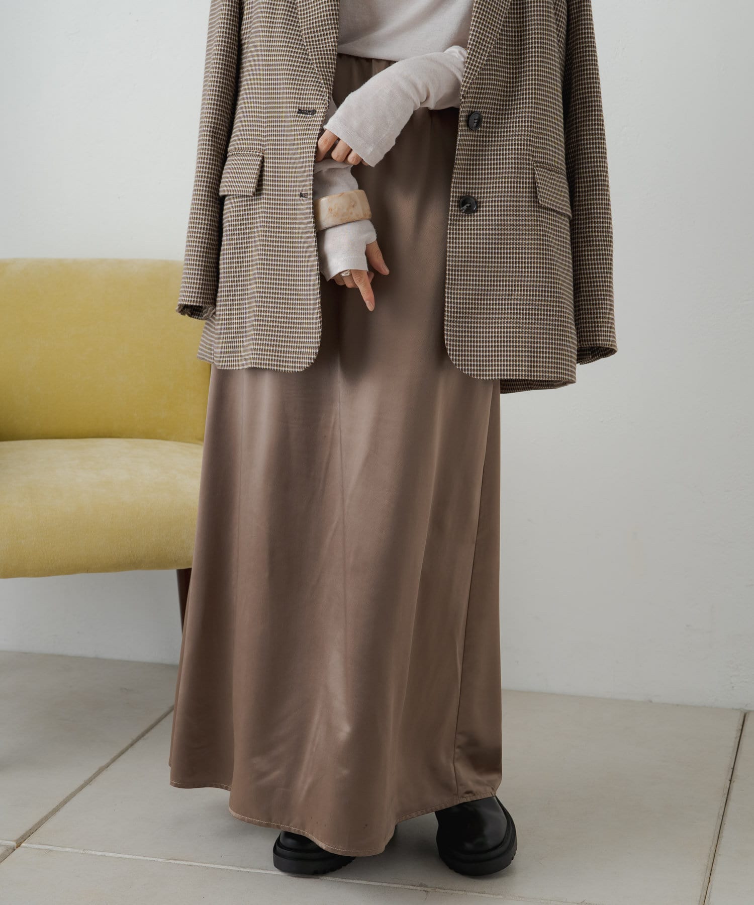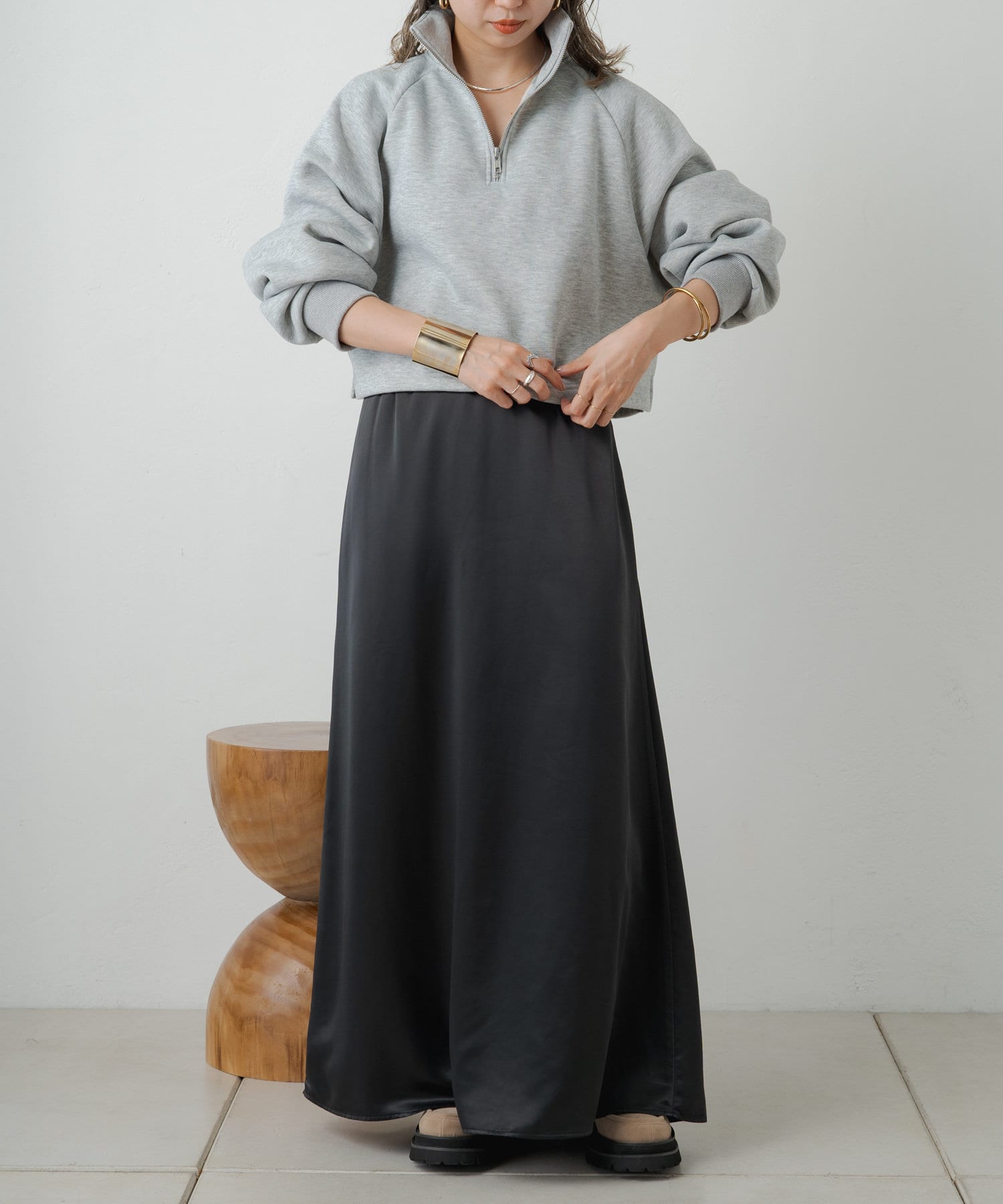 ・光沢感が華やかなサテンスカート、揺れ動くたびに優美で女性らしいシルエットを演出してくれます。
