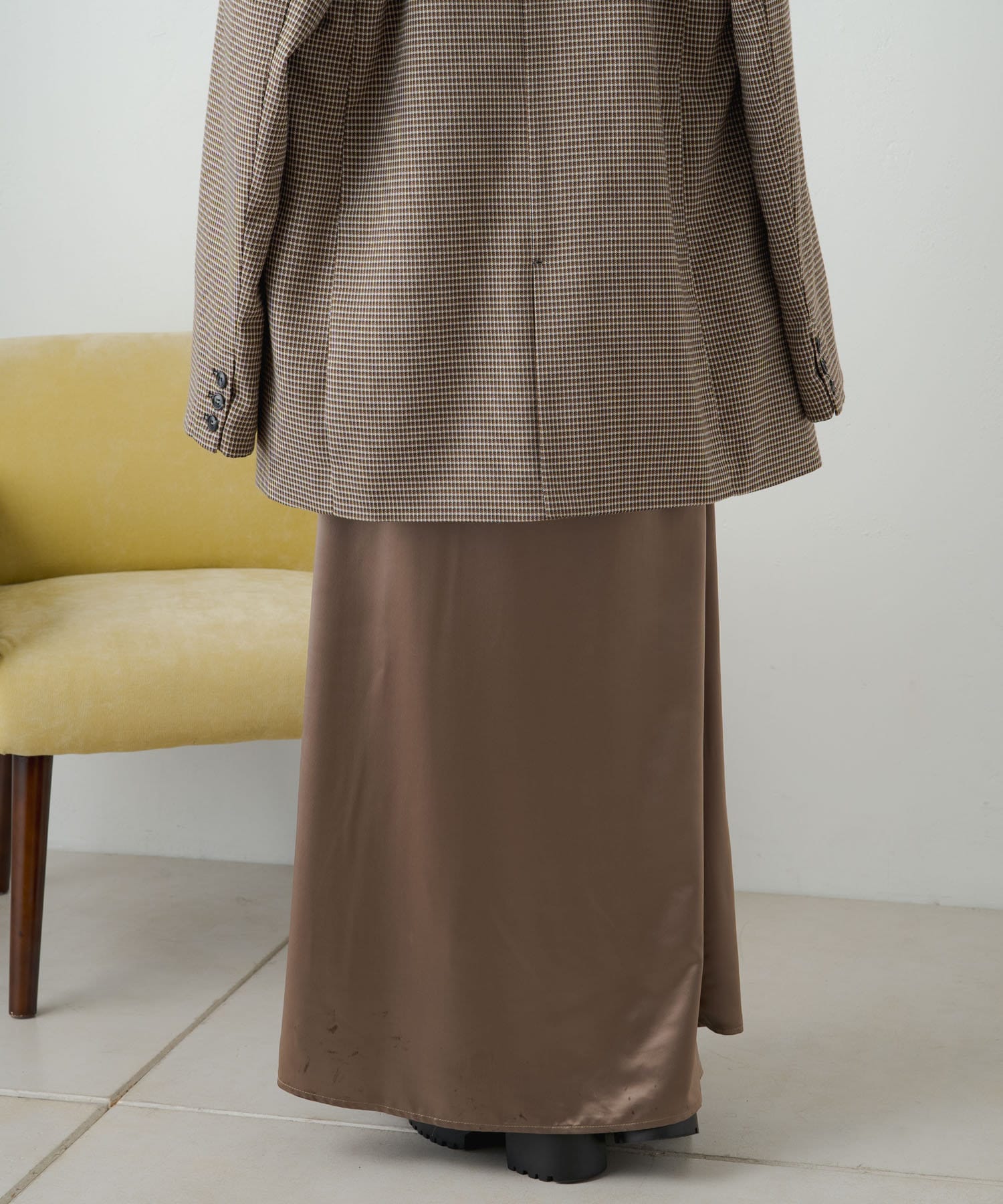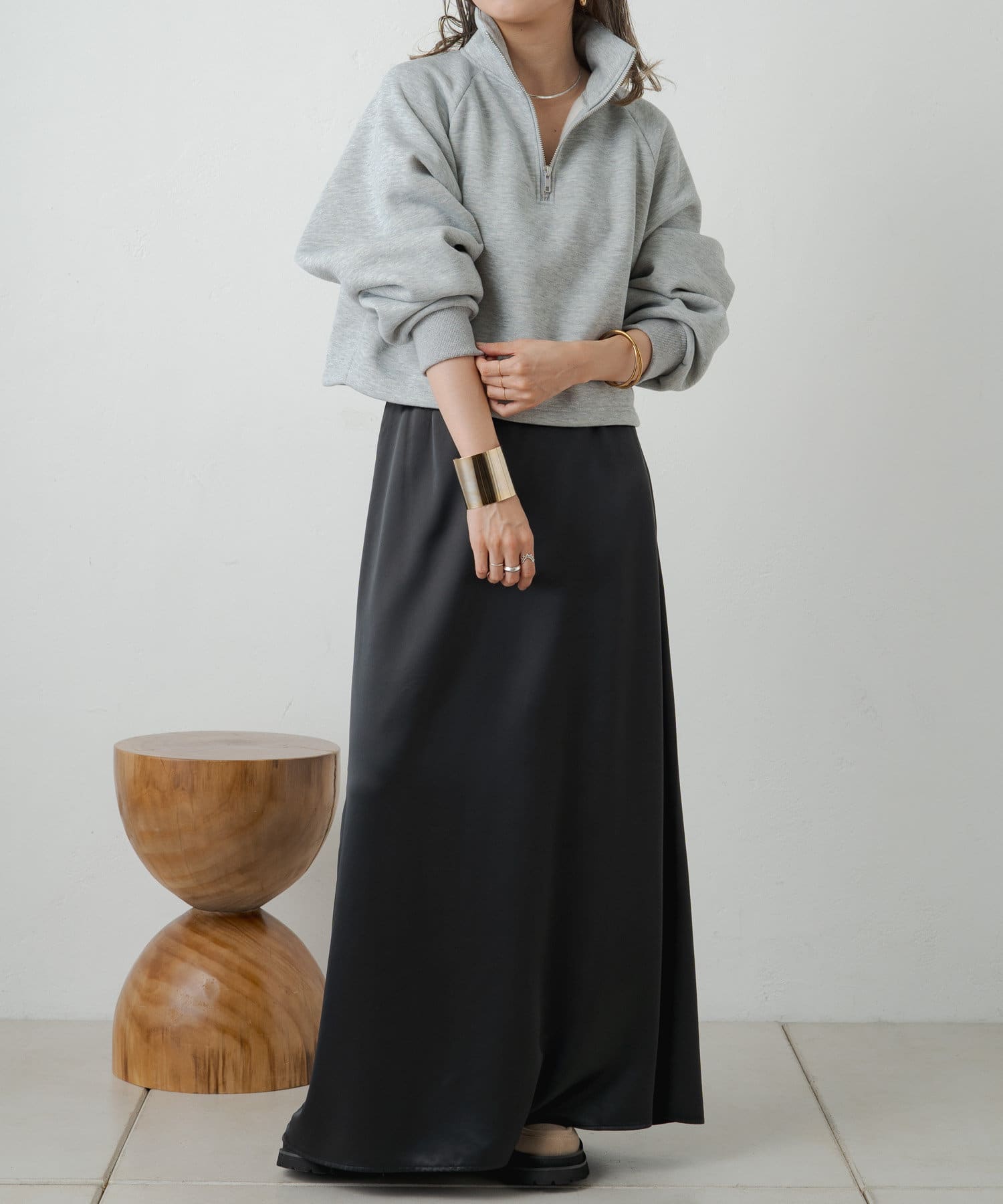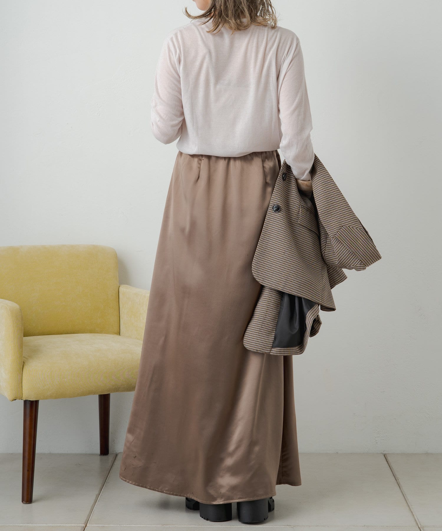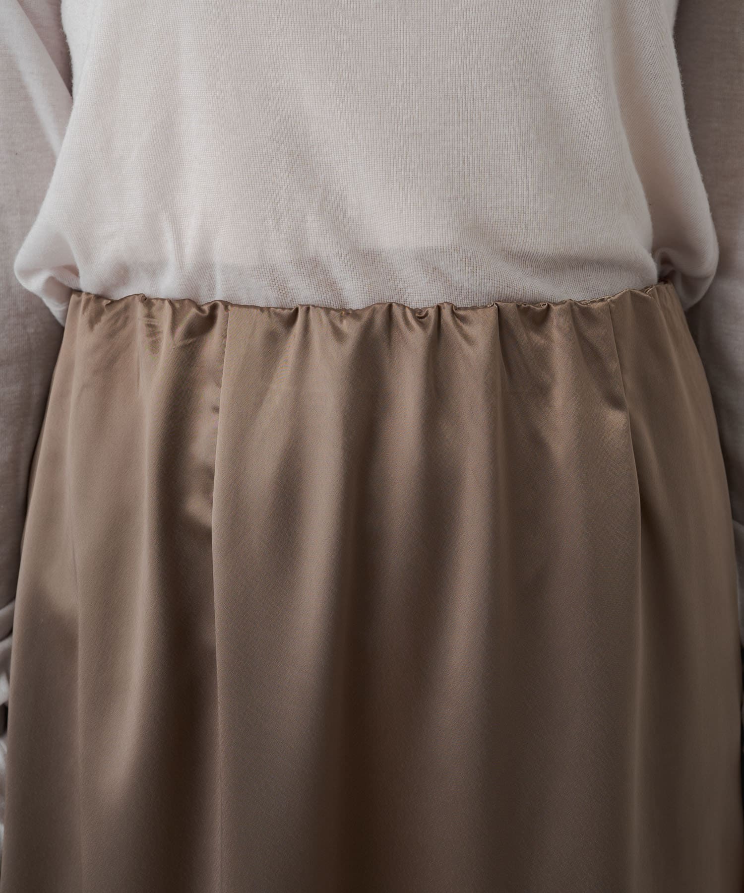 ・光沢感が華やかなサテンスカート、揺れ動くたびに優美で女性らしいシルエットを演出してくれます。