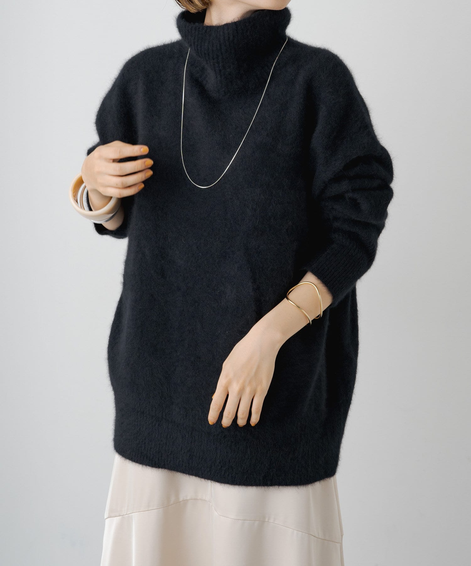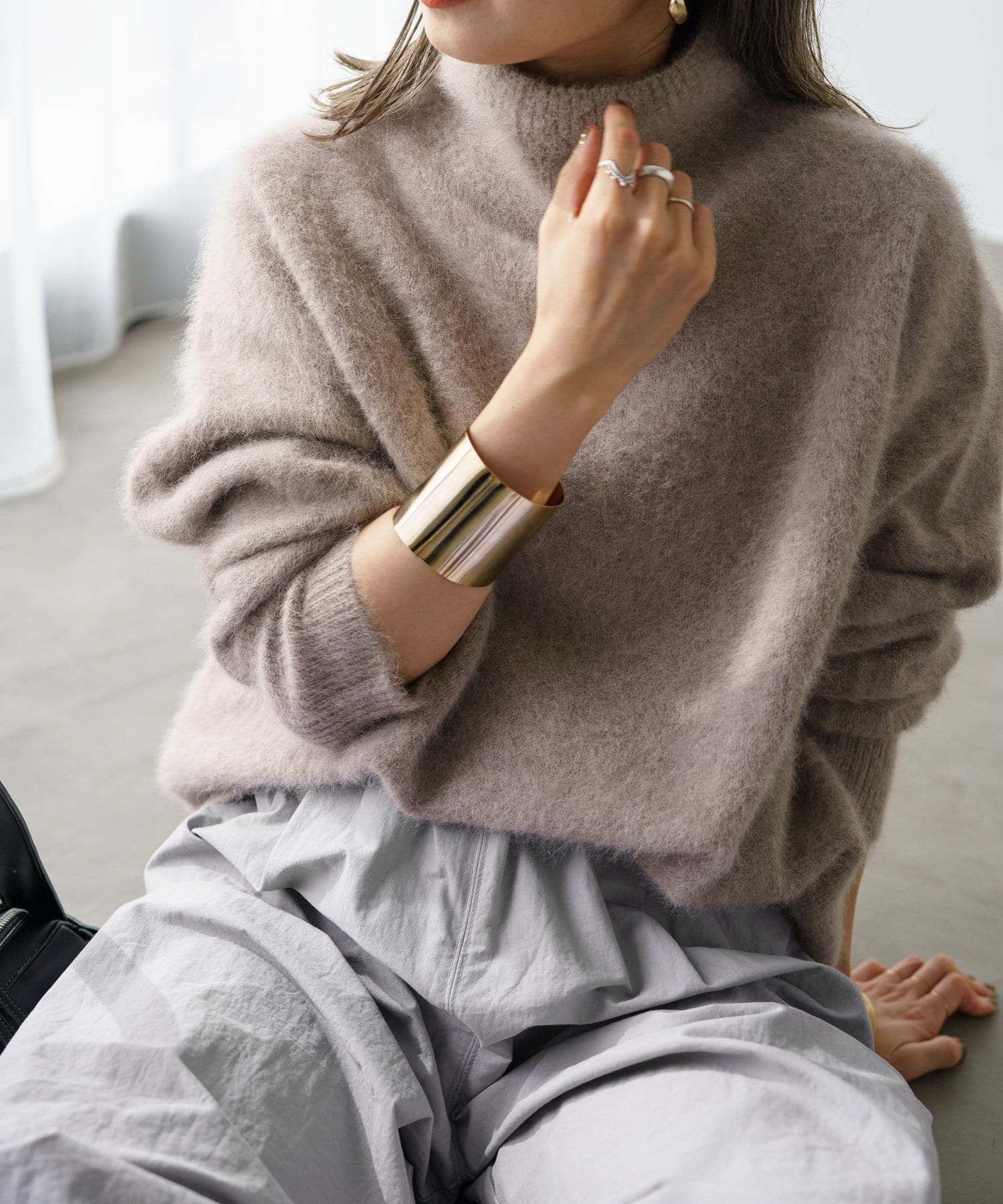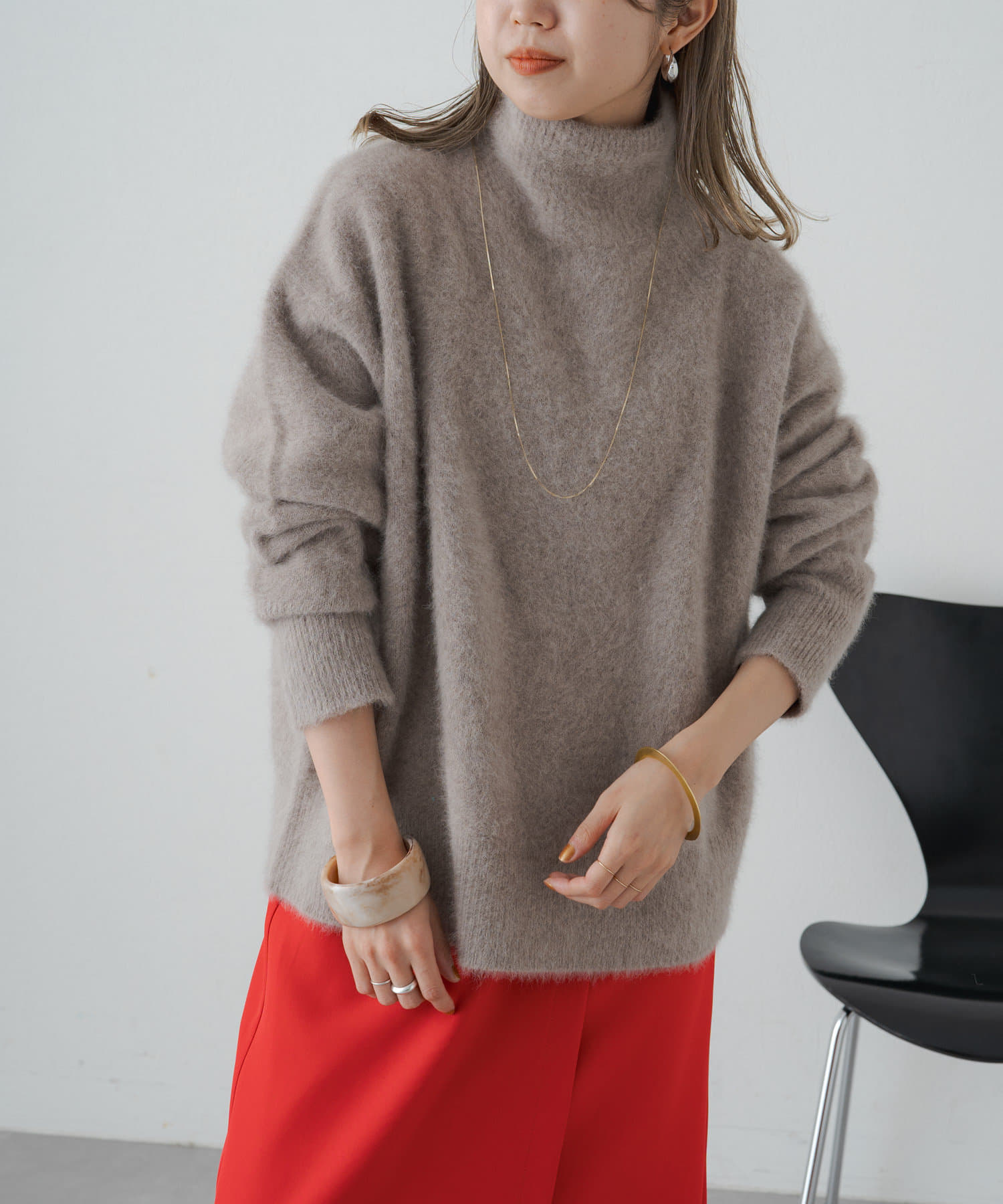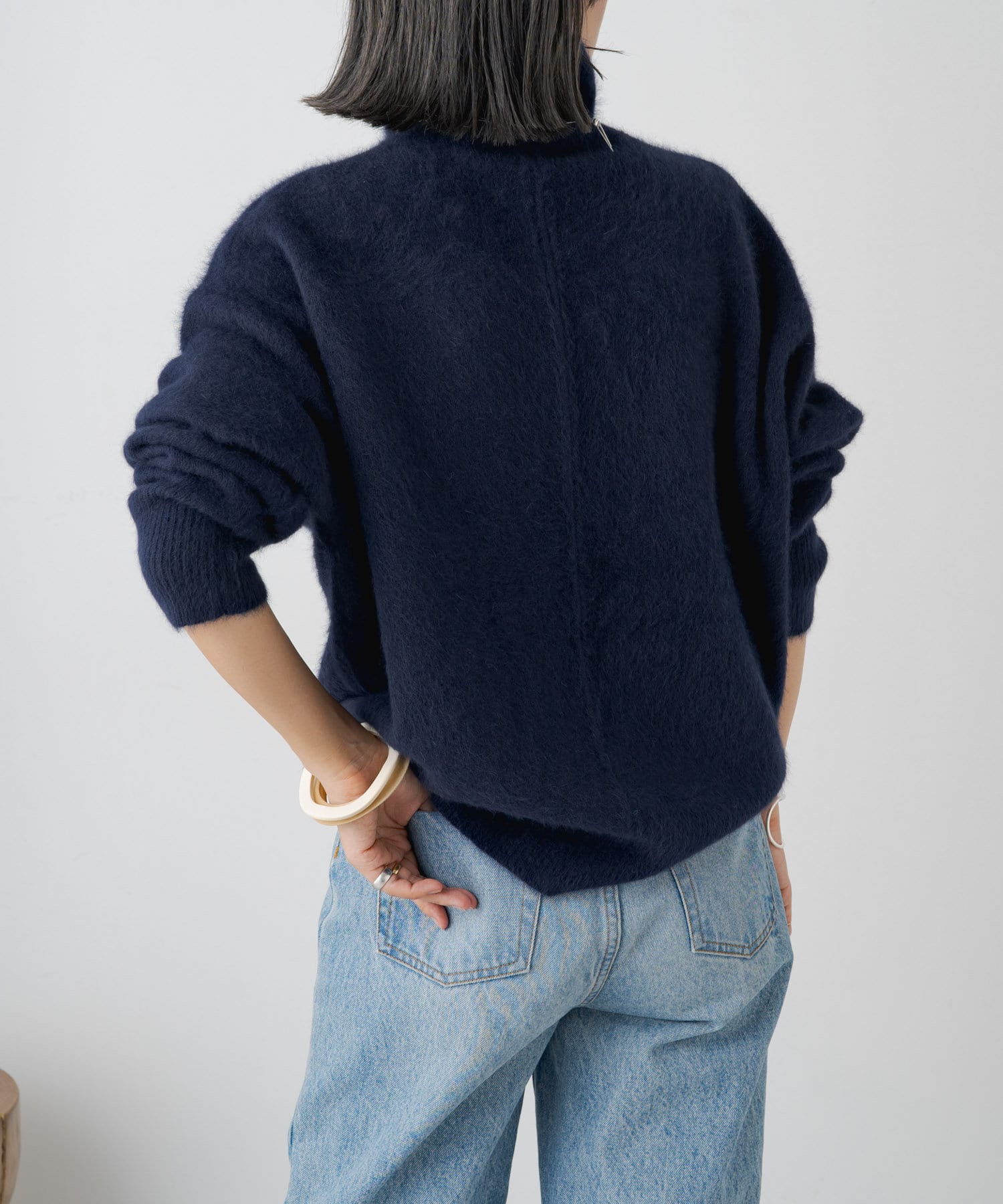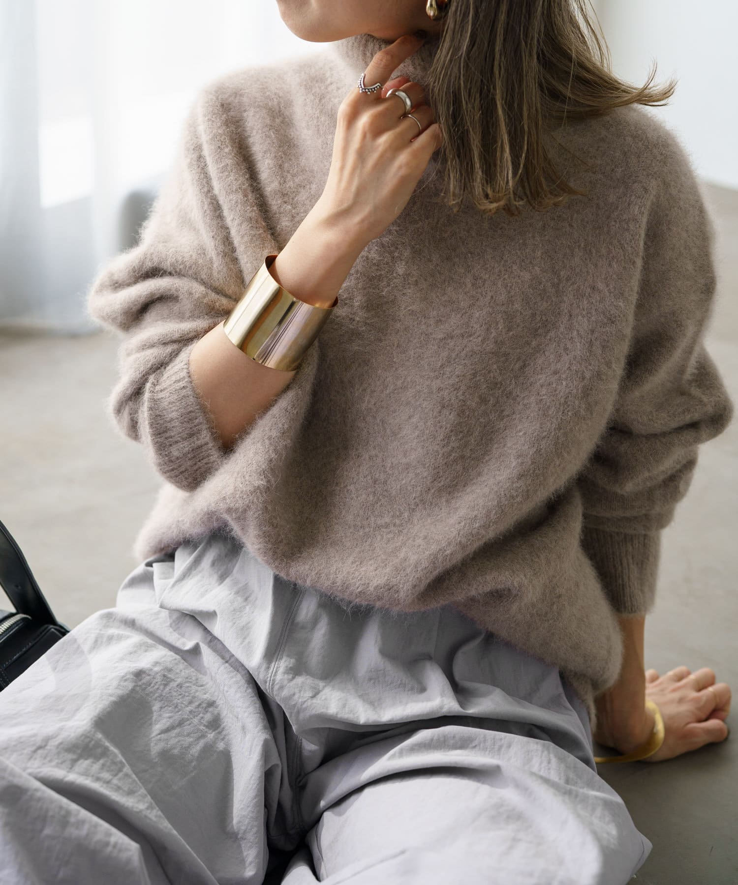 ・程よいボリュームと、表情が映えるヘアリーな風合いがニュアンス感ある雰囲気のニットです。