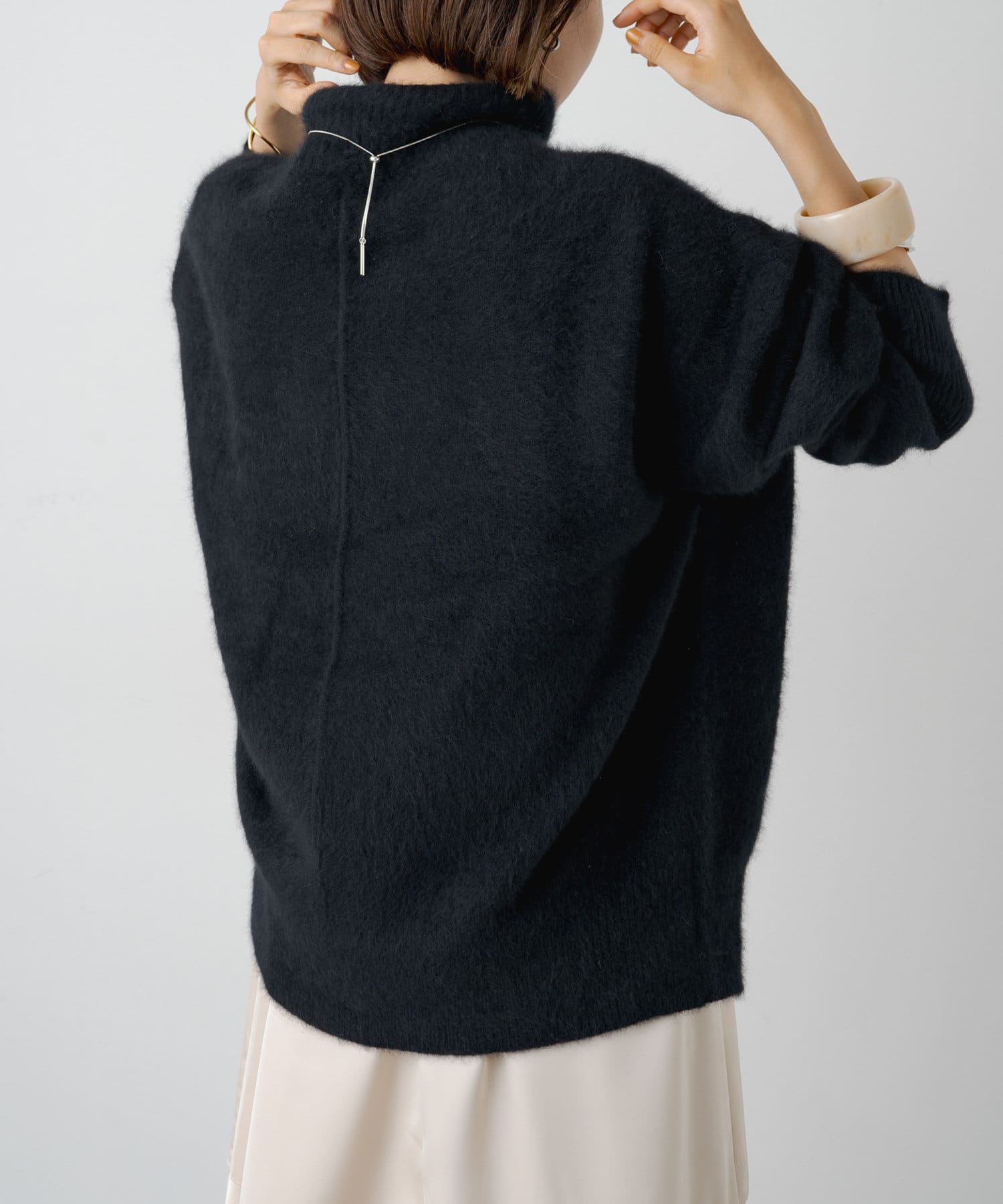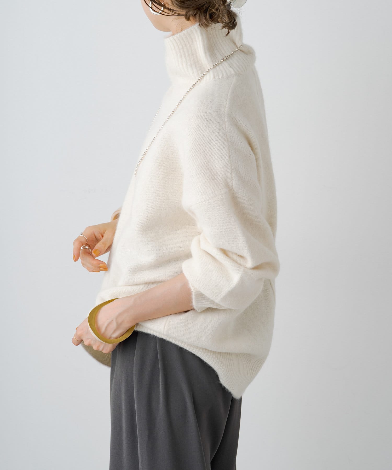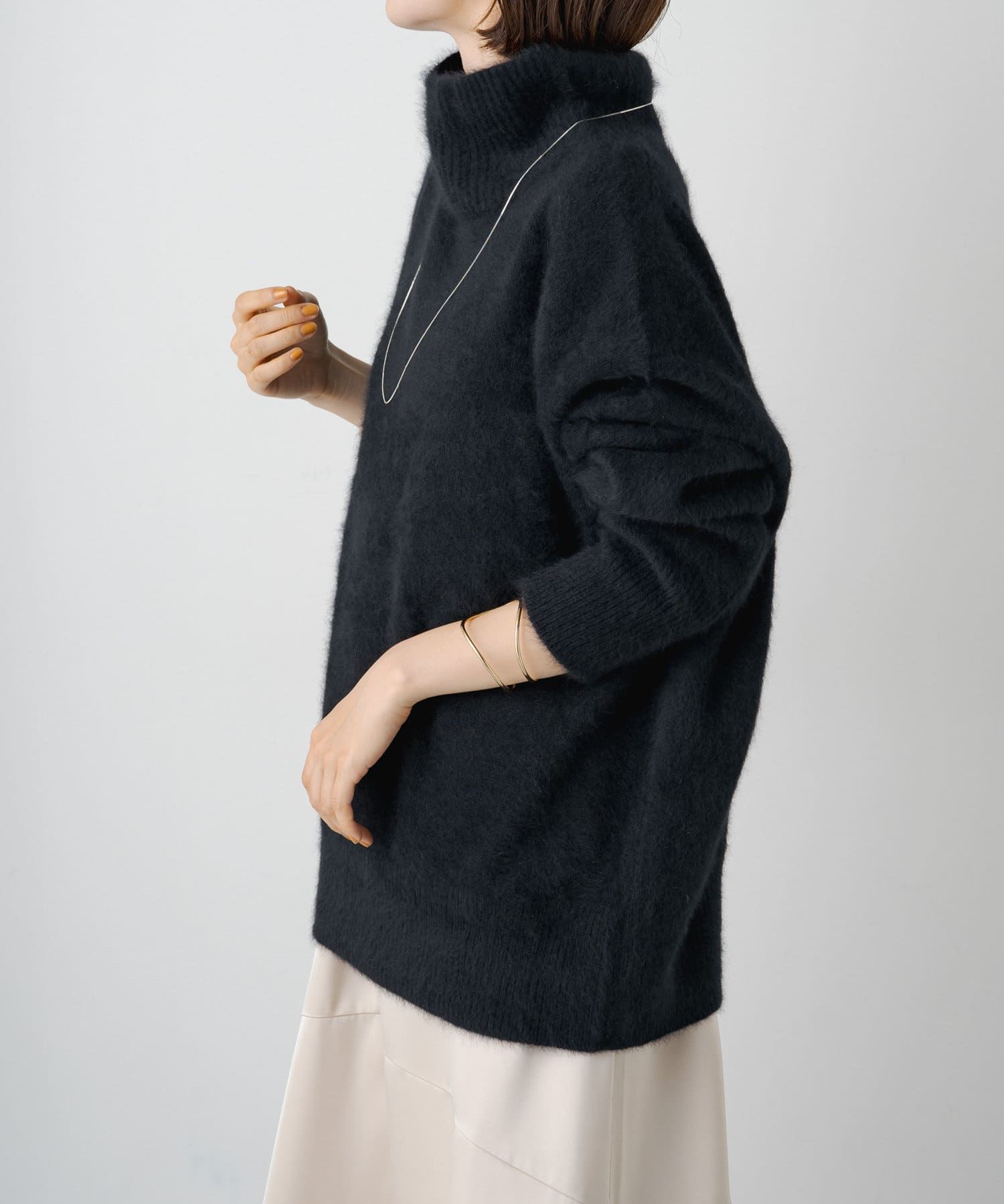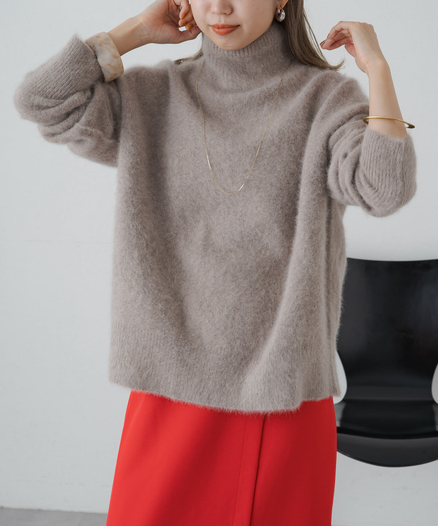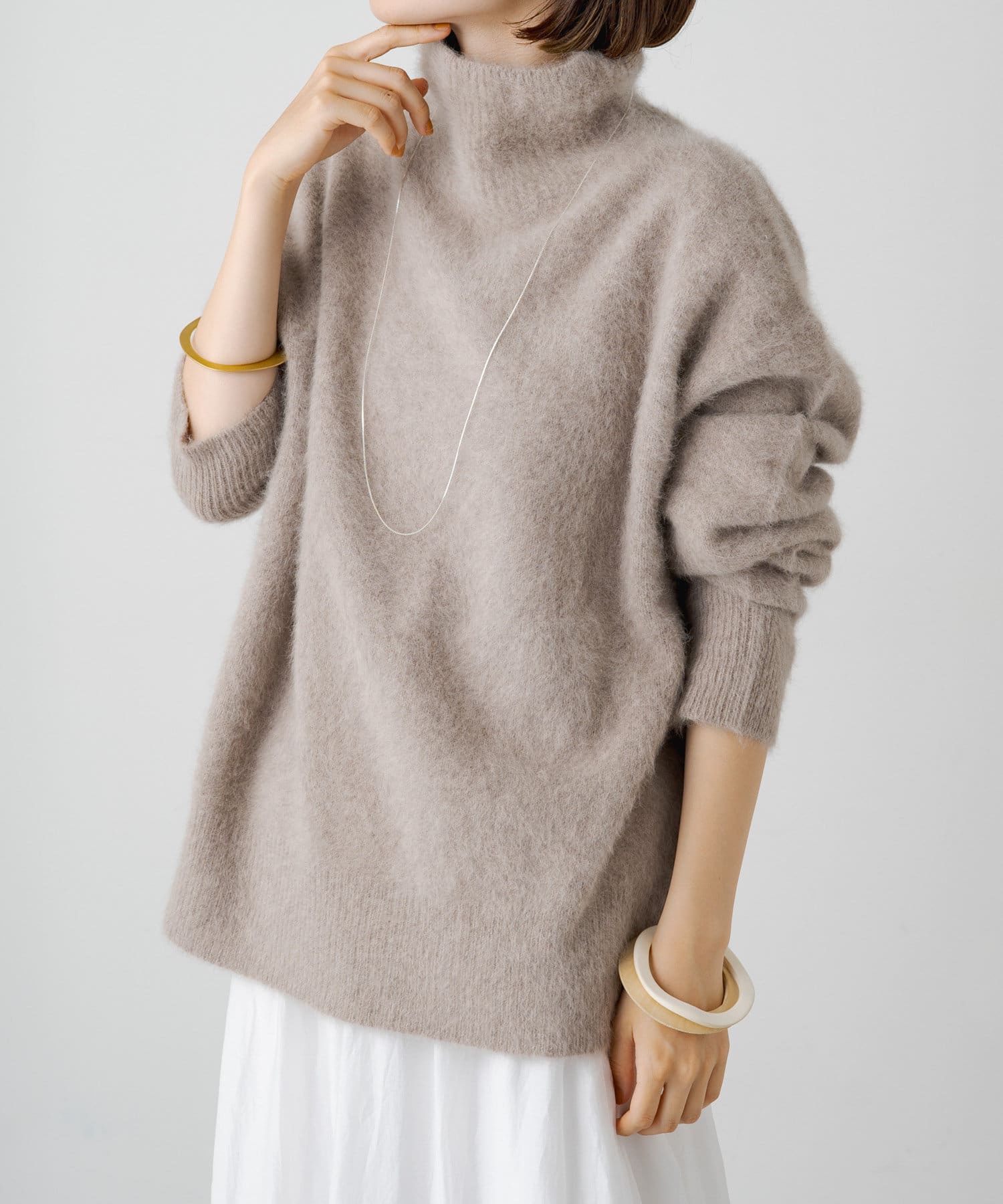・程よいボリュームと、表情が映えるヘアリーな風合いがニュアンス感ある雰囲気のニットです。