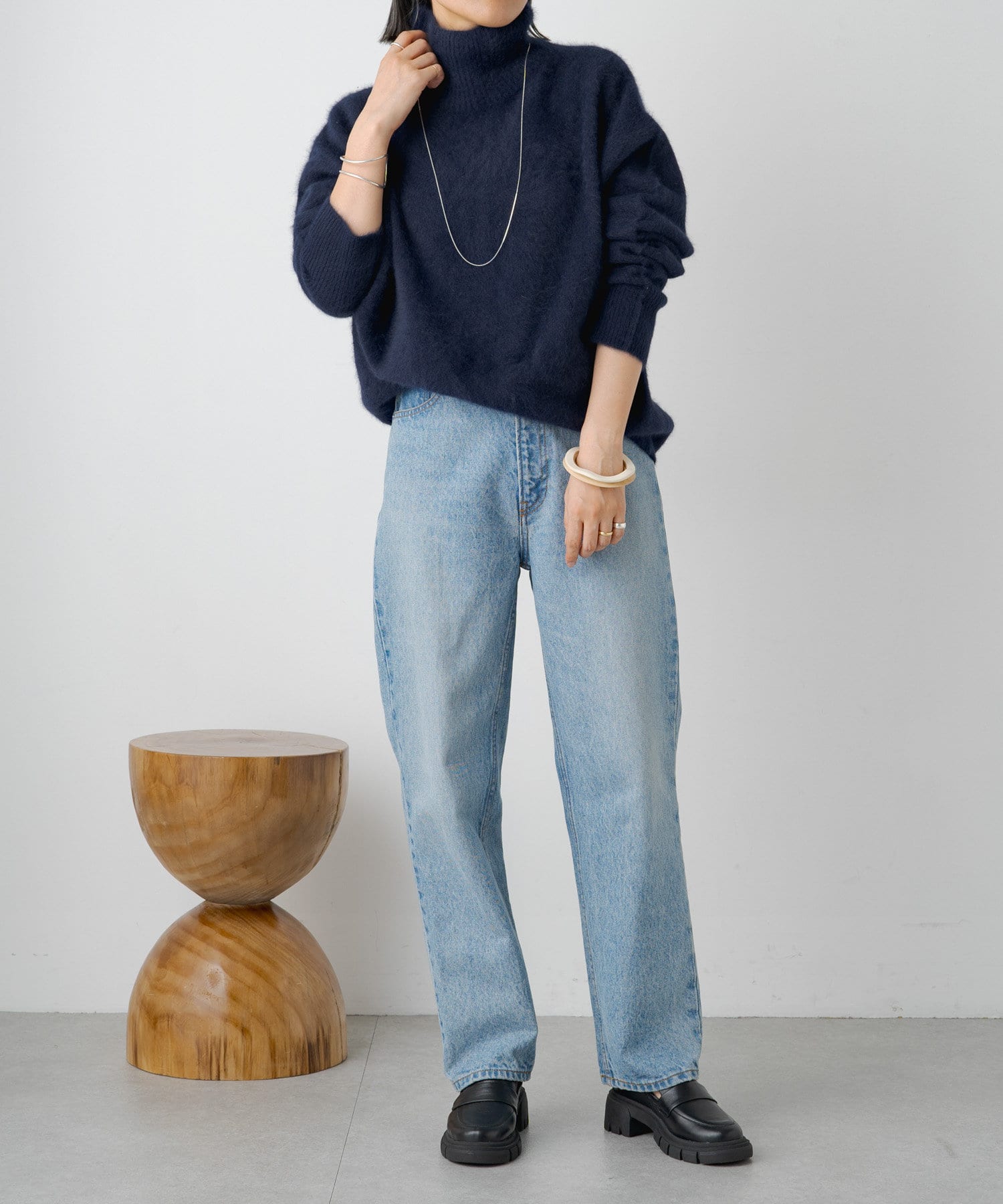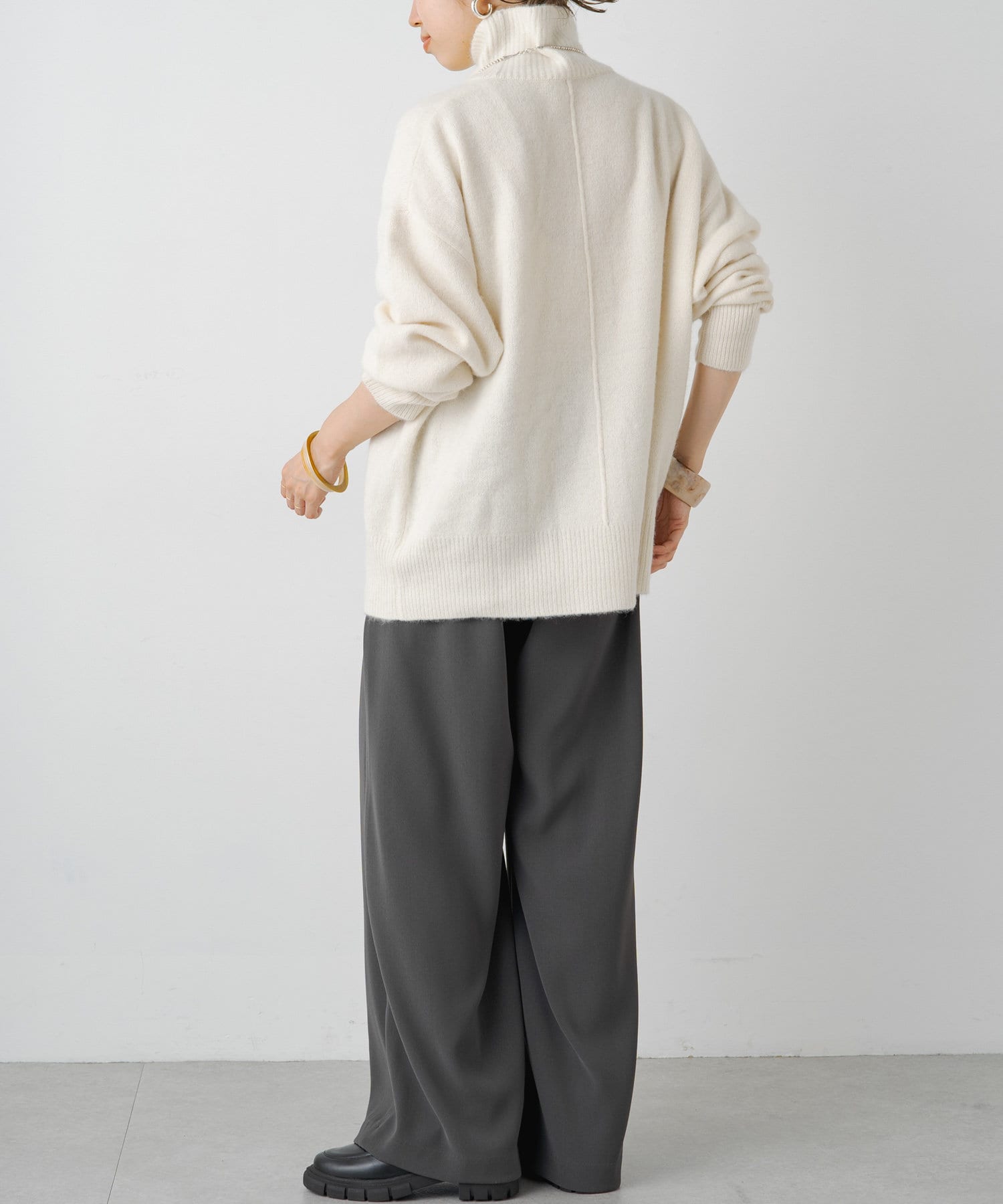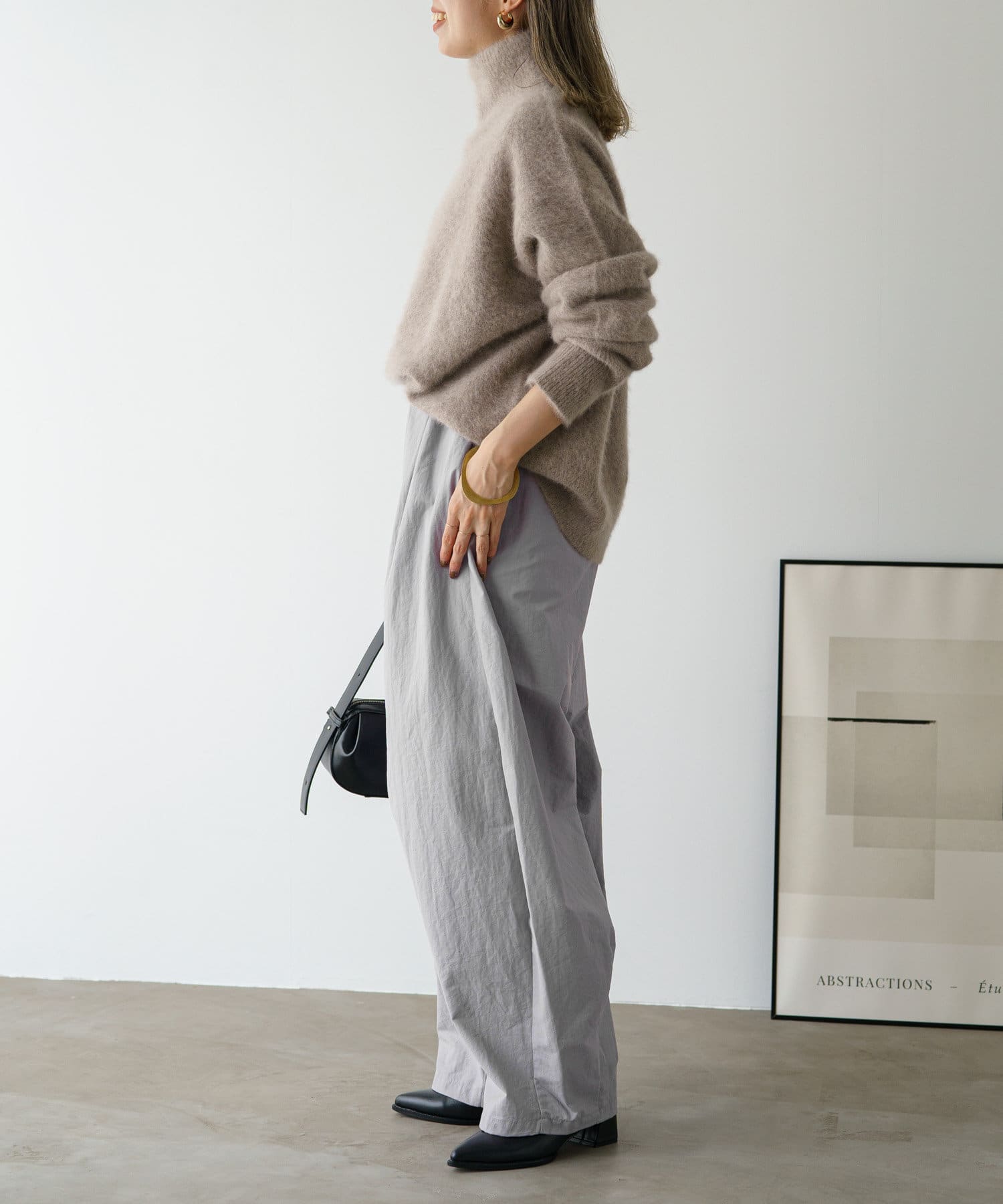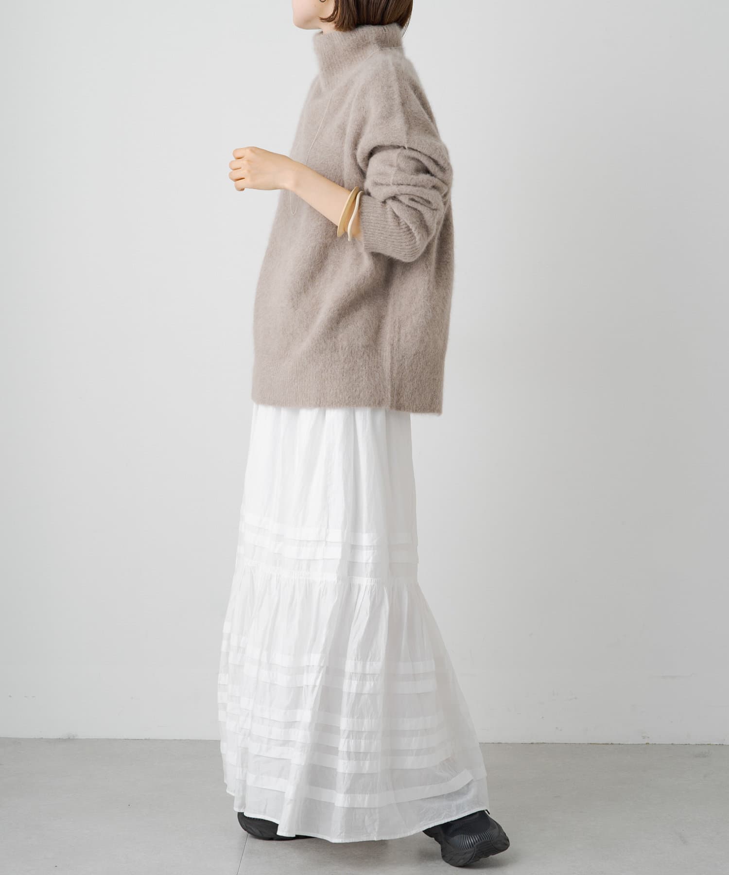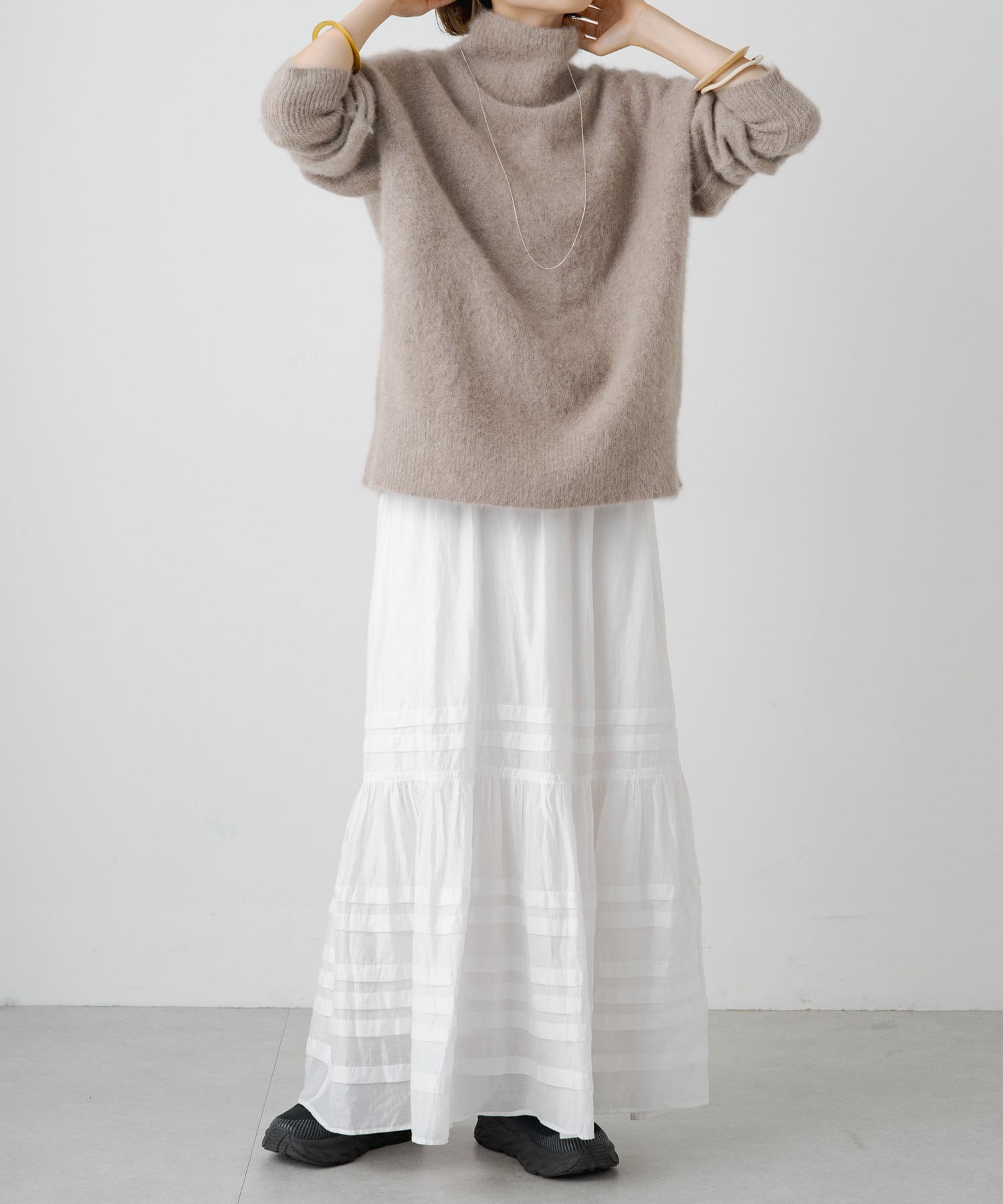 ・程よいボリュームと、表情が映えるヘアリーな風合いがニュアンス感ある雰囲気のニットです。