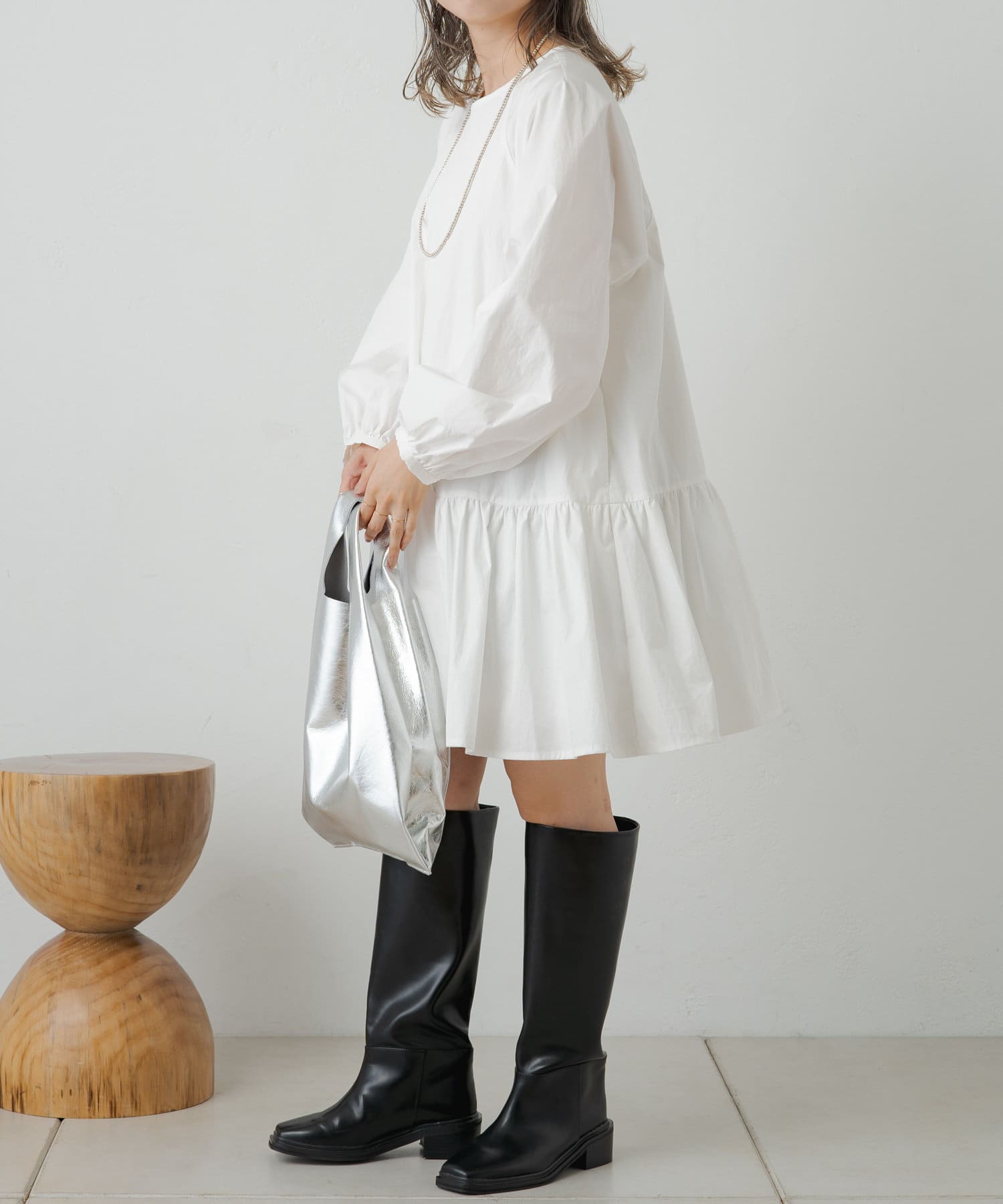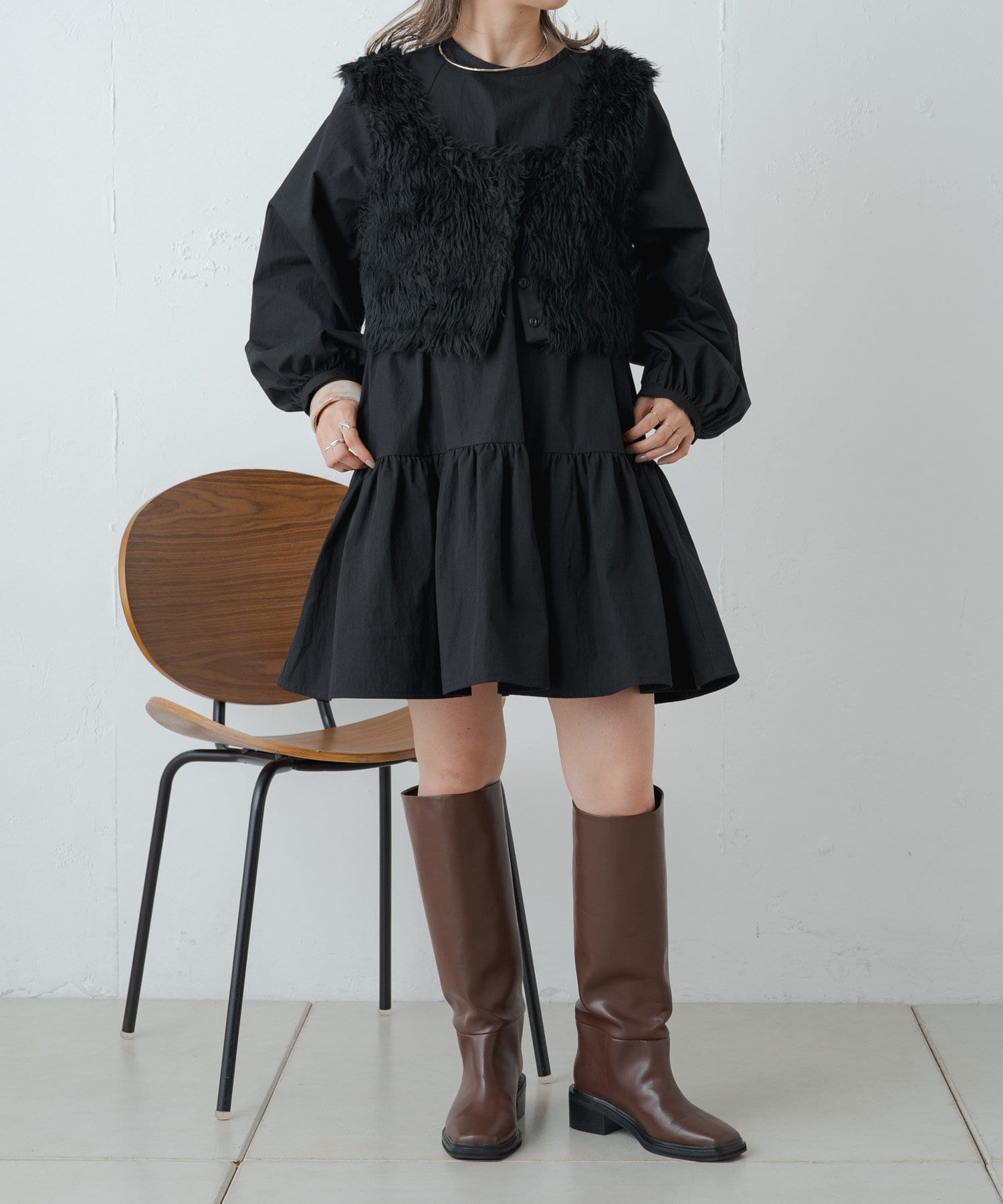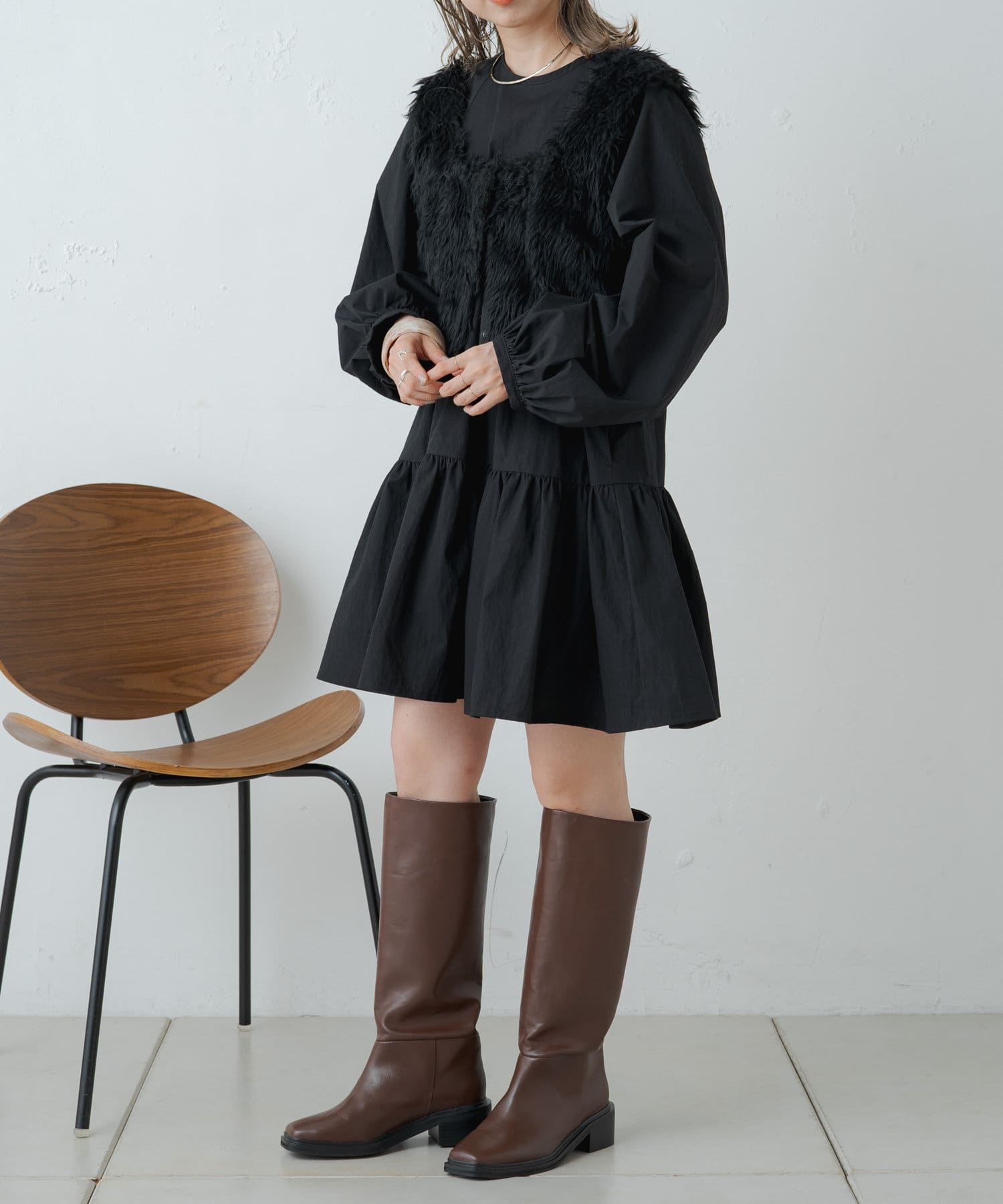 ・ミニ丈が気になる方は、デニムやレギンスと合わせて頂くと◎