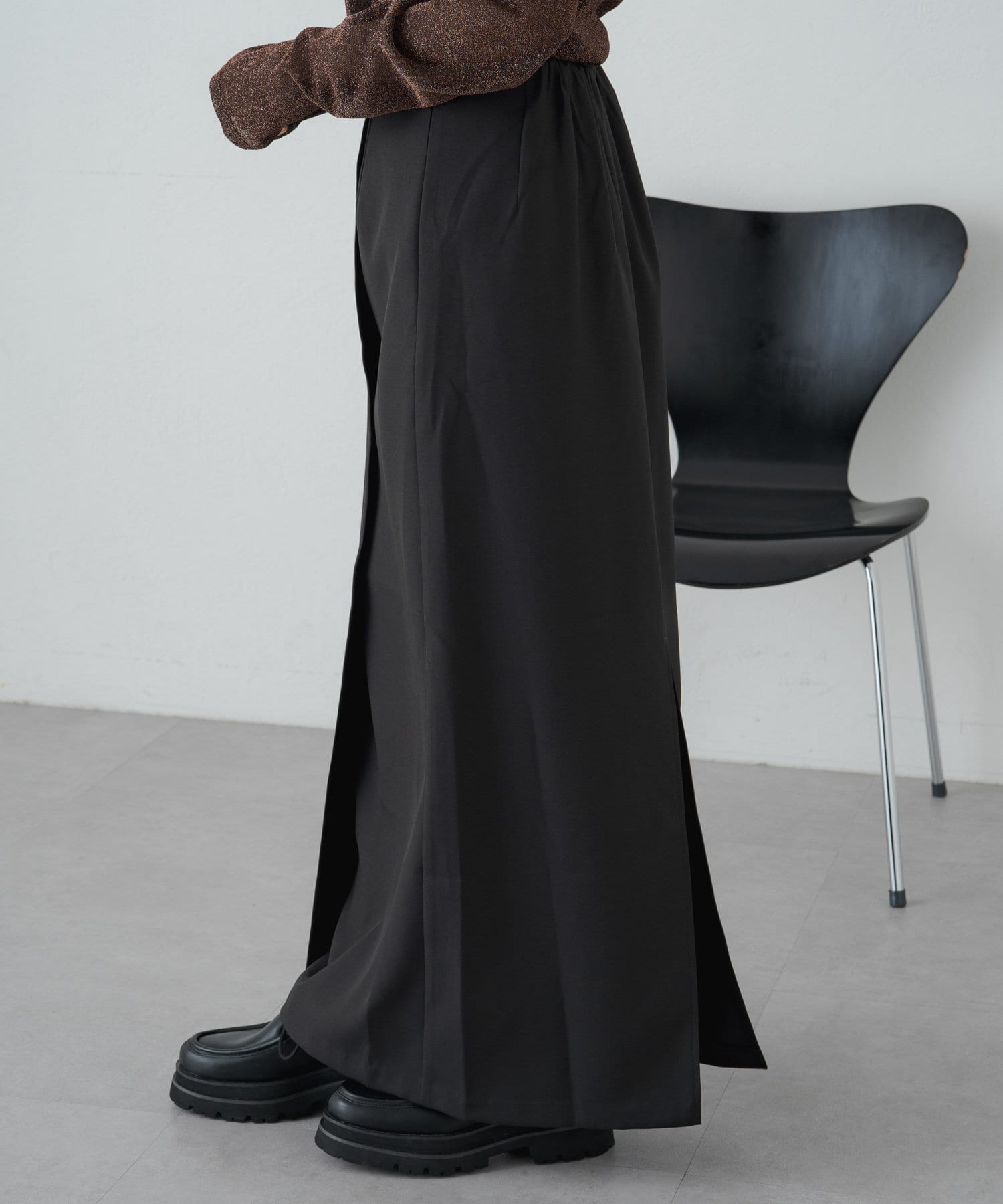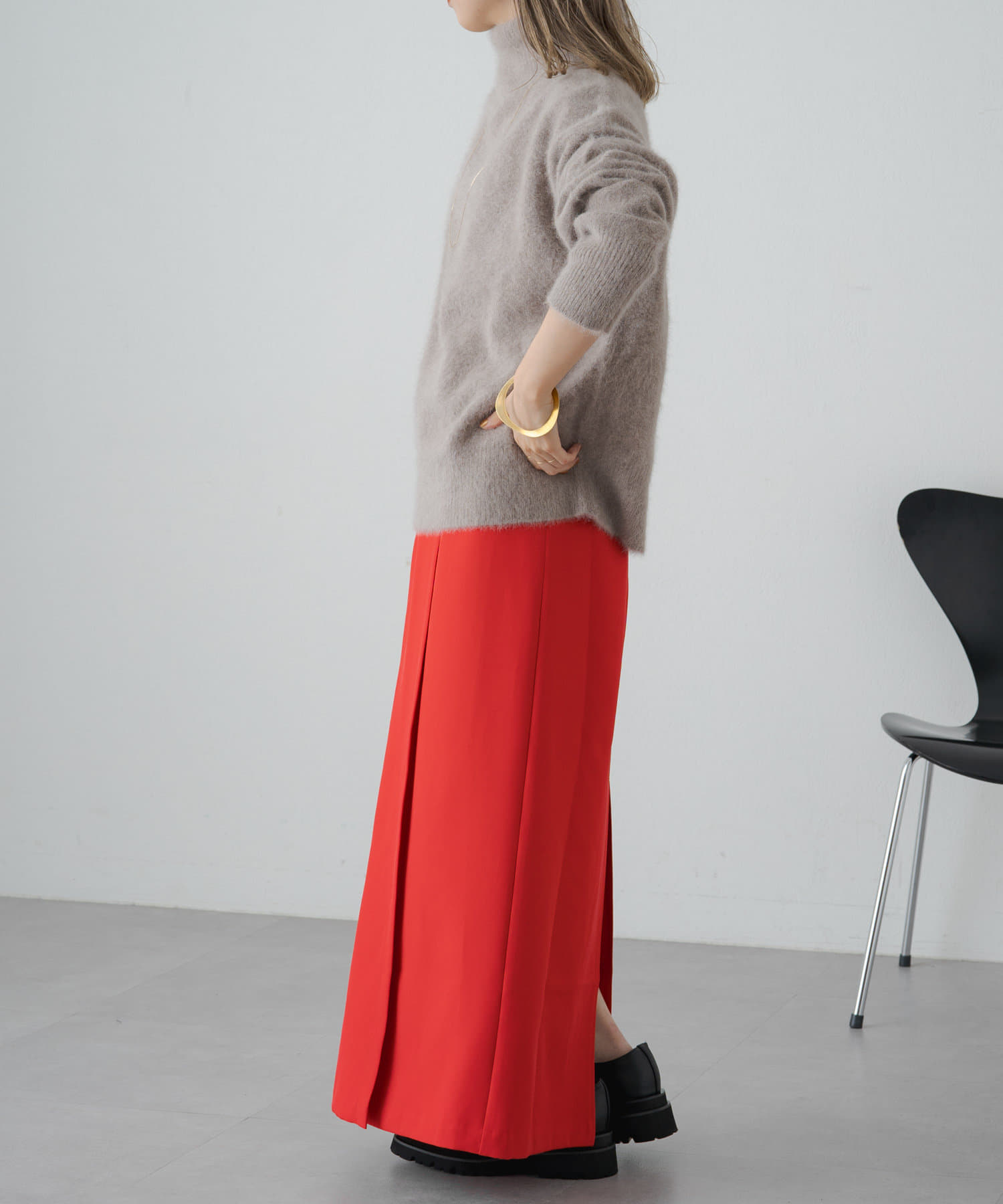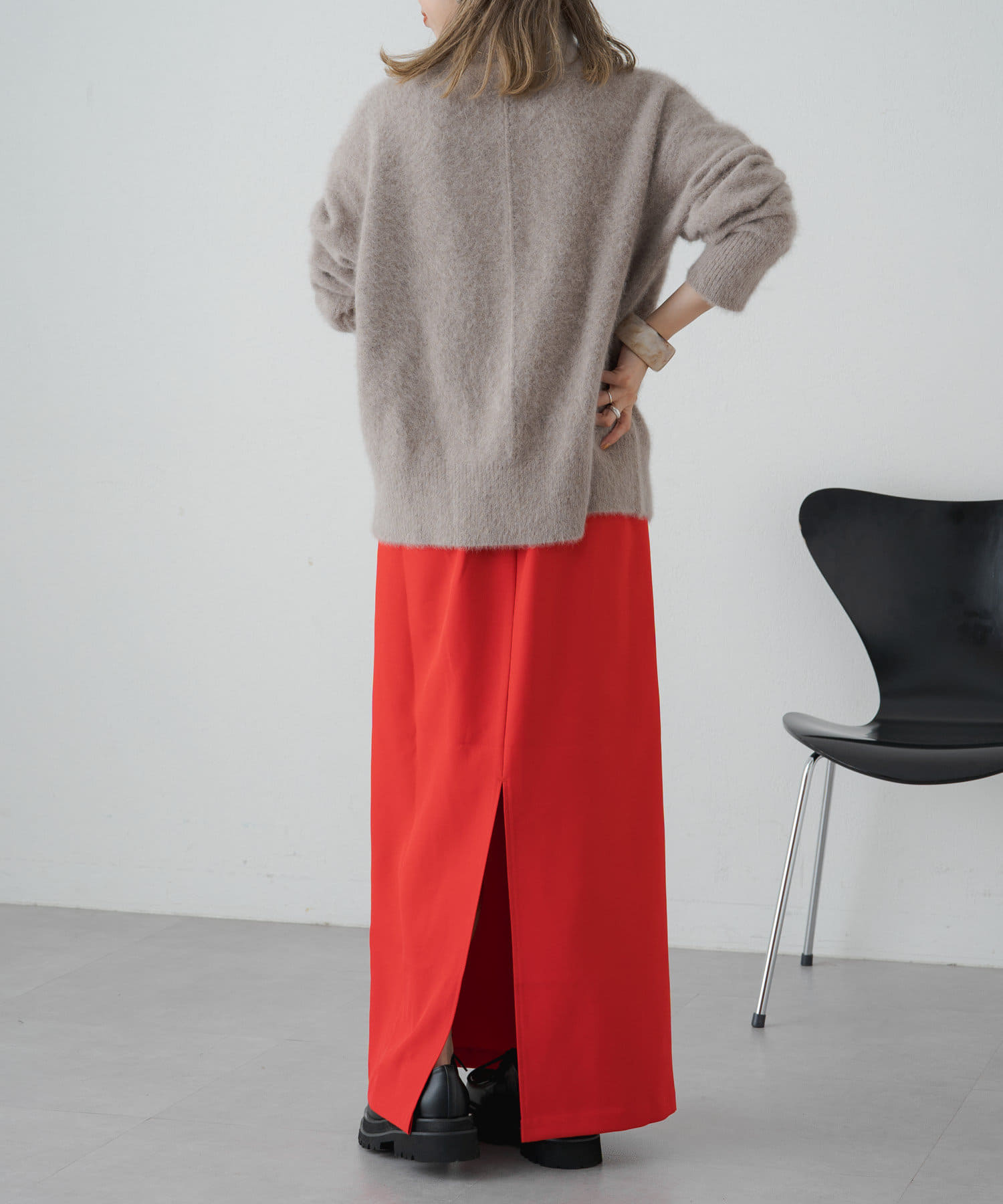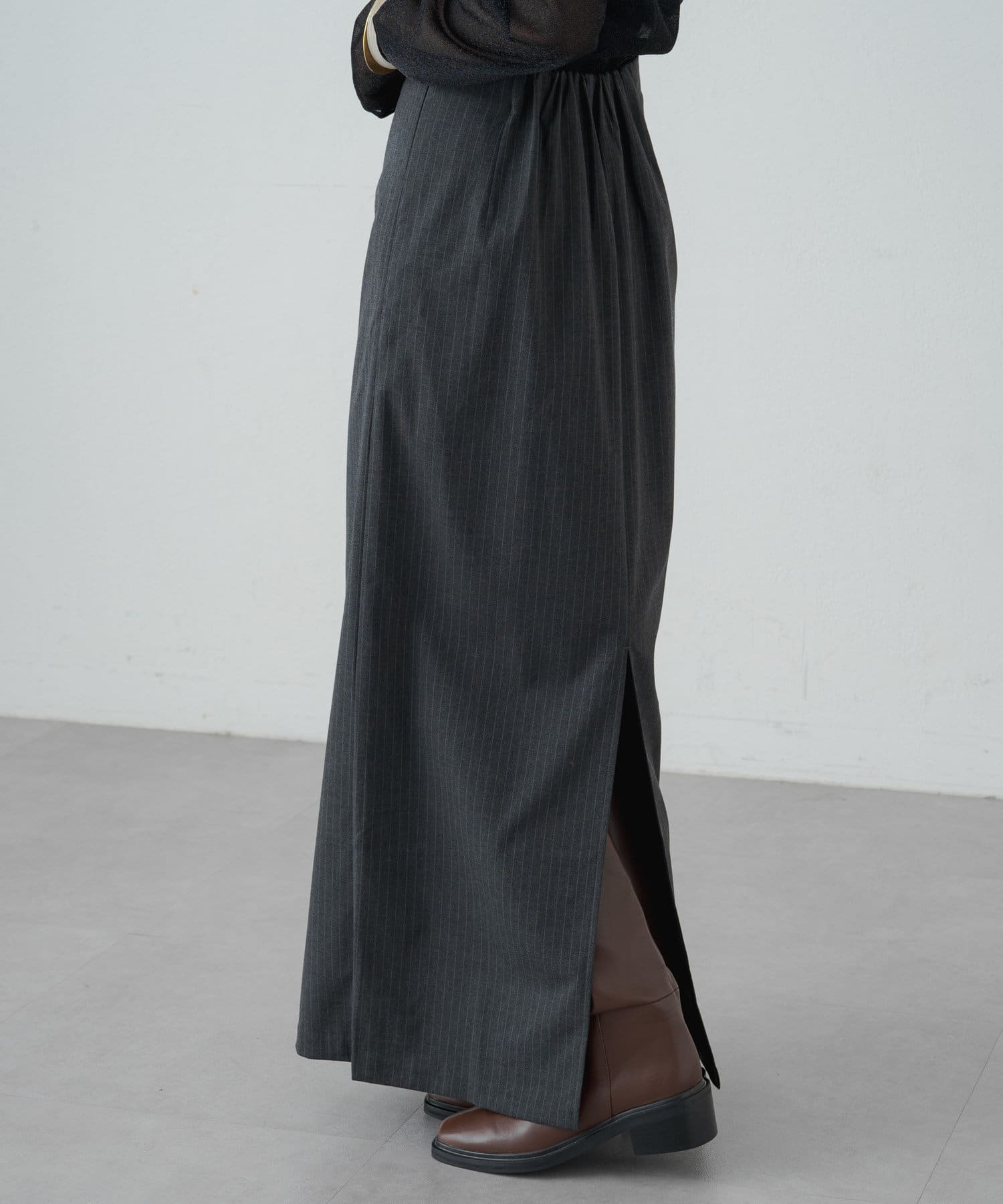 ・女性らしいIラインで、華奢見えするロングスカート。細身のシルエットながら後ろにスリットが入っているので脚捌きしやすく歩きやすさも◎