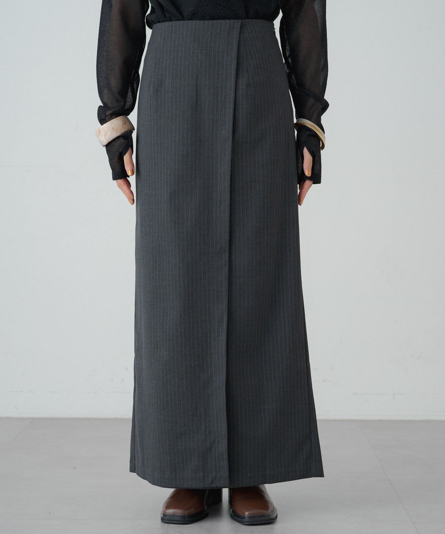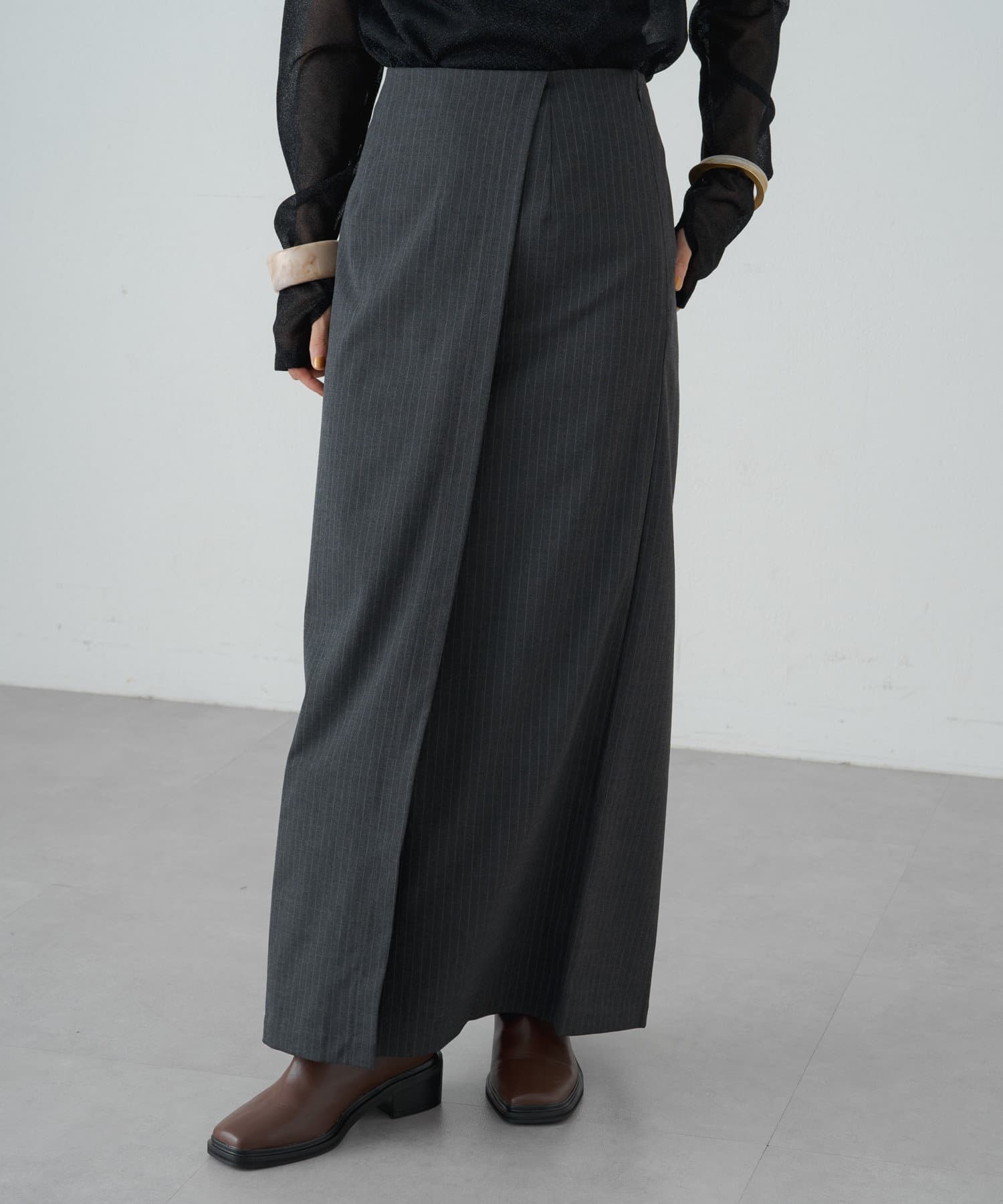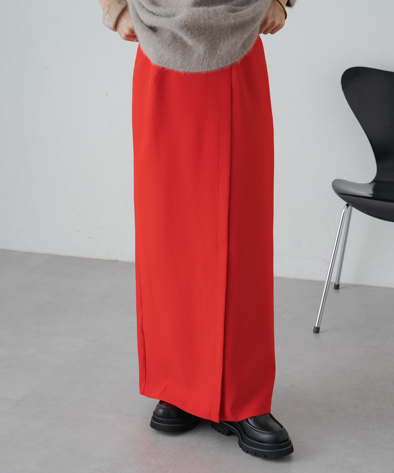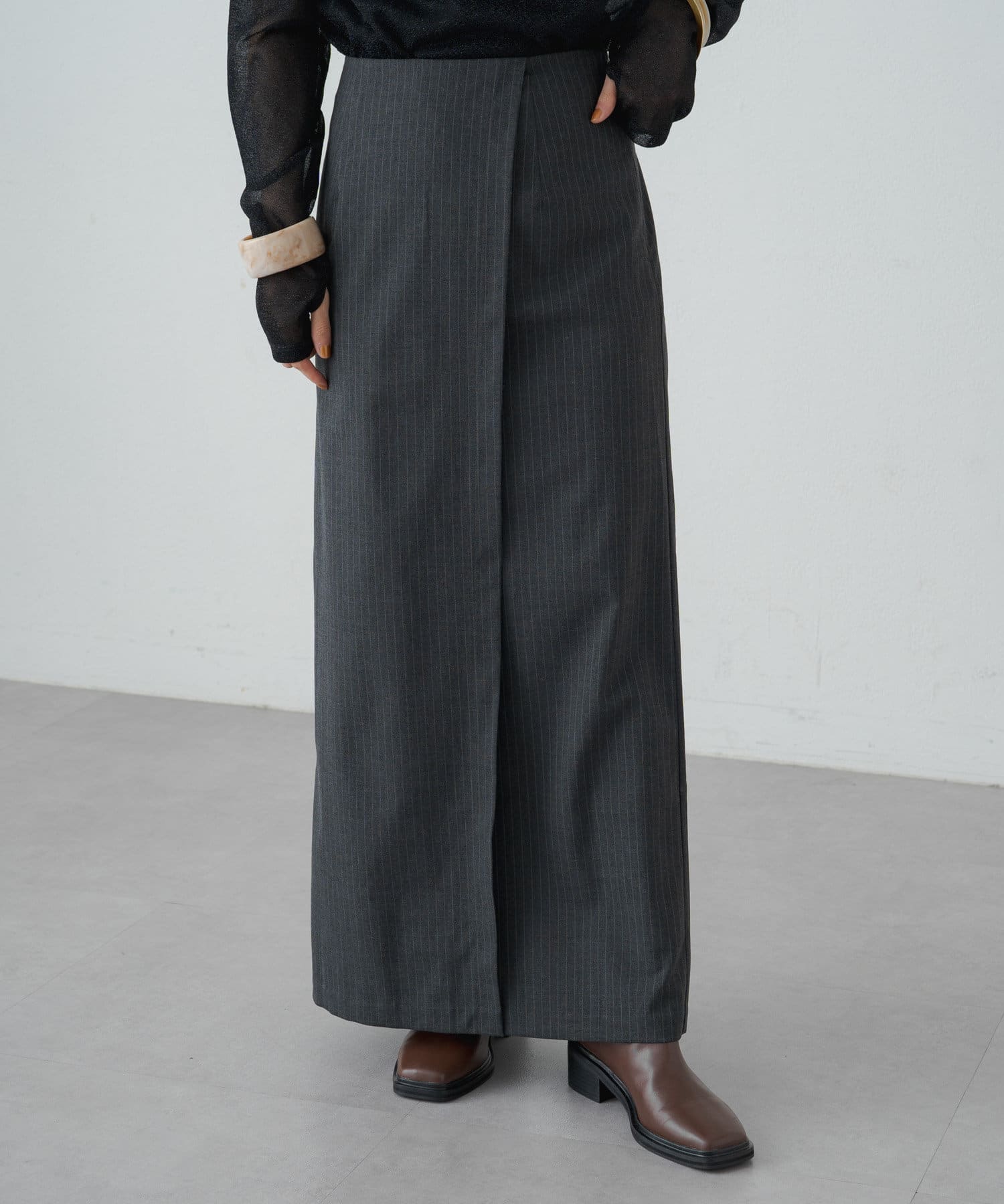 女性らしいIラインシルエットのラップロングスカート