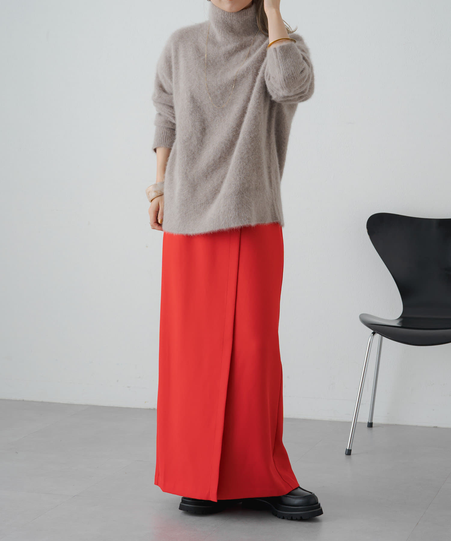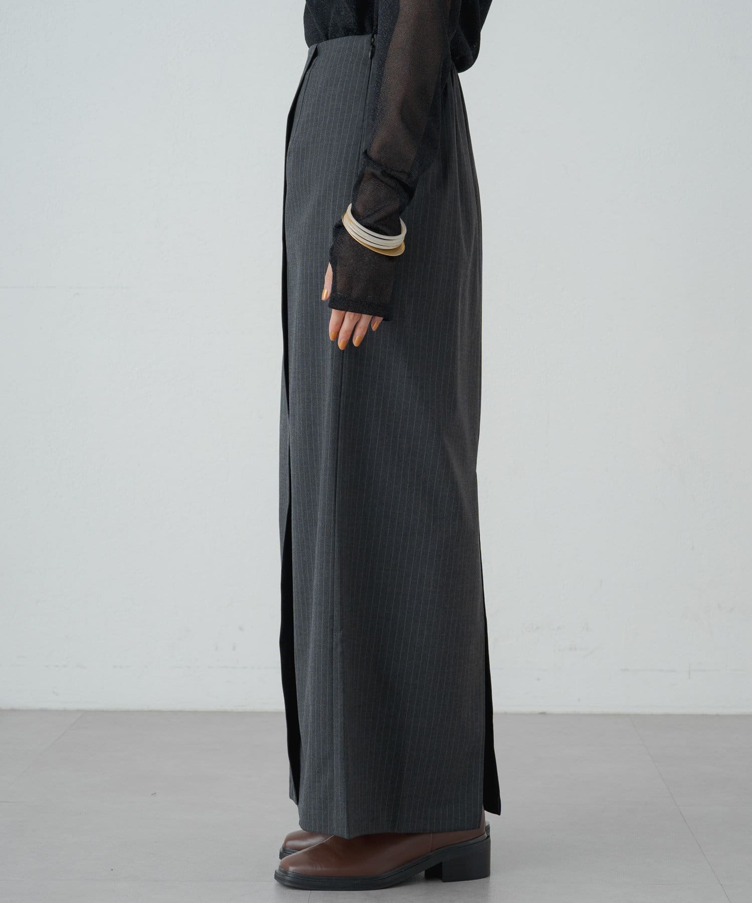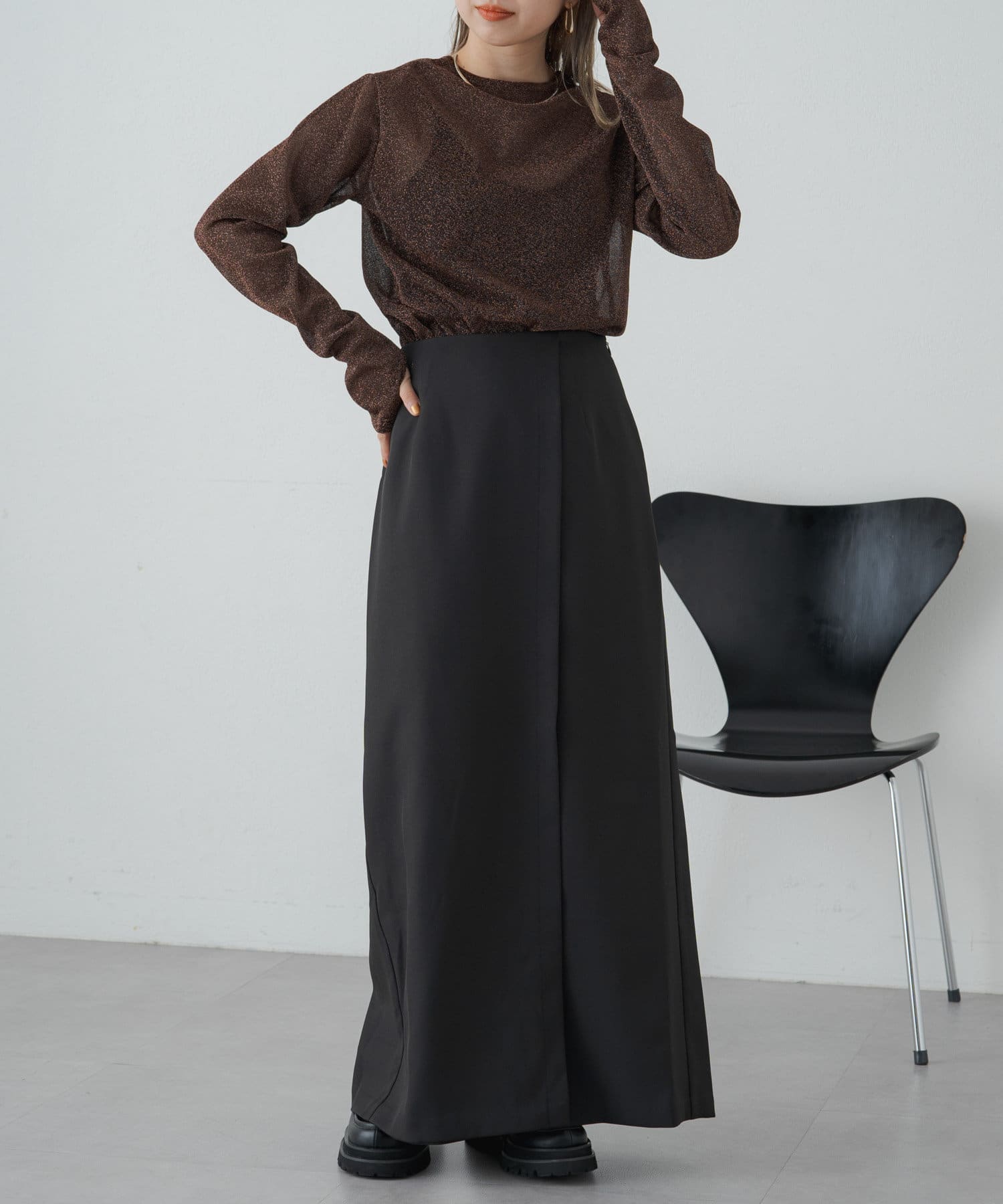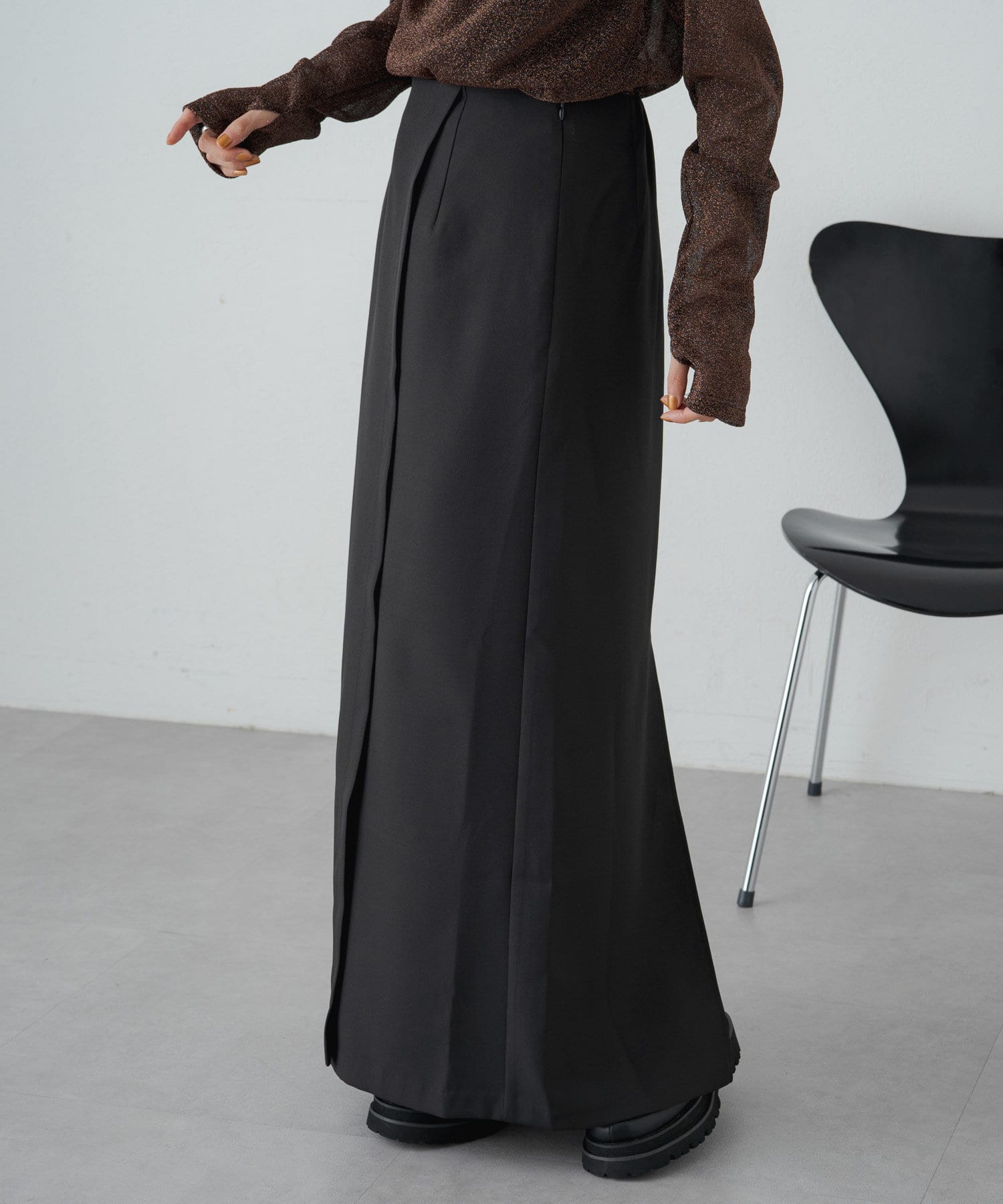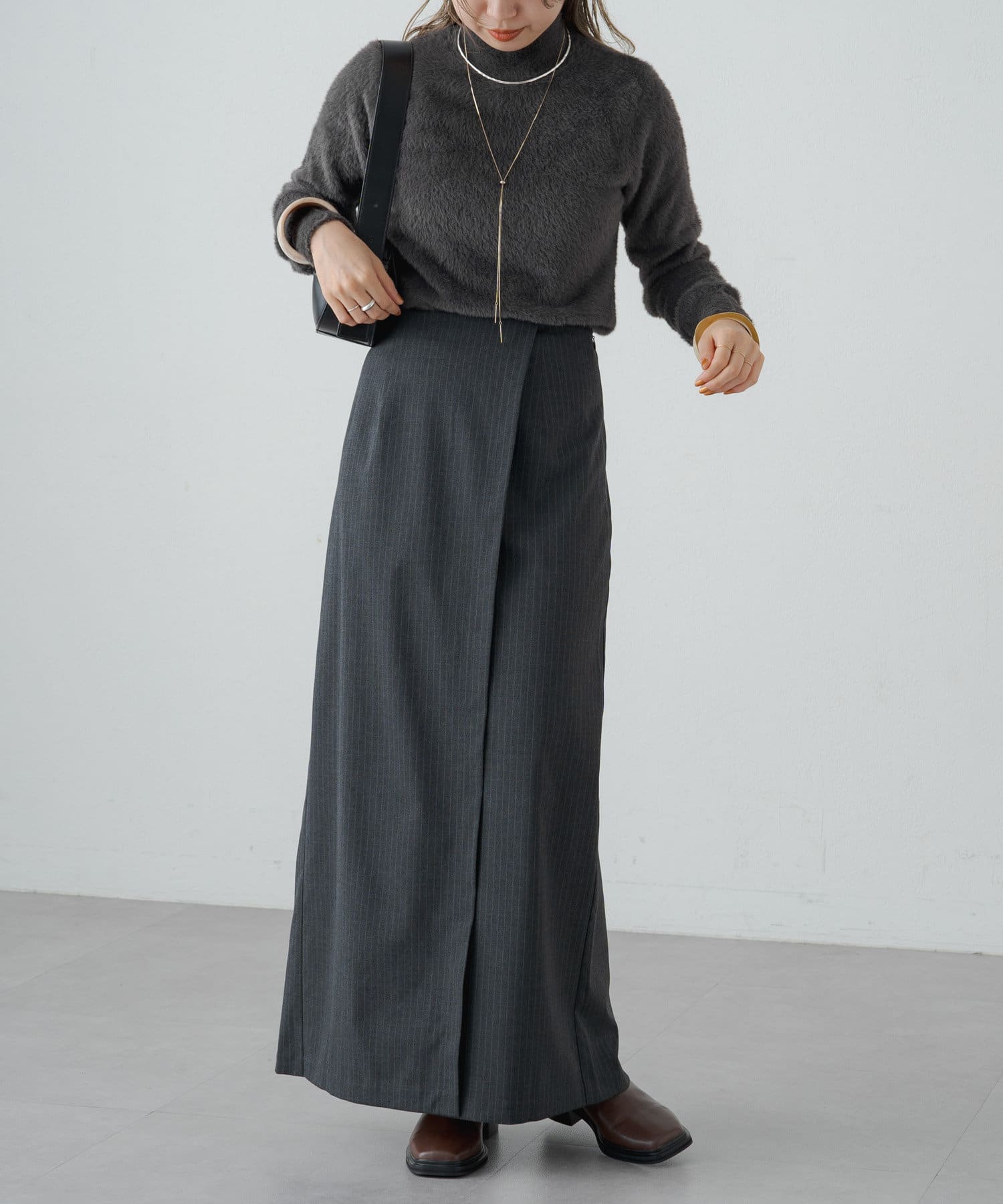 女性らしいIラインシルエットのラップロングスカート