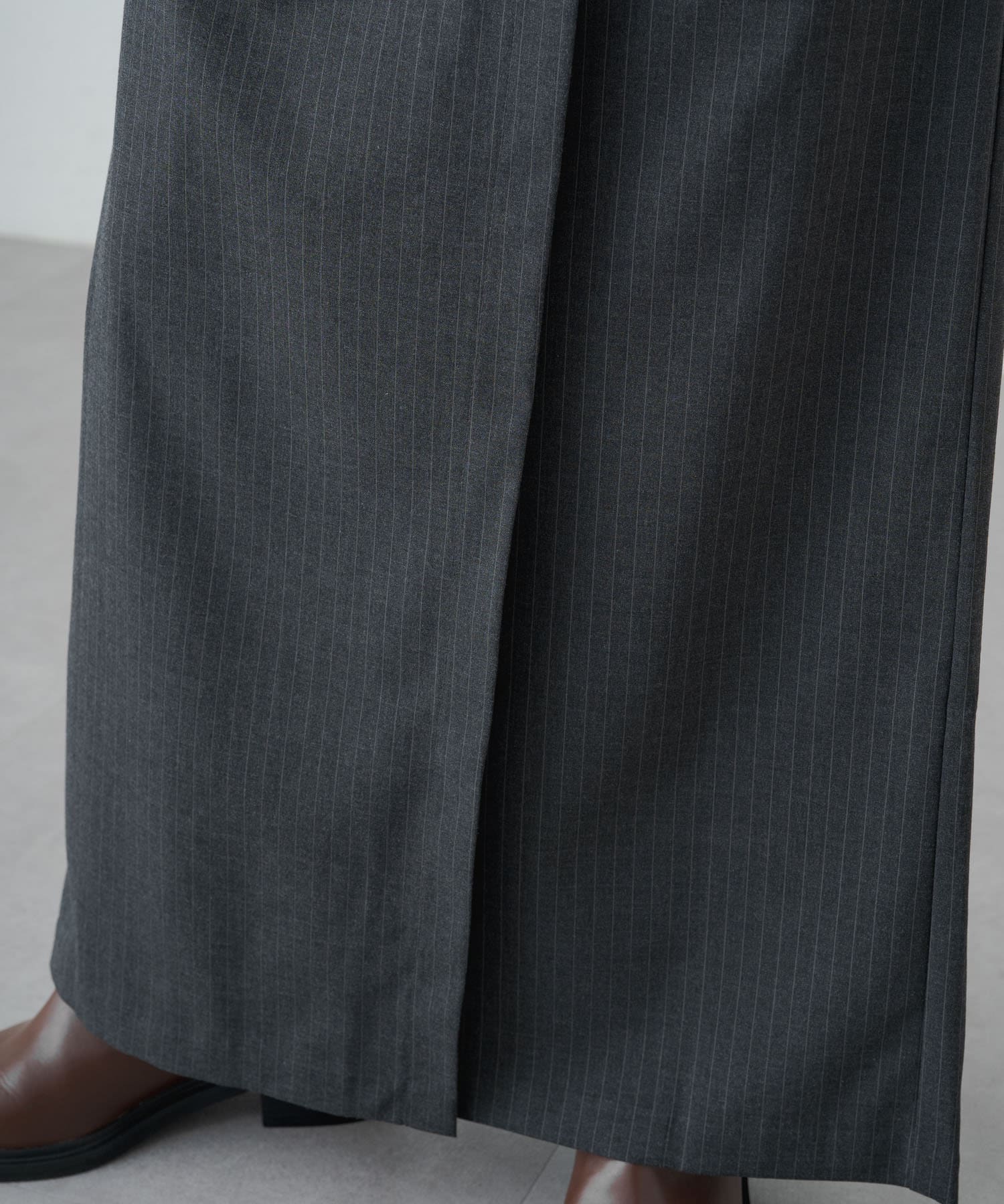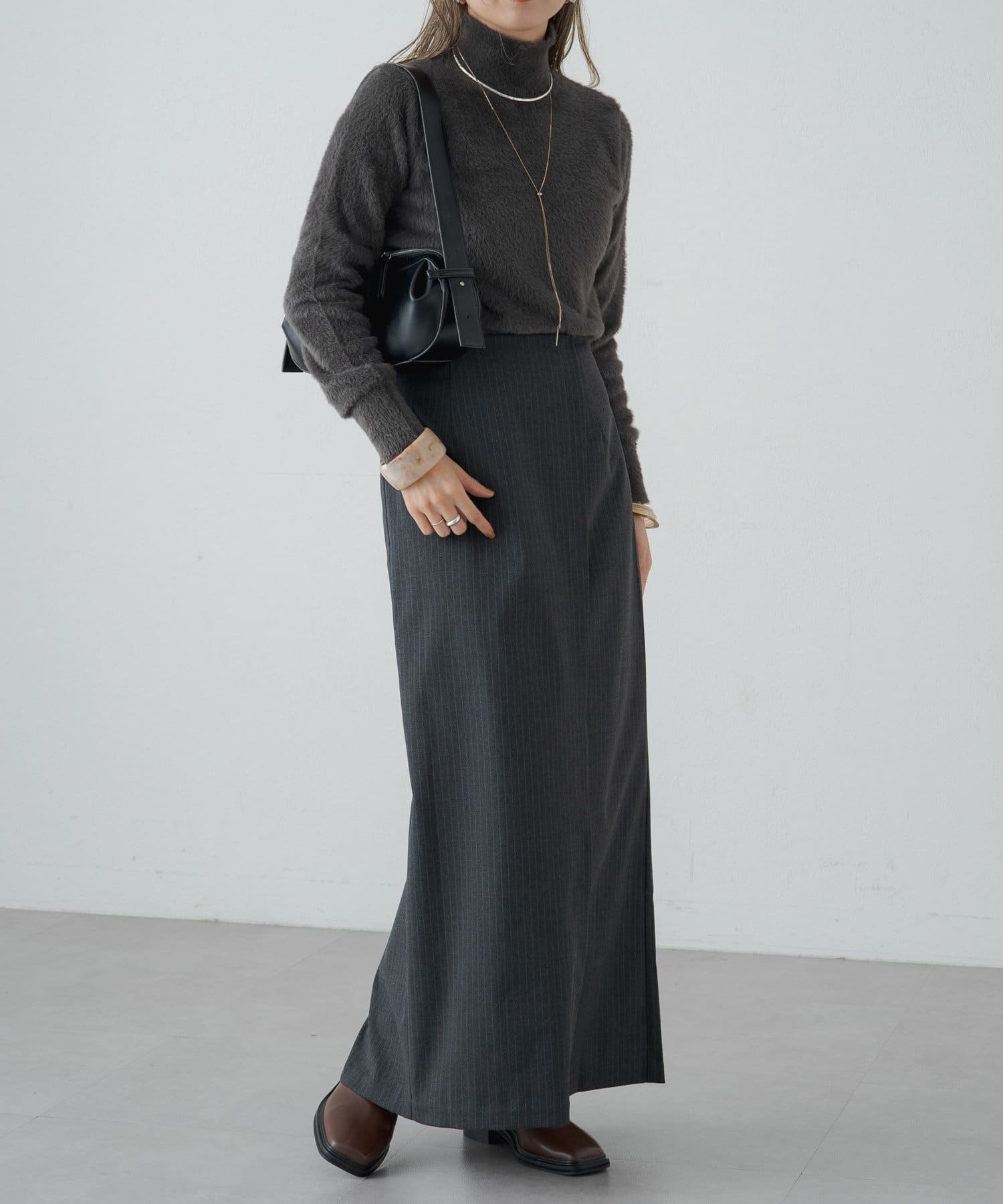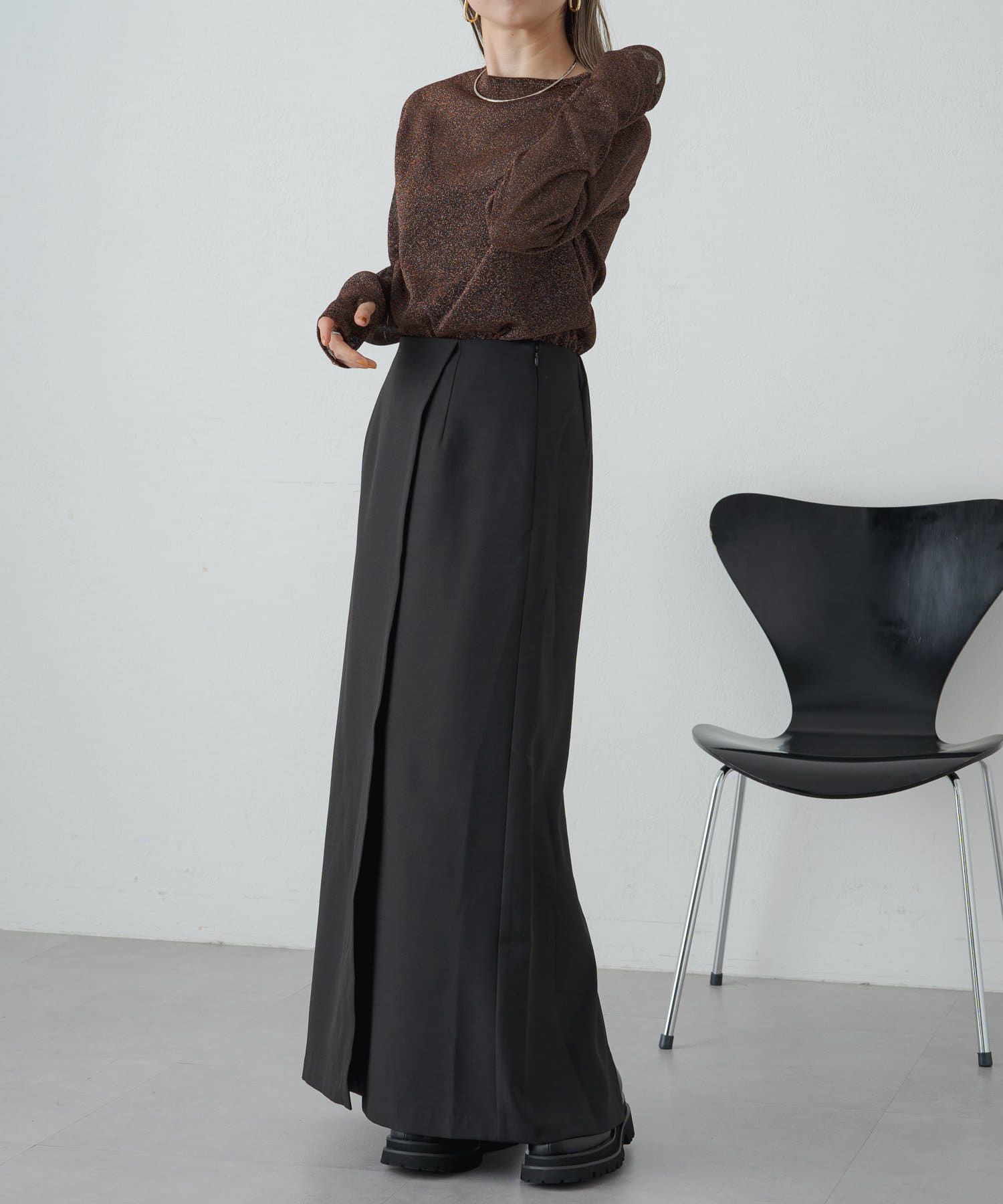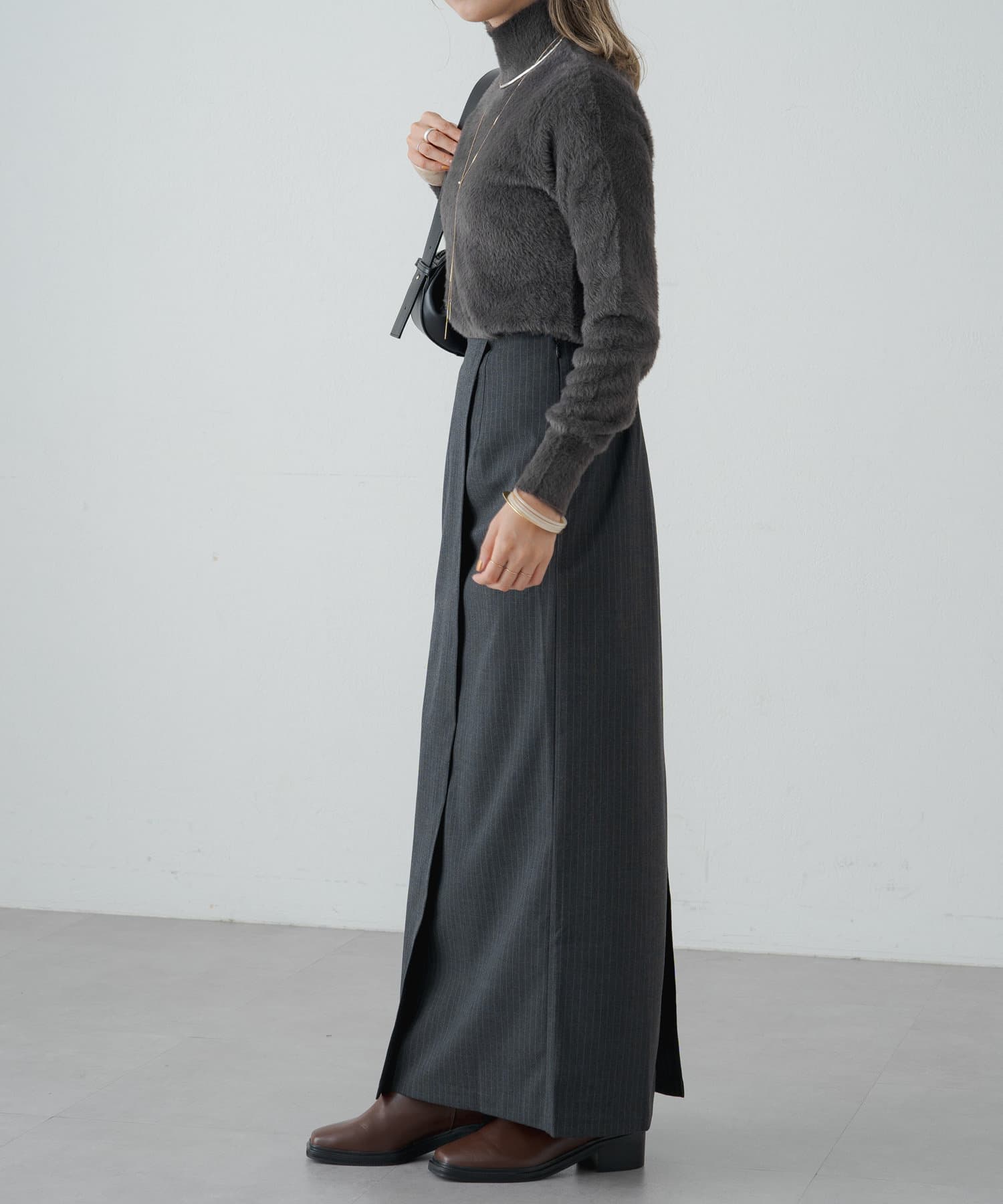 女性らしいIラインシルエットのラップロングスカート