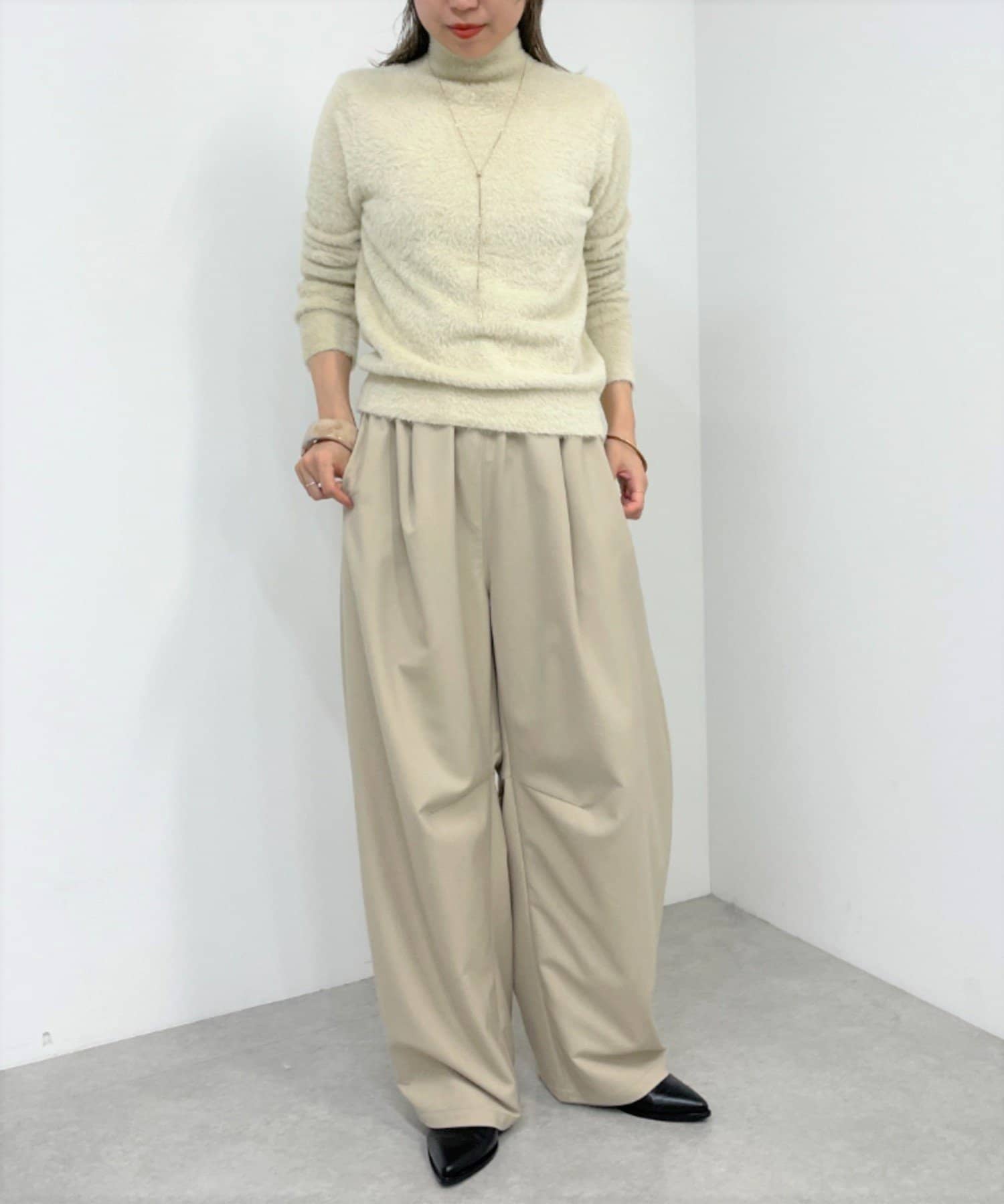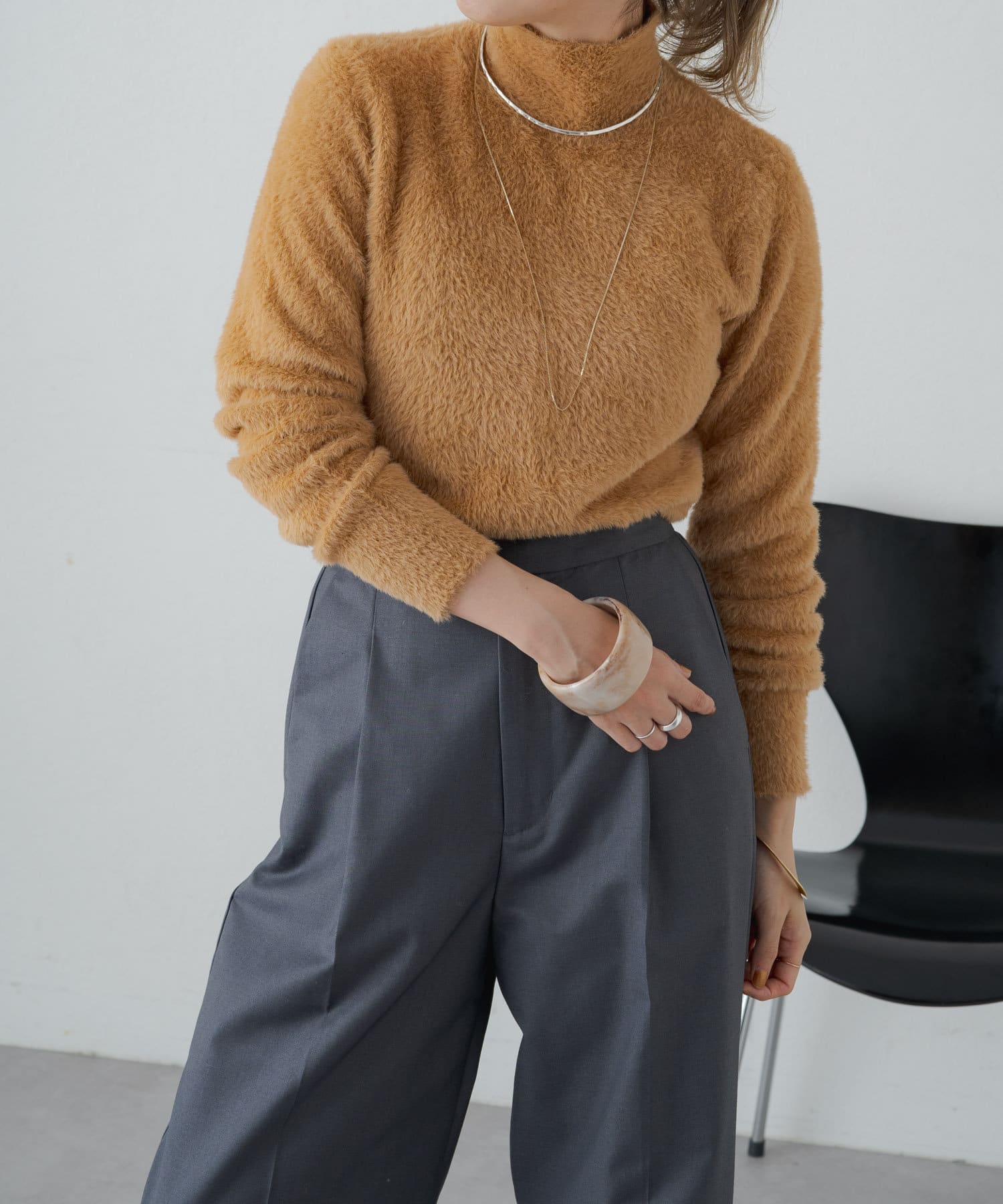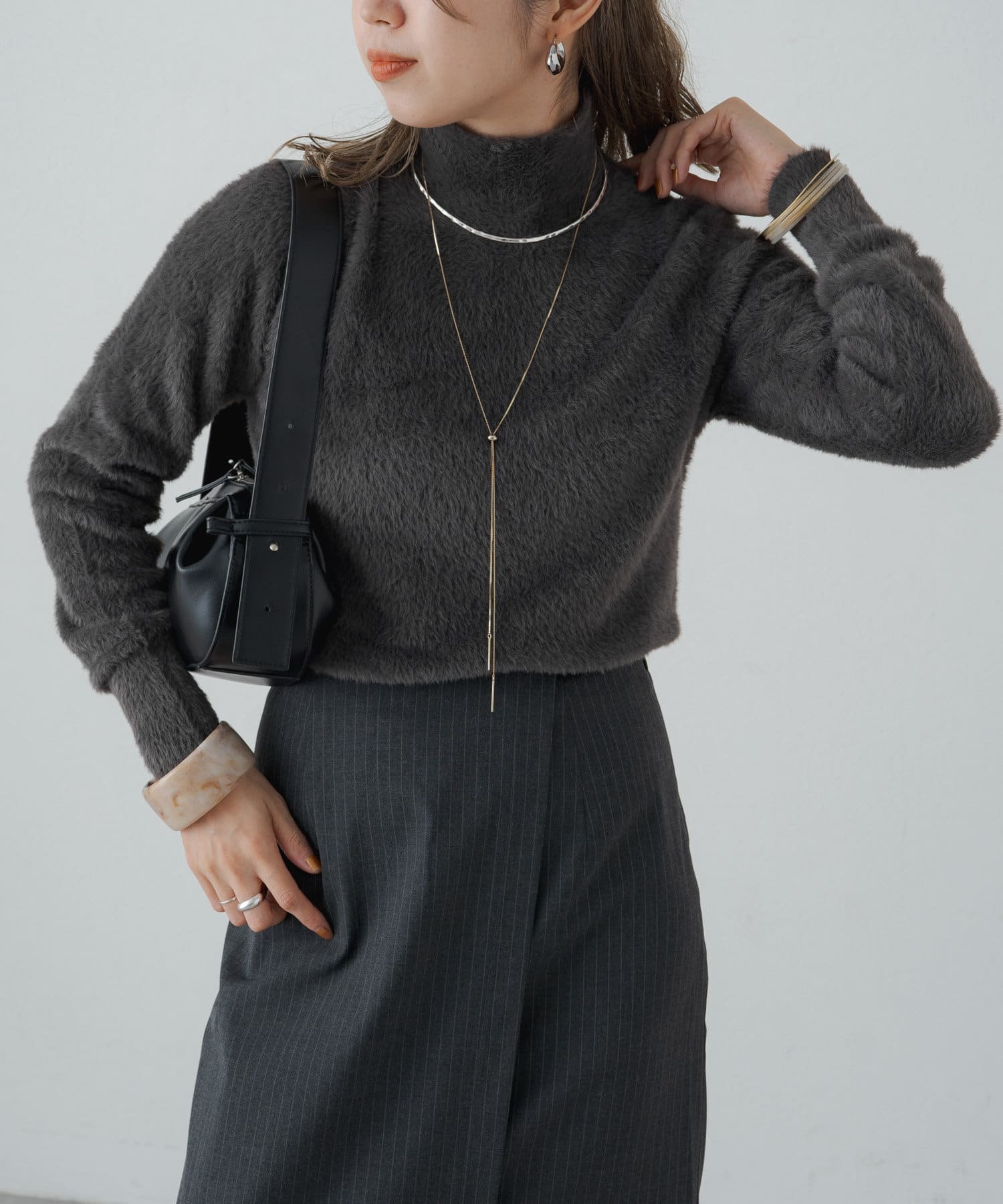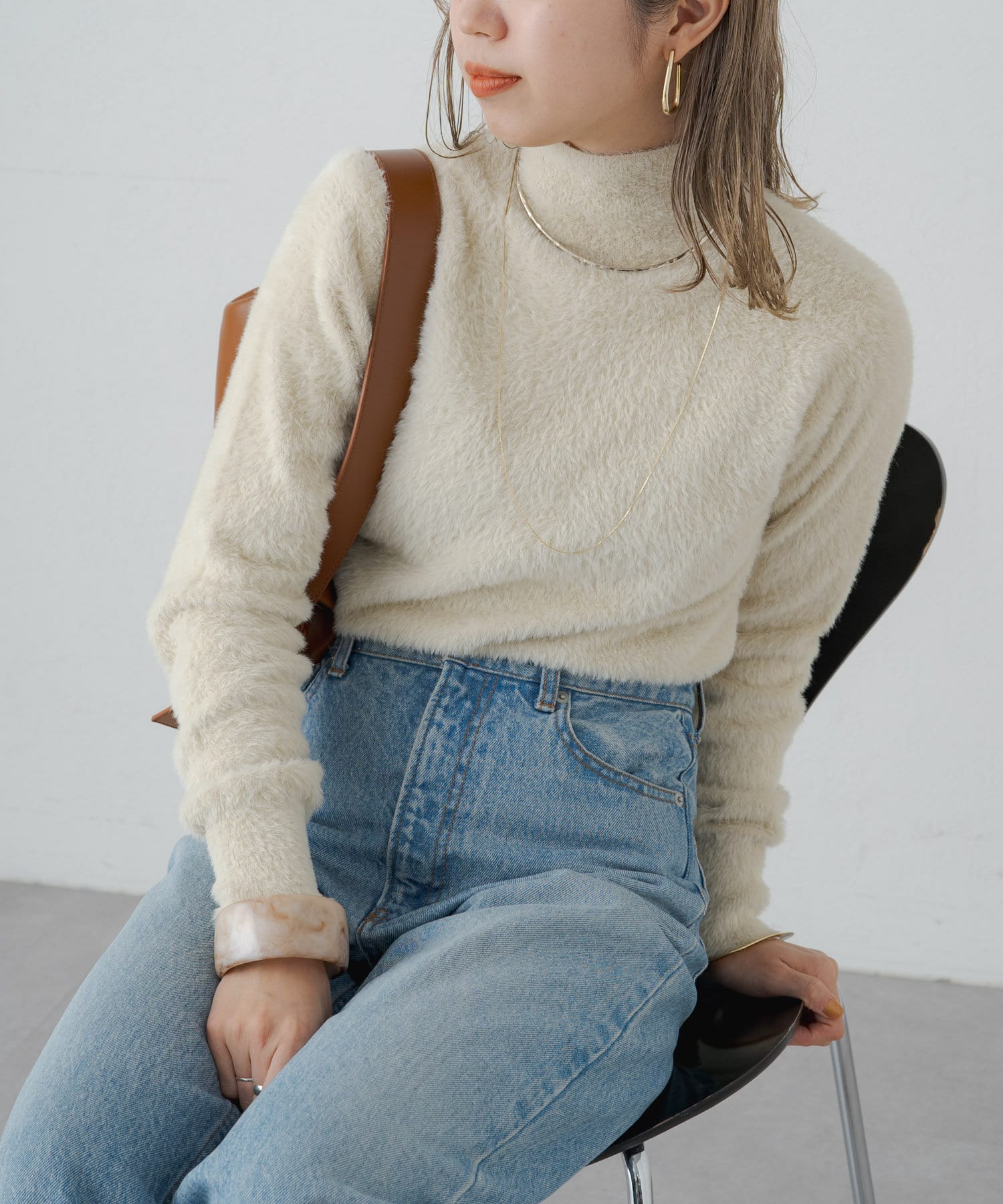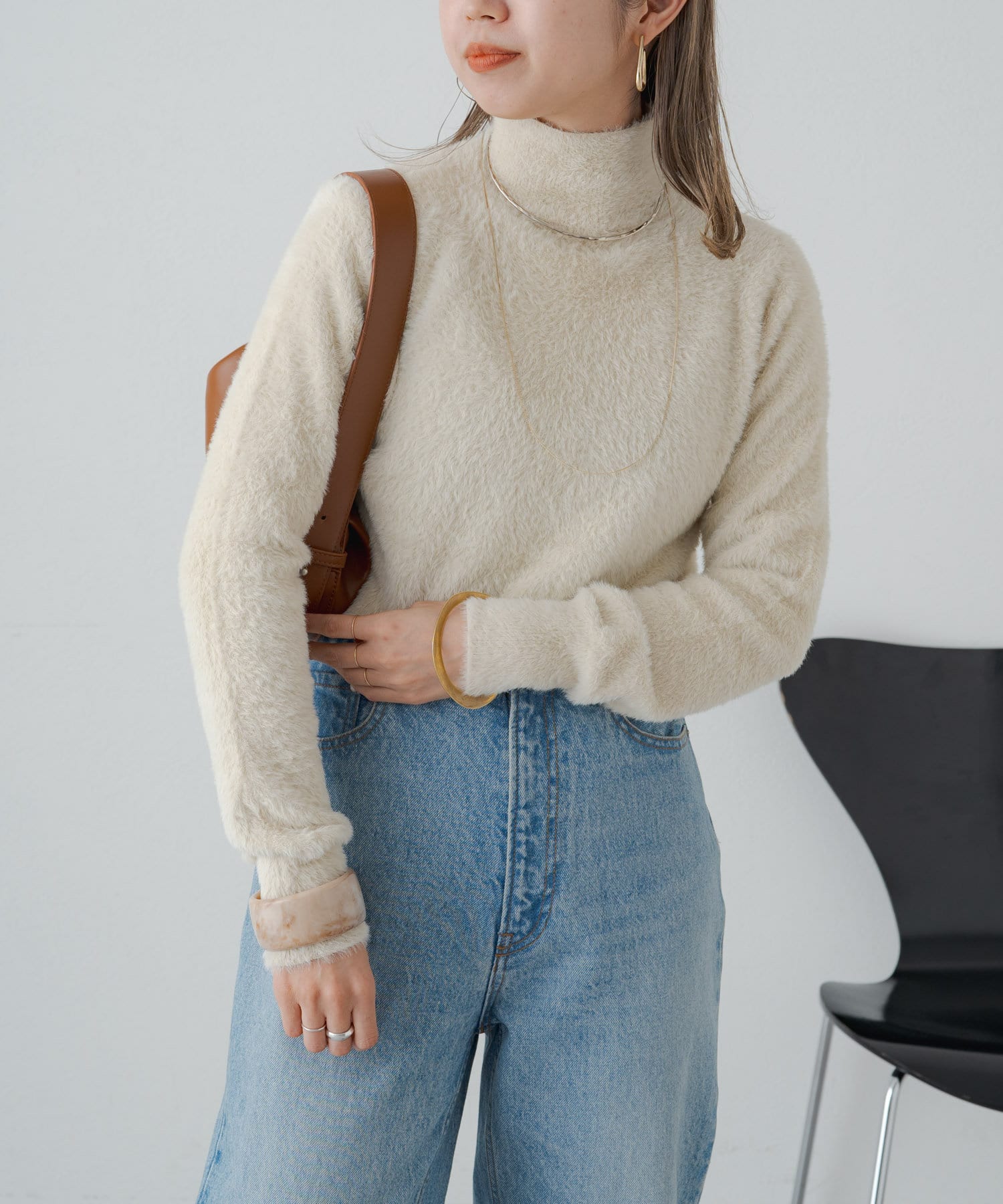 ・冬らしいふわふわなシャギー素材がコーディネートのポイントになり、一枚で決まるタートルニット