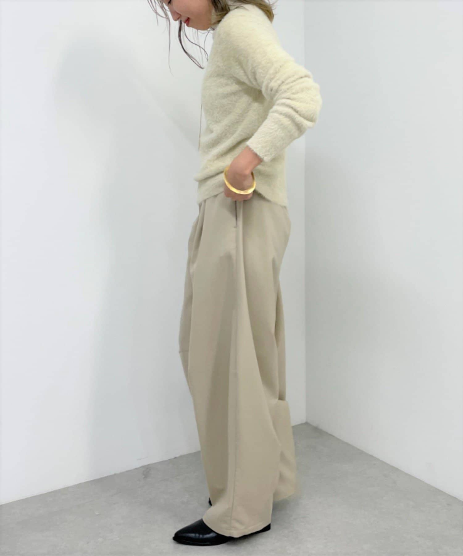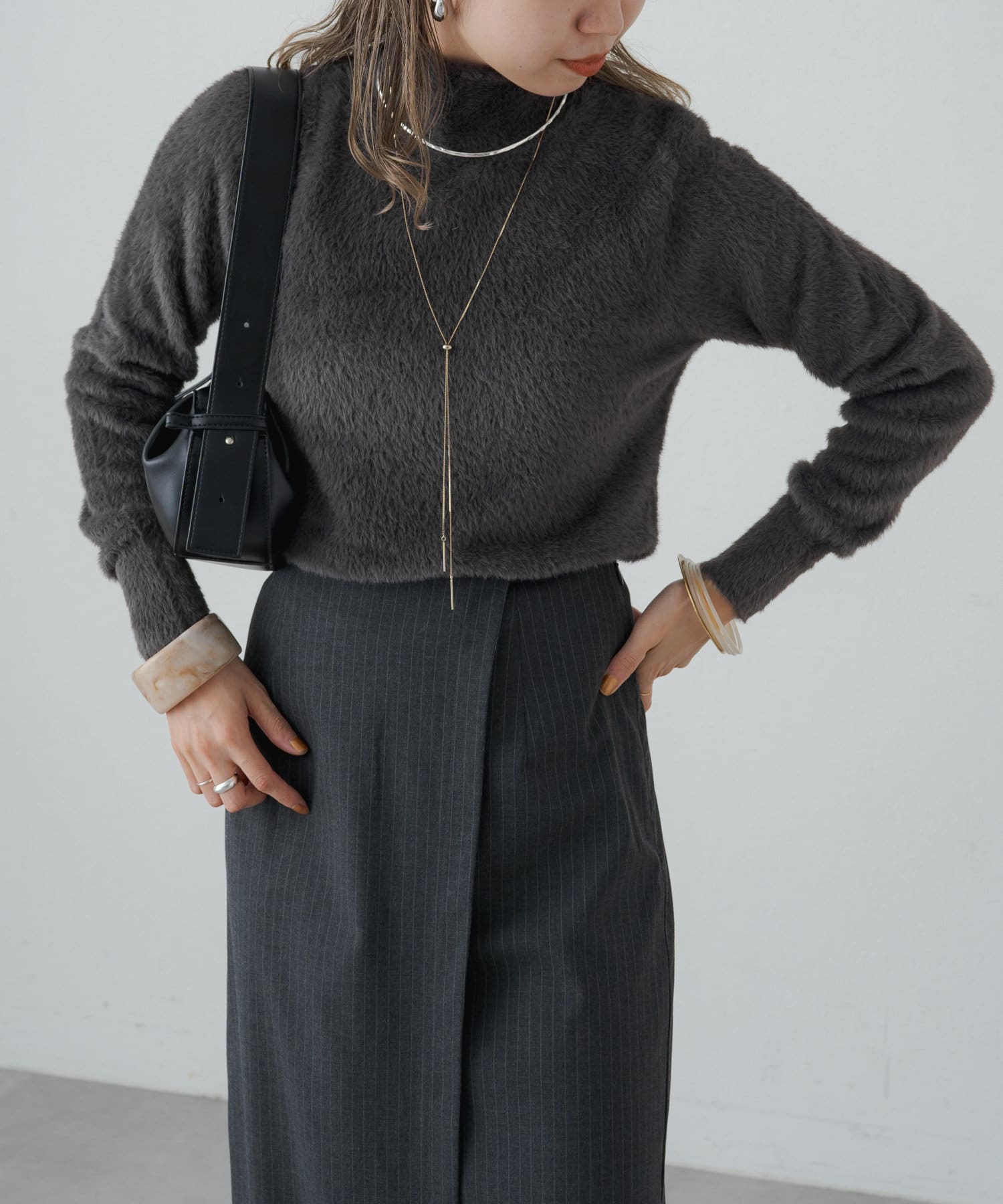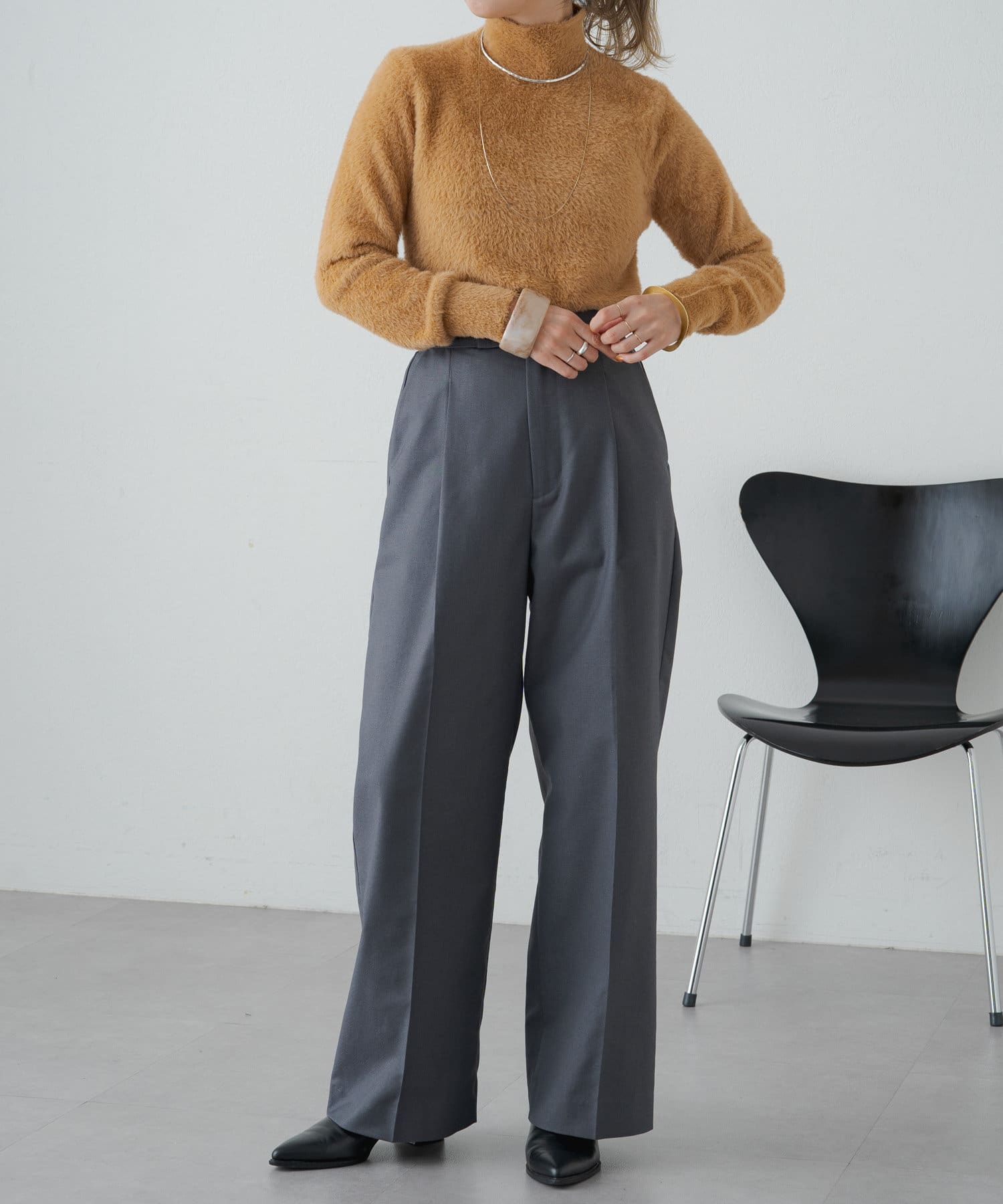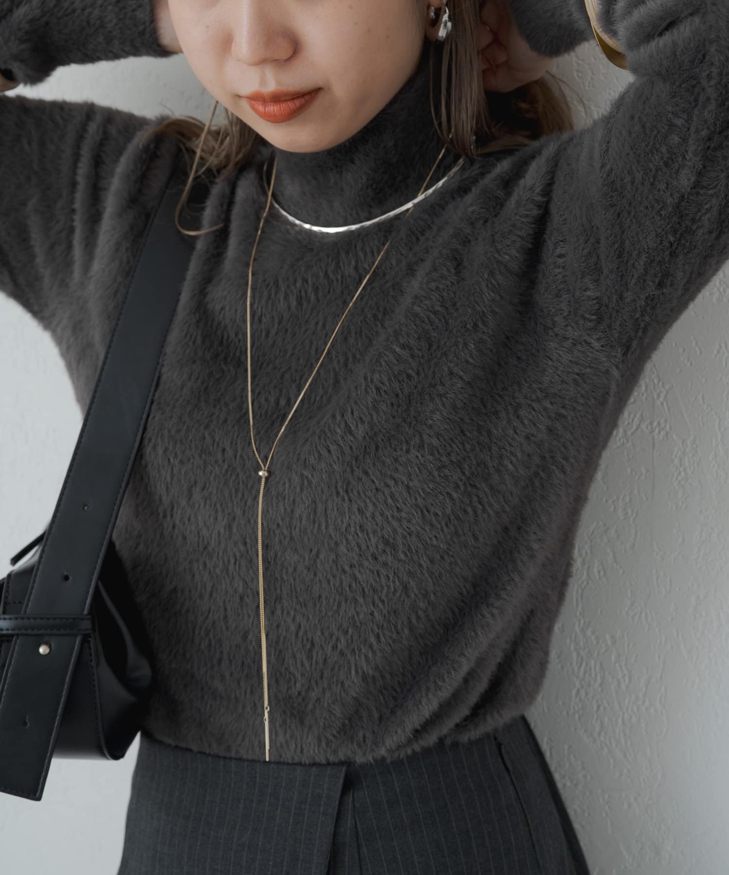 ・冬らしいふわふわなシャギー素材がコーディネートのポイントになり、一枚で決まるタートルニット