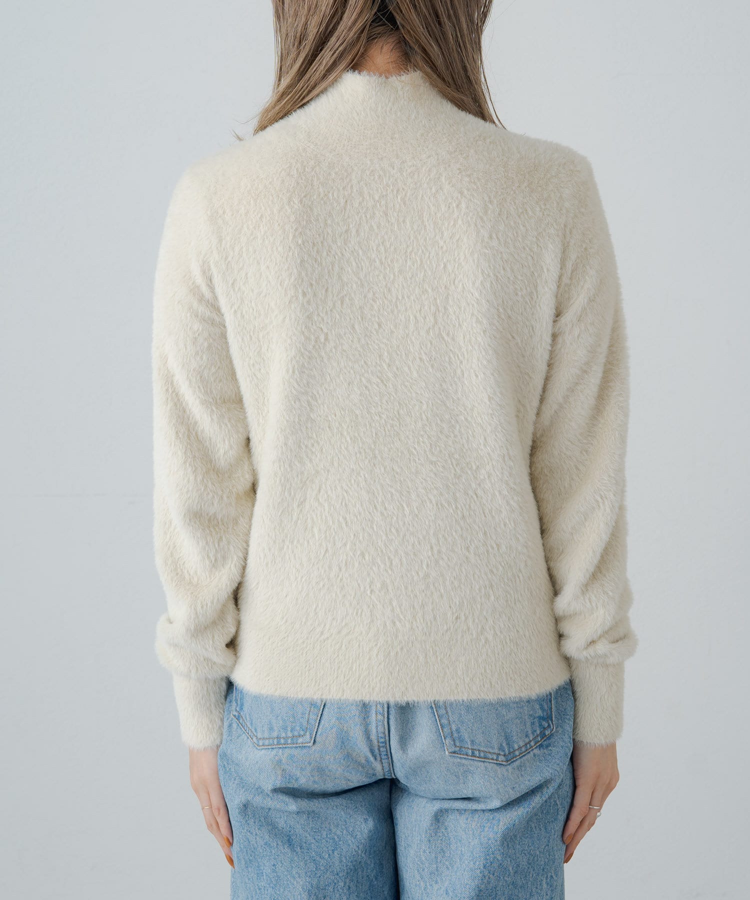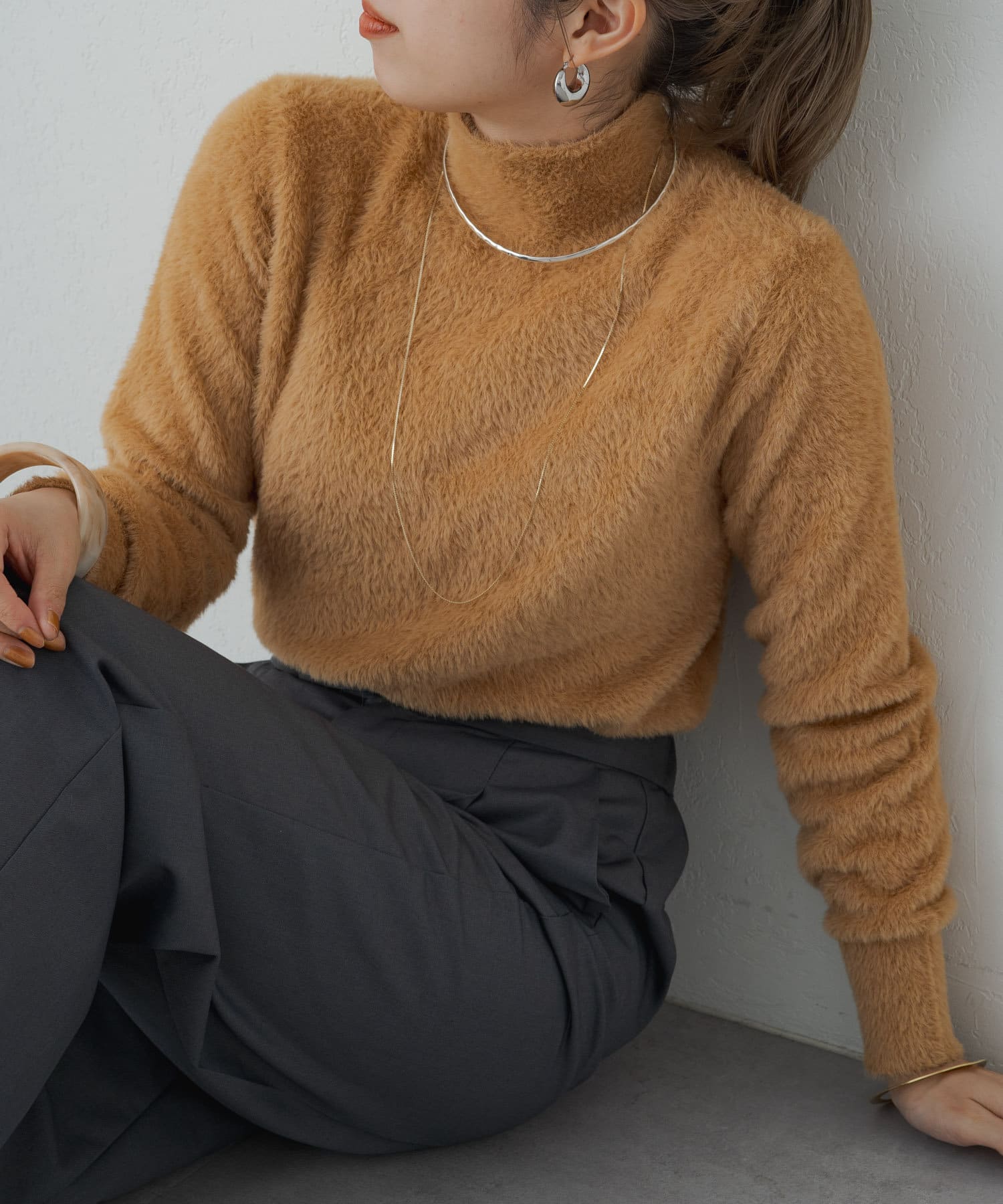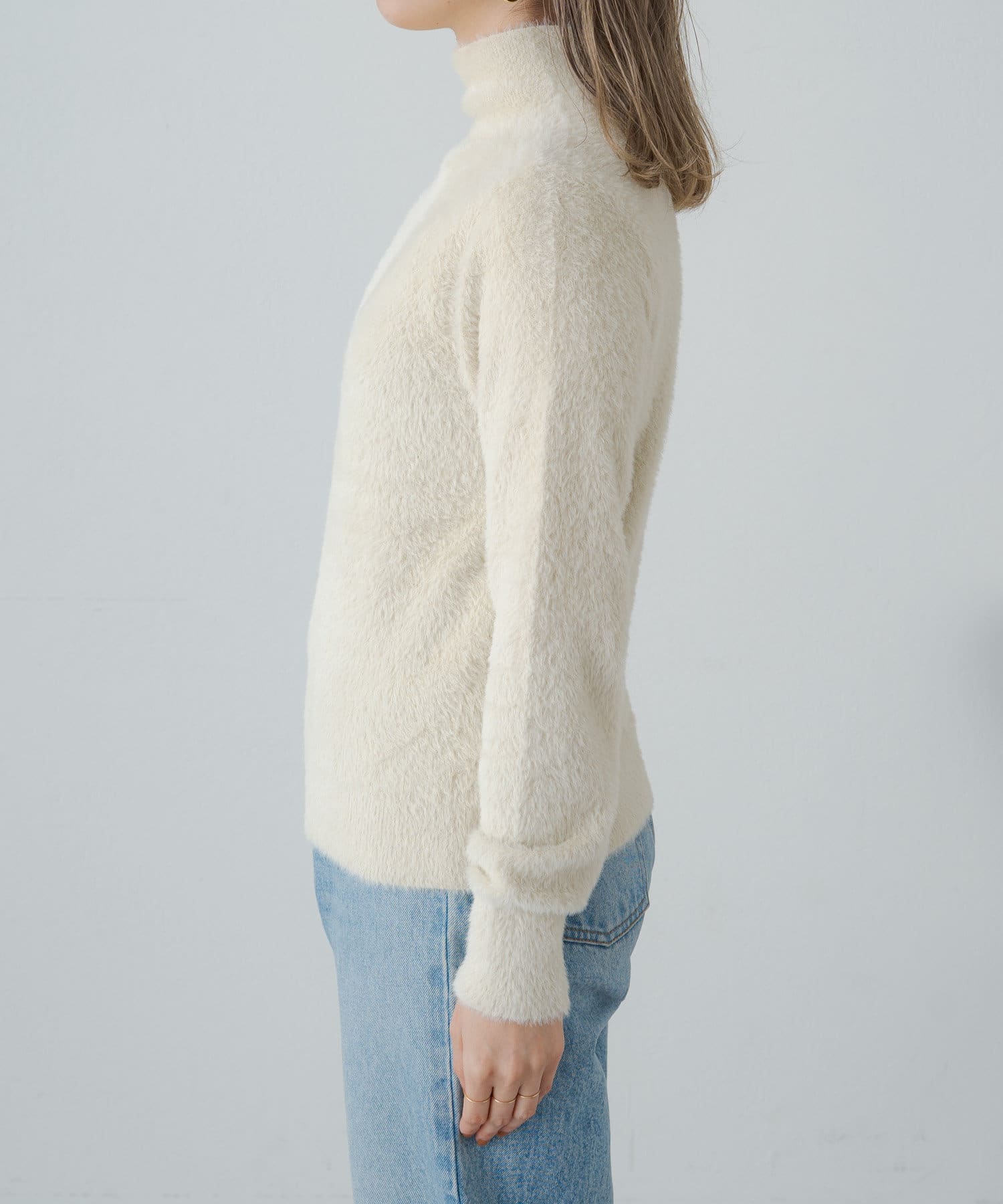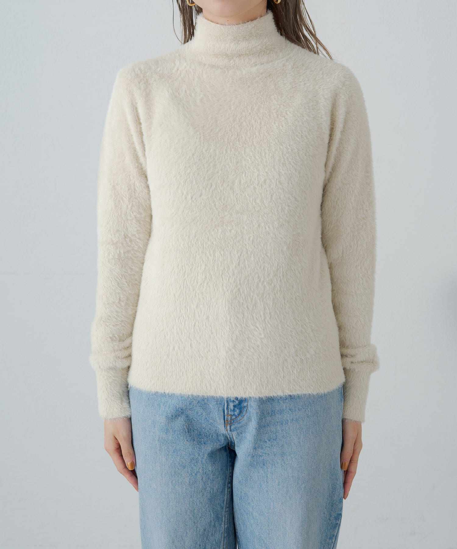 ふわふわのシャギー素材がポイントのャギータートルニット