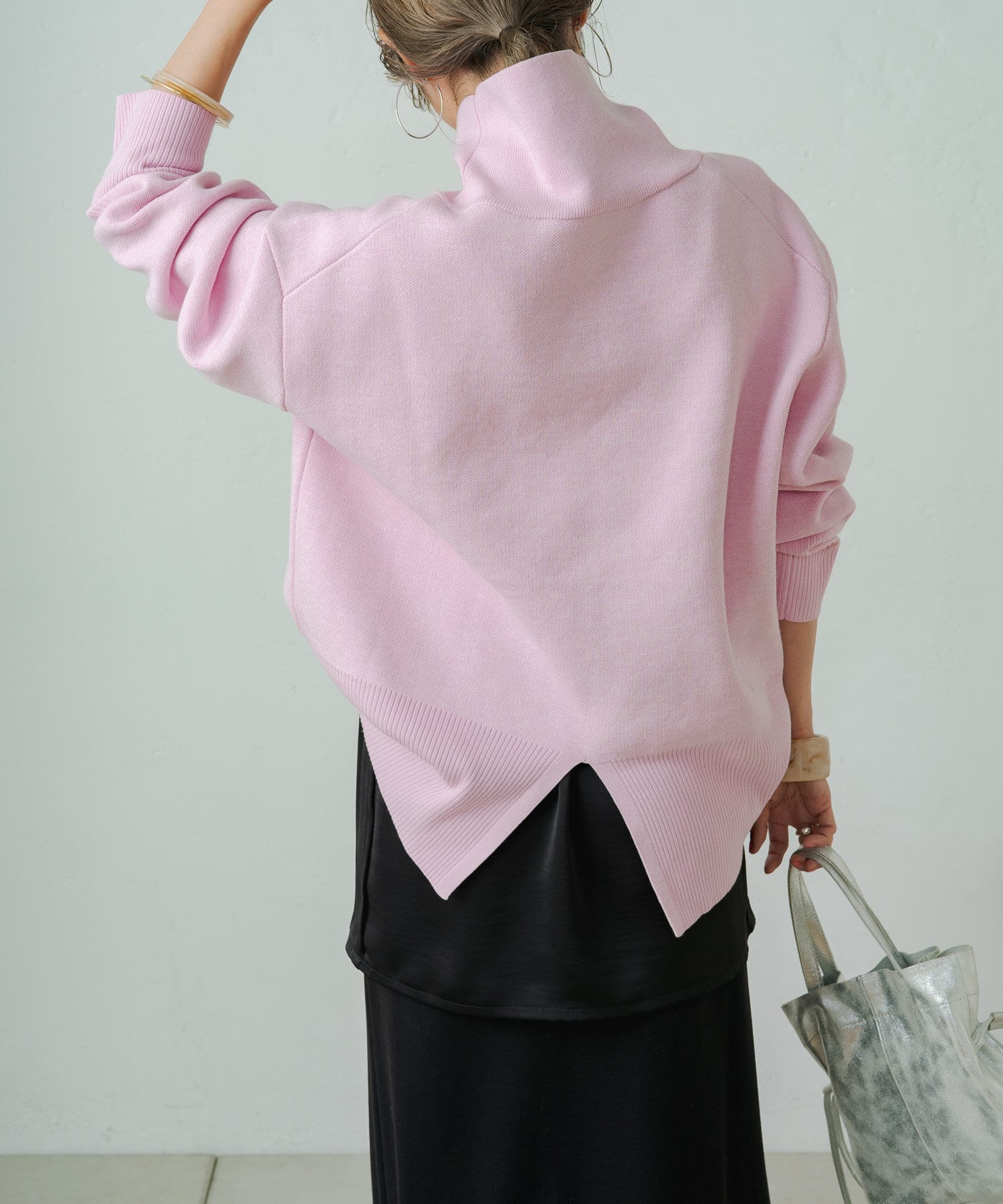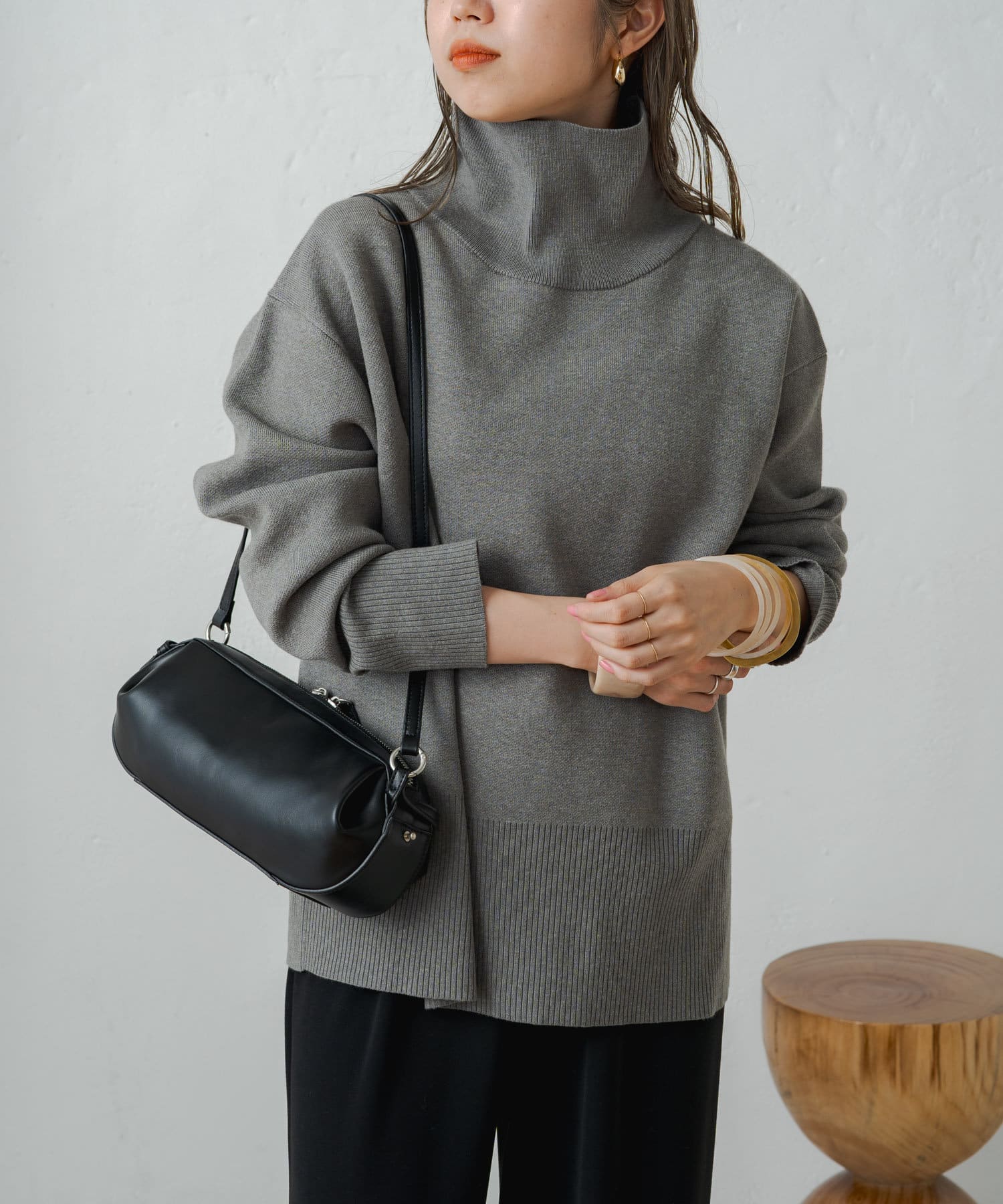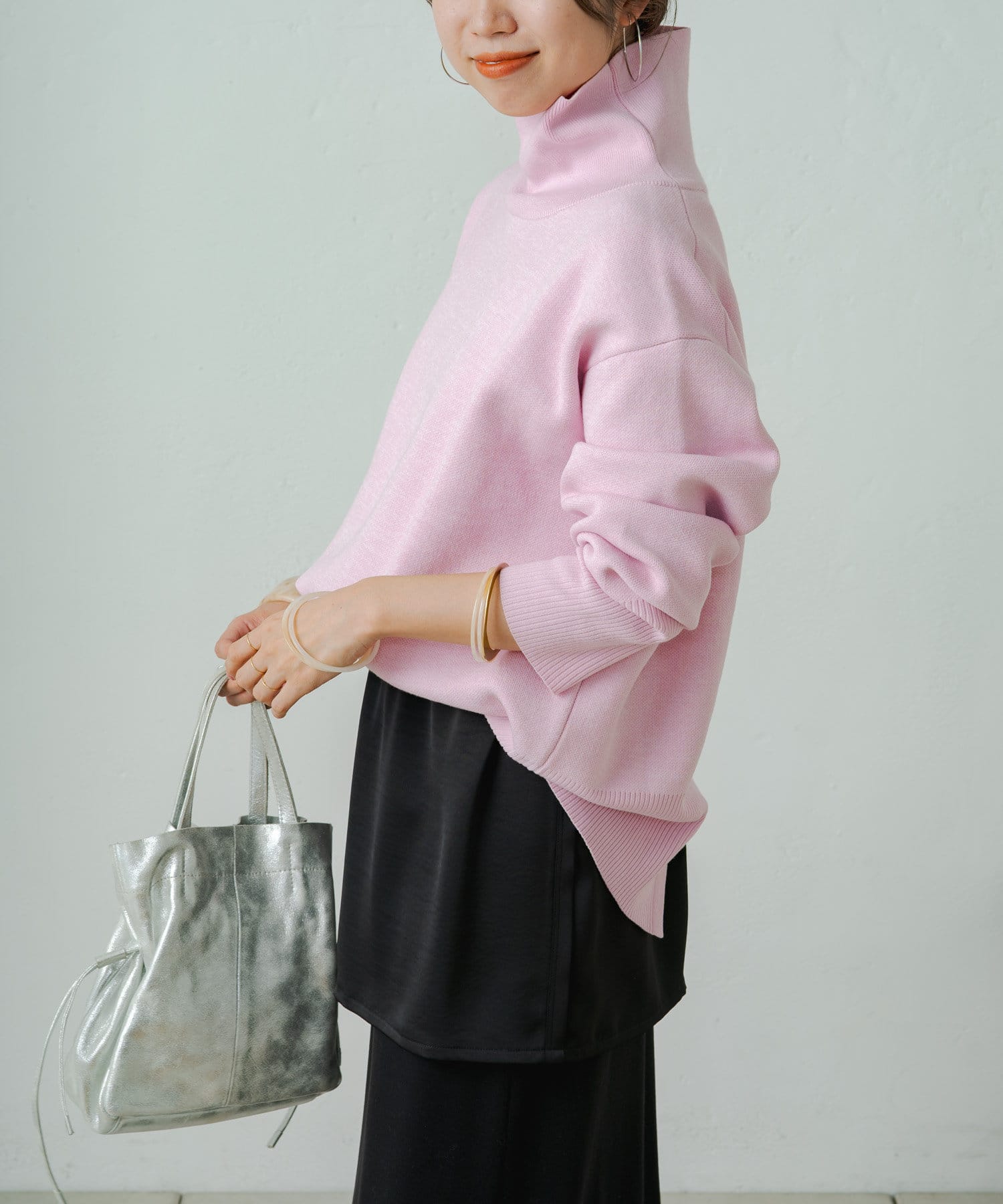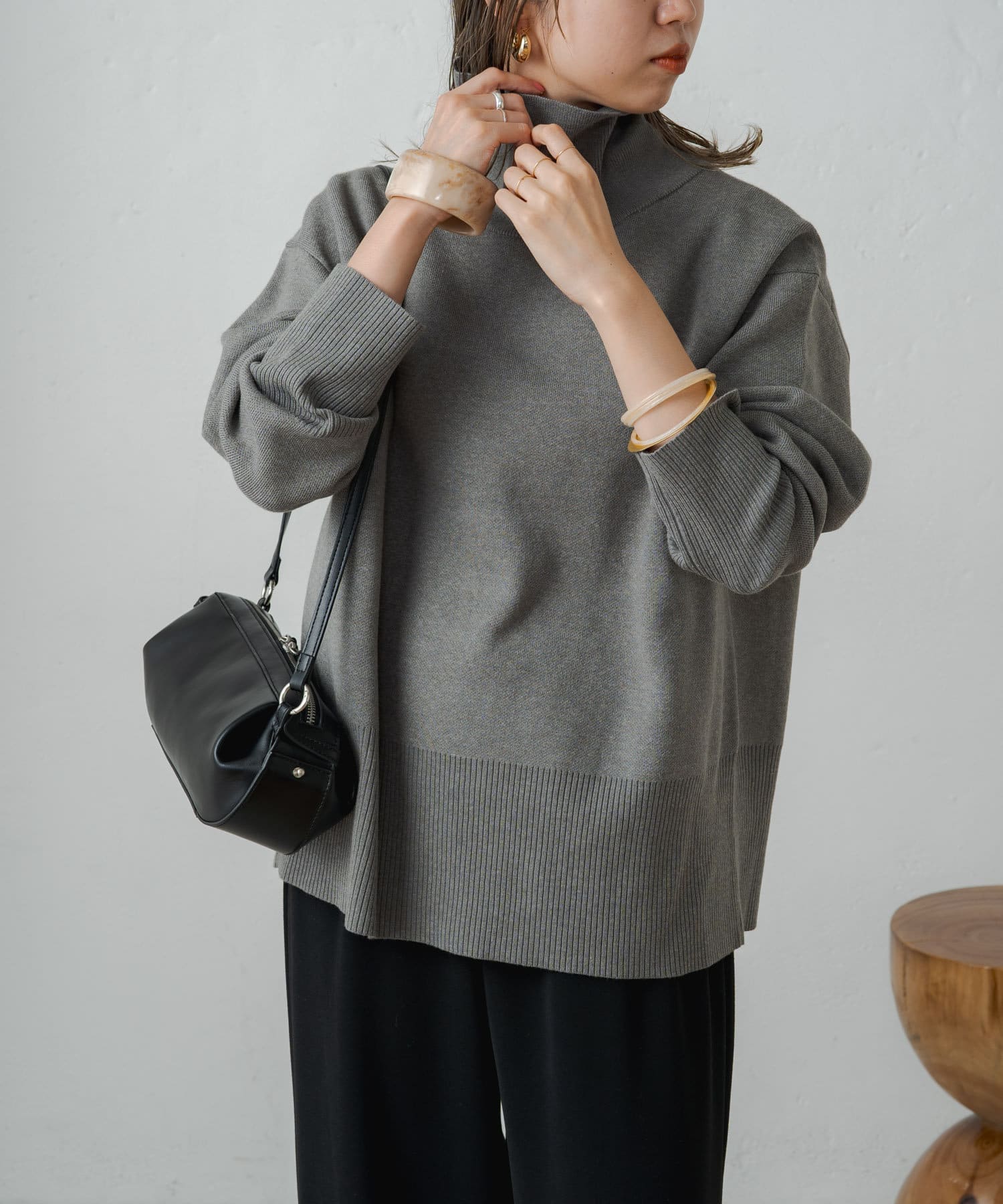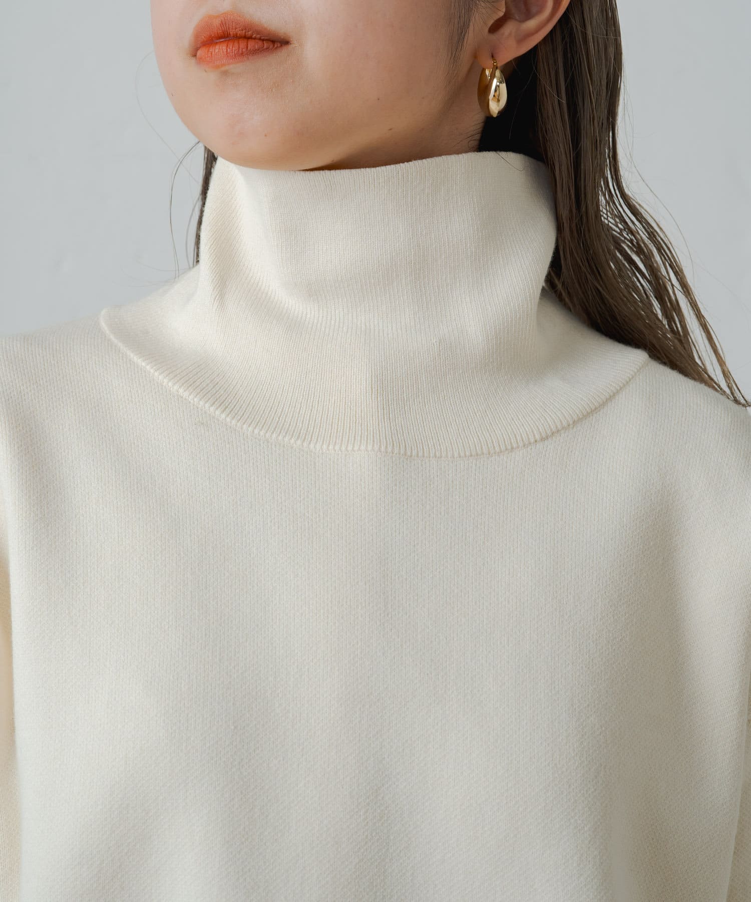・シンプルで着心地が良いスウェットライクなニット素材のハイネックプルオーバー