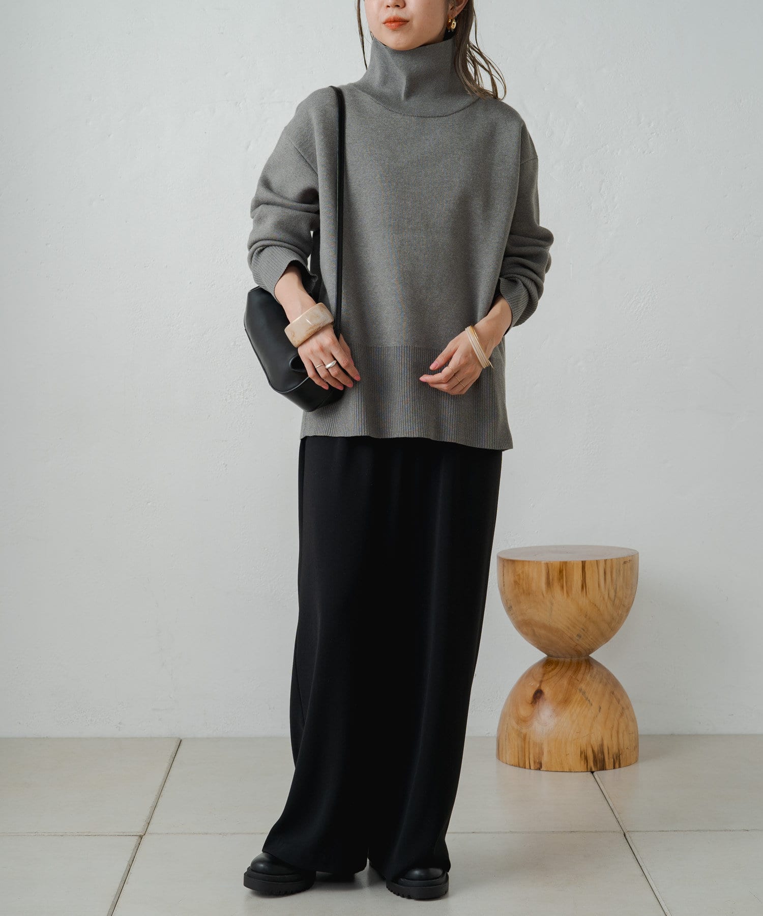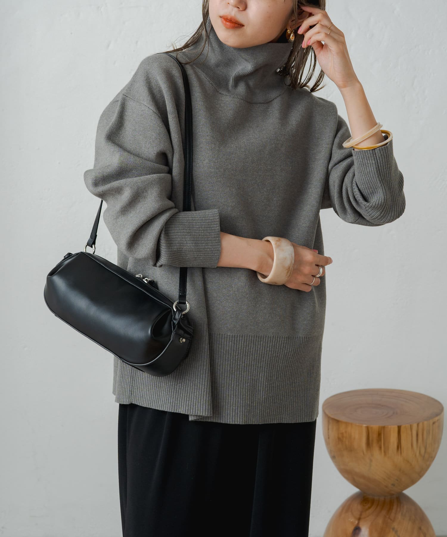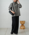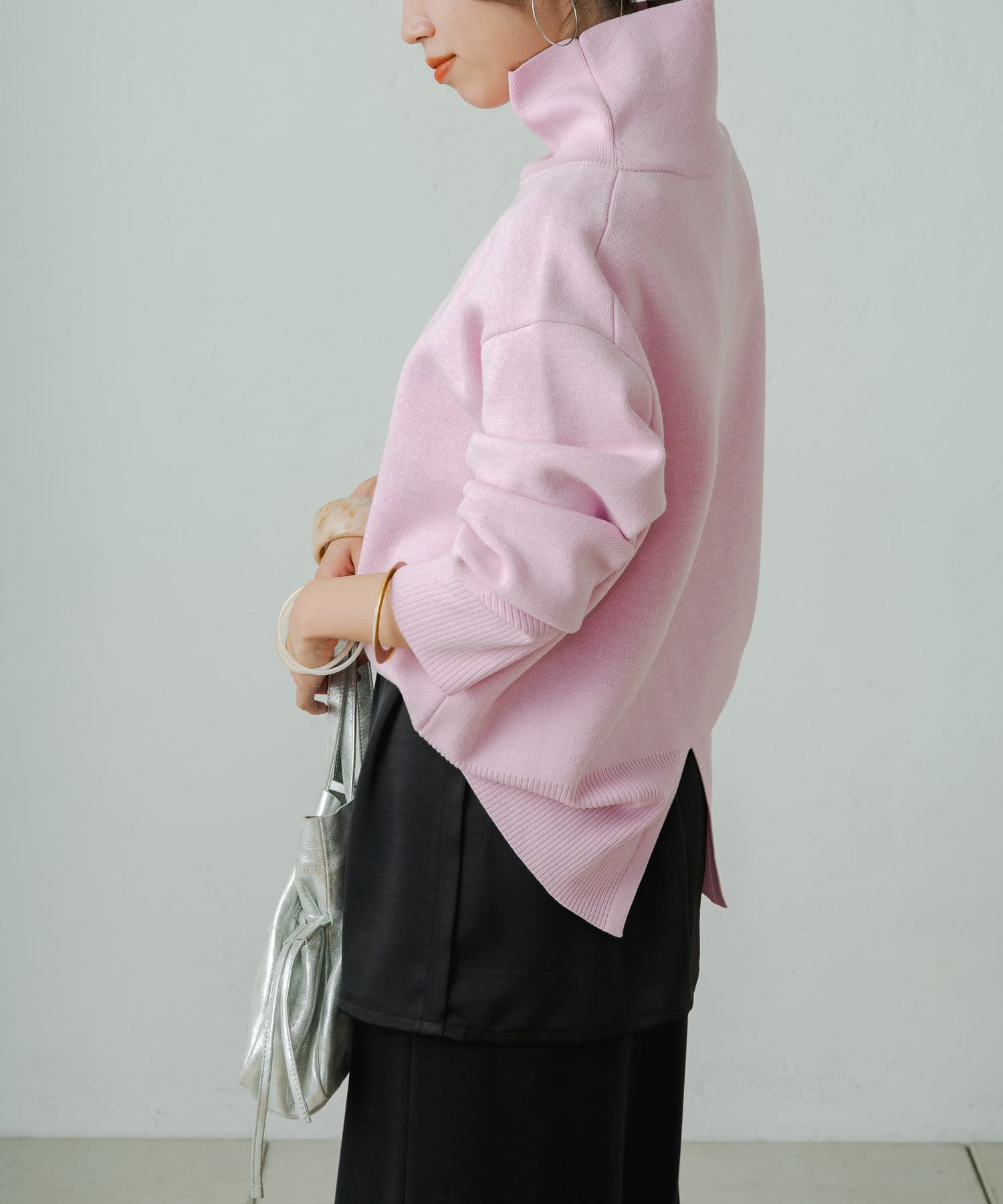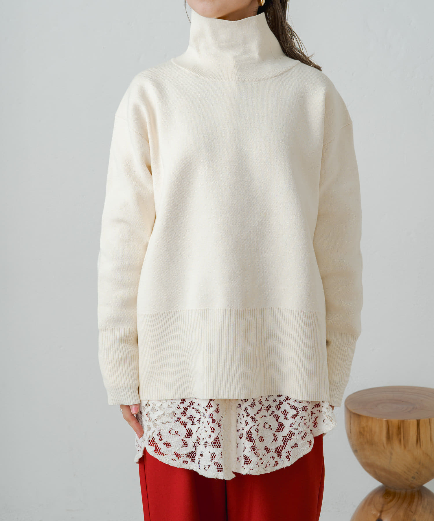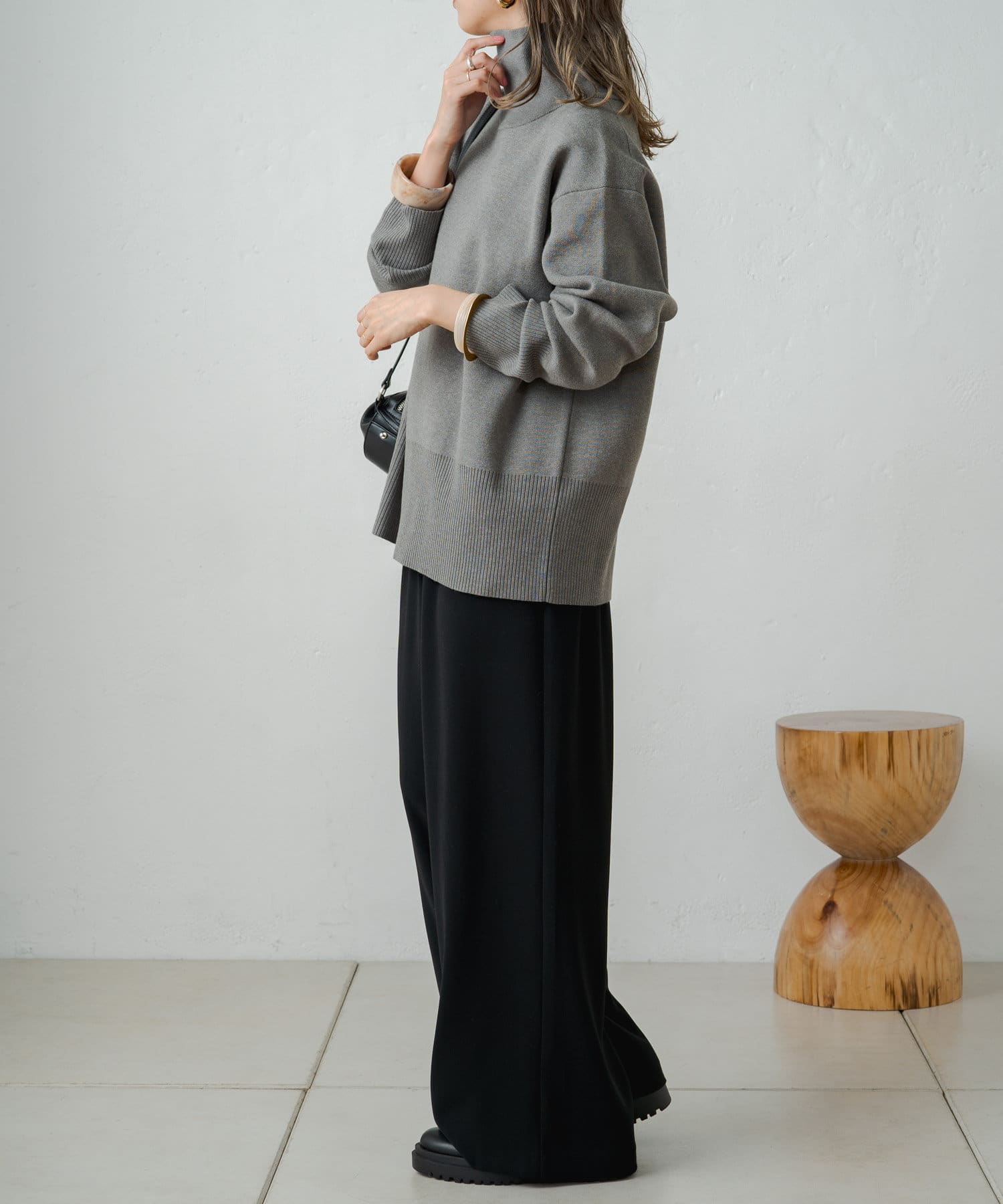 ・シンプルで着心地が良いスウェットライクなニット素材のハイネックプルオーバー