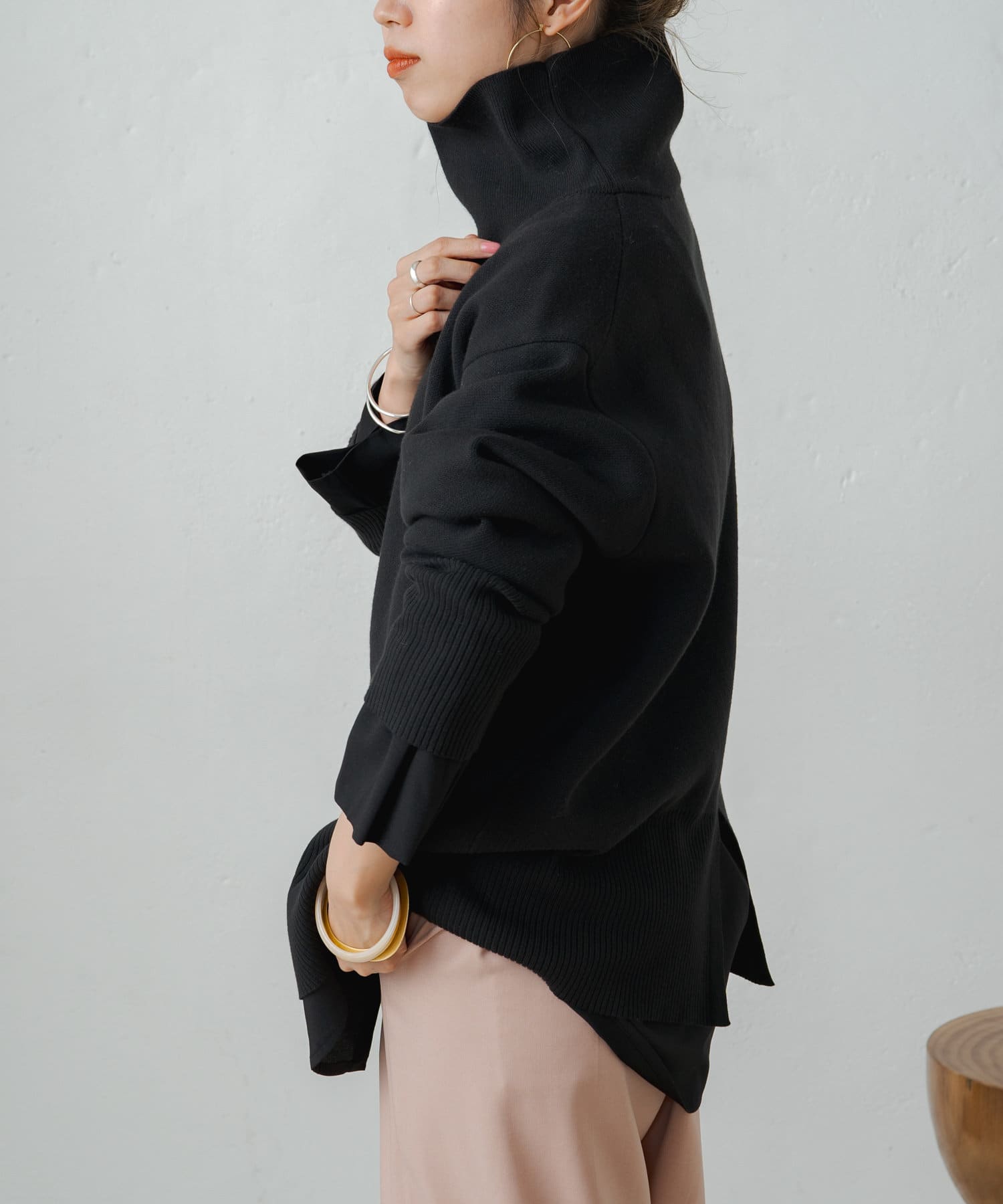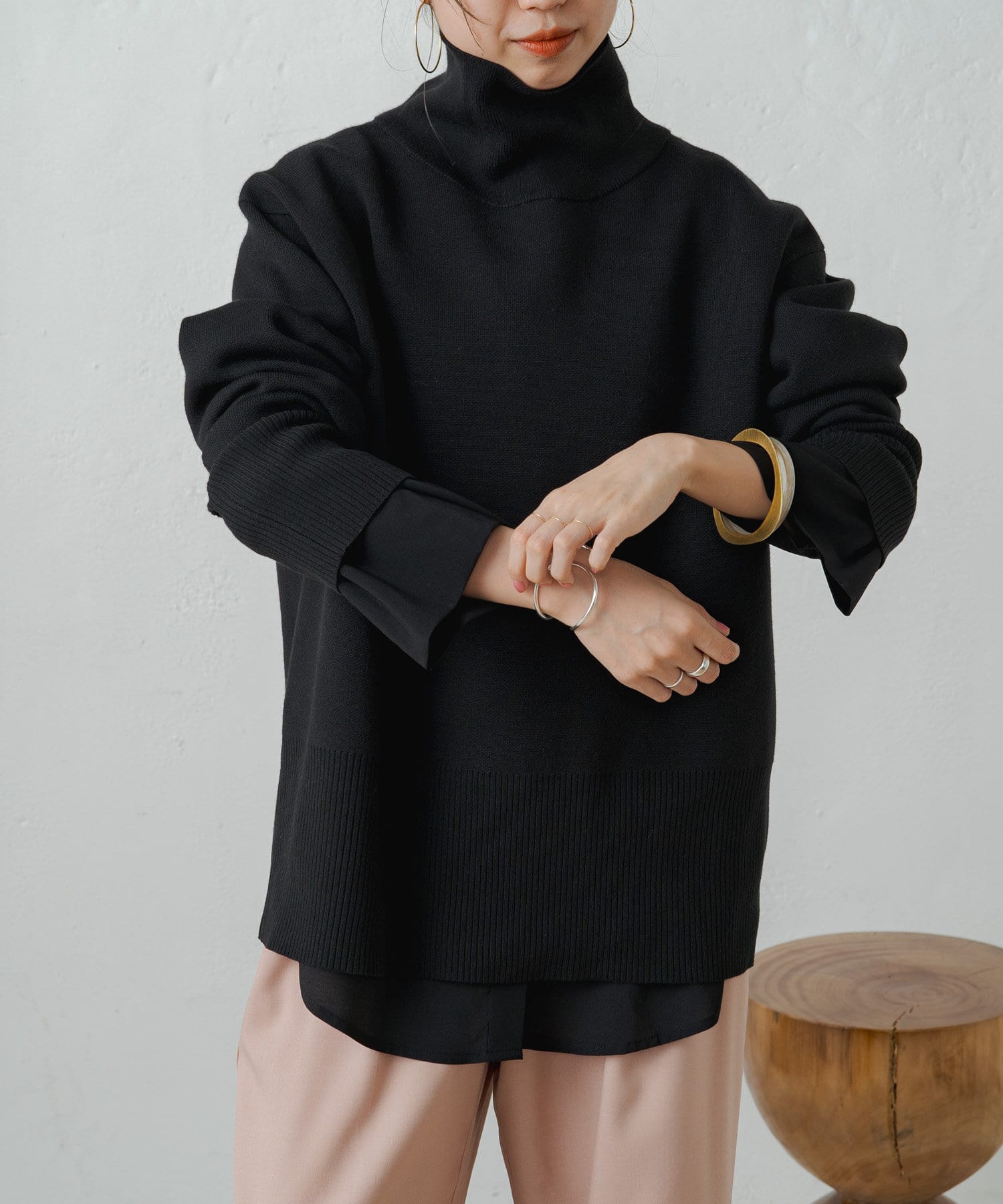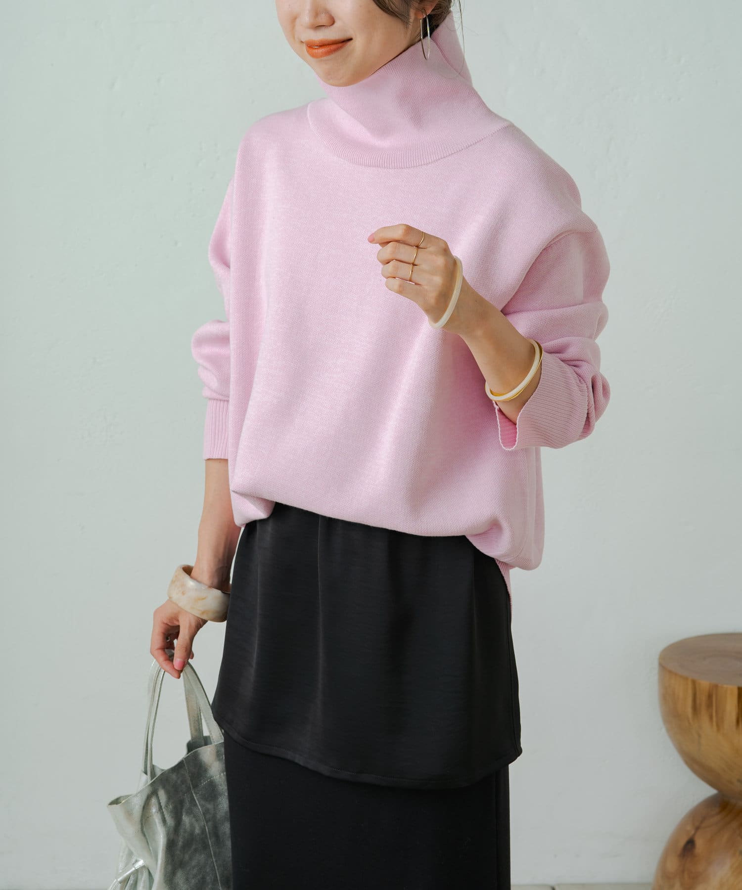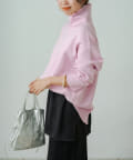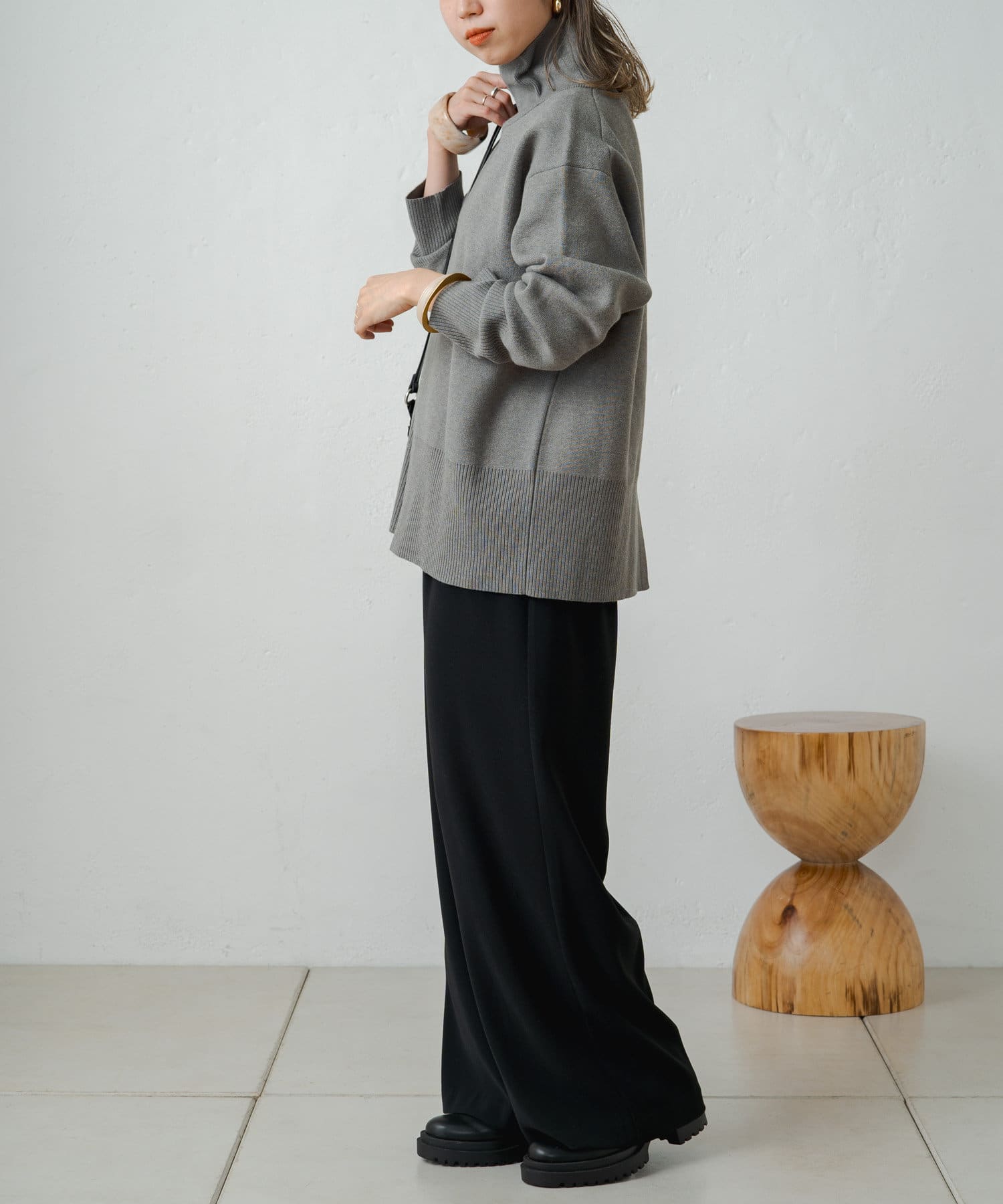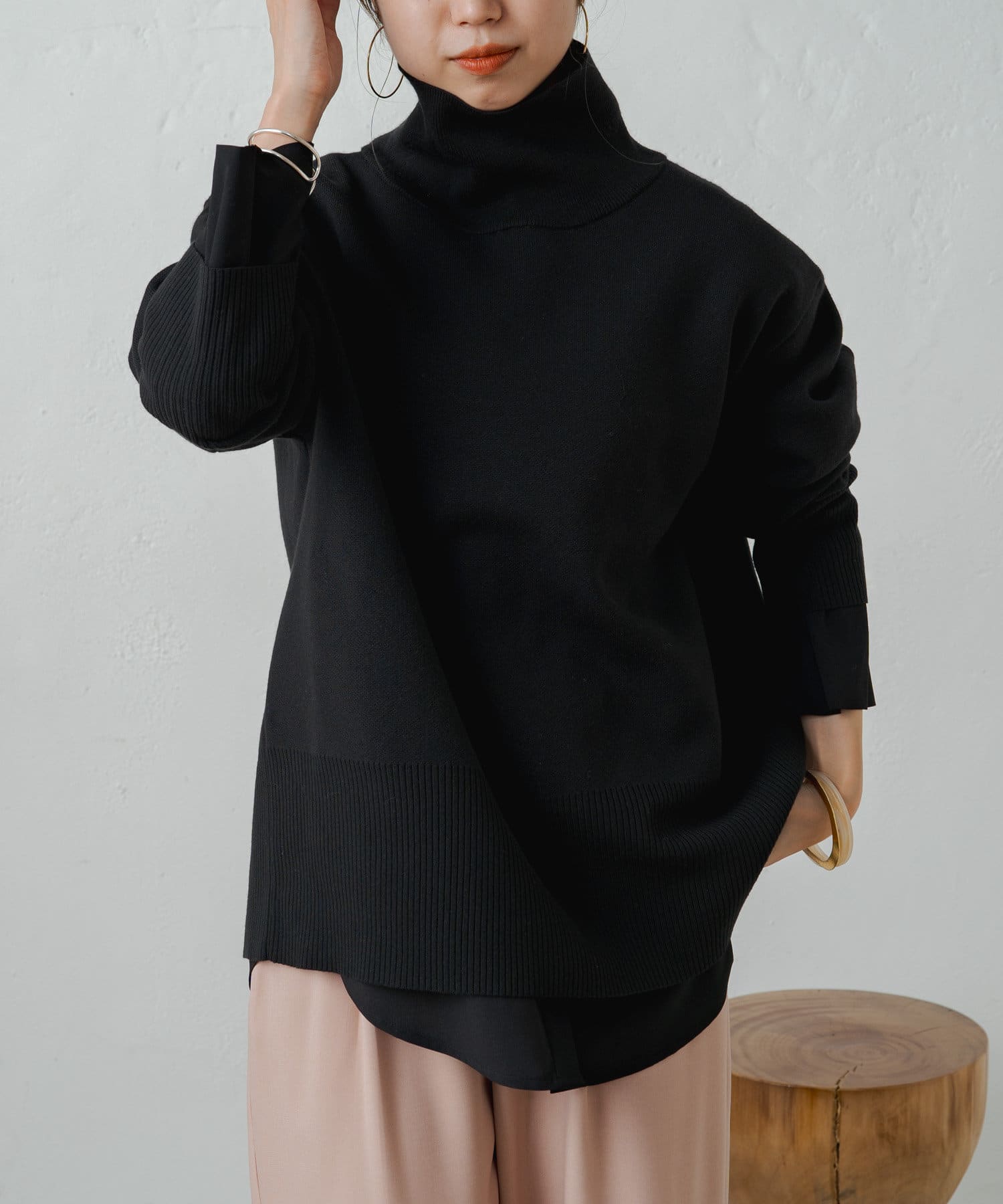 ・シンプルで着心地が良いスウェットライクなニット素材のハイネックプルオーバー