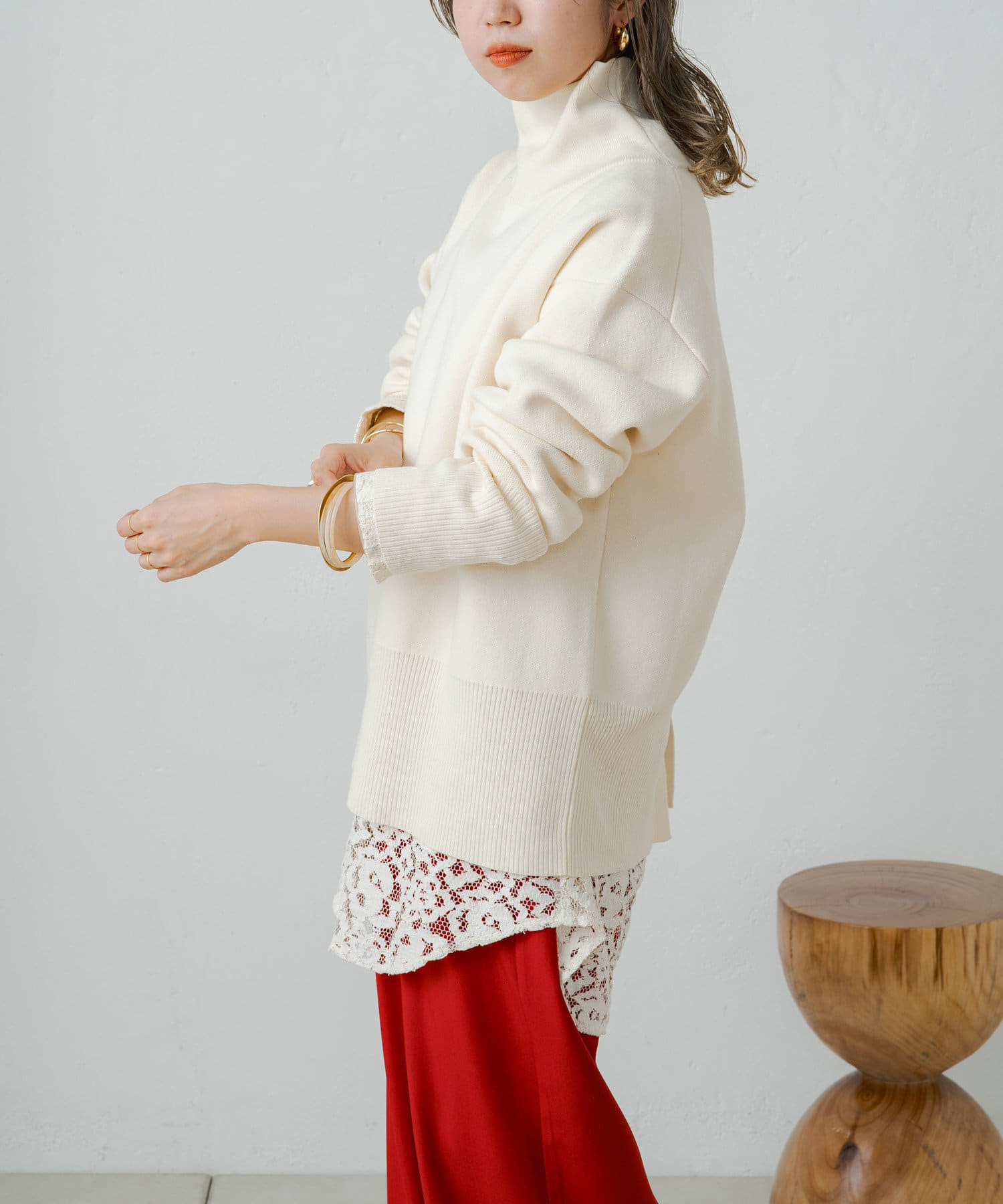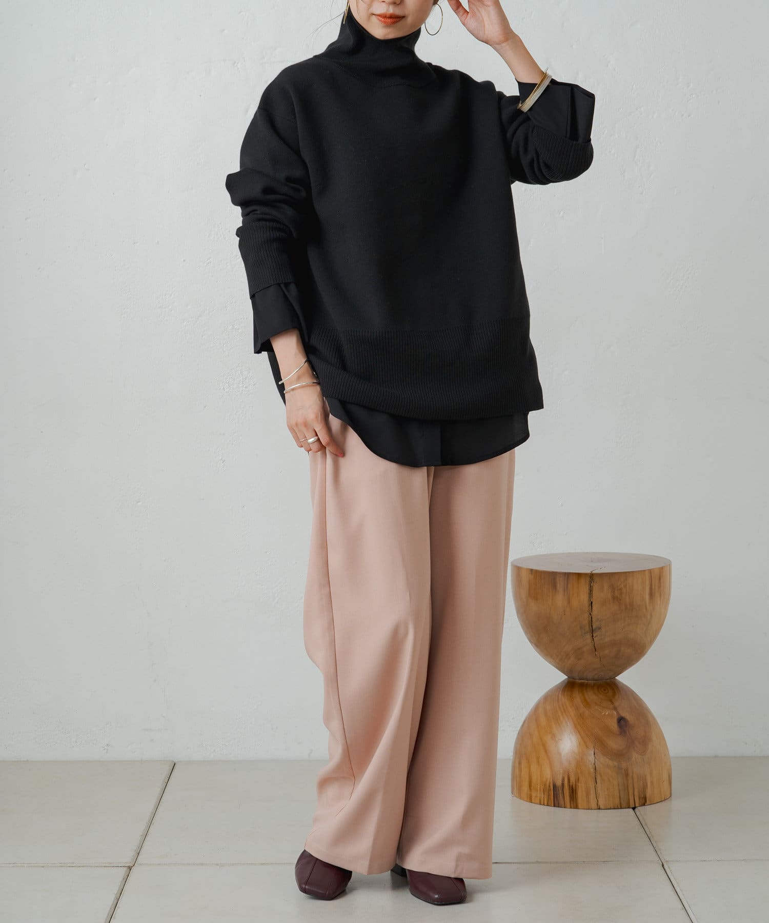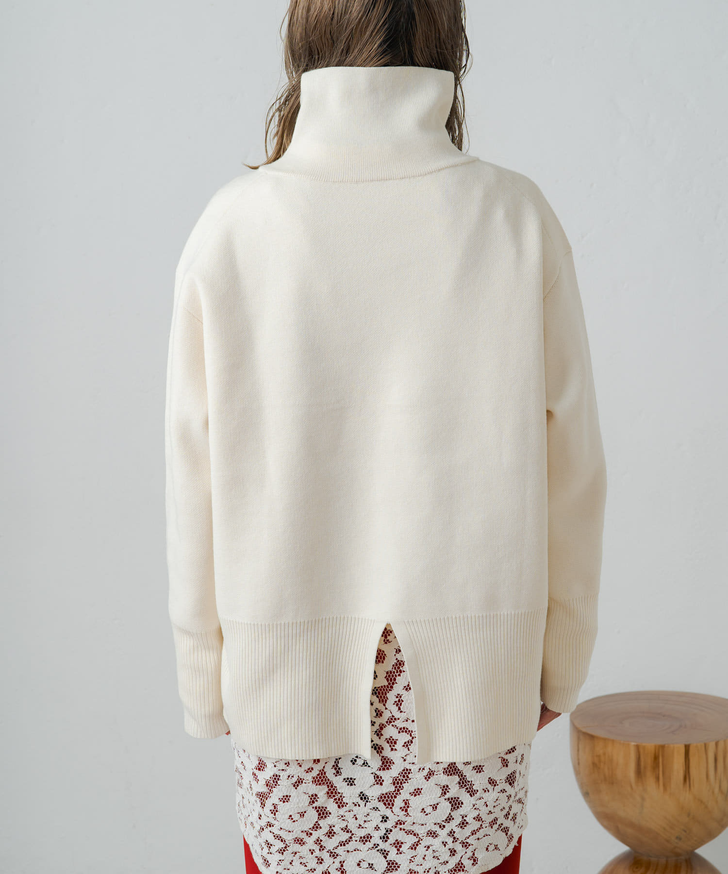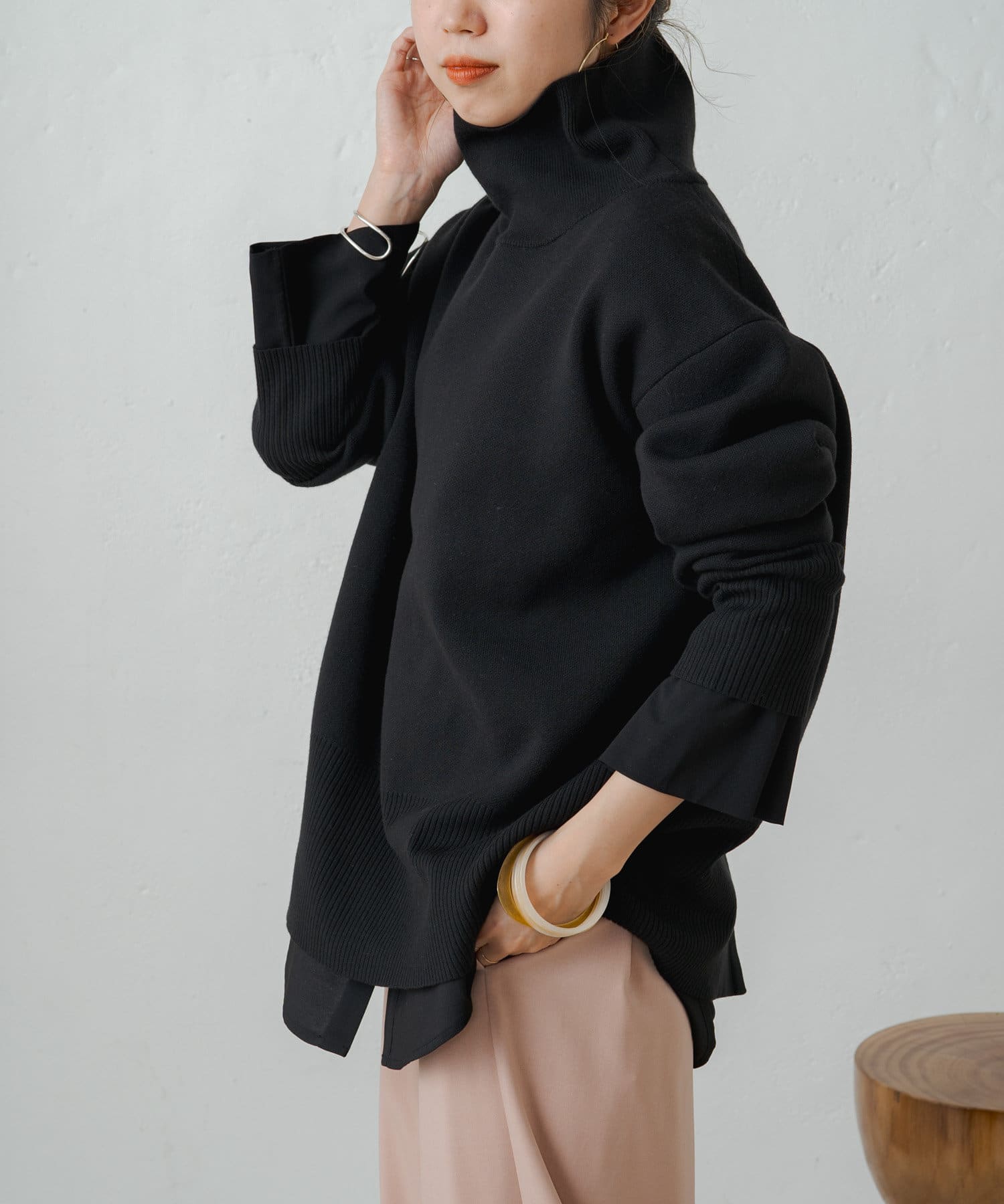 ・シンプルで着心地が良いスウェットライクなニット素材のハイネックプルオーバー