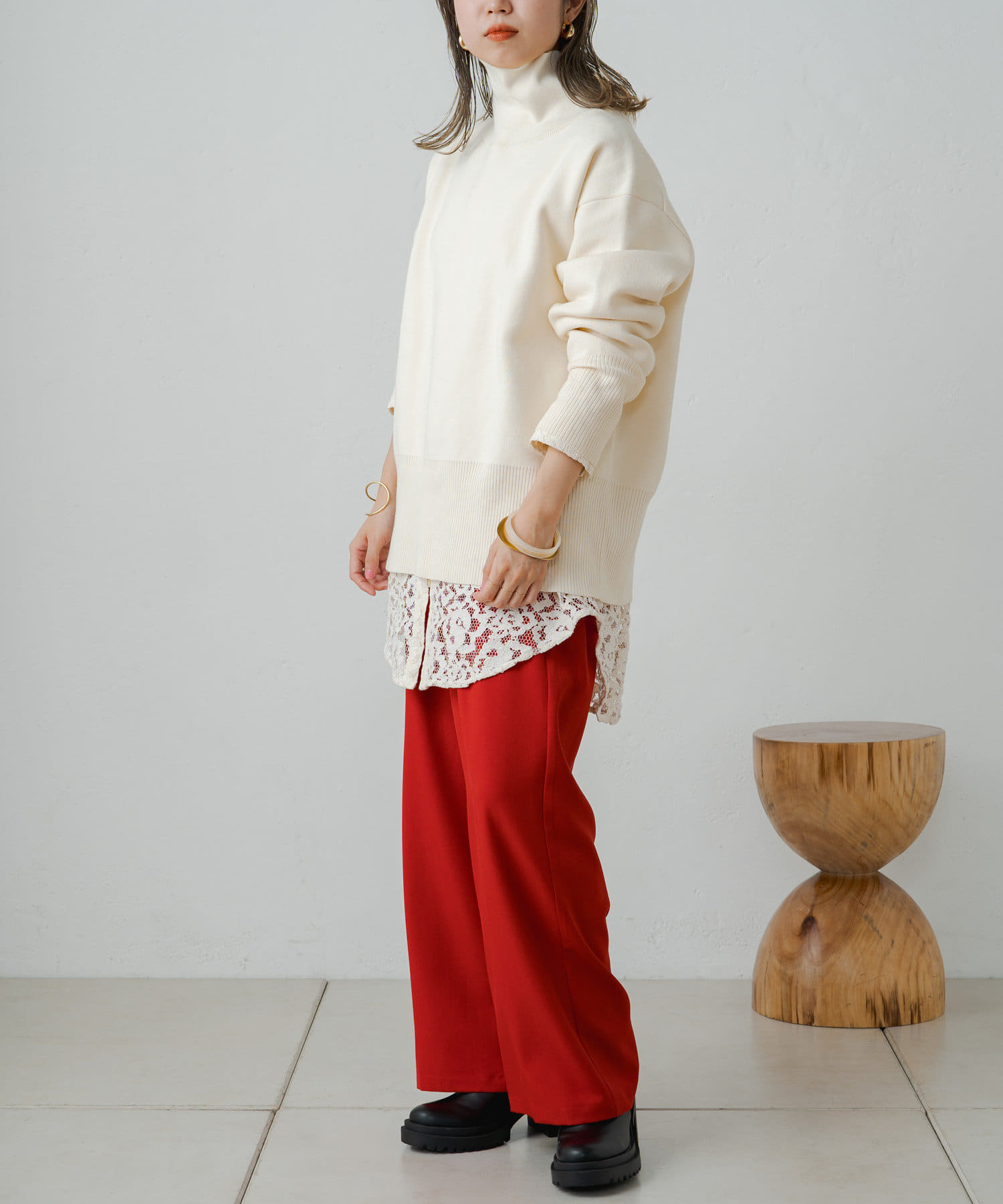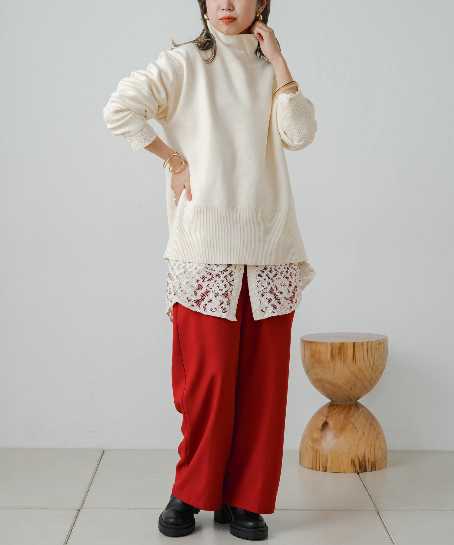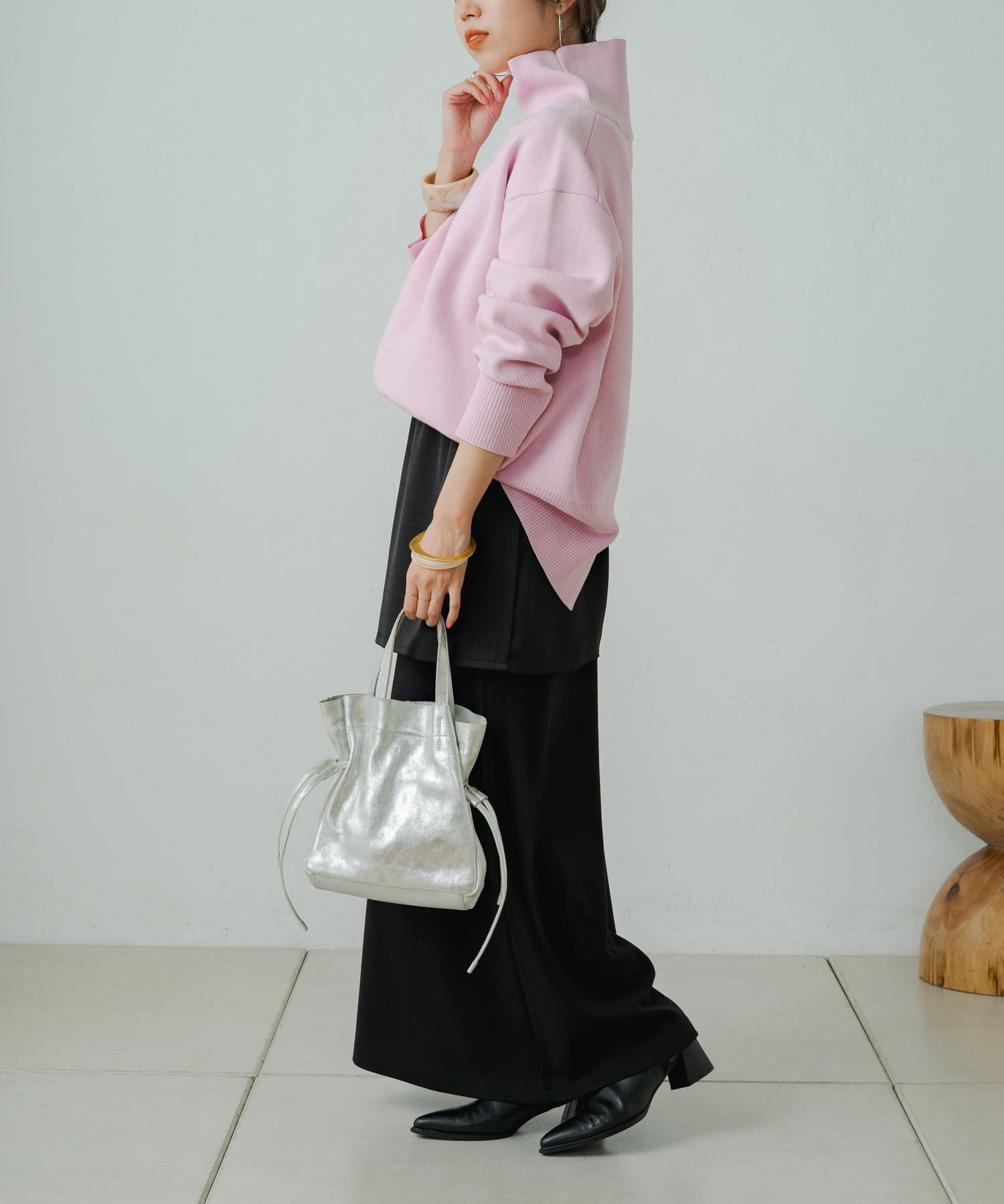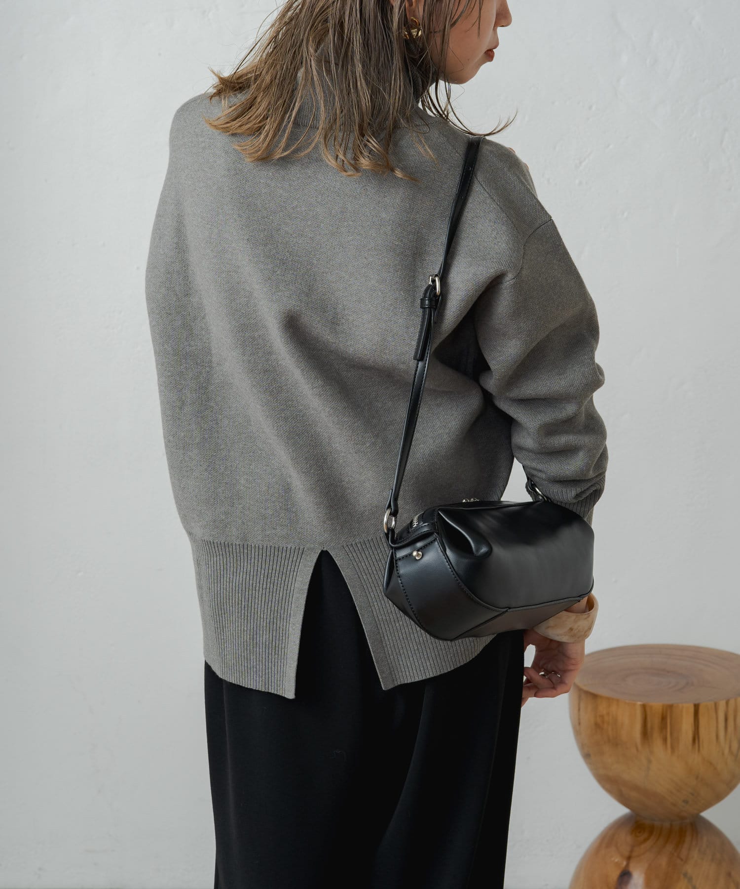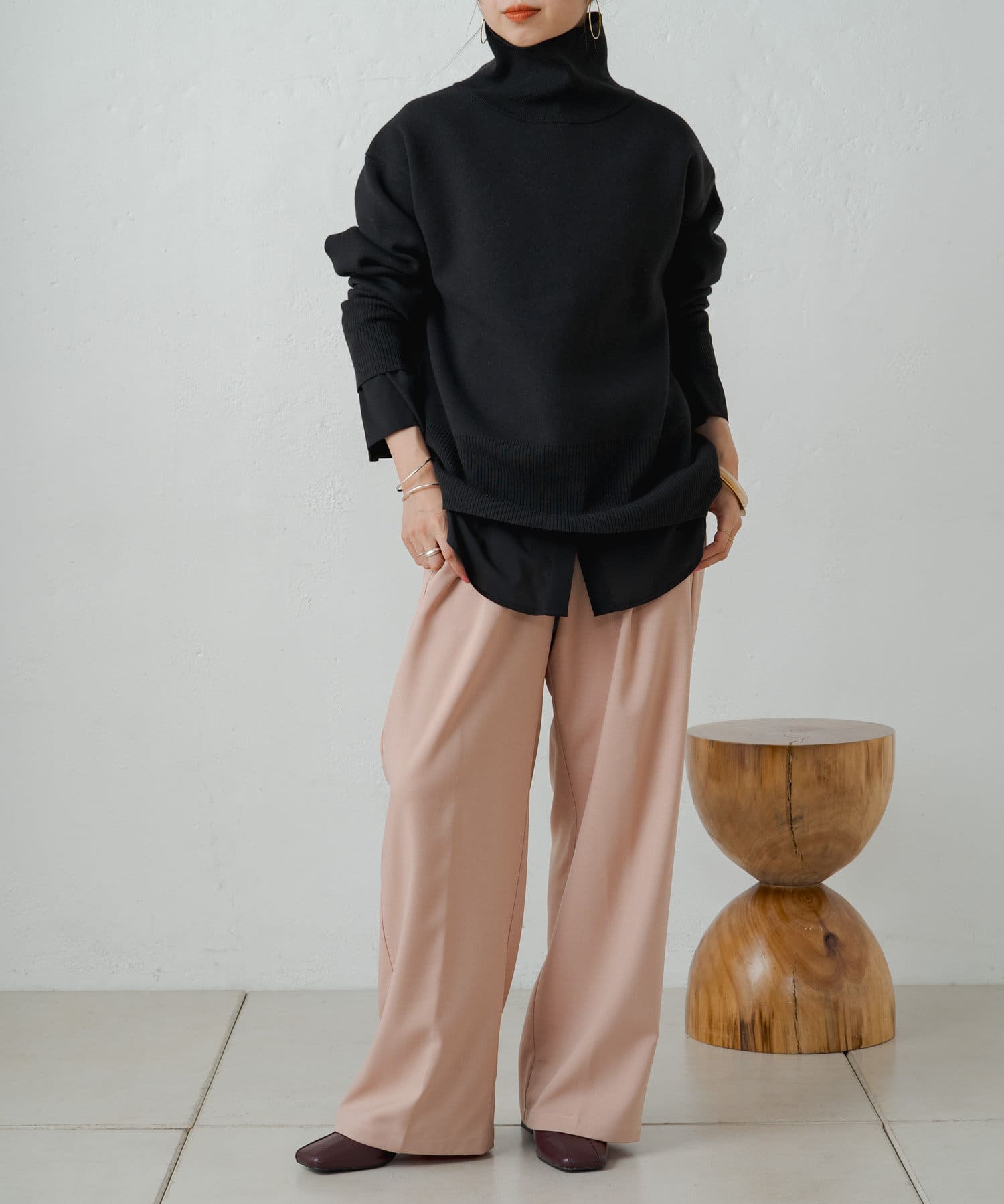 ・シンプルで着心地が良いスウェットライクなニット素材のハイネックプルオーバー