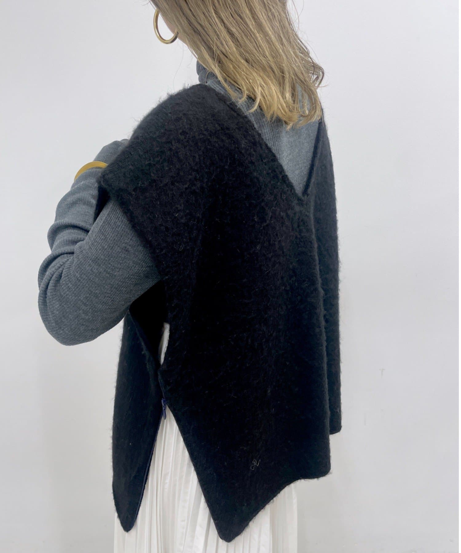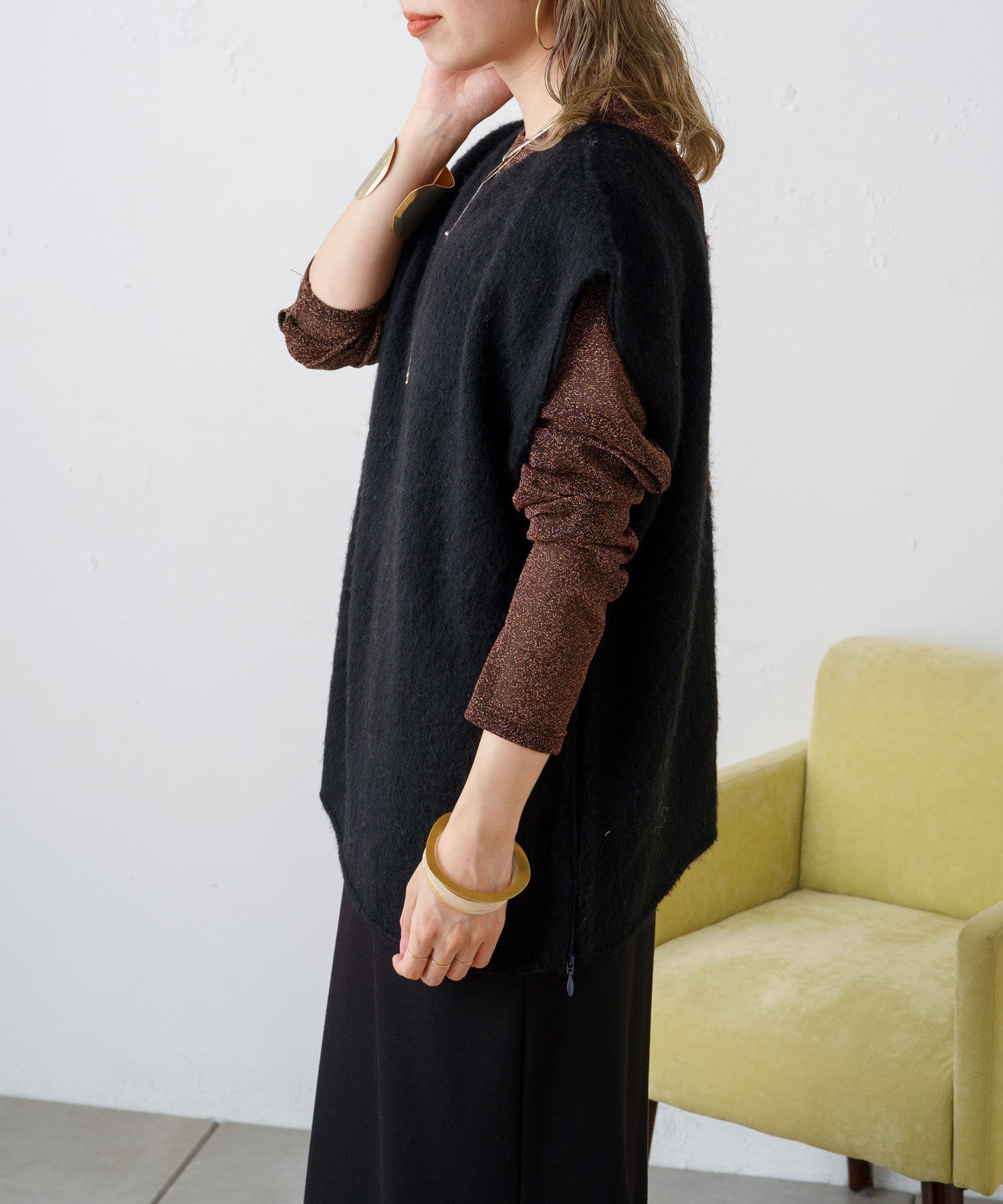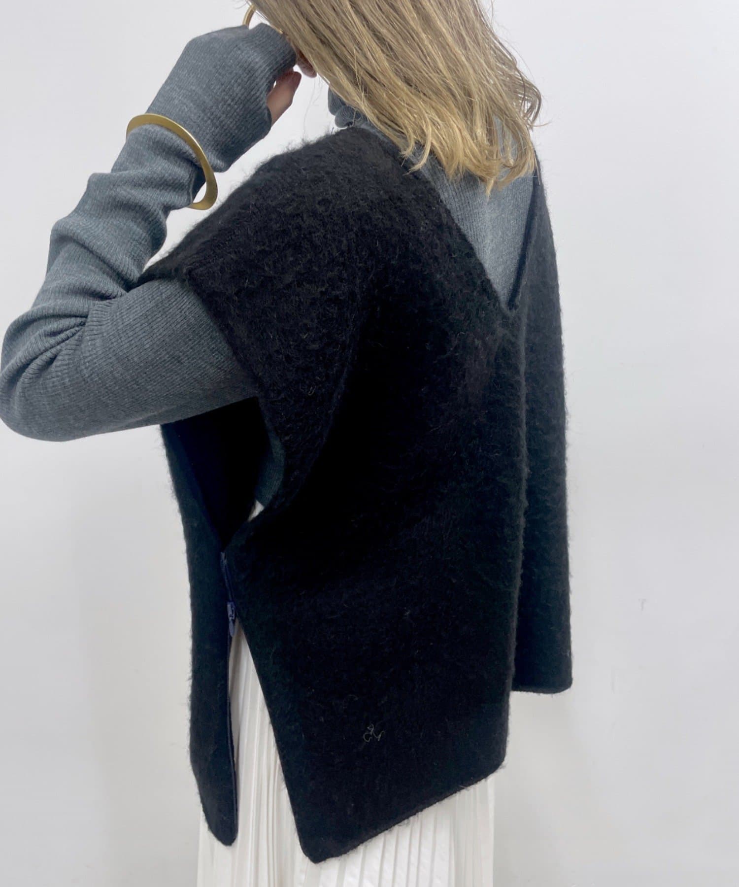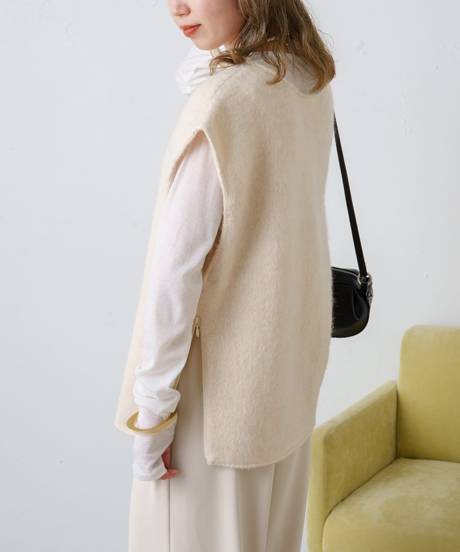 ・ふわふわとした素材感がかわいいニットベスト。ファスナーでサイドのスリットが調節できて抜け感がでるデザイン