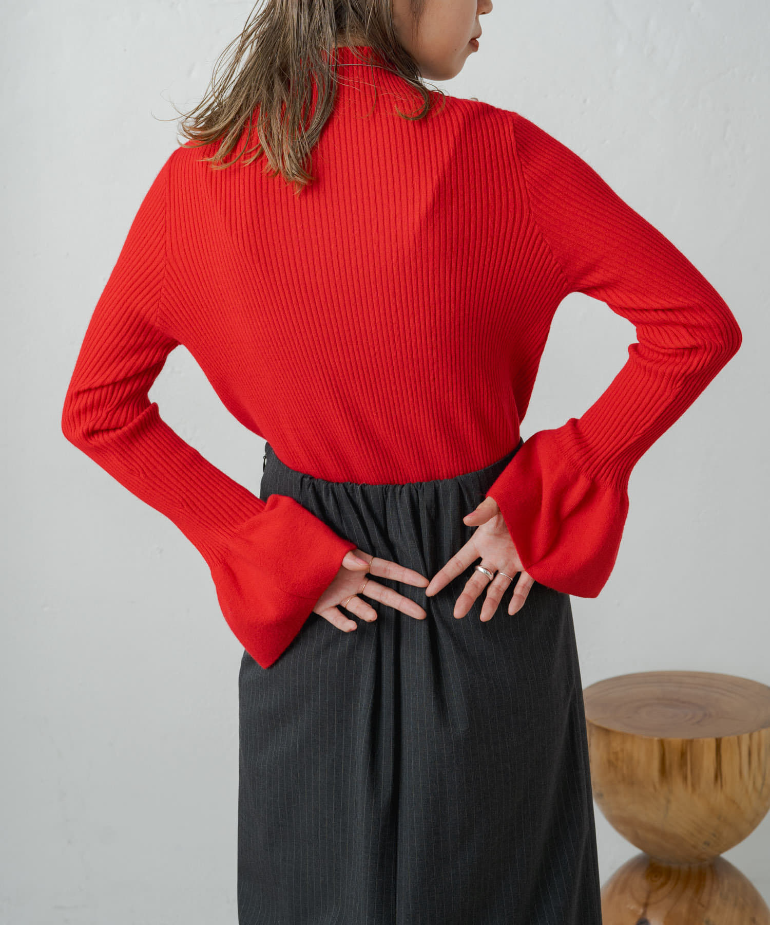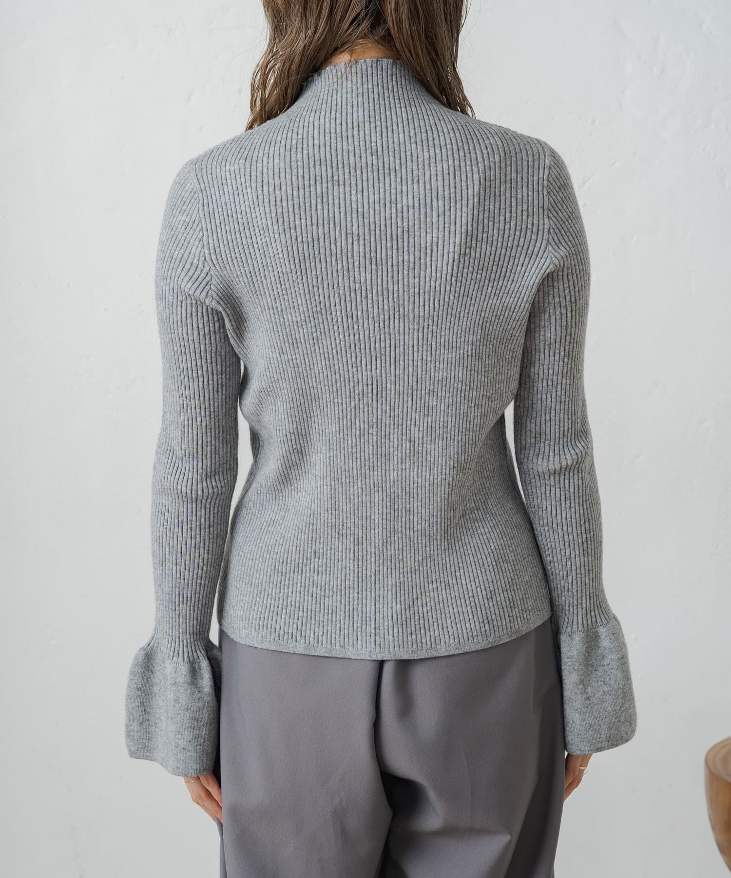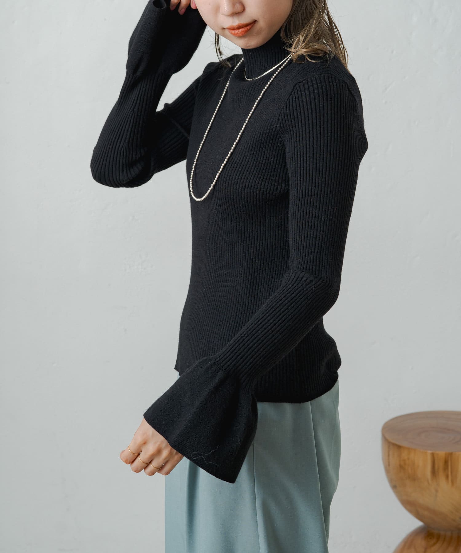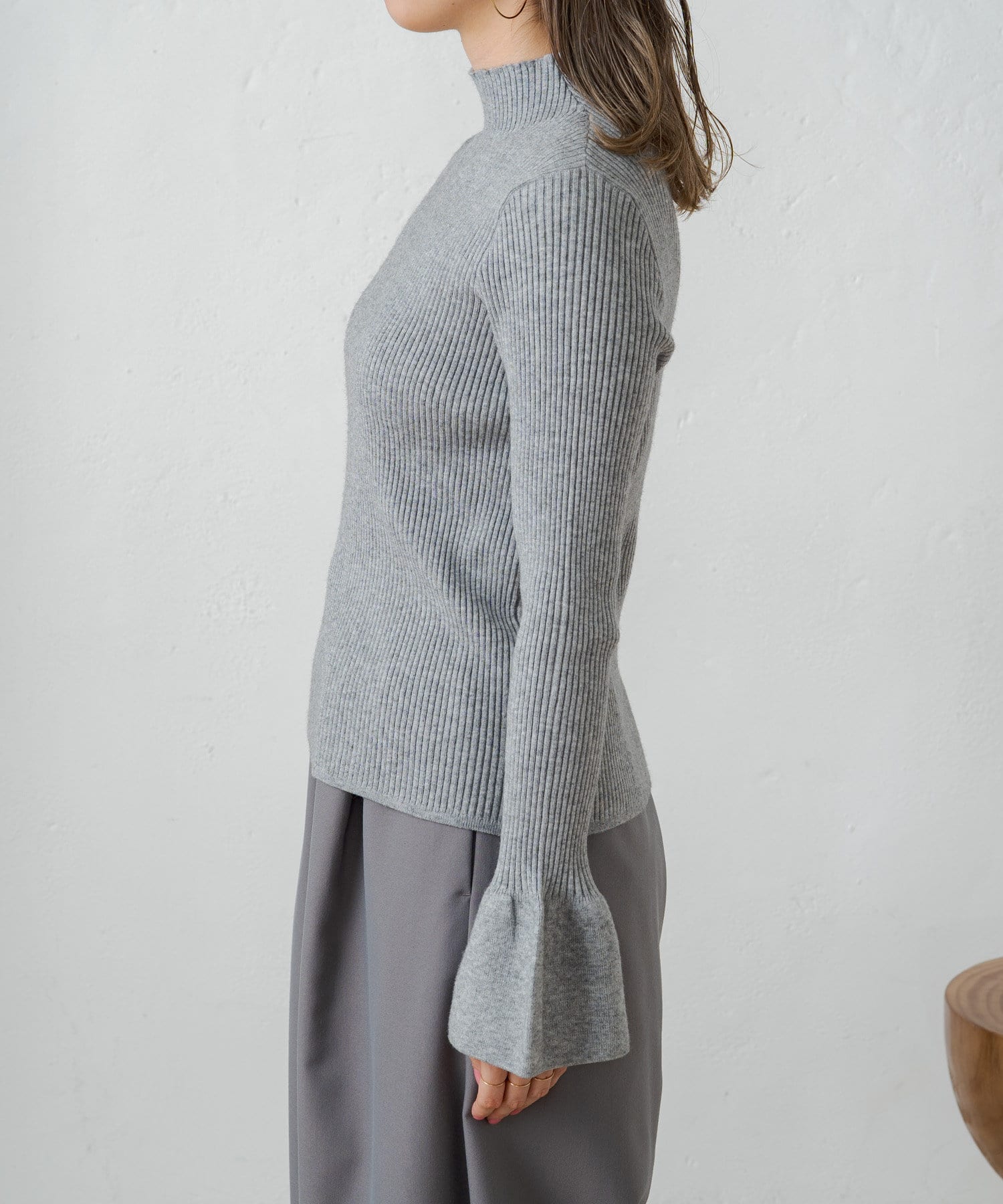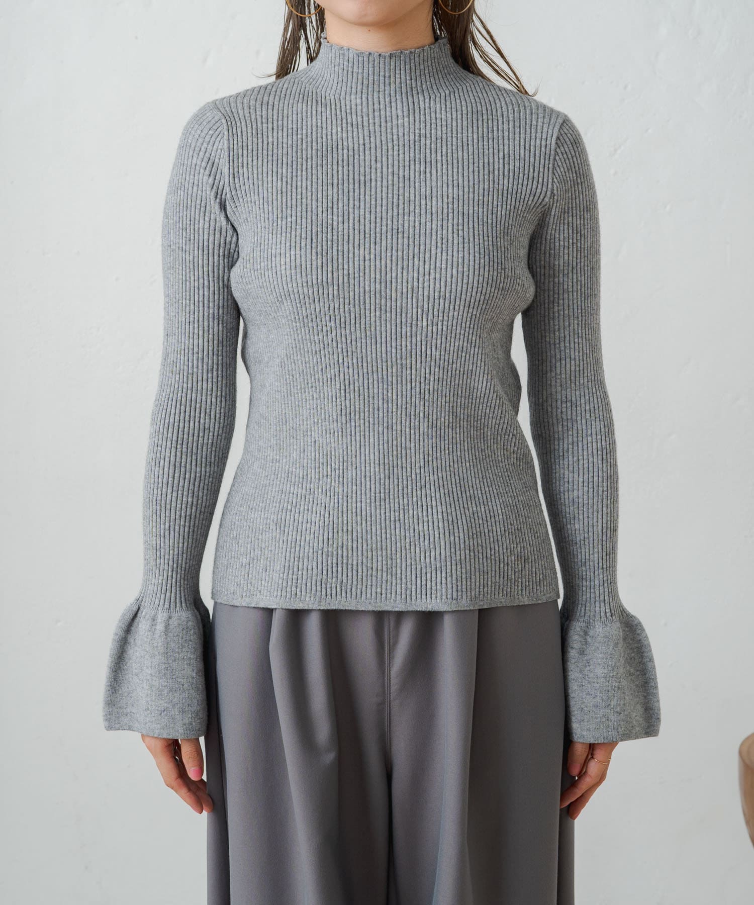 ・袖口のフリルがフェミニンな印象で、しなやかにネックラインに沿うハイネックニットと、程よいフィット感が魅力な一枚。
