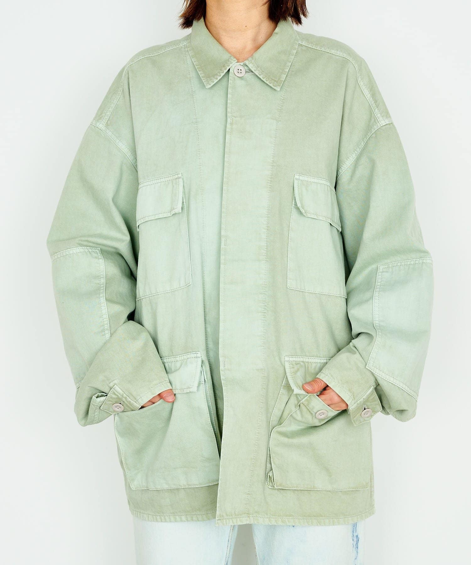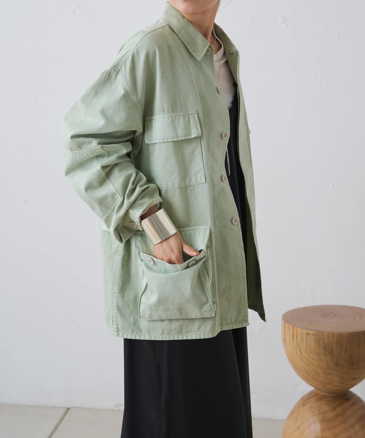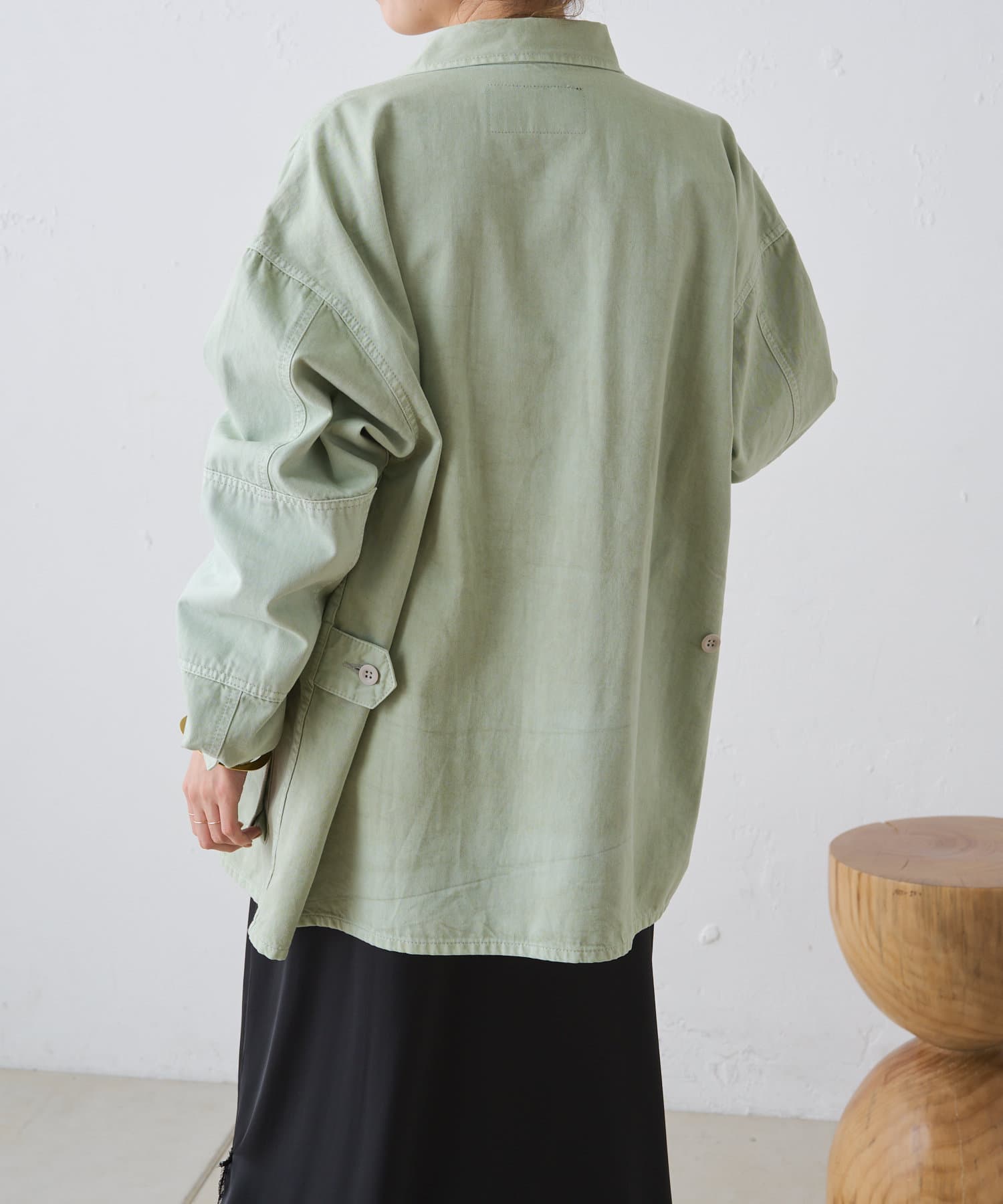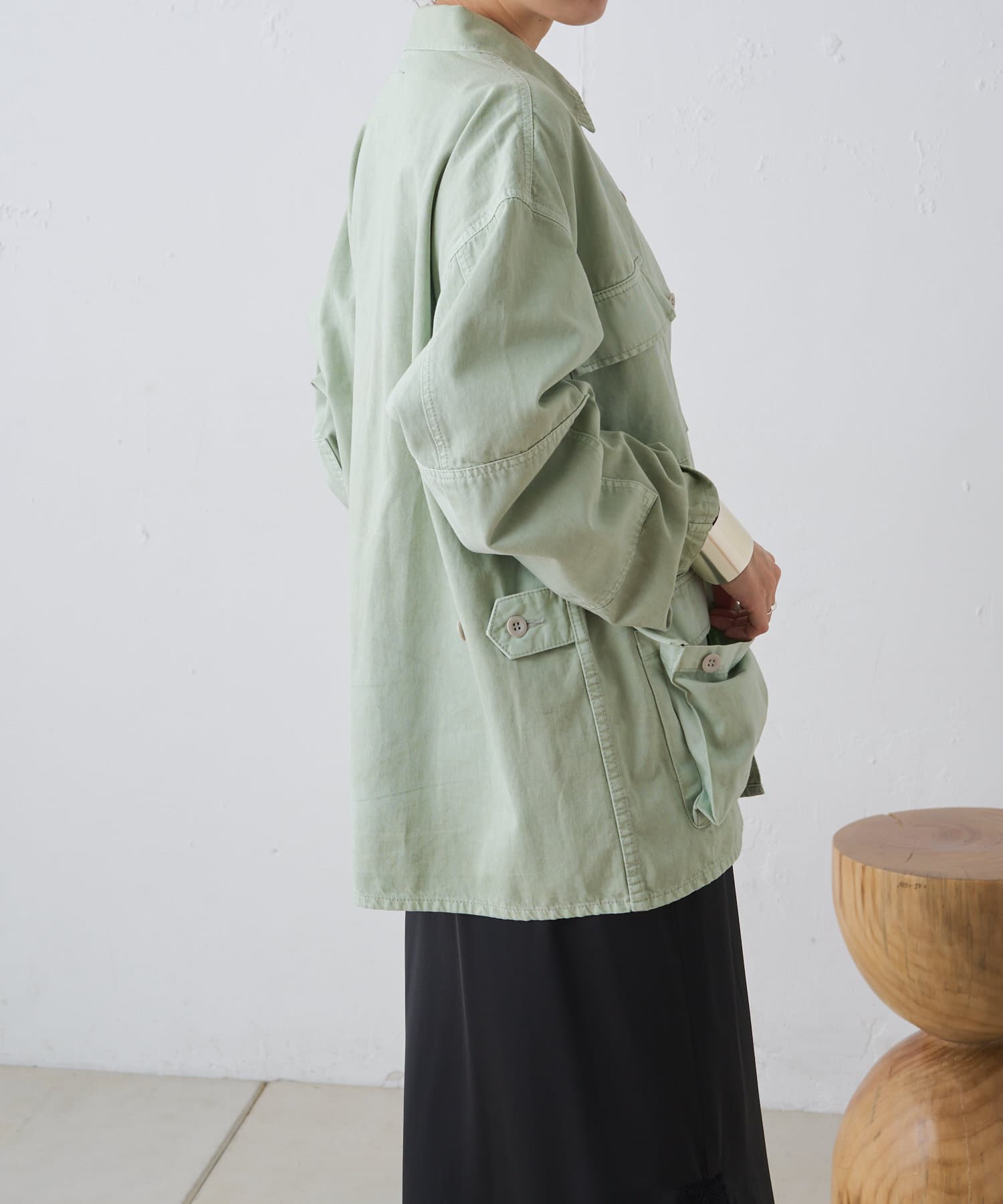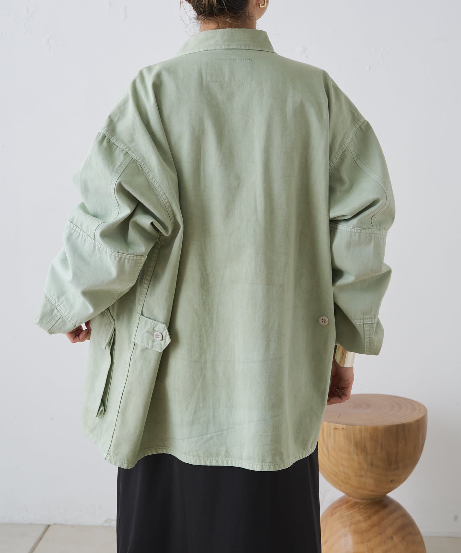 ジャングルファティーグジャケット型をベースに、よりリラックスして着ていただけるようにゆったりと、またユニセックスでも着ていただけるように着丈を細かくこだわった身幅は広く、着丈はすっきりとしたシルエットにしています。