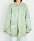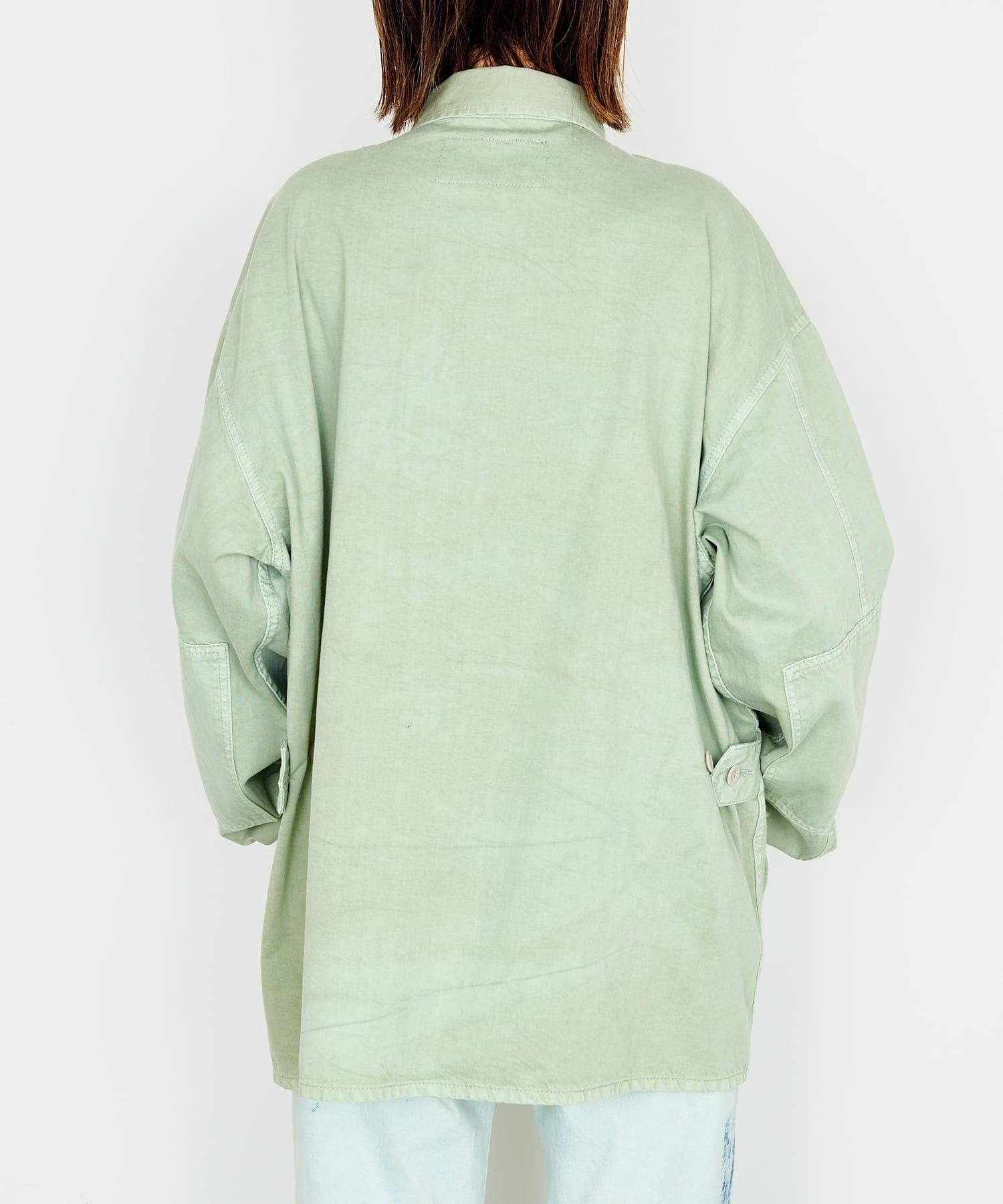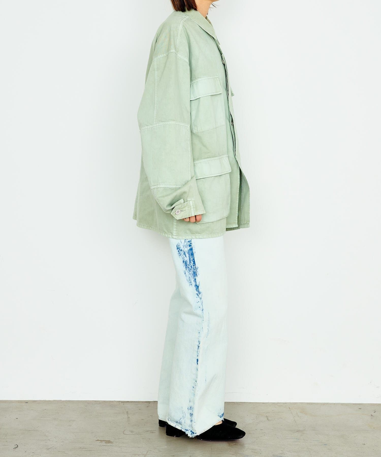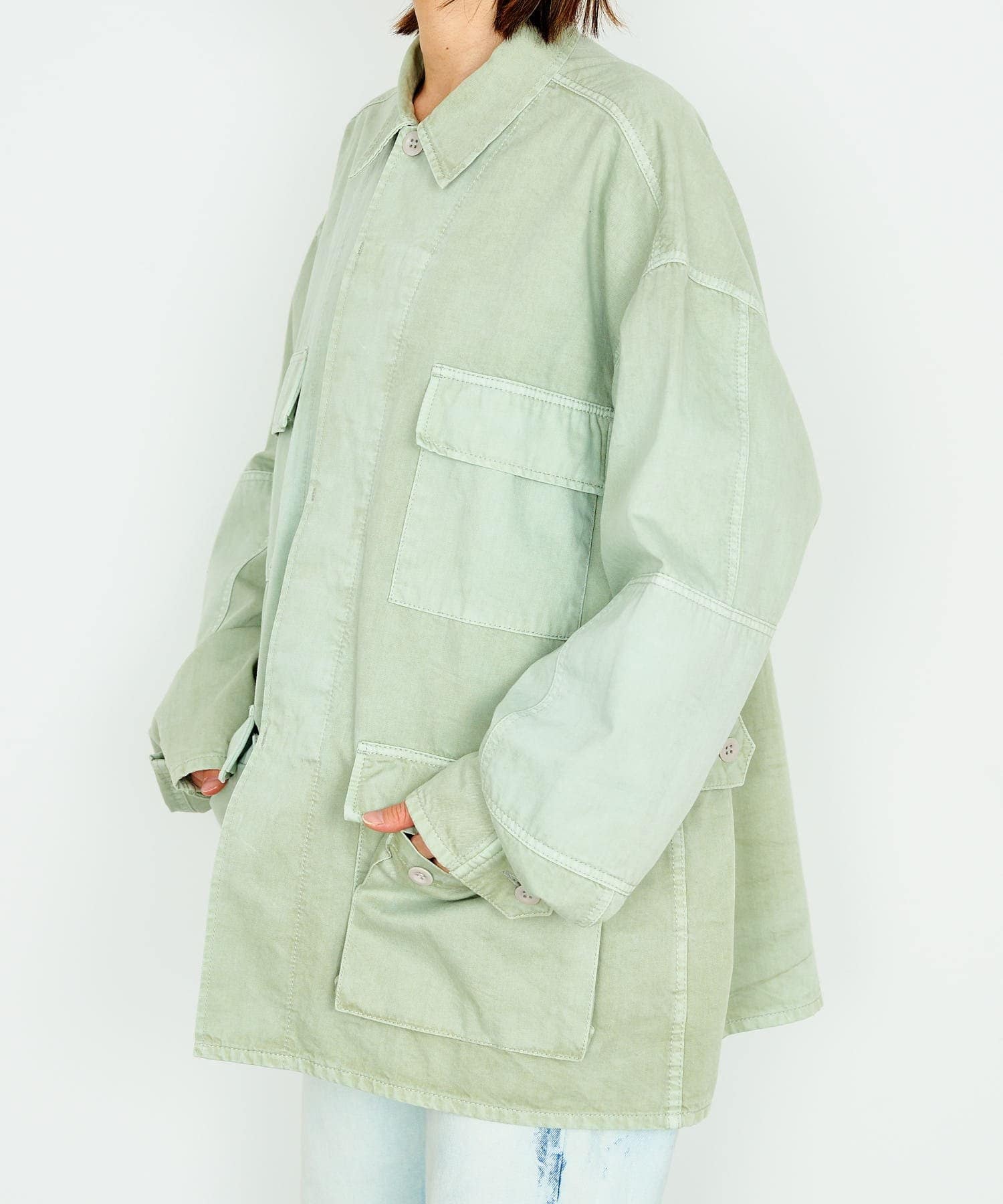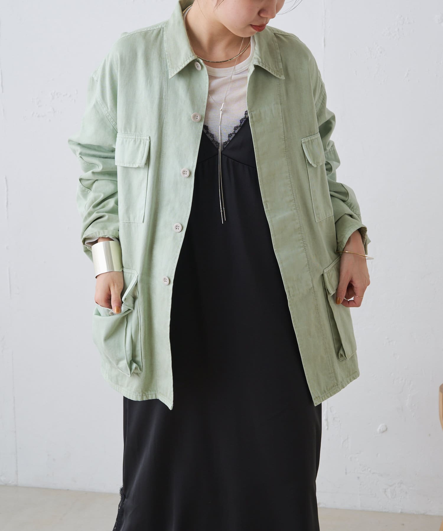 ジャングルファティーグジャケット型をベースに、よりリラックスして着ていただけるようにゆったりと、またユニセックスでも着ていただけるように着丈を細かくこだわった身幅は広く、着丈はすっきりとしたシルエットにしています。