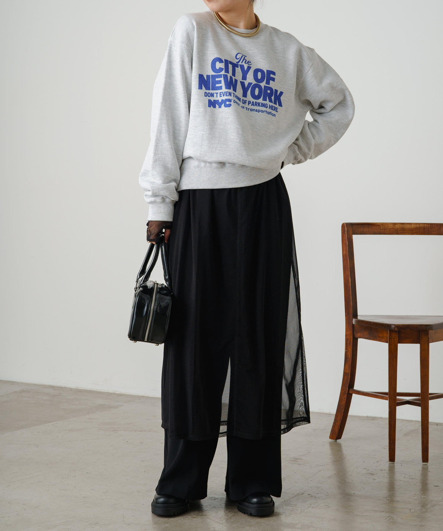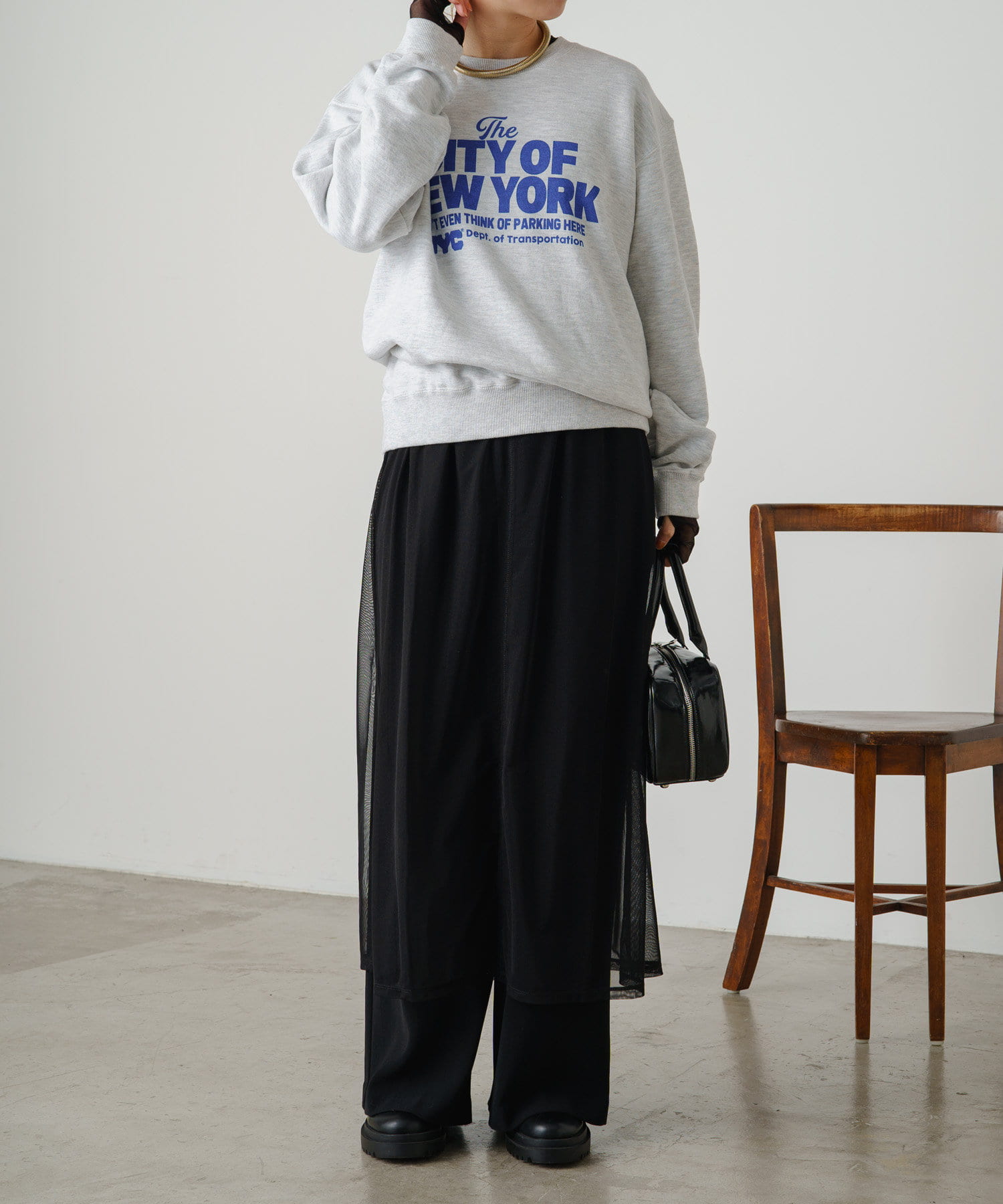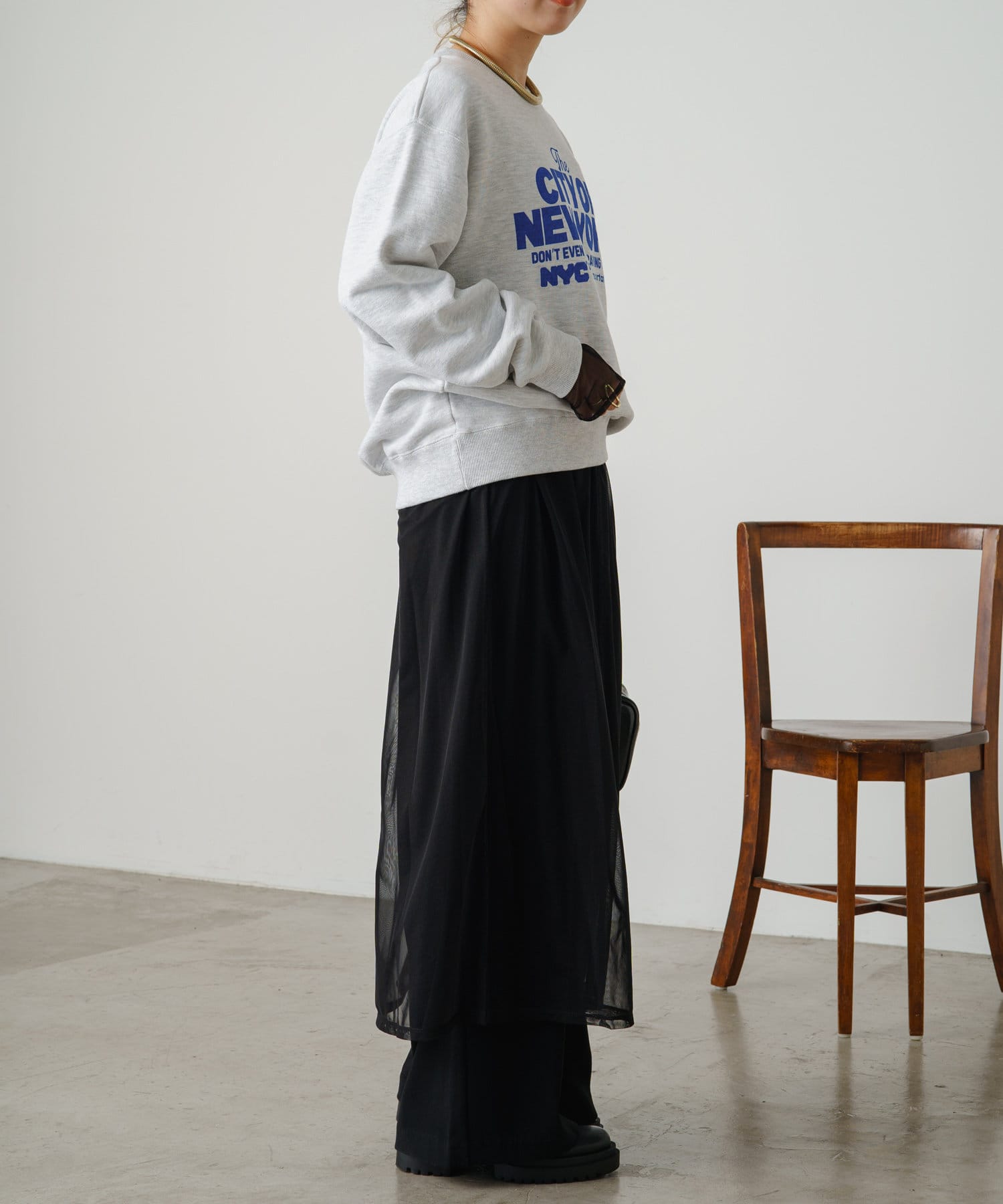 ・柔らかい生地感なので、上からニットやスウェットなどを重ねるスタイルも!