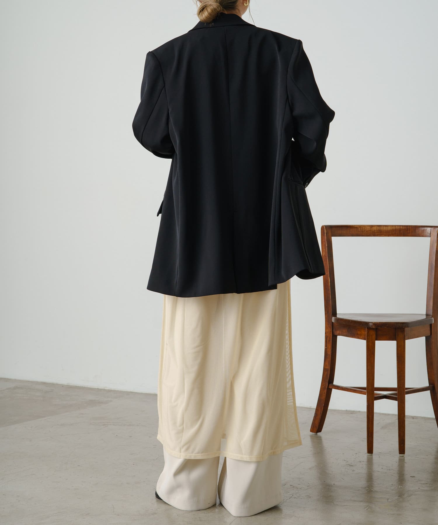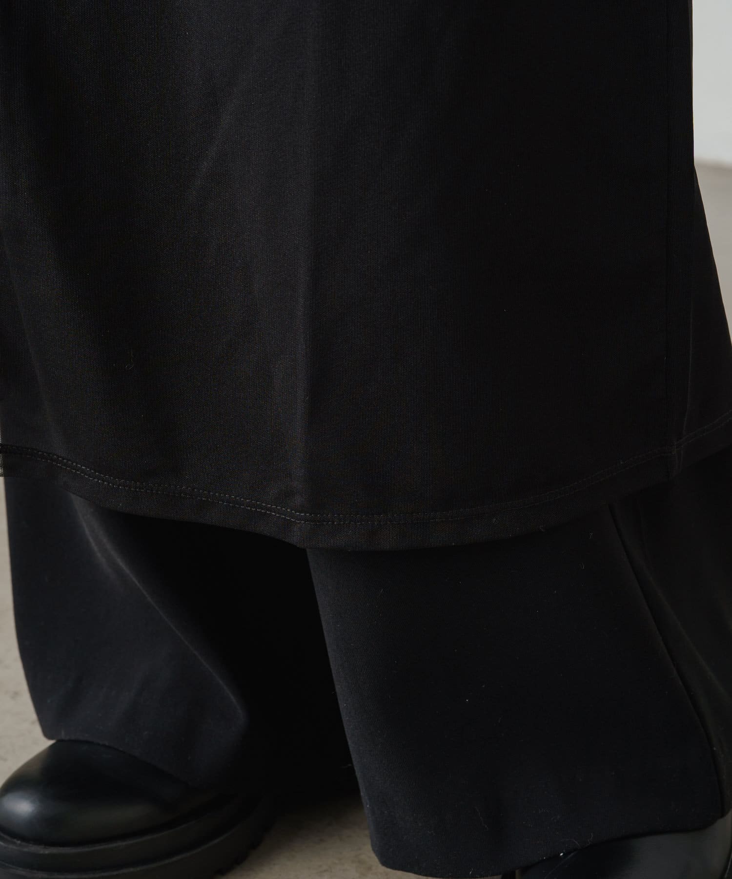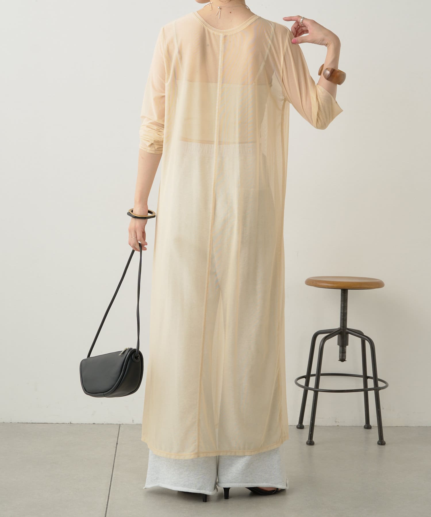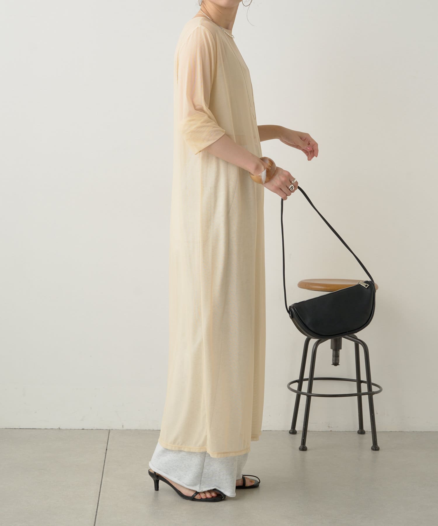 ・柔らかい生地感なので、上からニットやスウェットなどを重ねるスタイルも!
