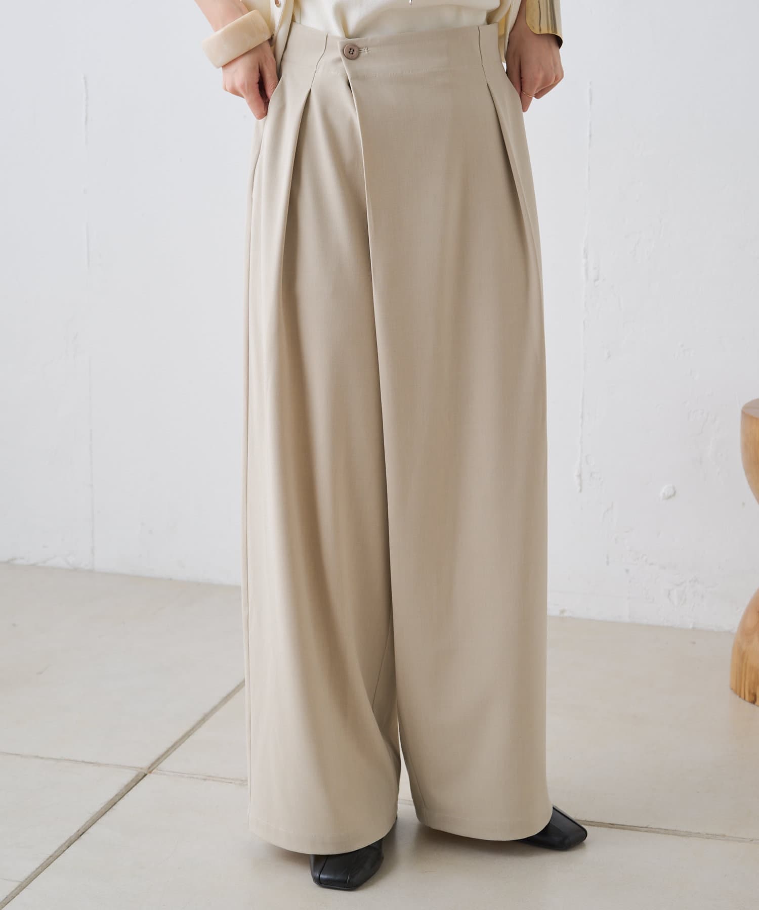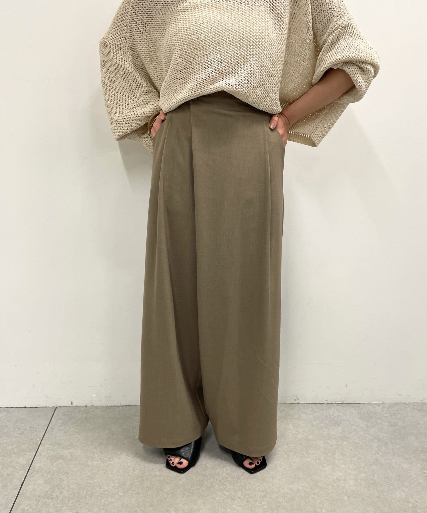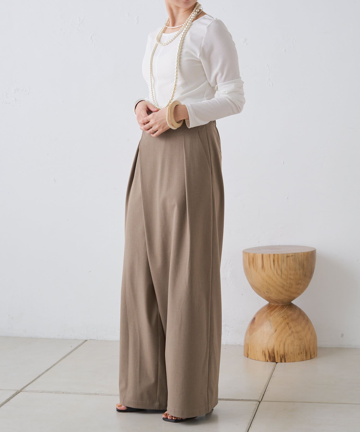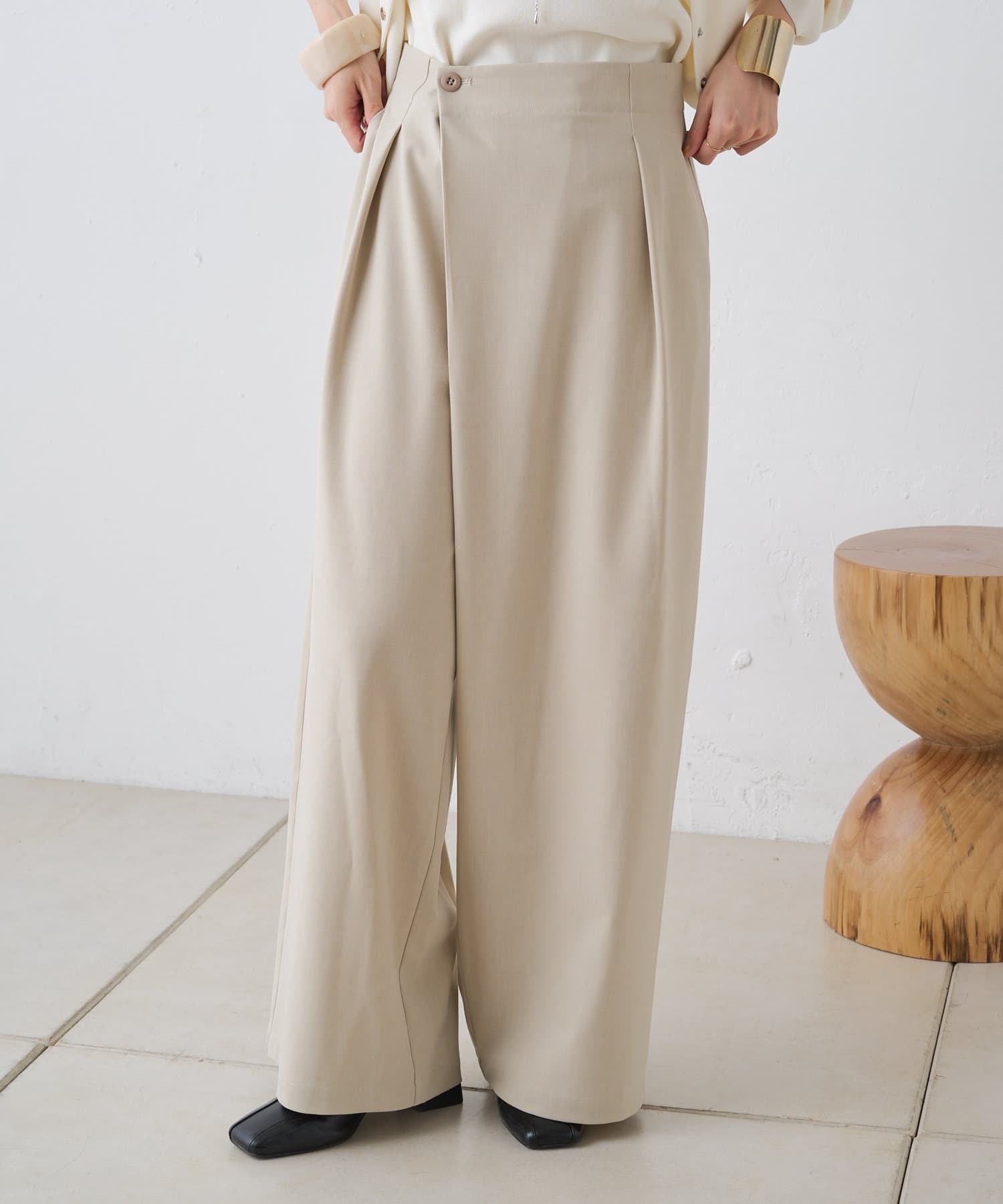 すとんと落ちるシルエットとタックの入ったウエストデザインですっきり一枚で決まるパンツ